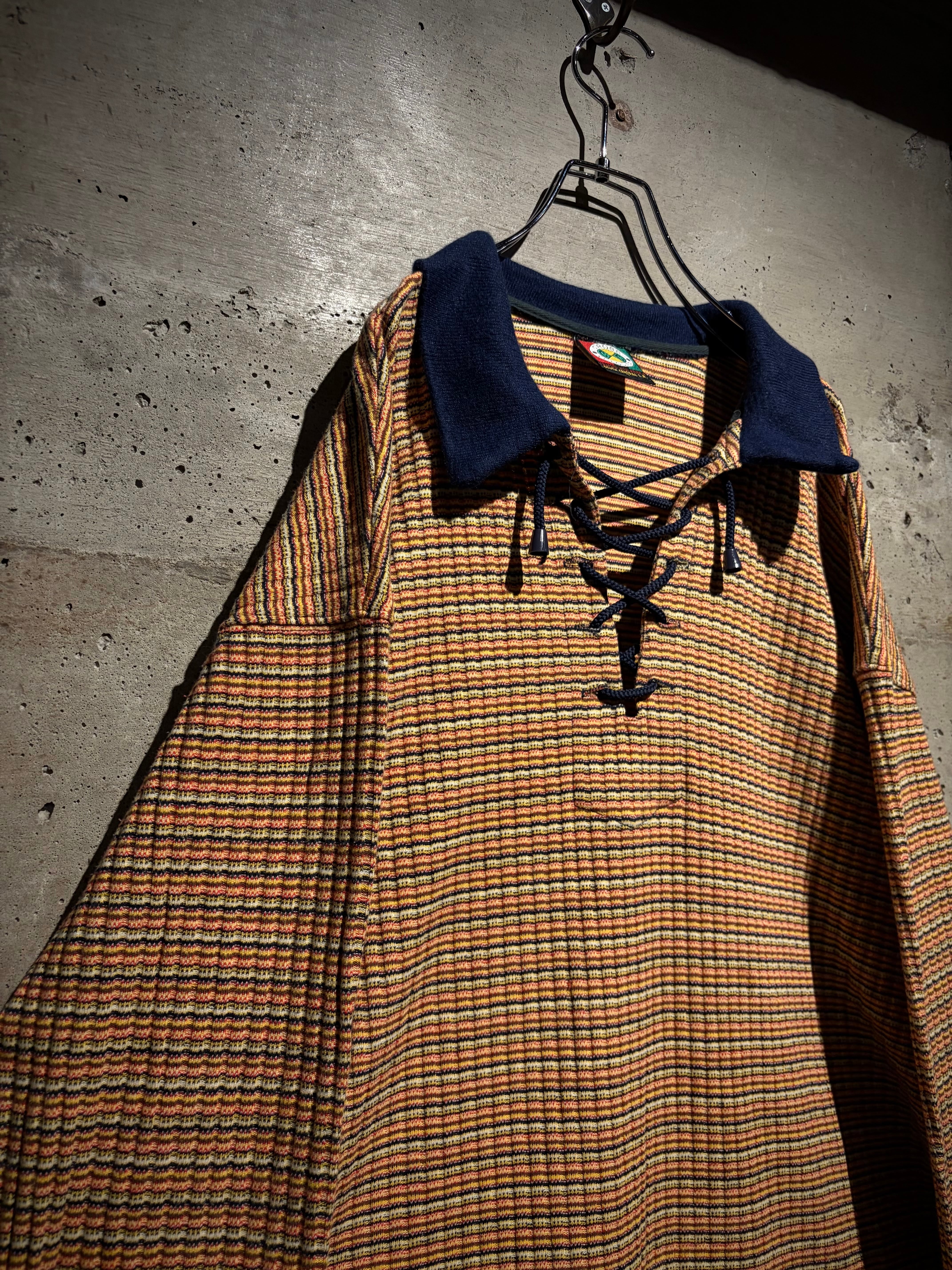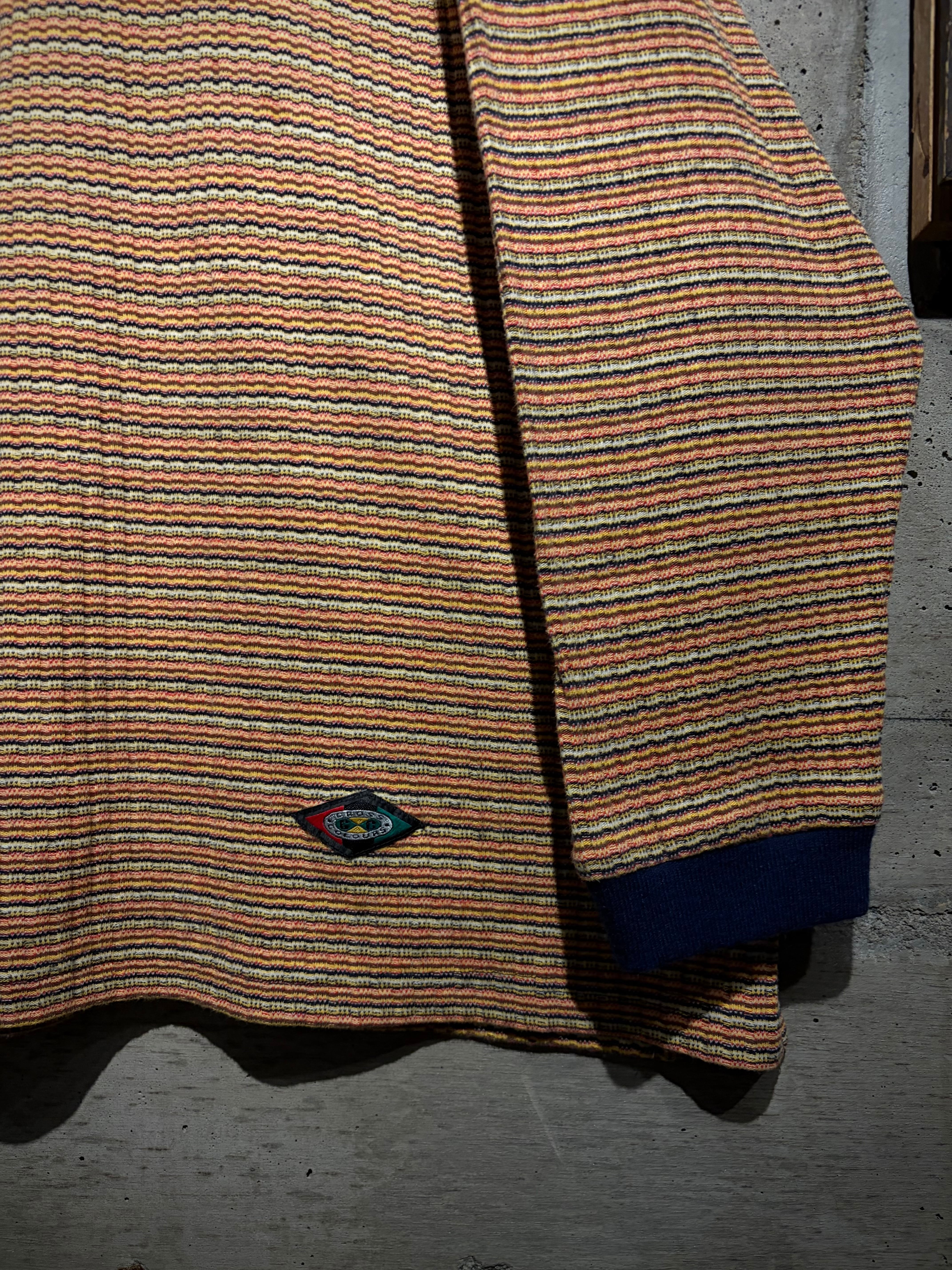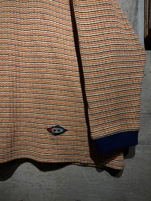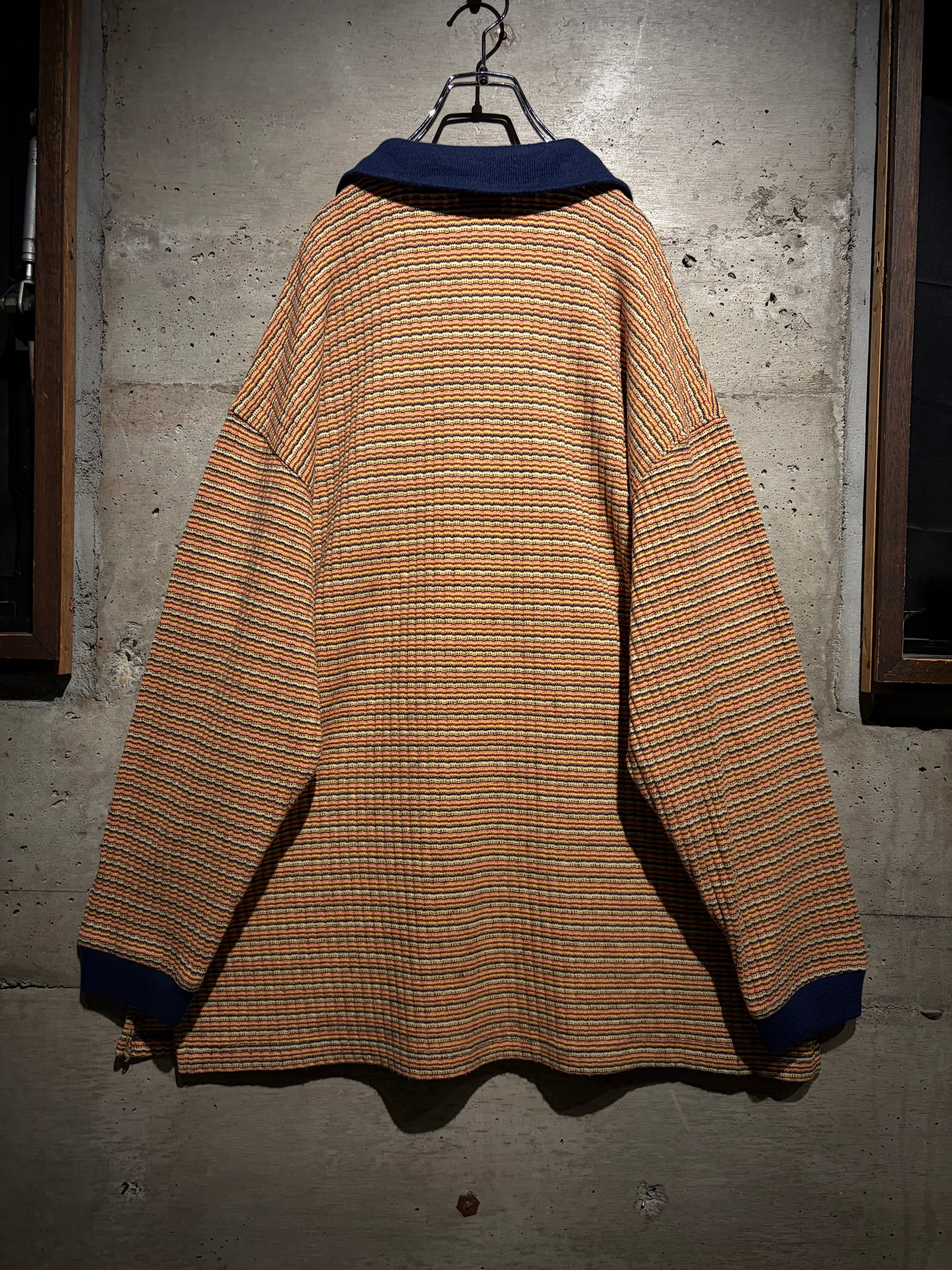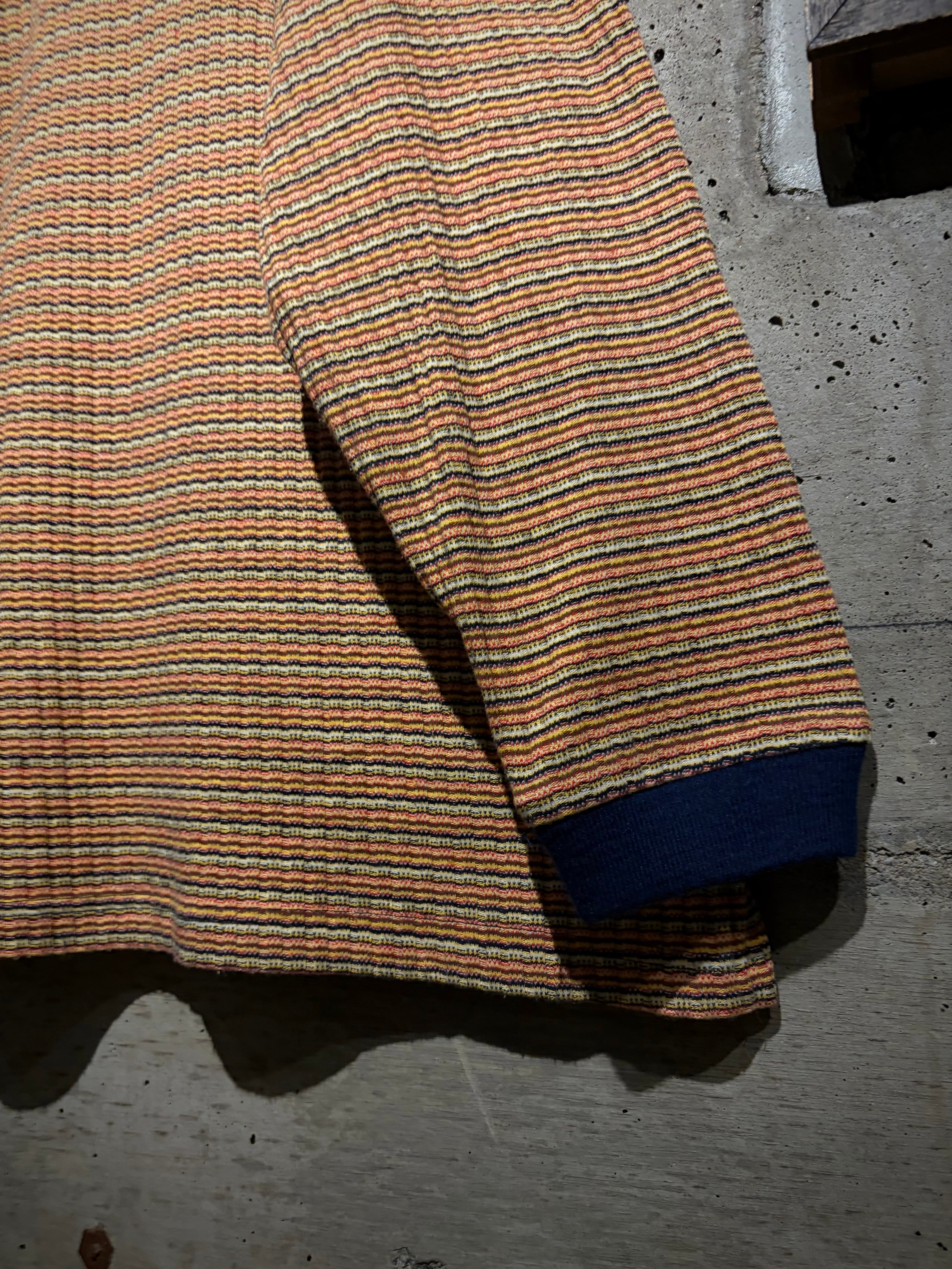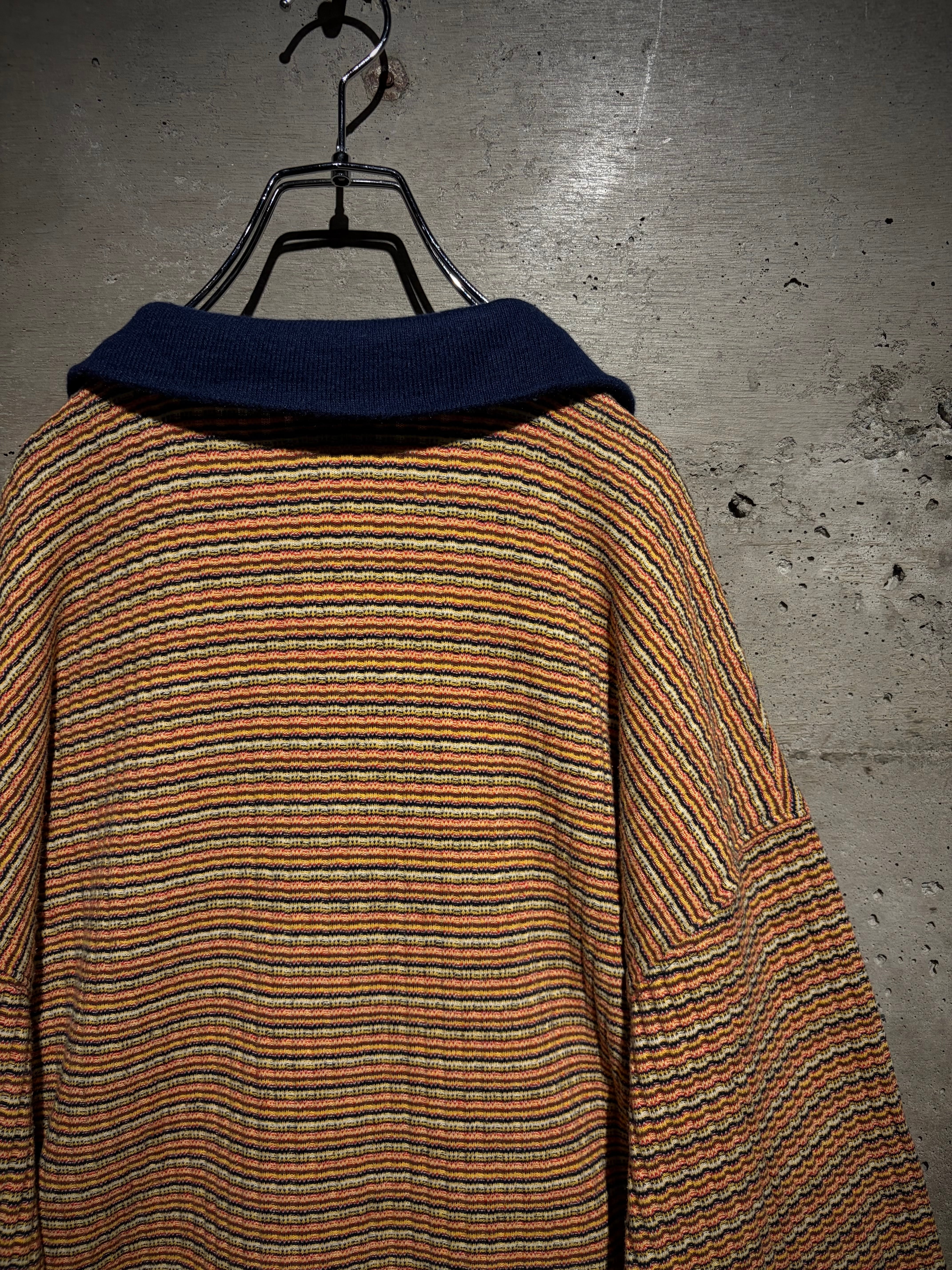 マルチカラーの細かなボーダーボディに、ネイビーの襟を切り替えた1着。凹凸のあるニッティング生地を採用することで、奥行きのある表情に昇華。