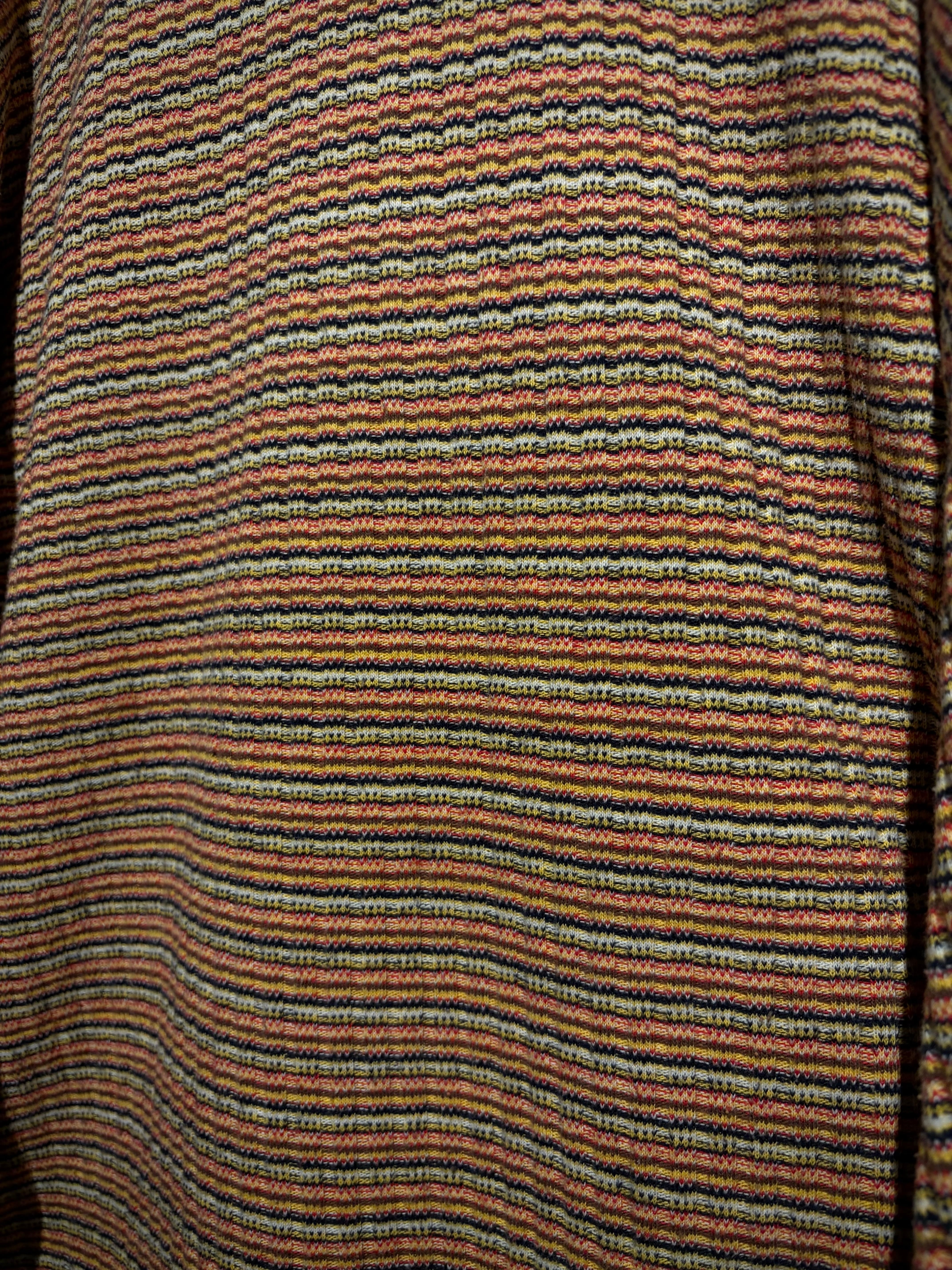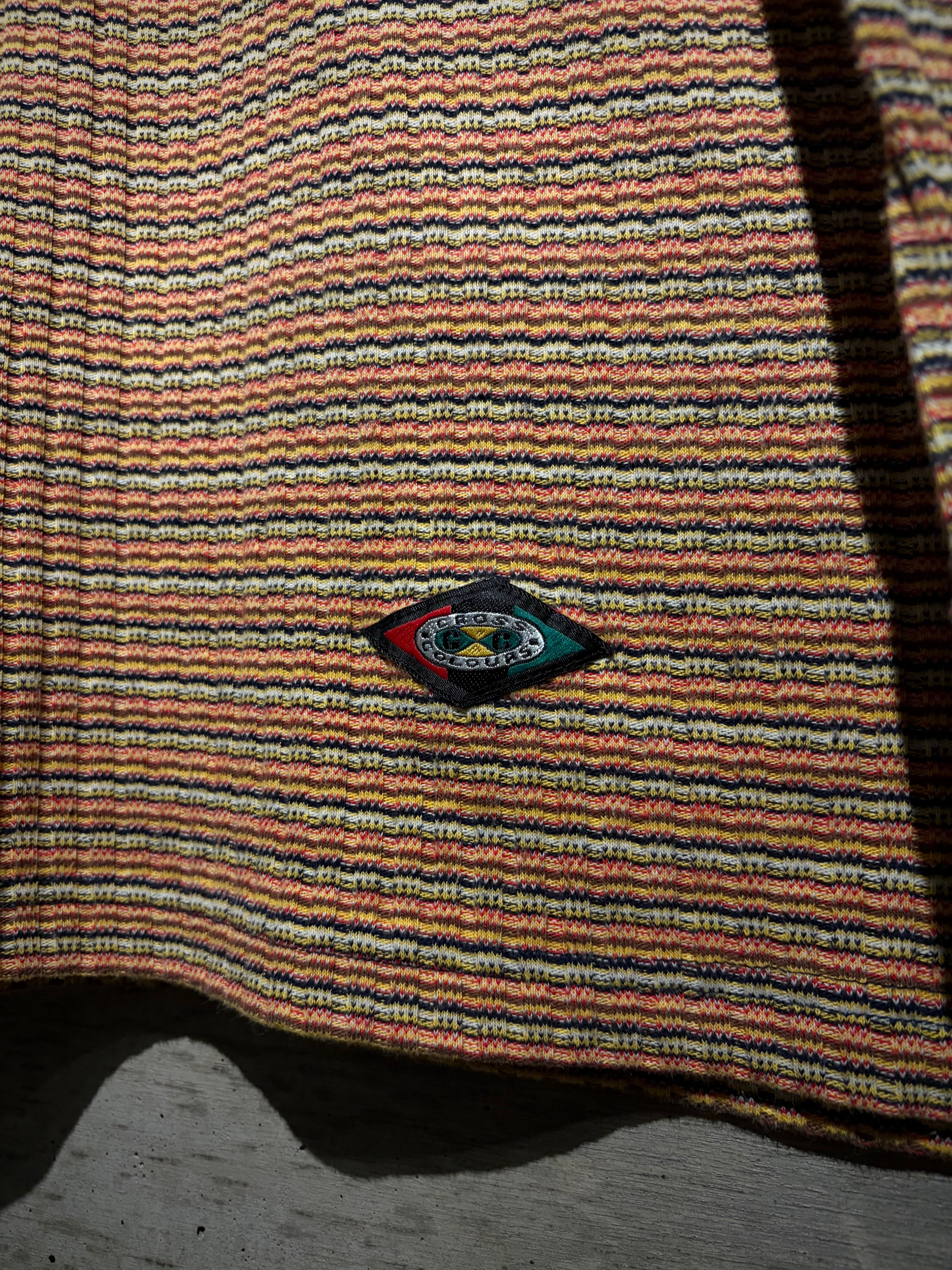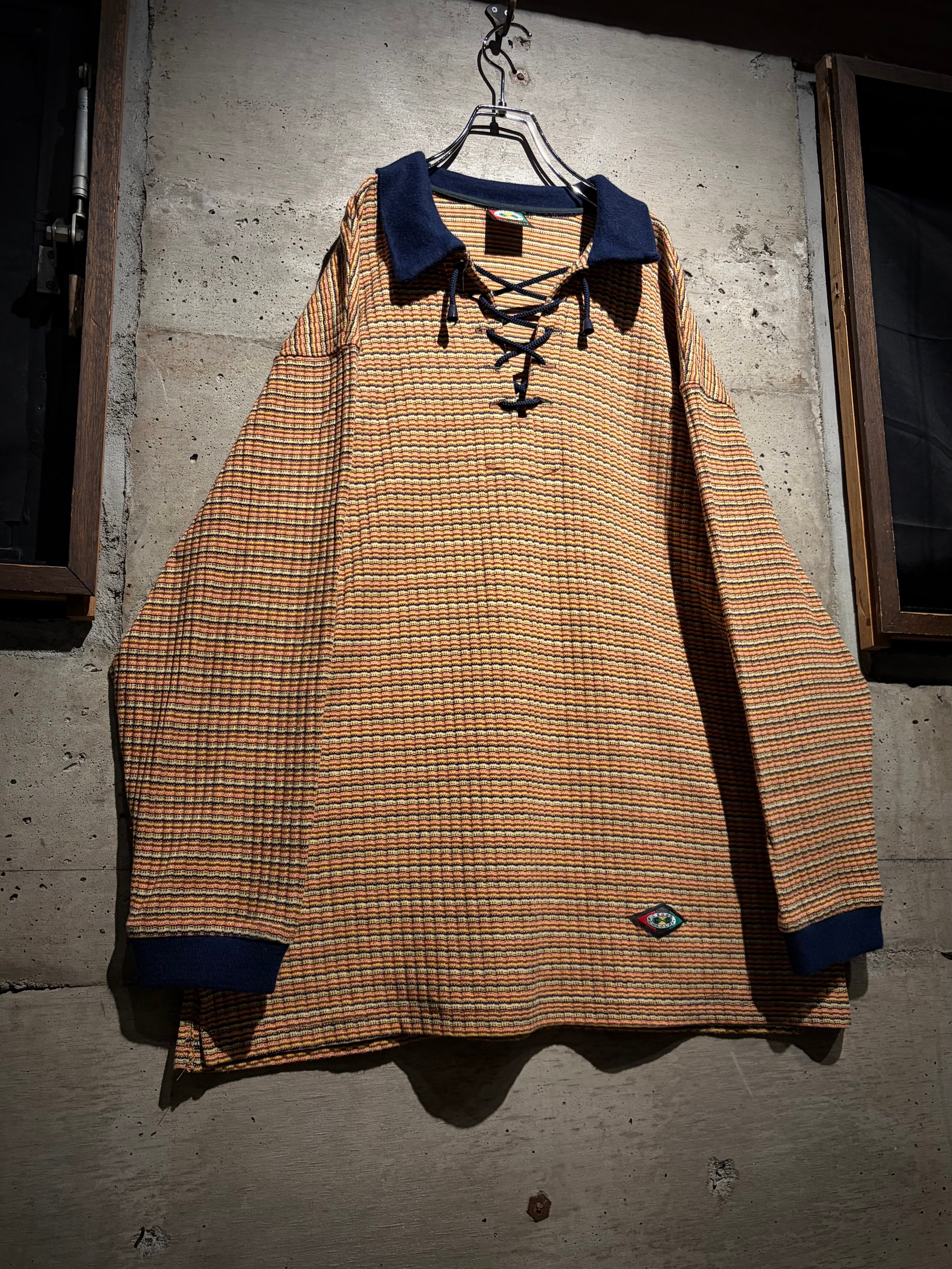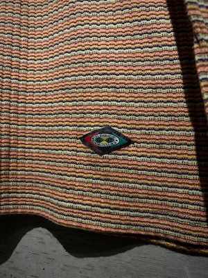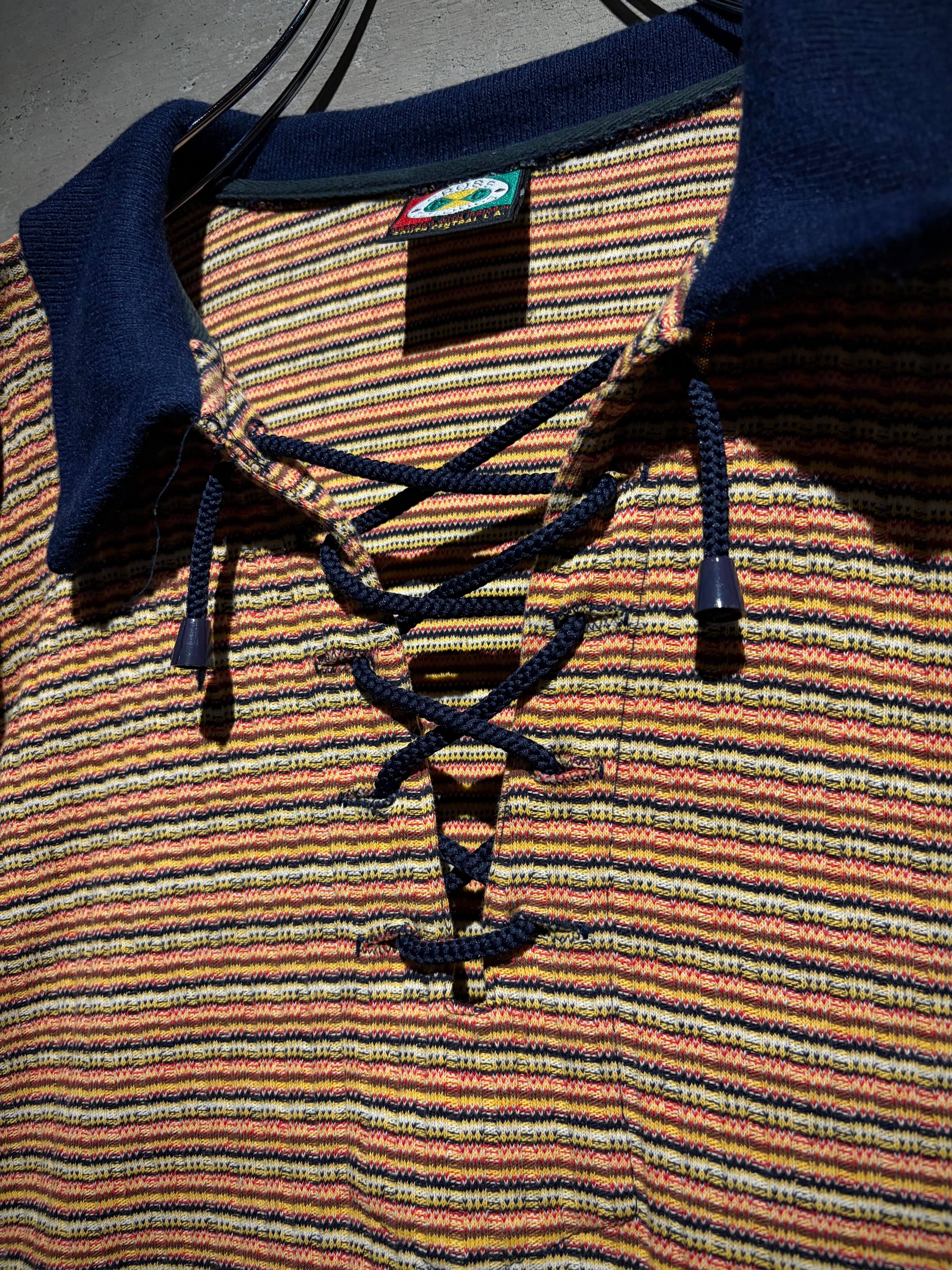 マルチカラーの細かなボーダーボディに、ネイビーの襟を切り替えた1着。凹凸のあるニッティング生地を採用することで、奥行きのある表情に昇華。