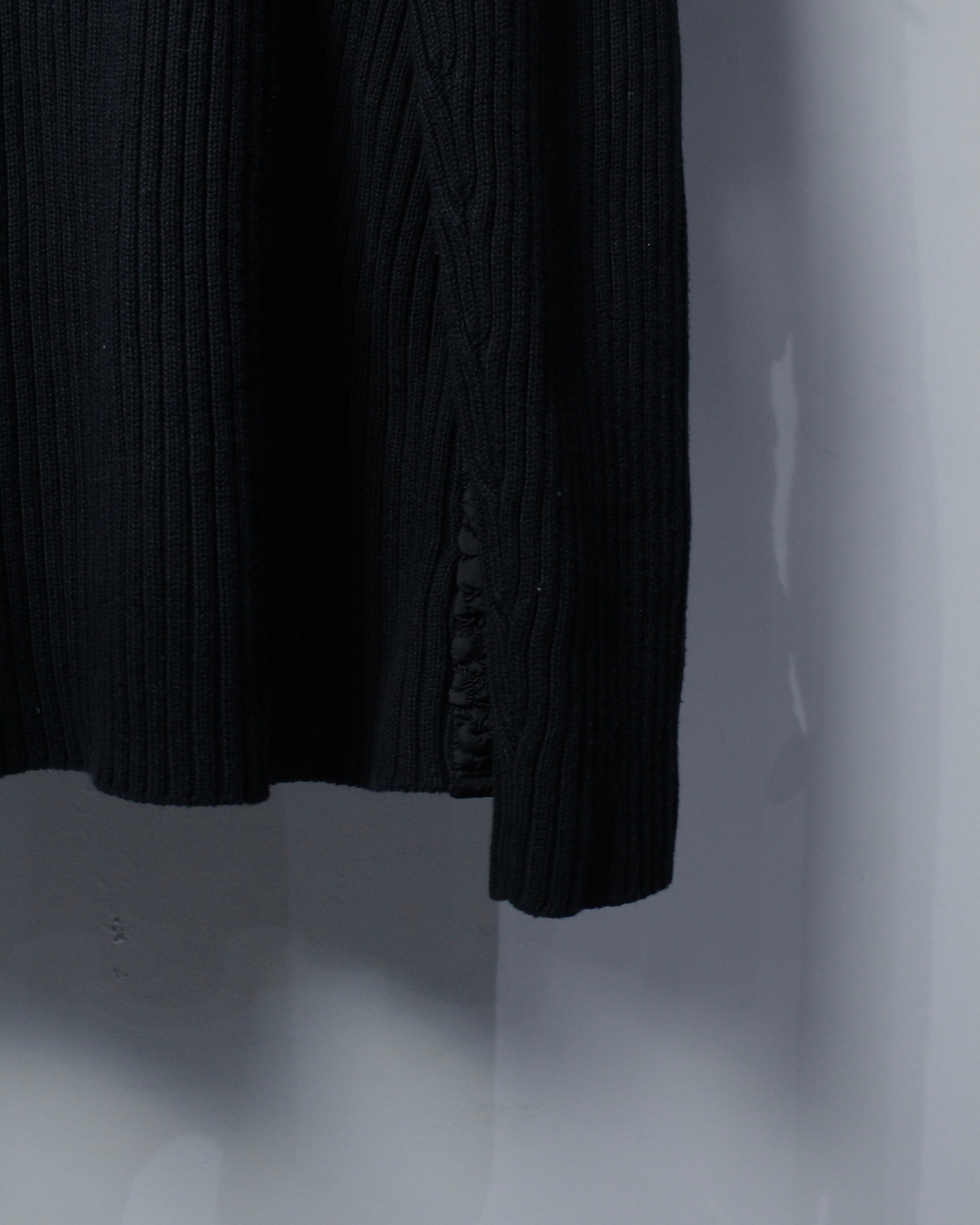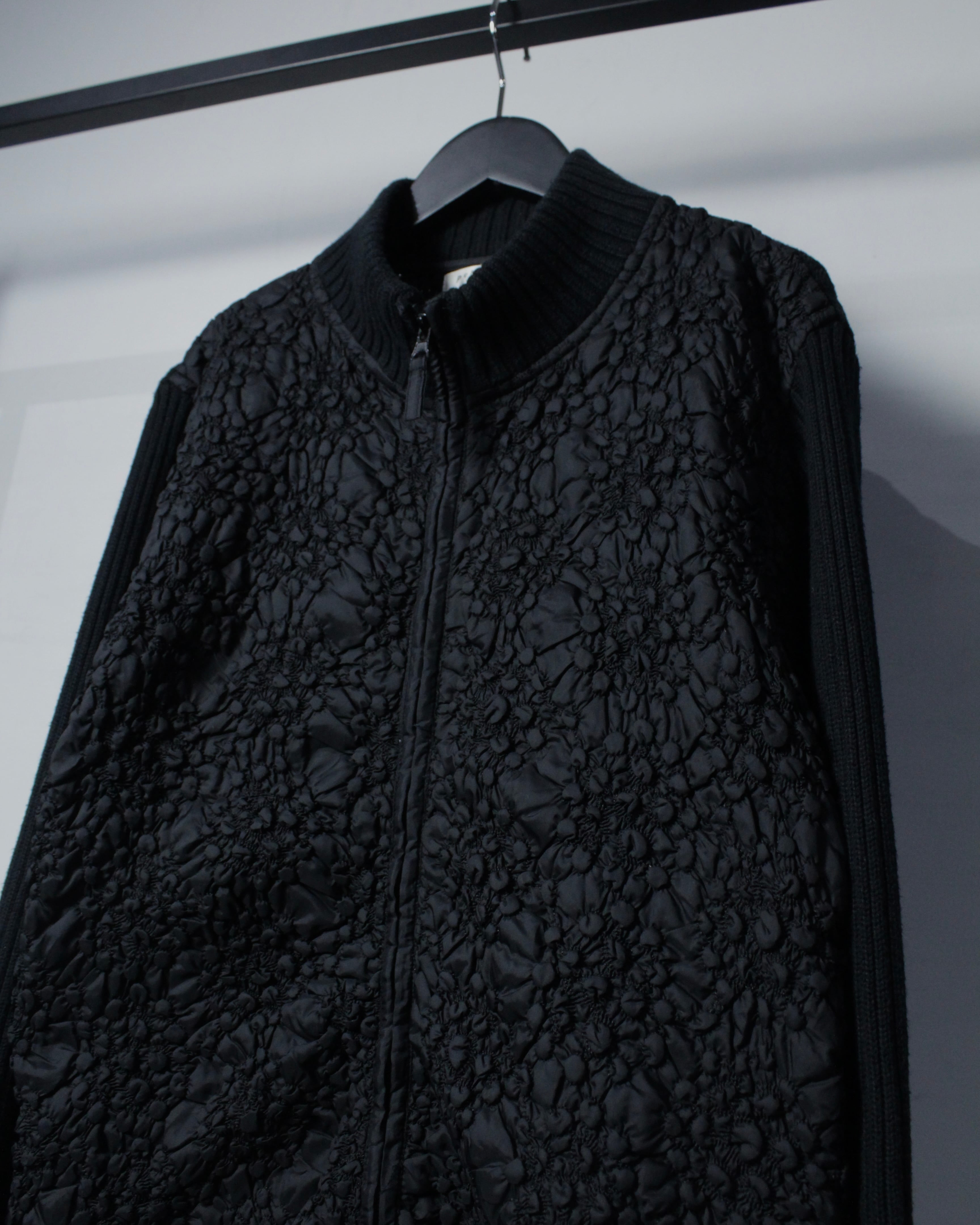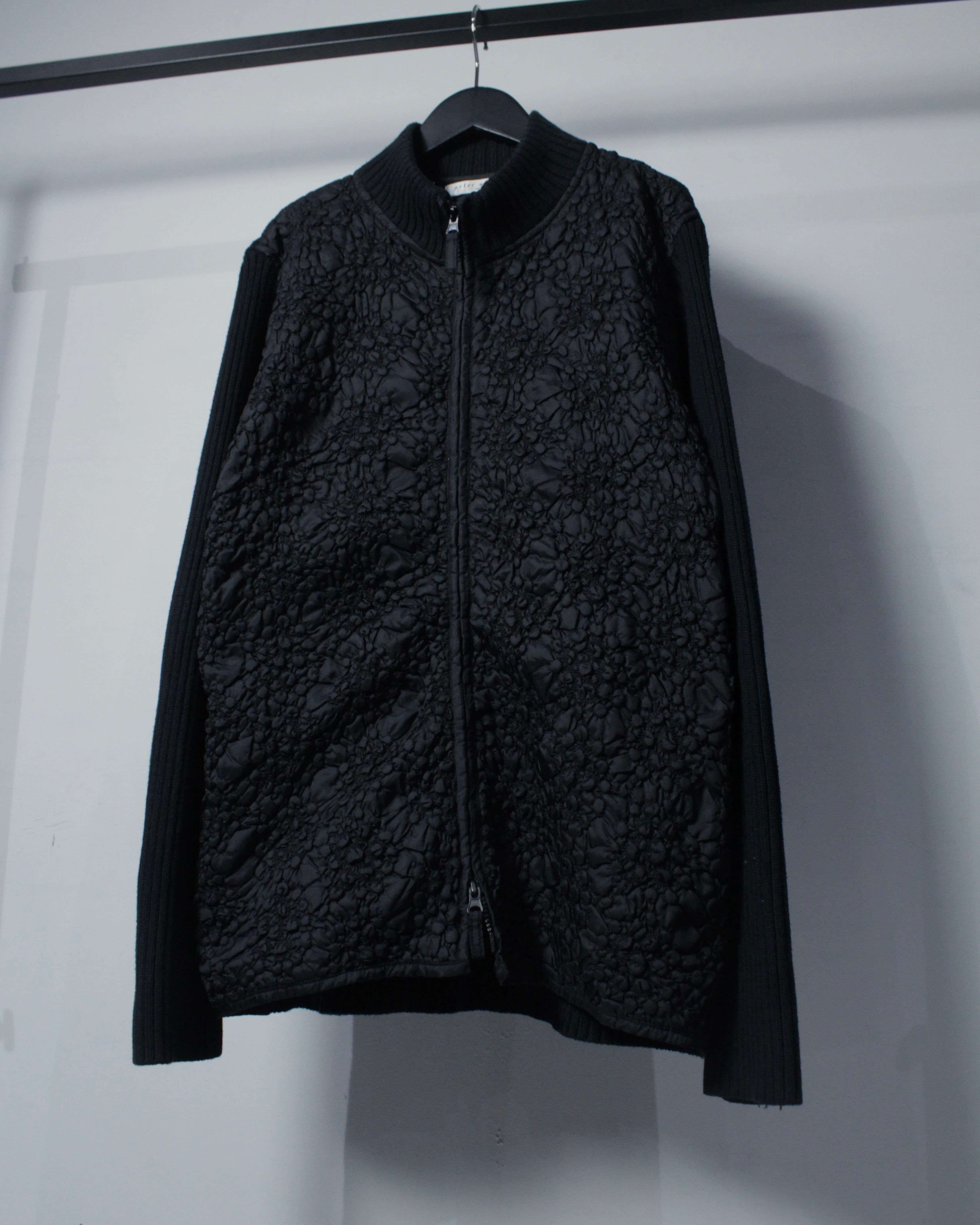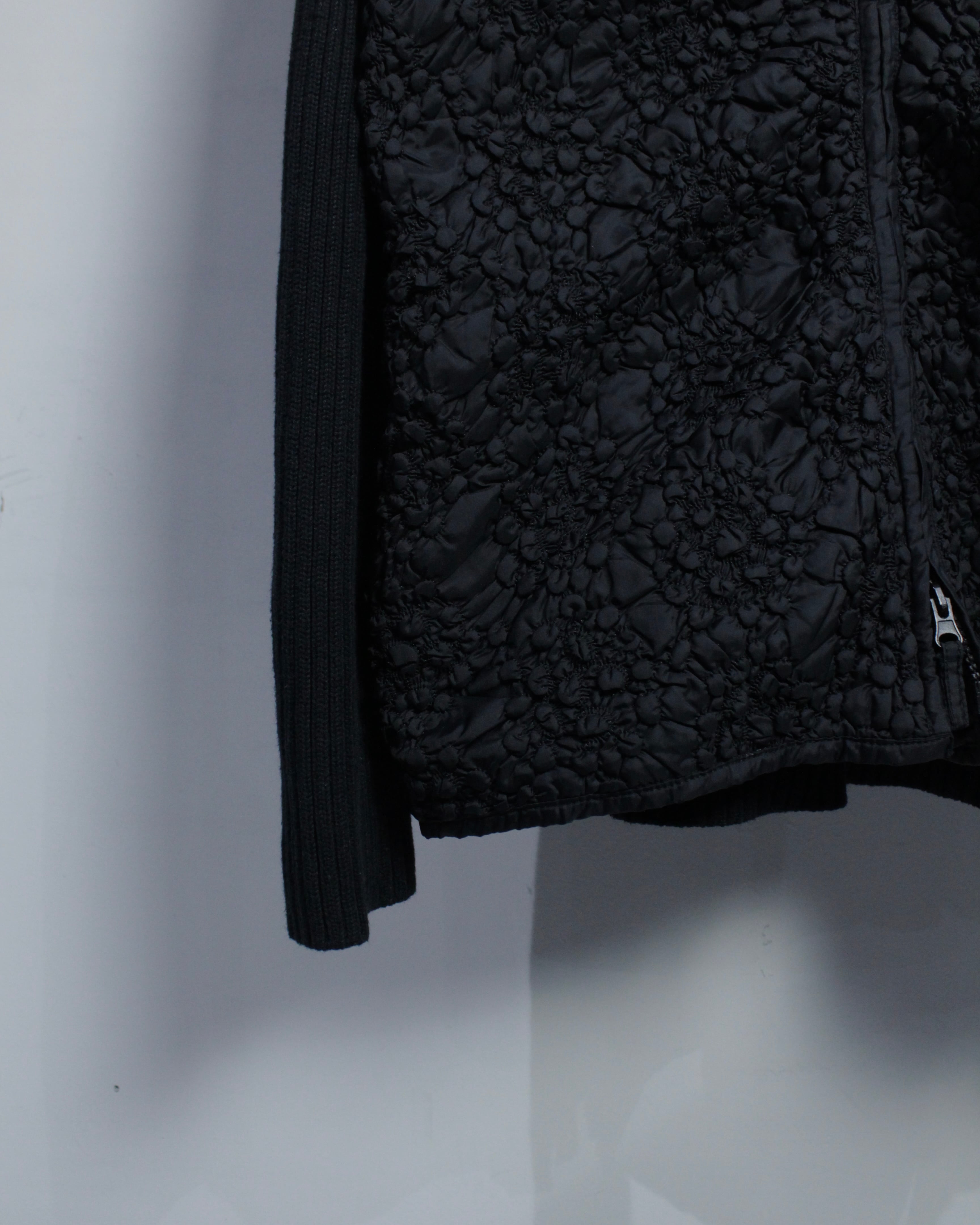 ミニマルなブラックボディに奥行きあるテクスチャーを落とし込んだ、異素材切り替えが光るジップアップニット。