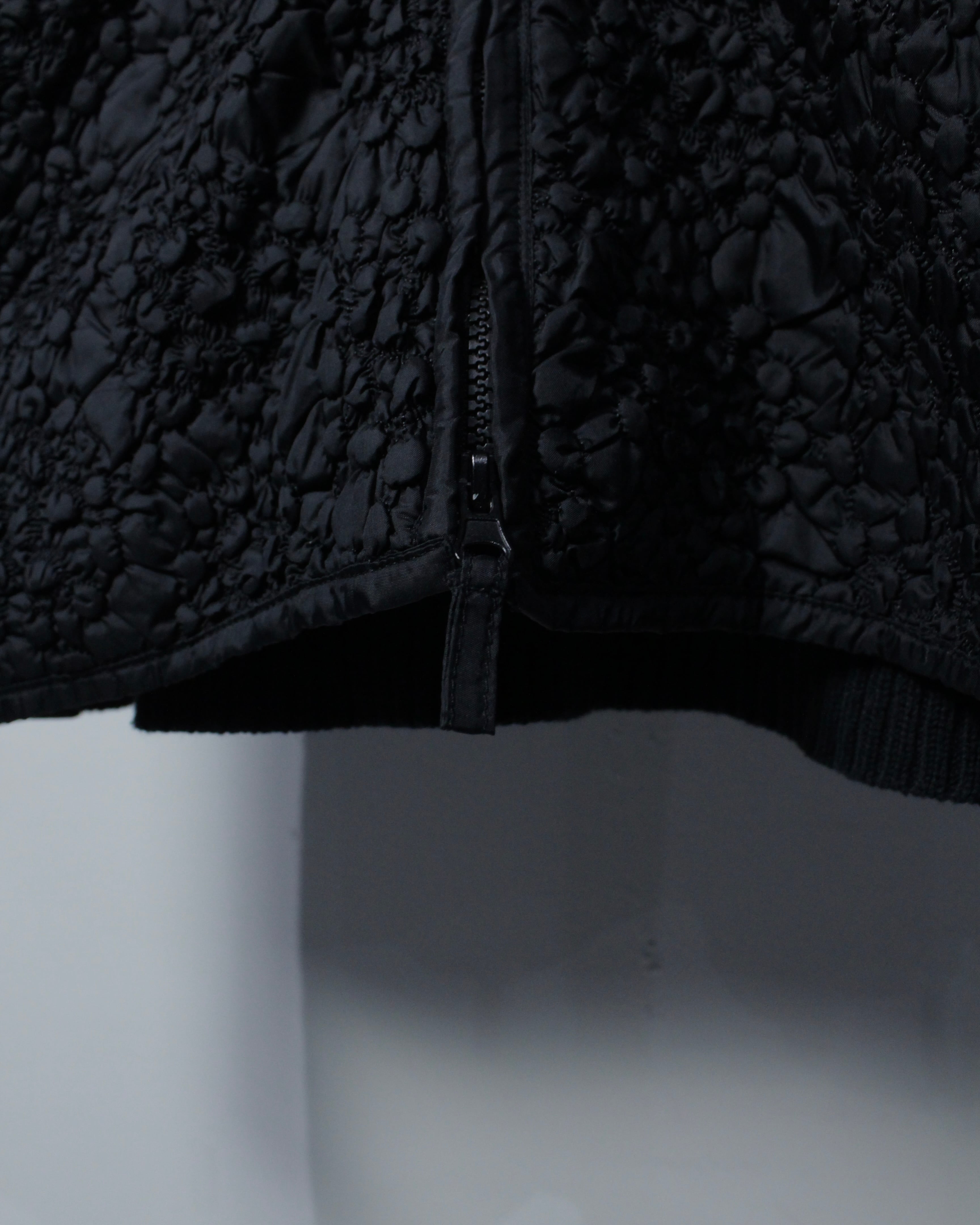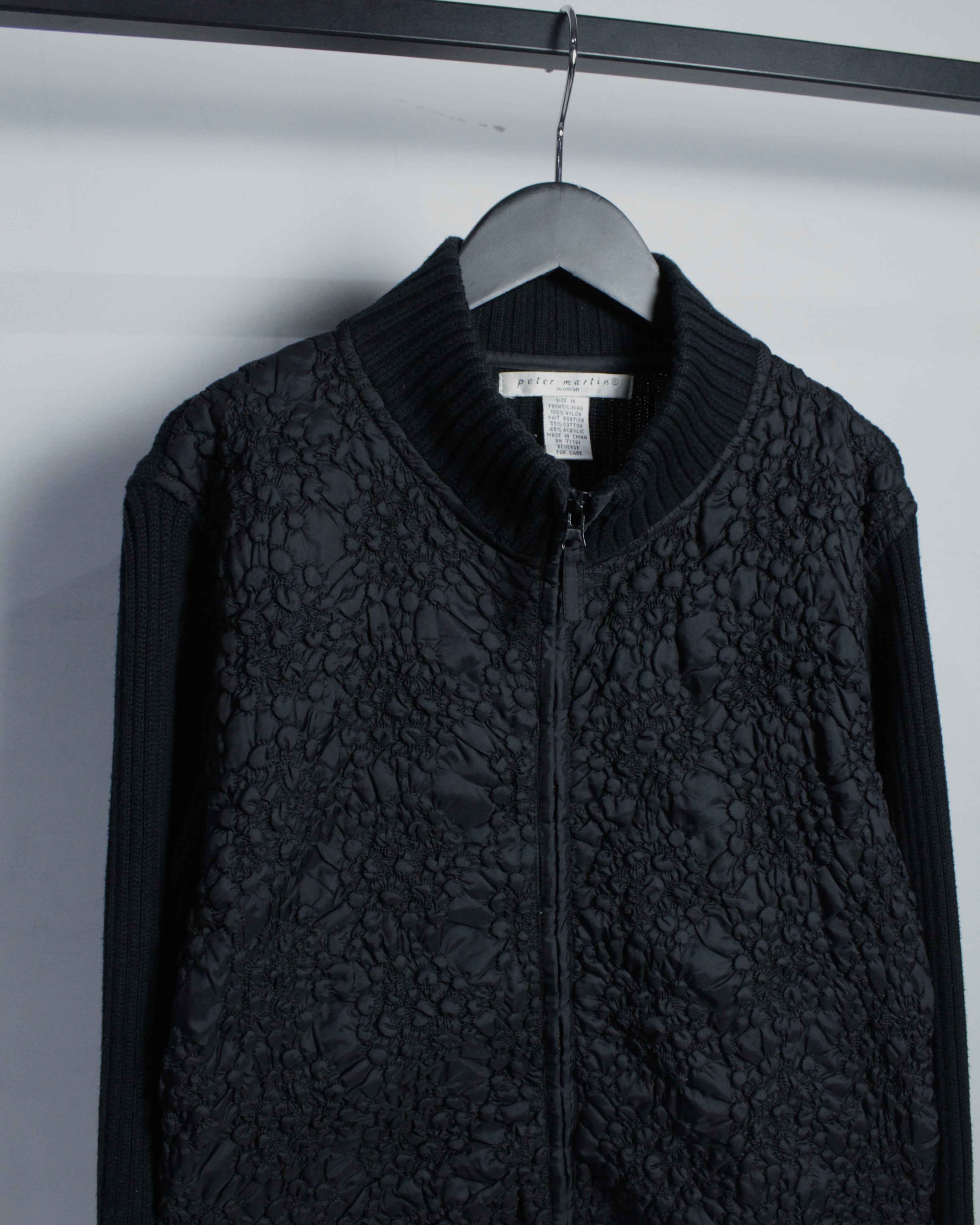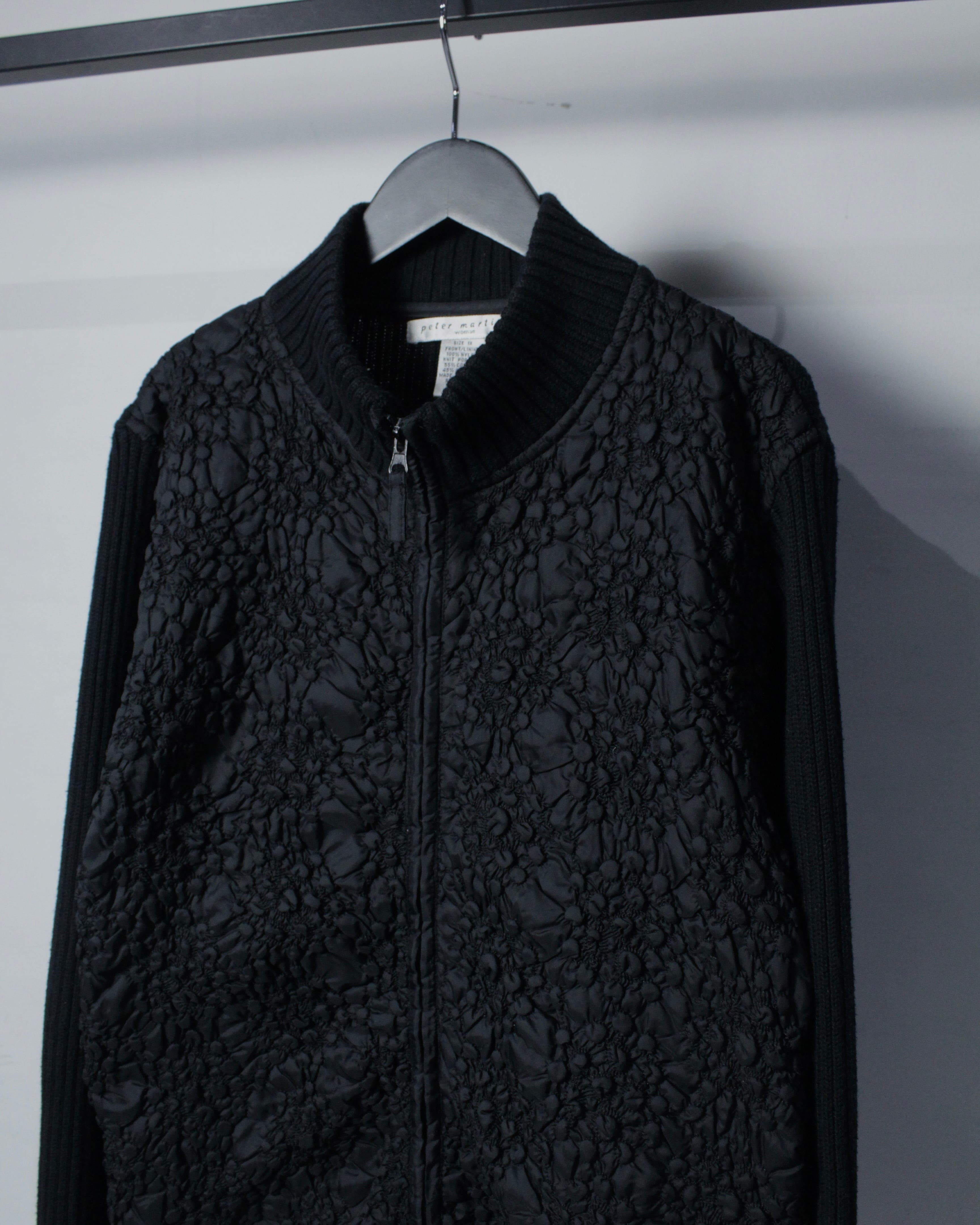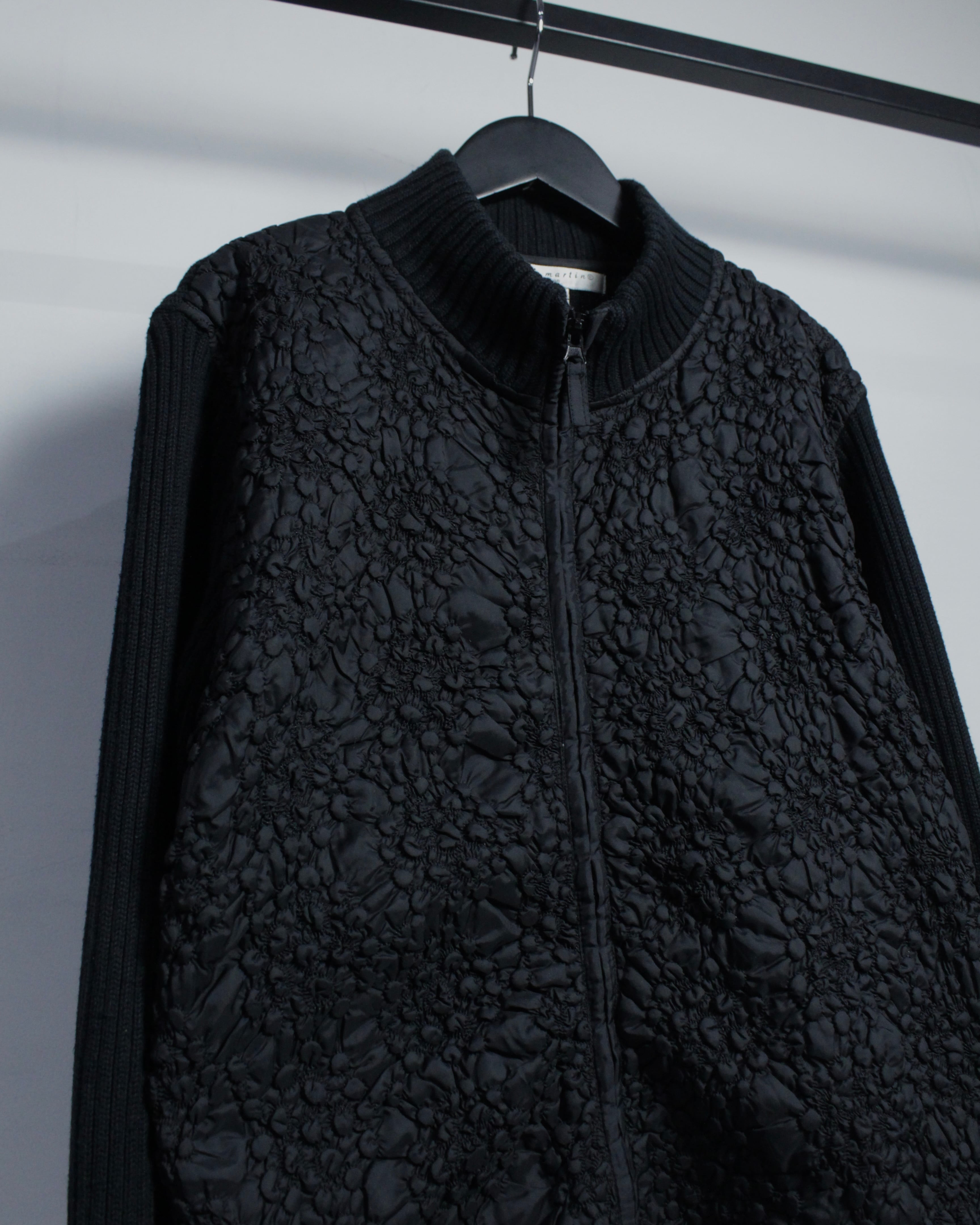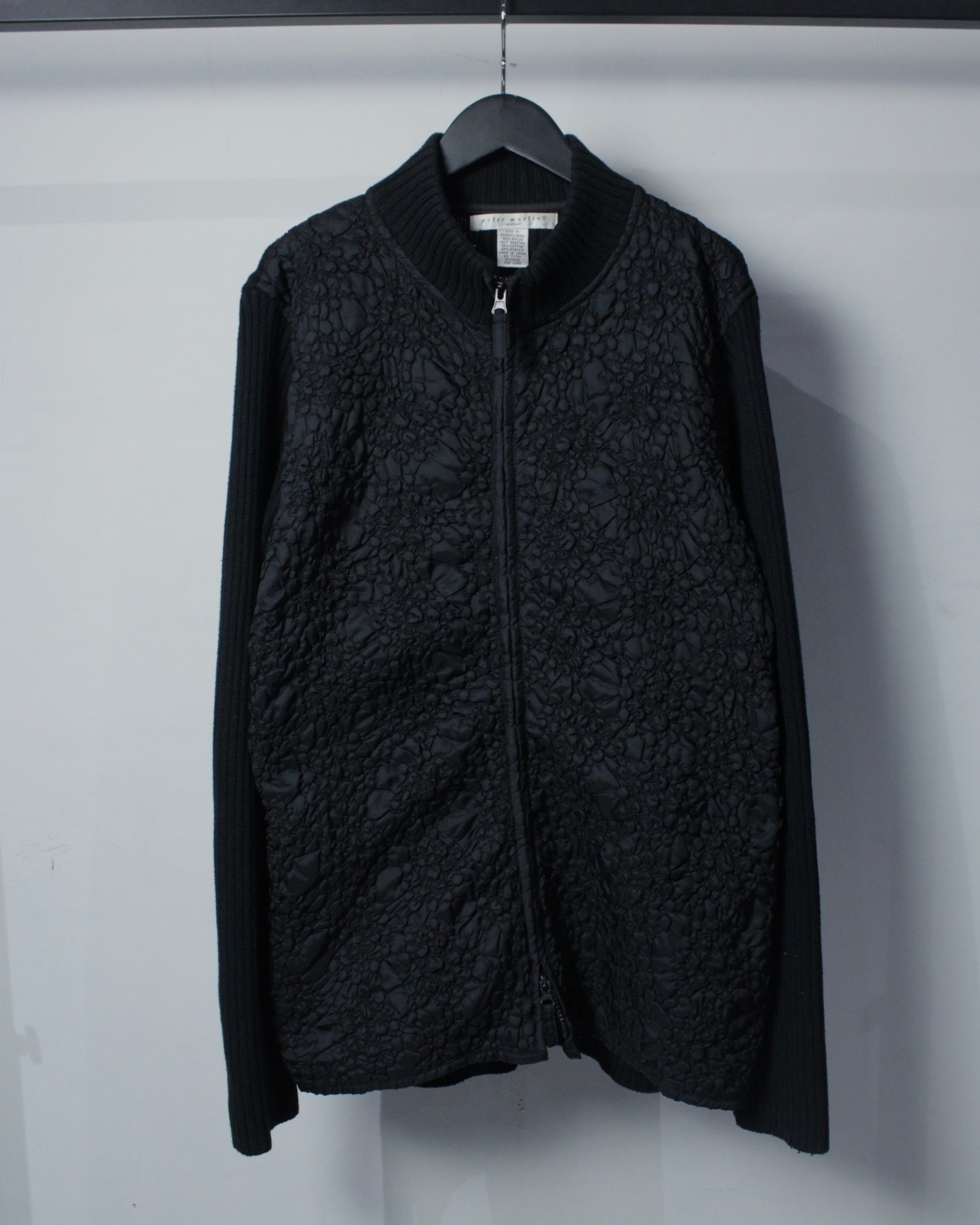 ミニマルなブラックボディに奥行きあるテクスチャーを落とし込んだ、異素材切り替えが光るジップアップニット。