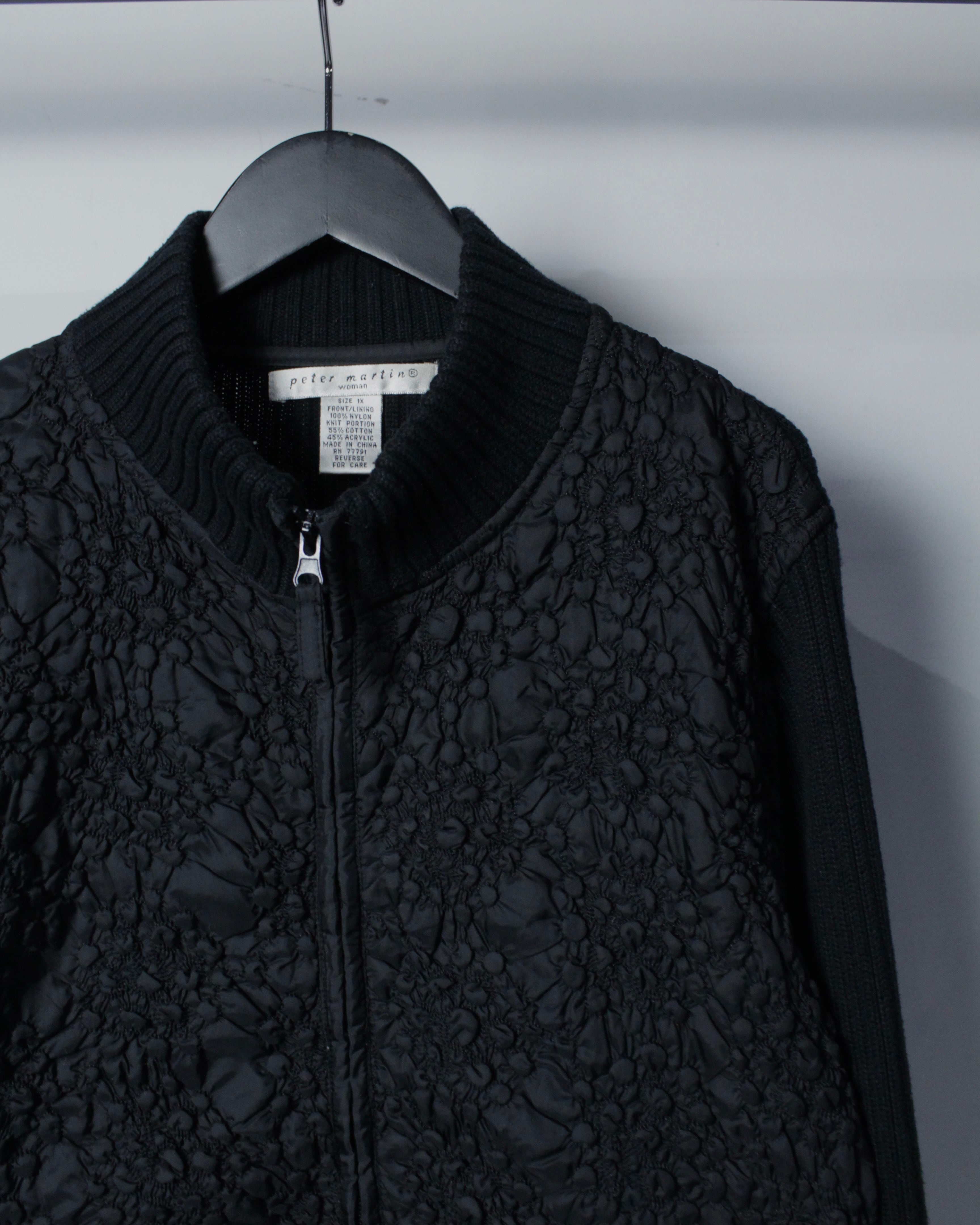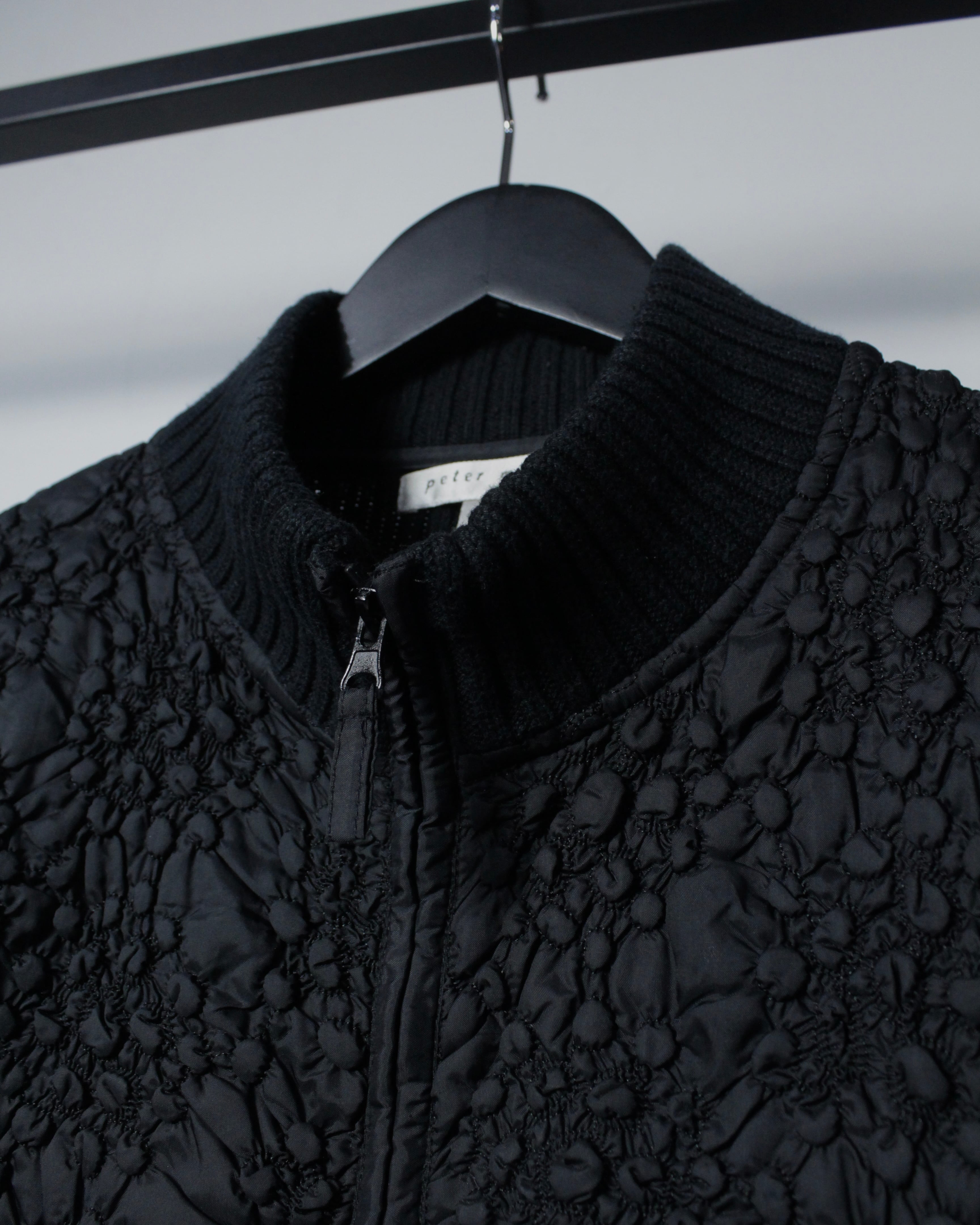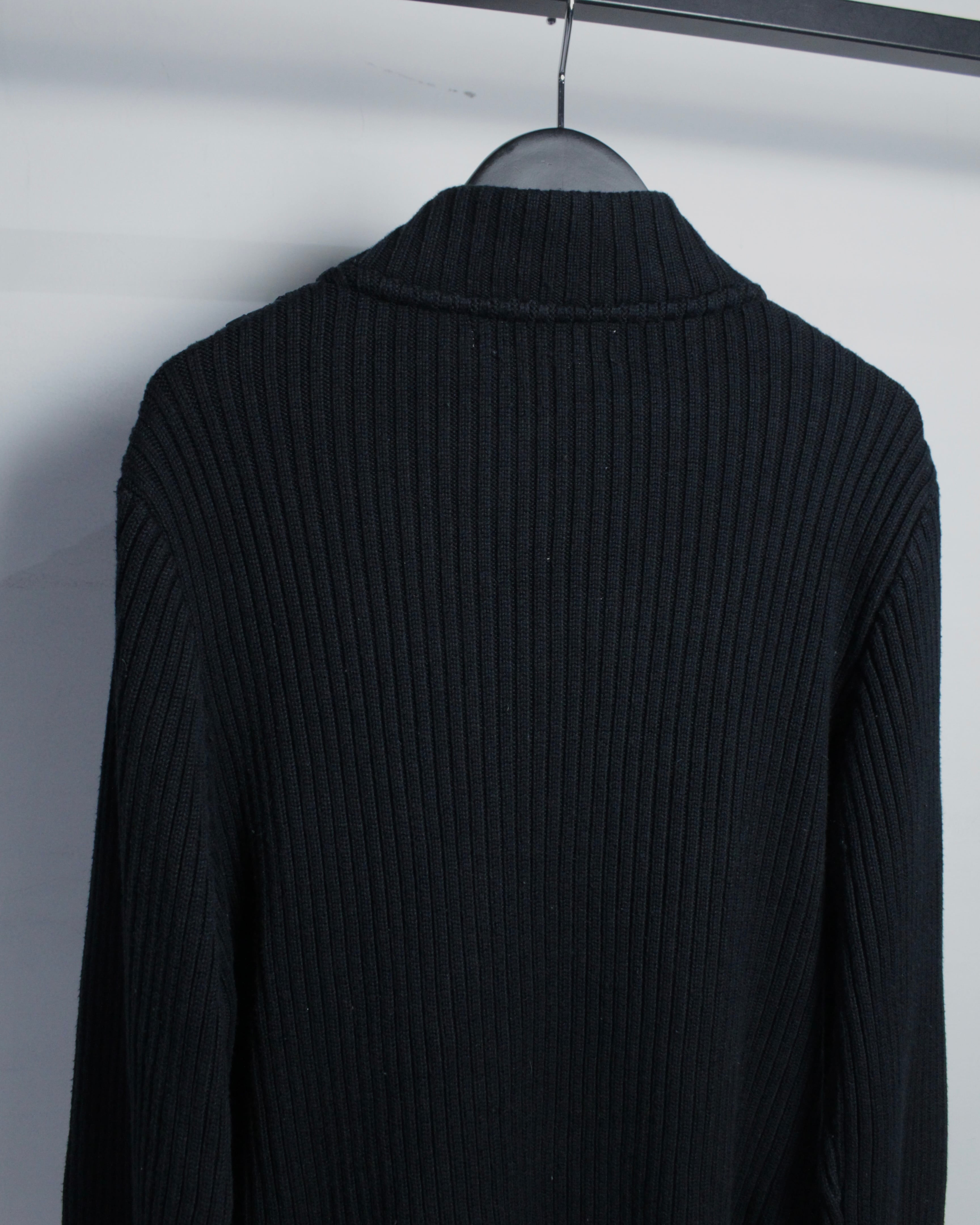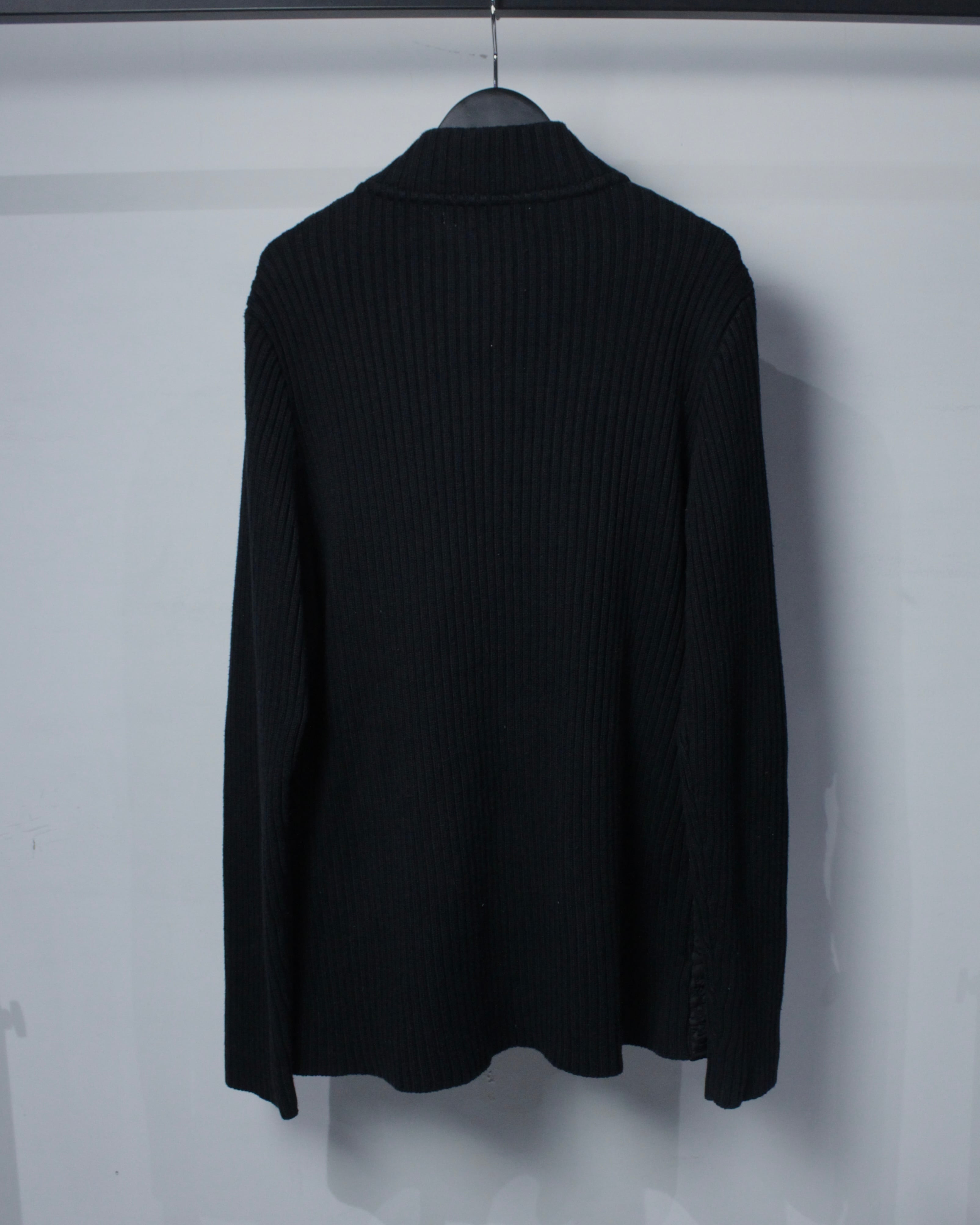ミニマルなブラックボディに奥行きあるテクスチャーを落とし込んだ、異素材切り替えが光るジップアップニット。