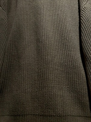 肉厚でしっかりと編み込まれたコットンニット地をベースに、落ち着いたブラウンカラーでまとめた1着。