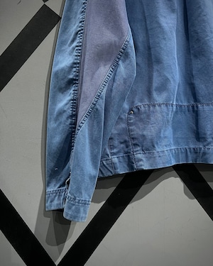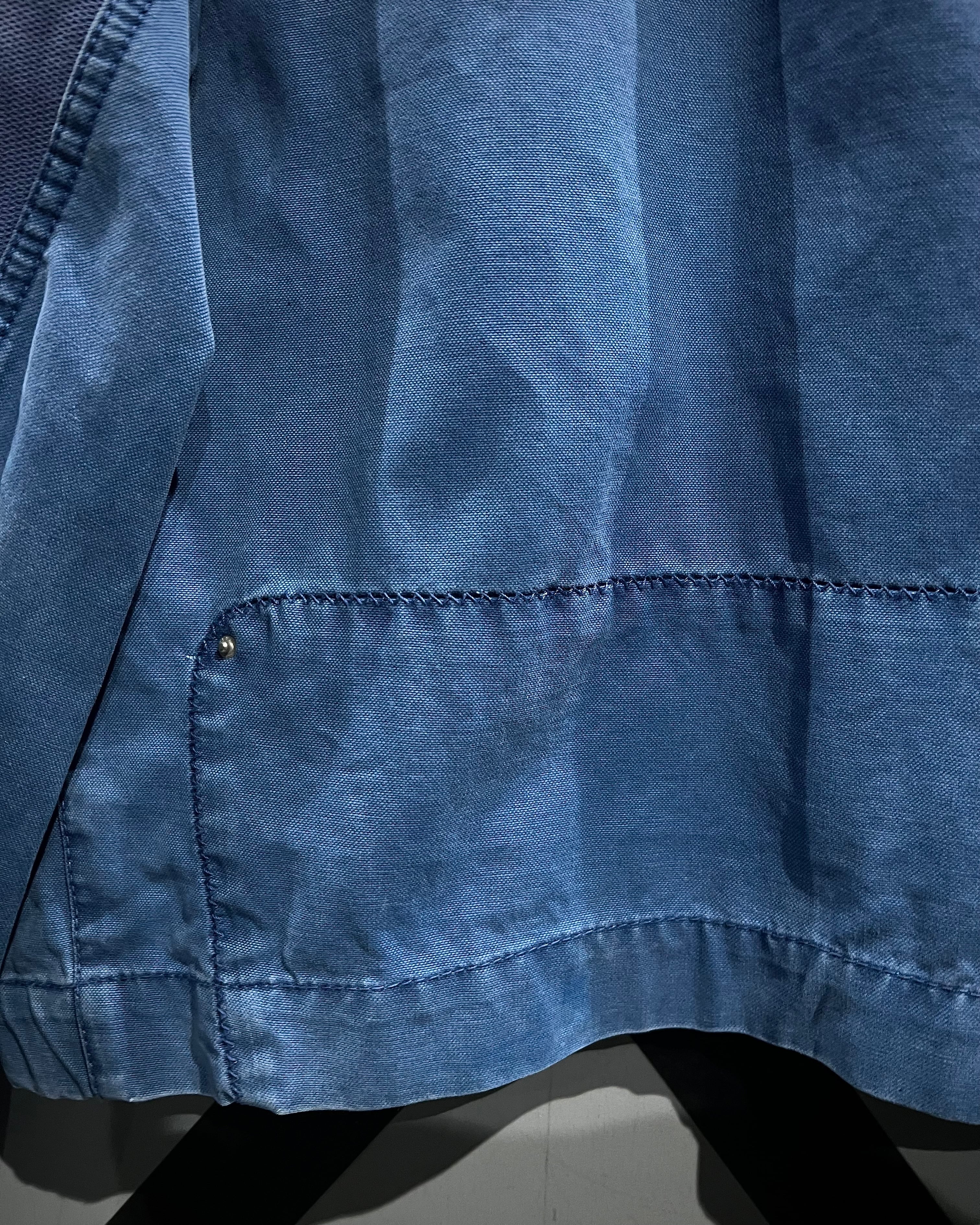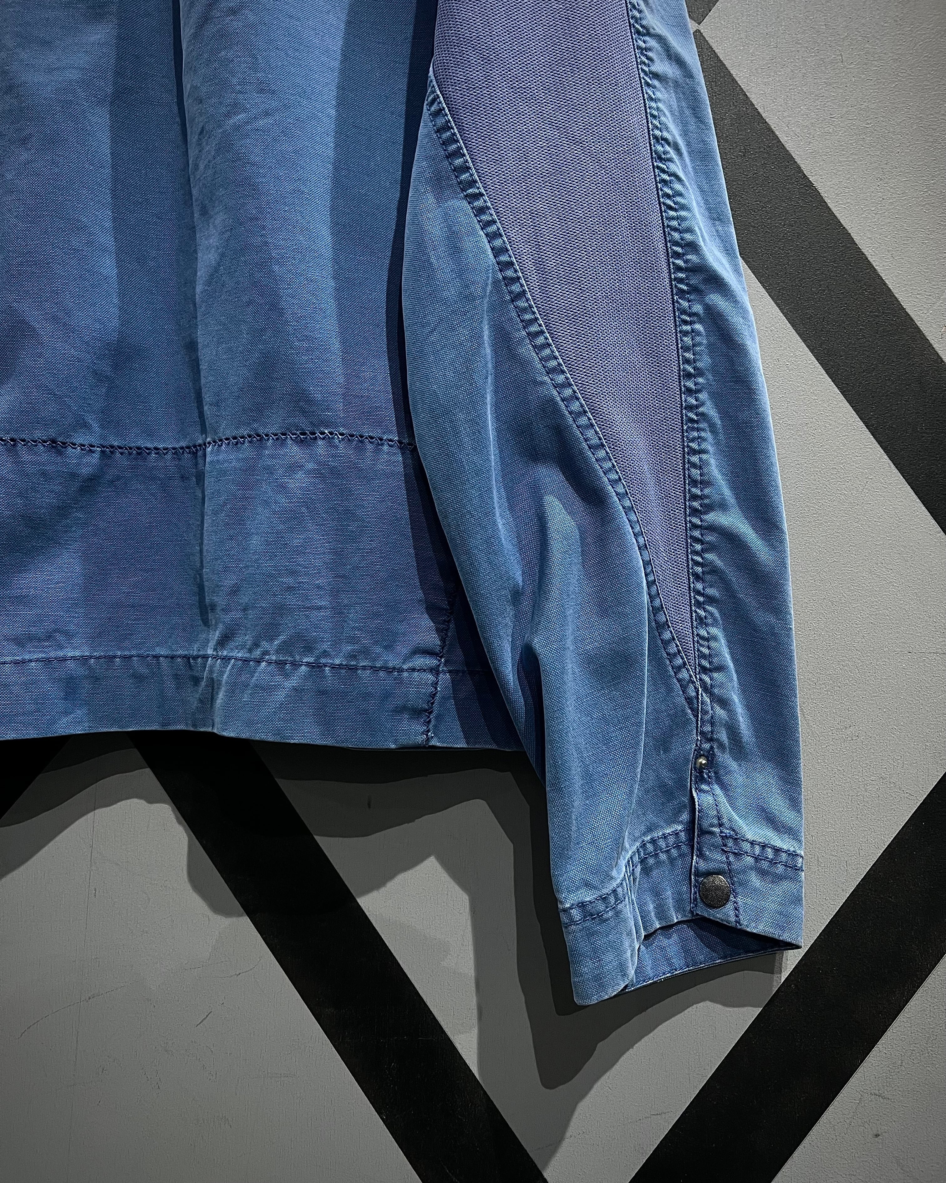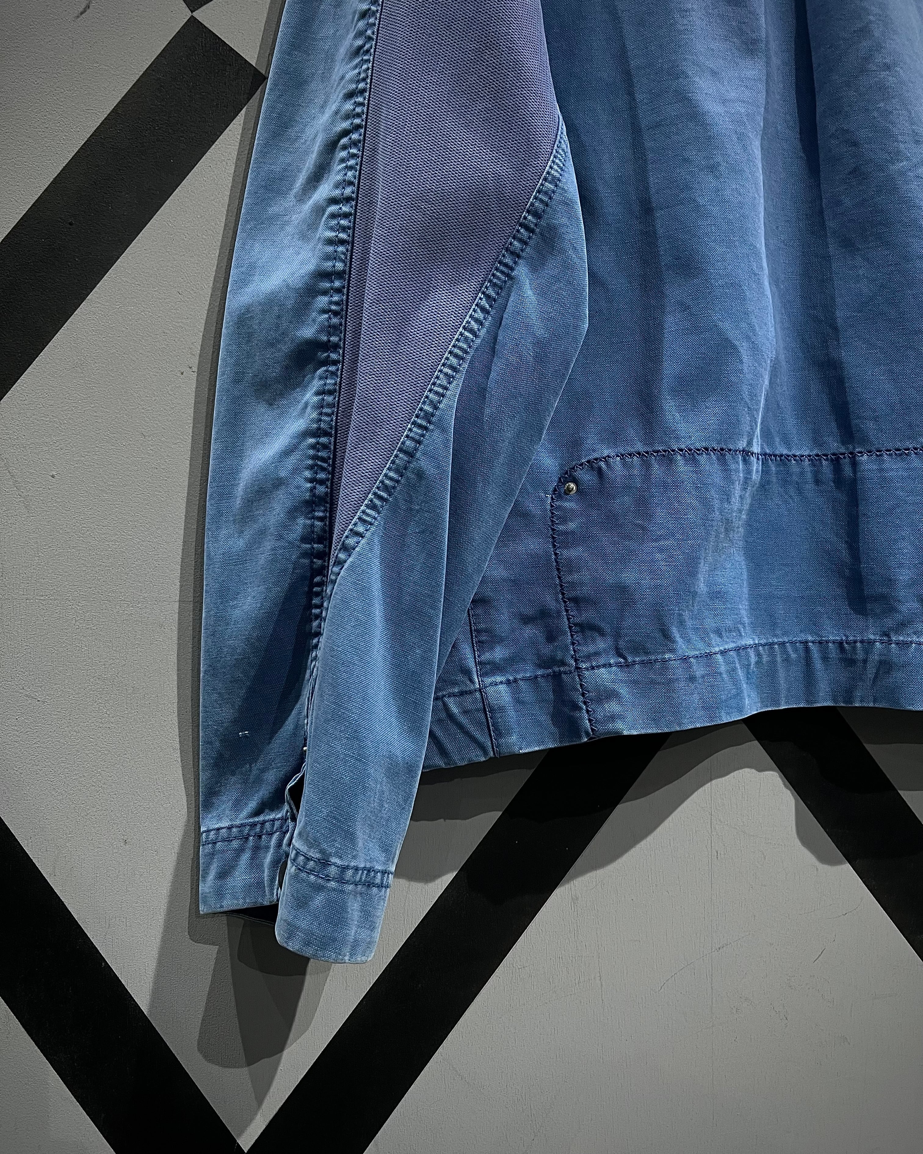 タフなダック地をベースに、グラデーションのように移り変わるカラーの生地を袖に切り替え、フロントにはコシのある異素材を切り替えた1着。