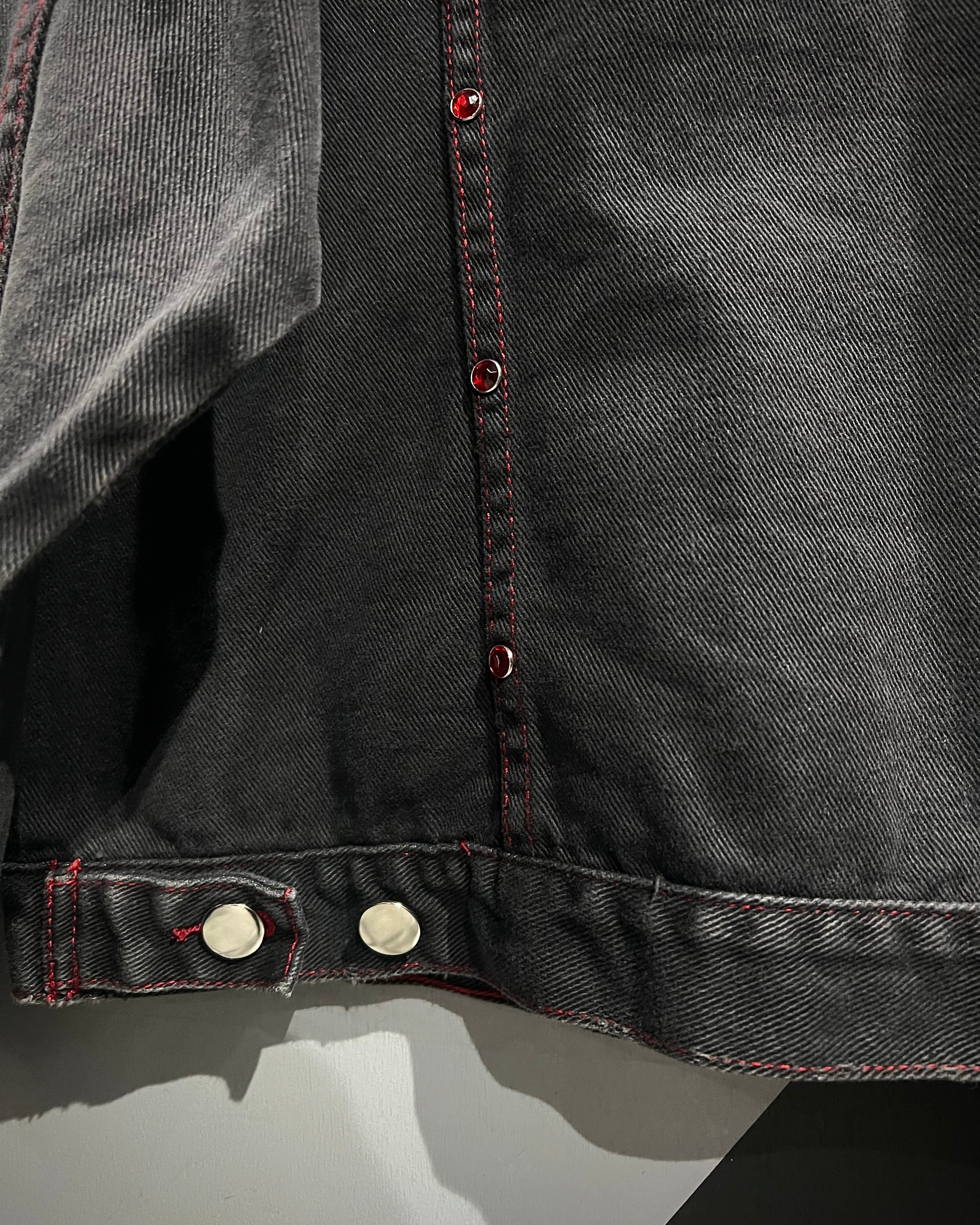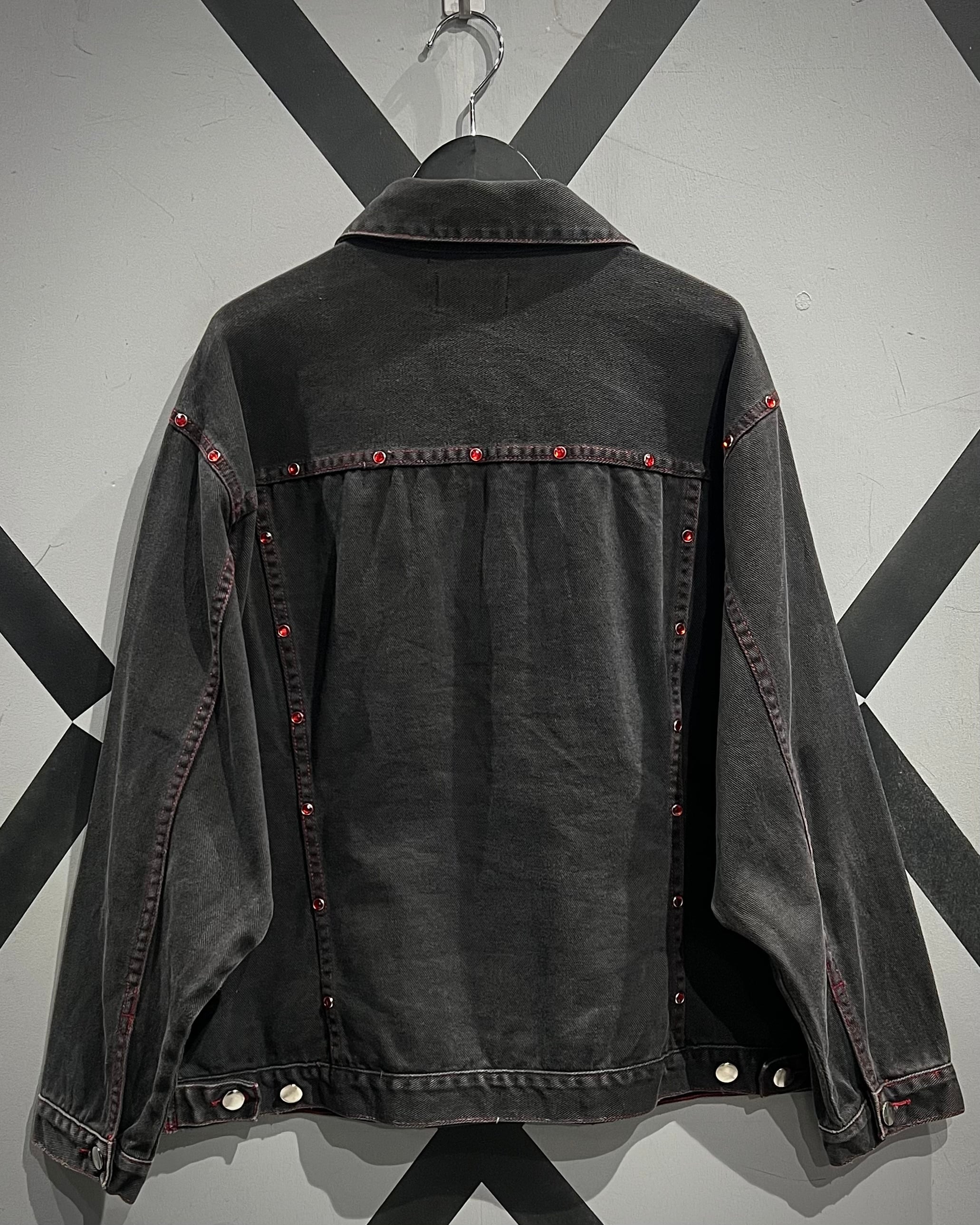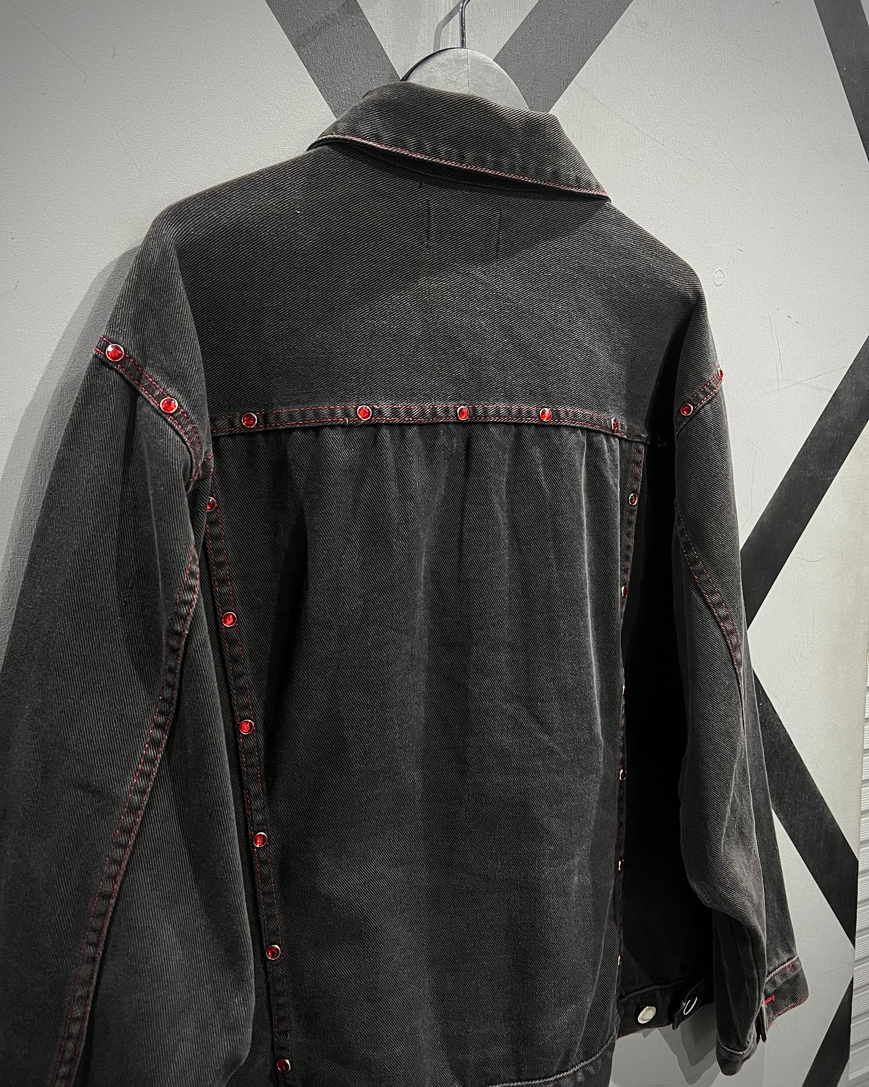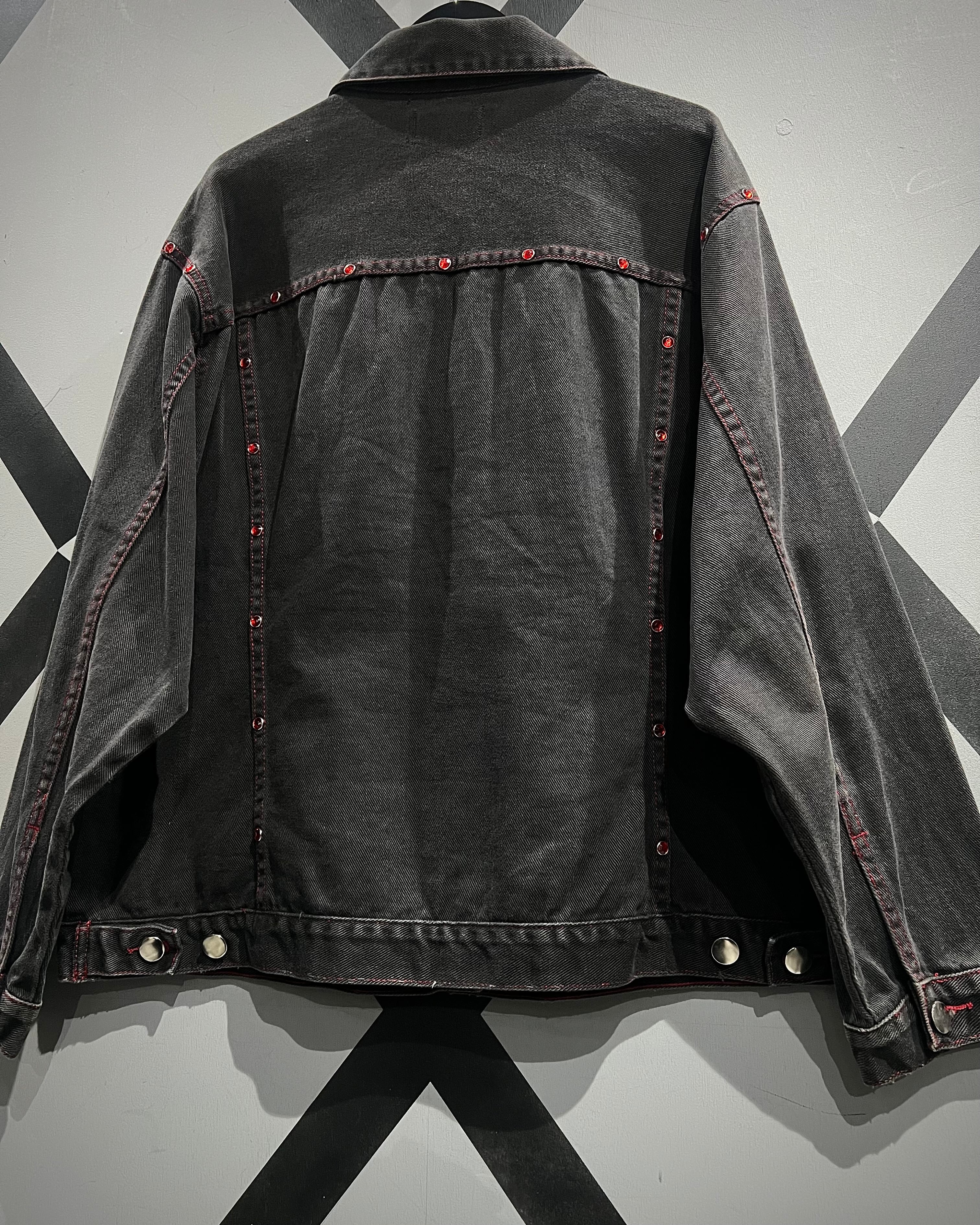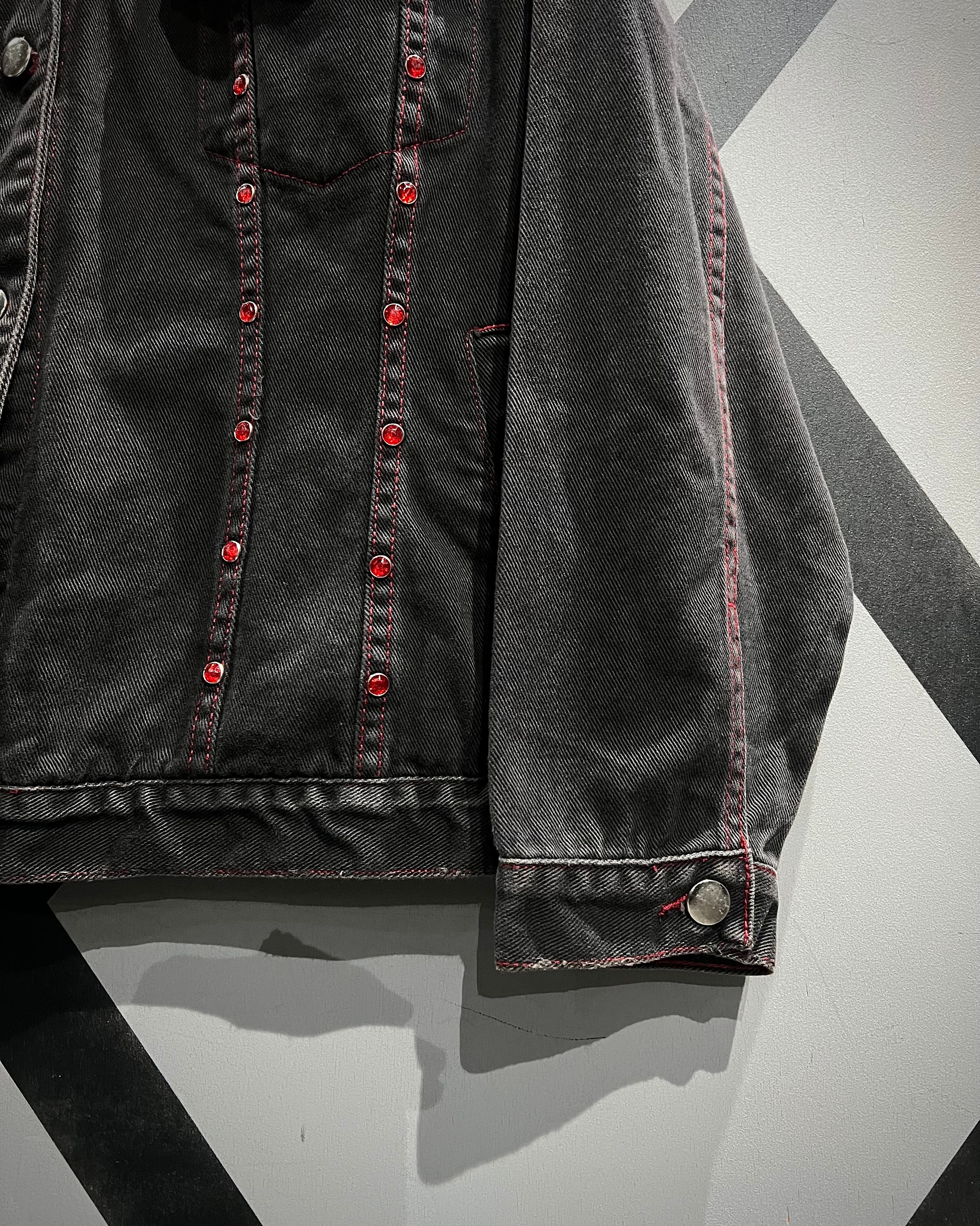 フェードの効いた墨黒のデニムをボディに使用し、シーム部分に赤のラインストーンの装飾が加わったデニムジャケット。
