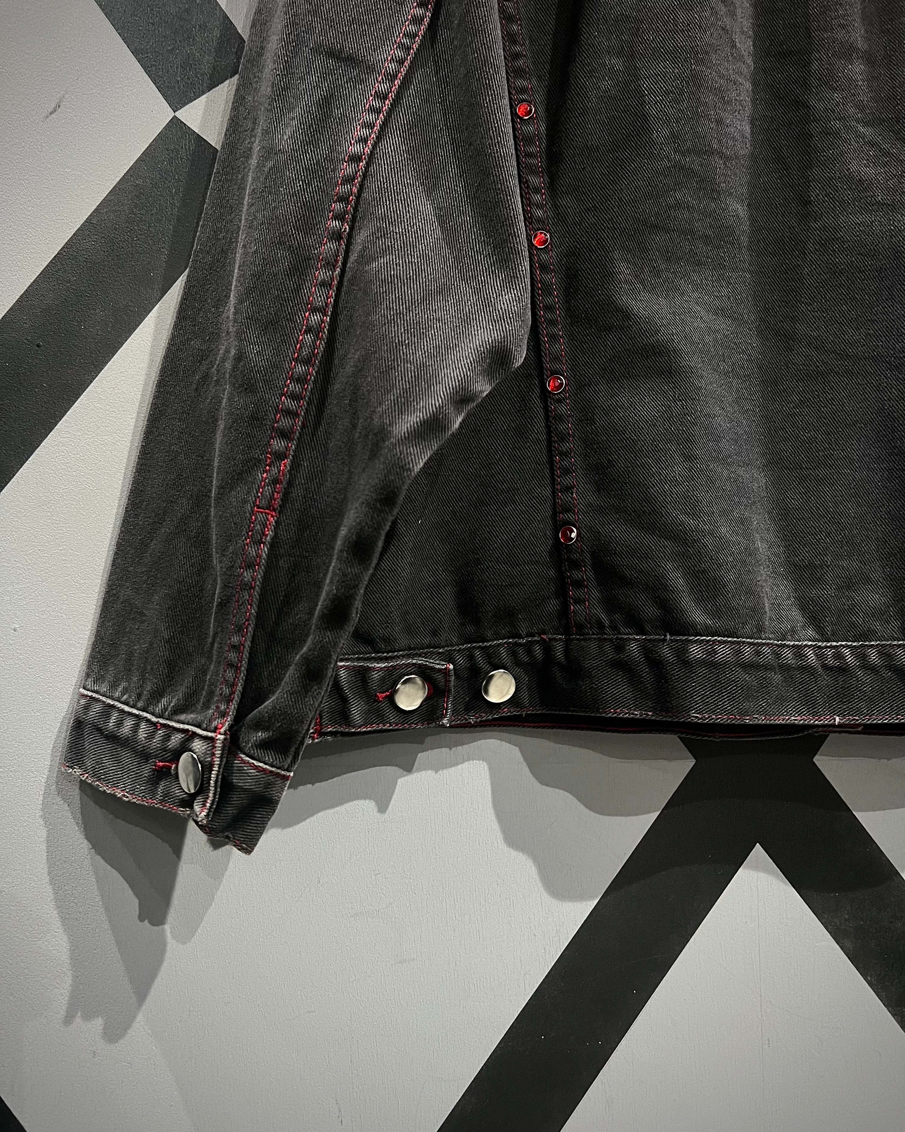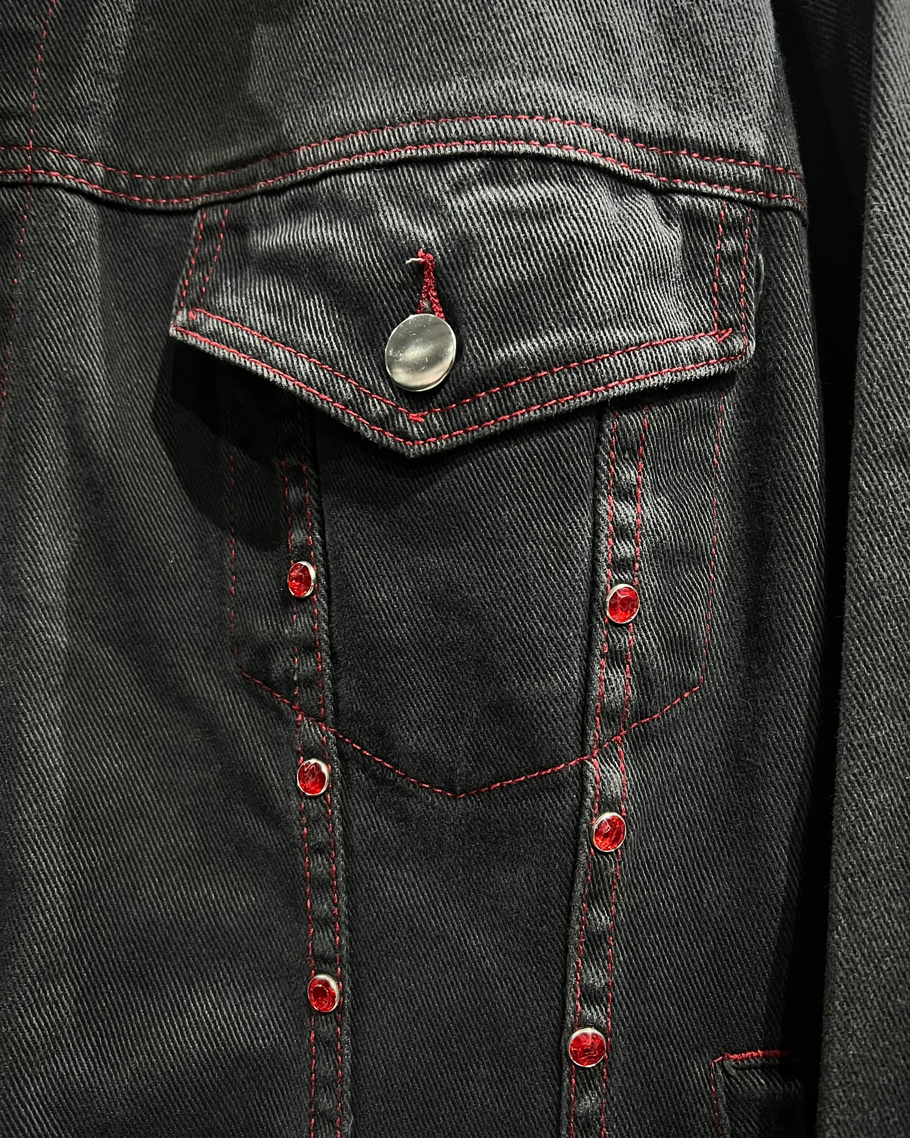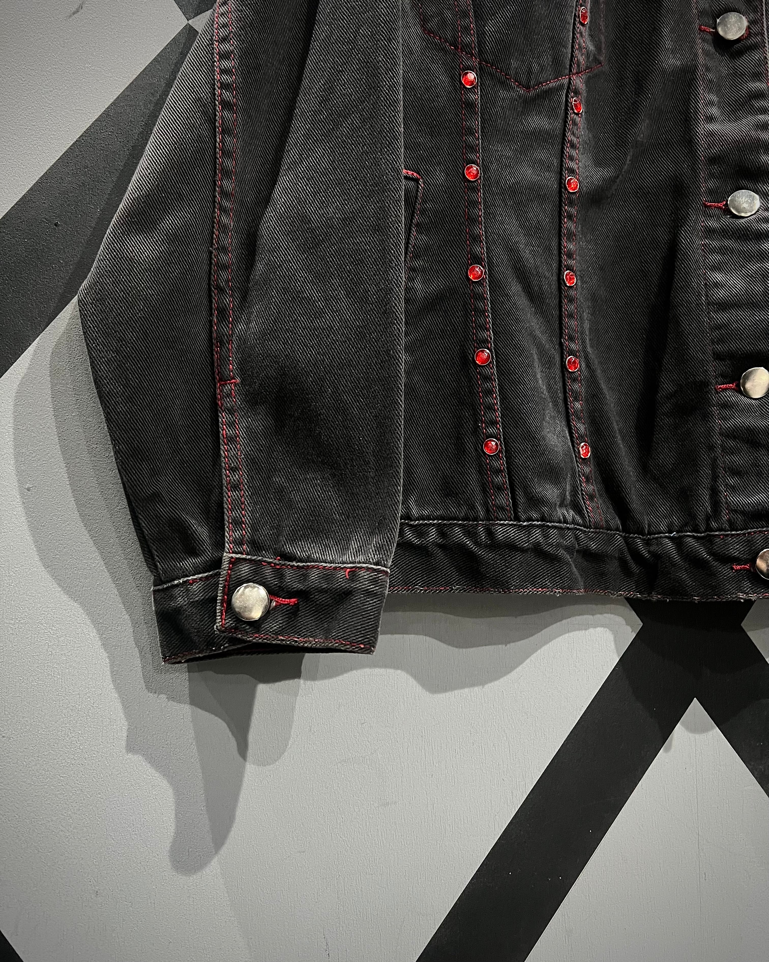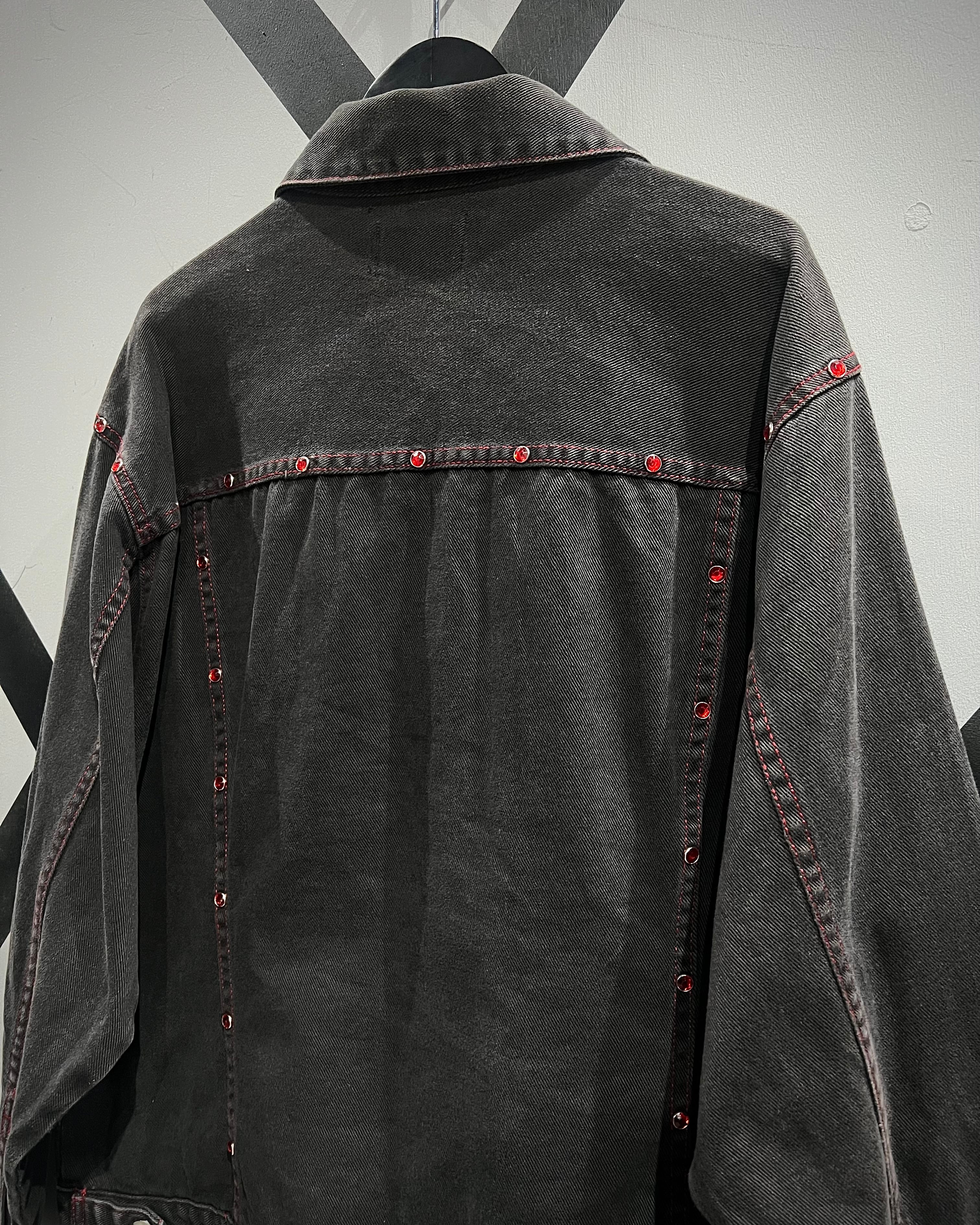 フェードの効いた墨黒のデニムをボディに使用し、シーム部分に赤のラインストーンの装飾が加わったデニムジャケット。