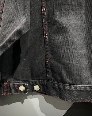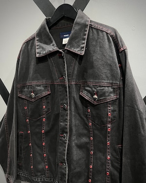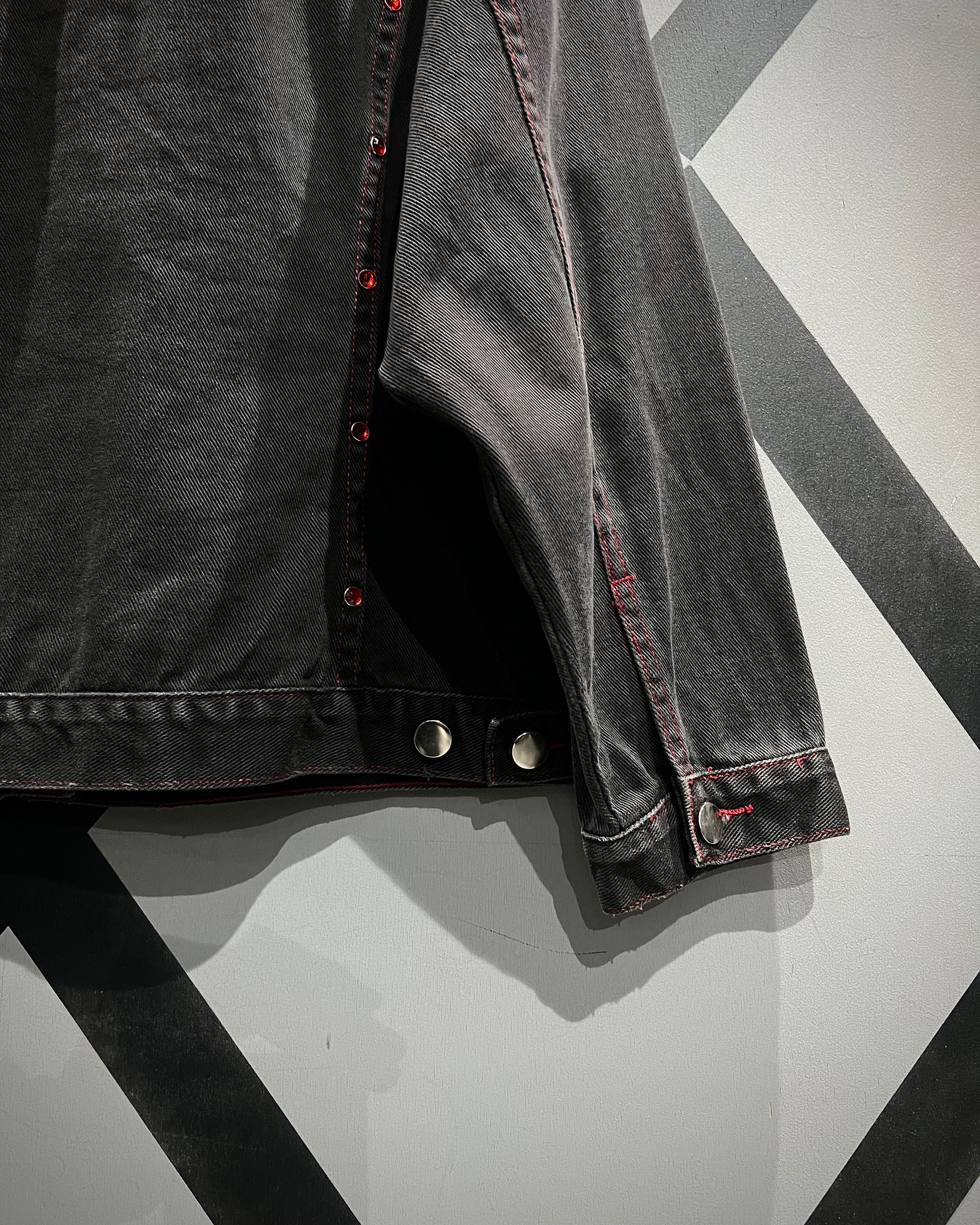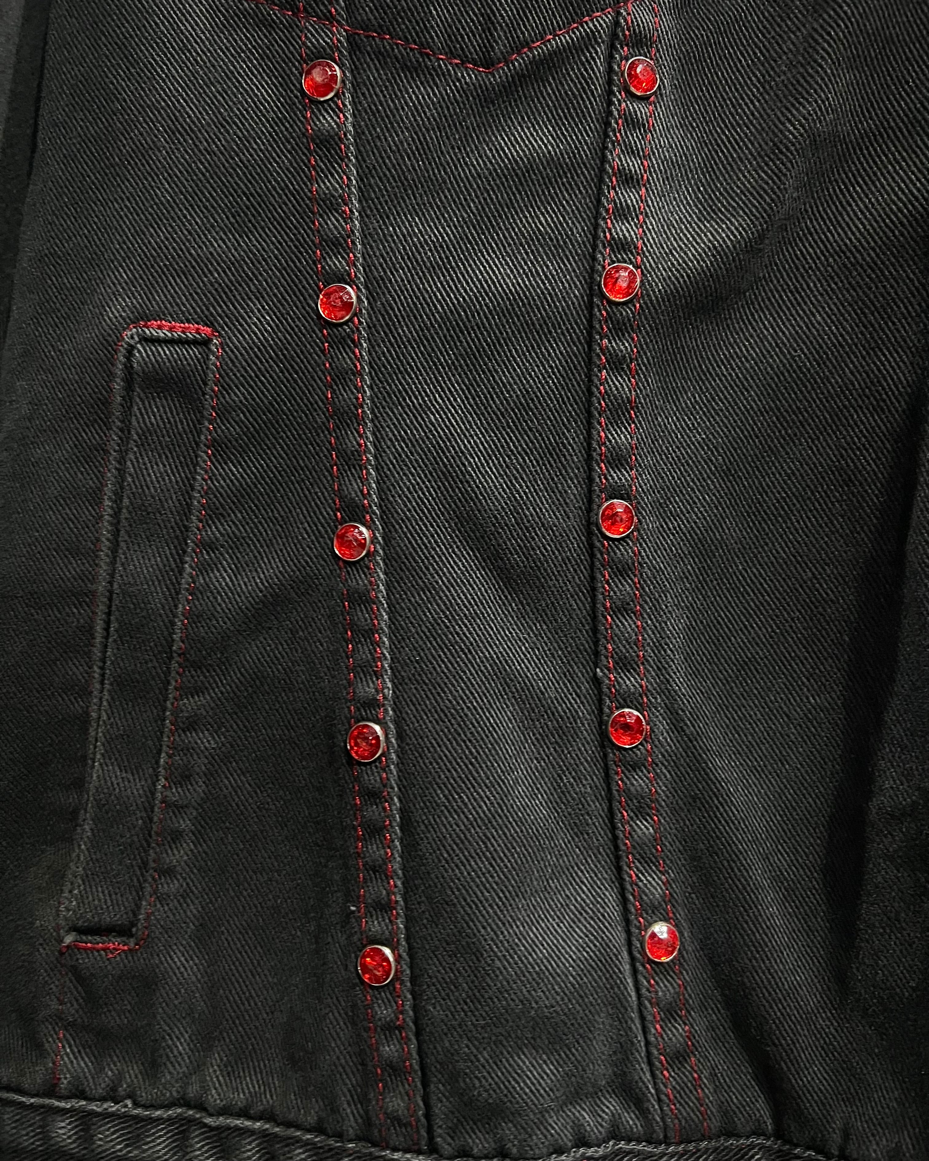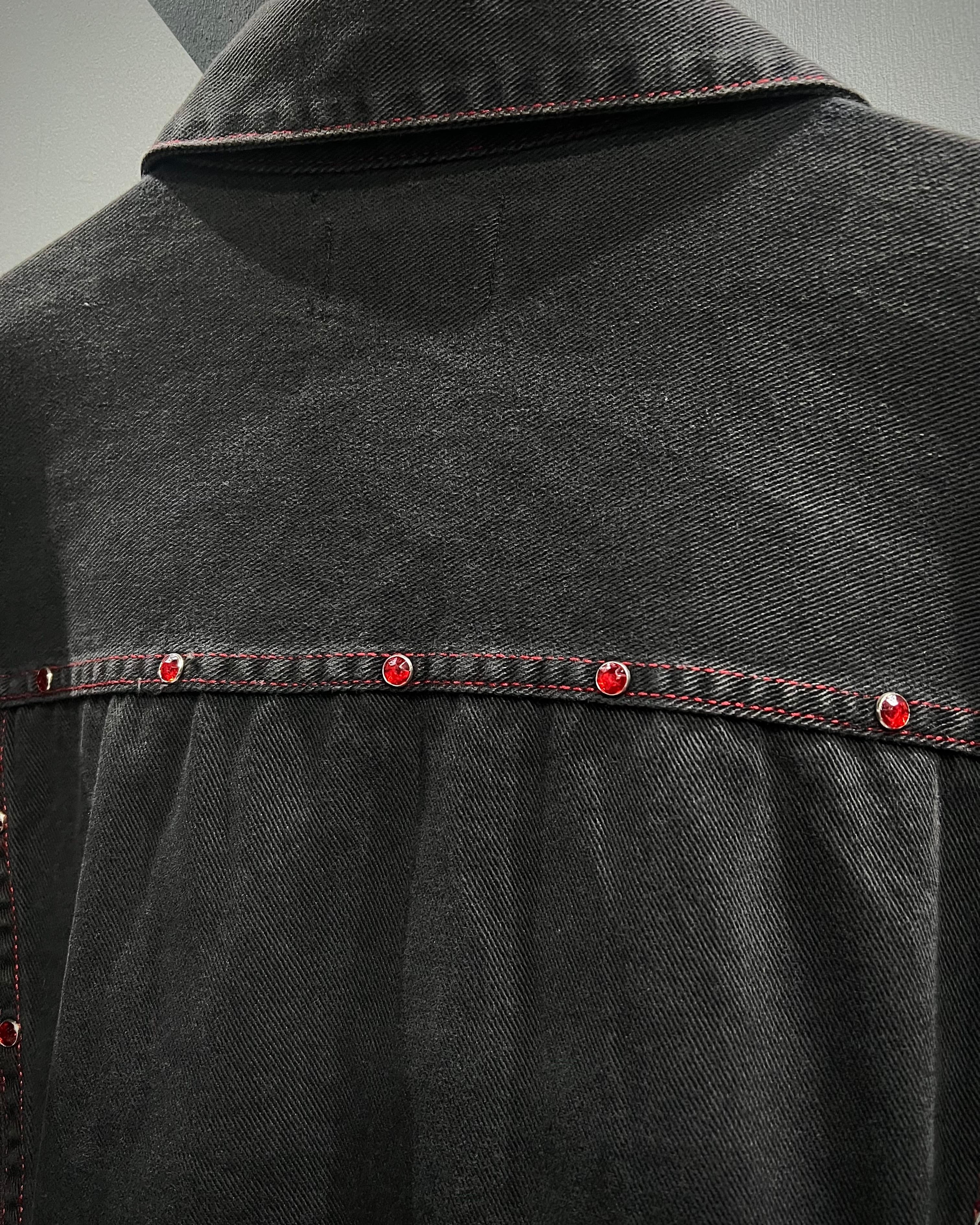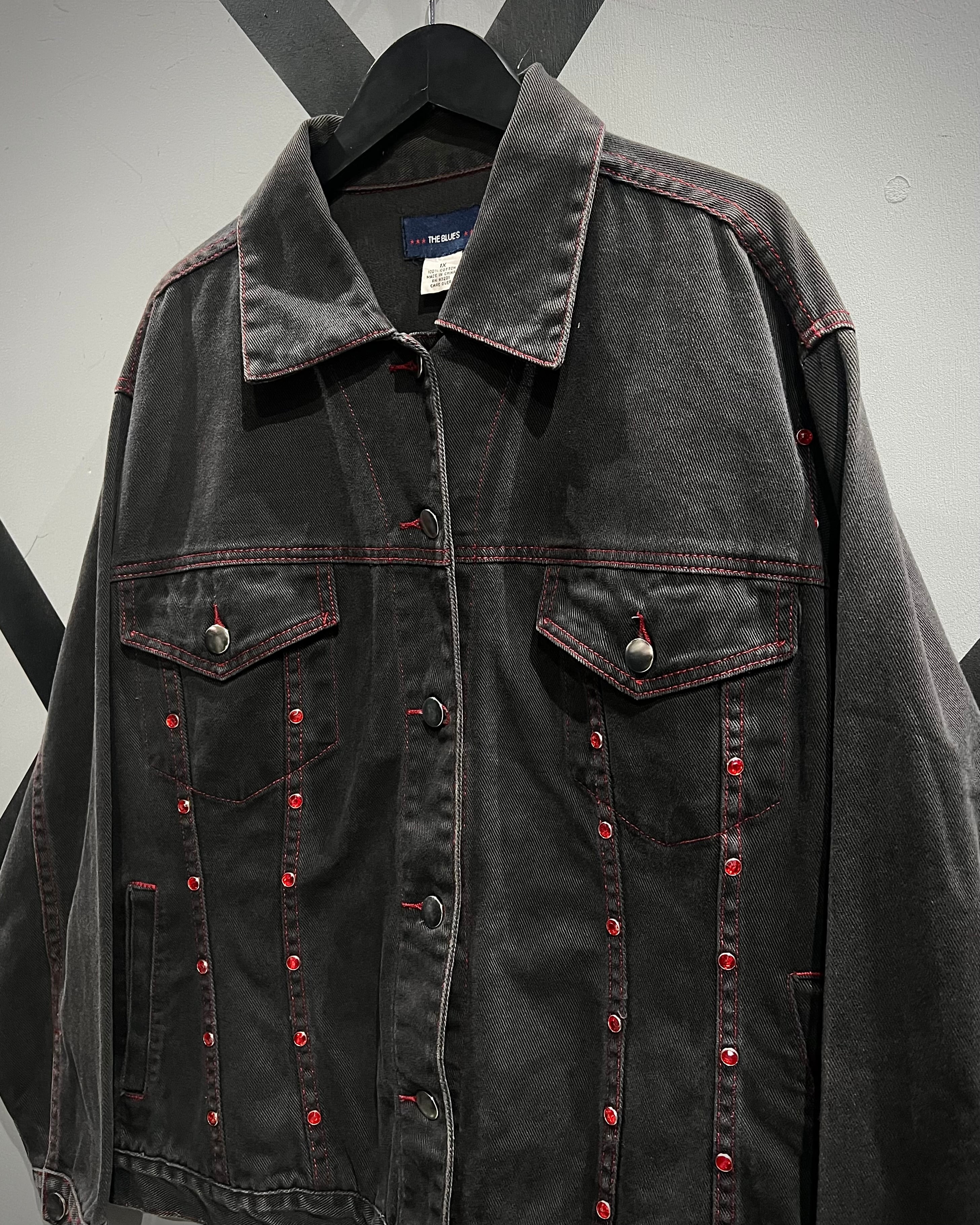 フェードの効いた墨黒のデニムをボディに使用し、シーム部分に赤のラインストーンの装飾が加わったデニムジャケット。