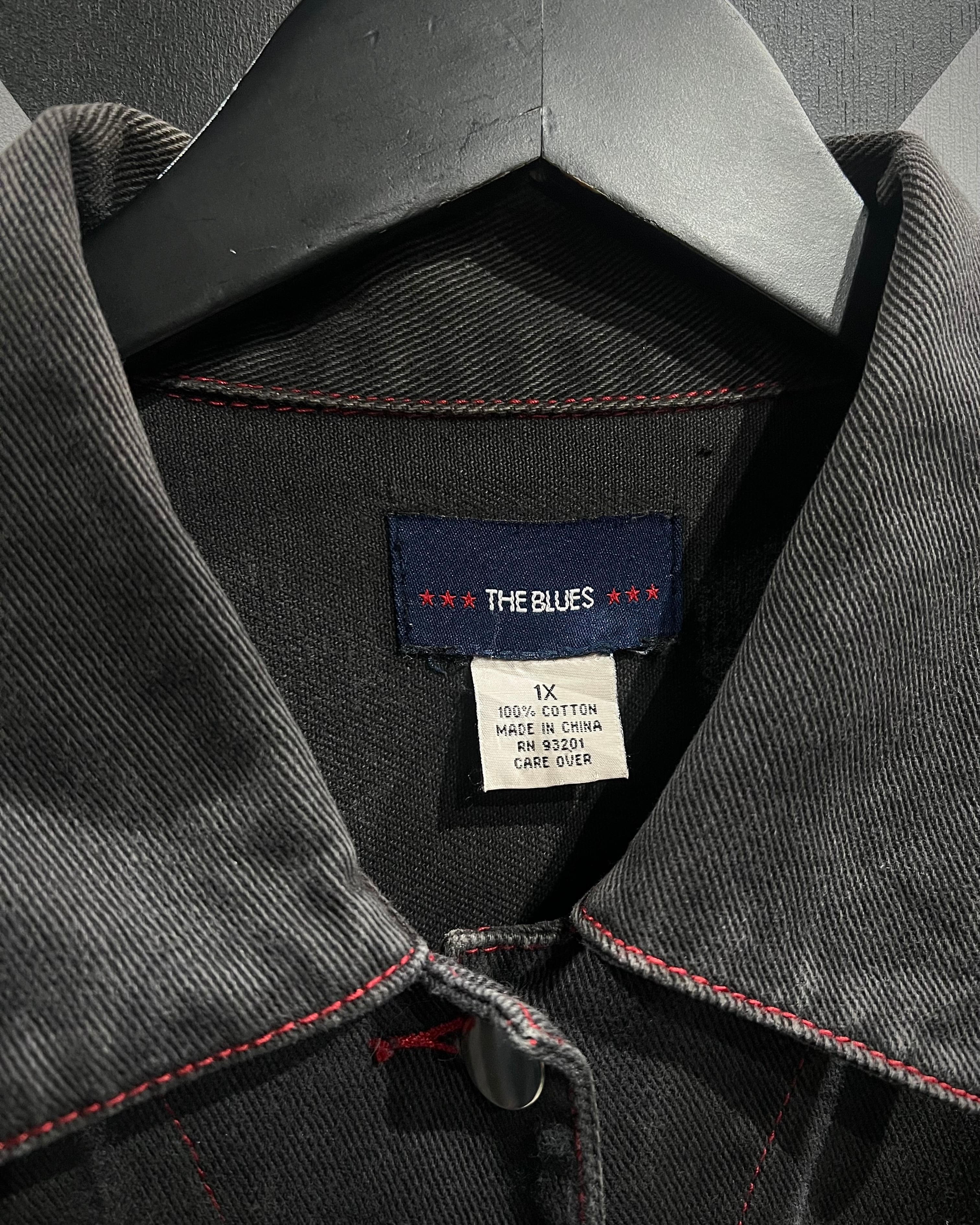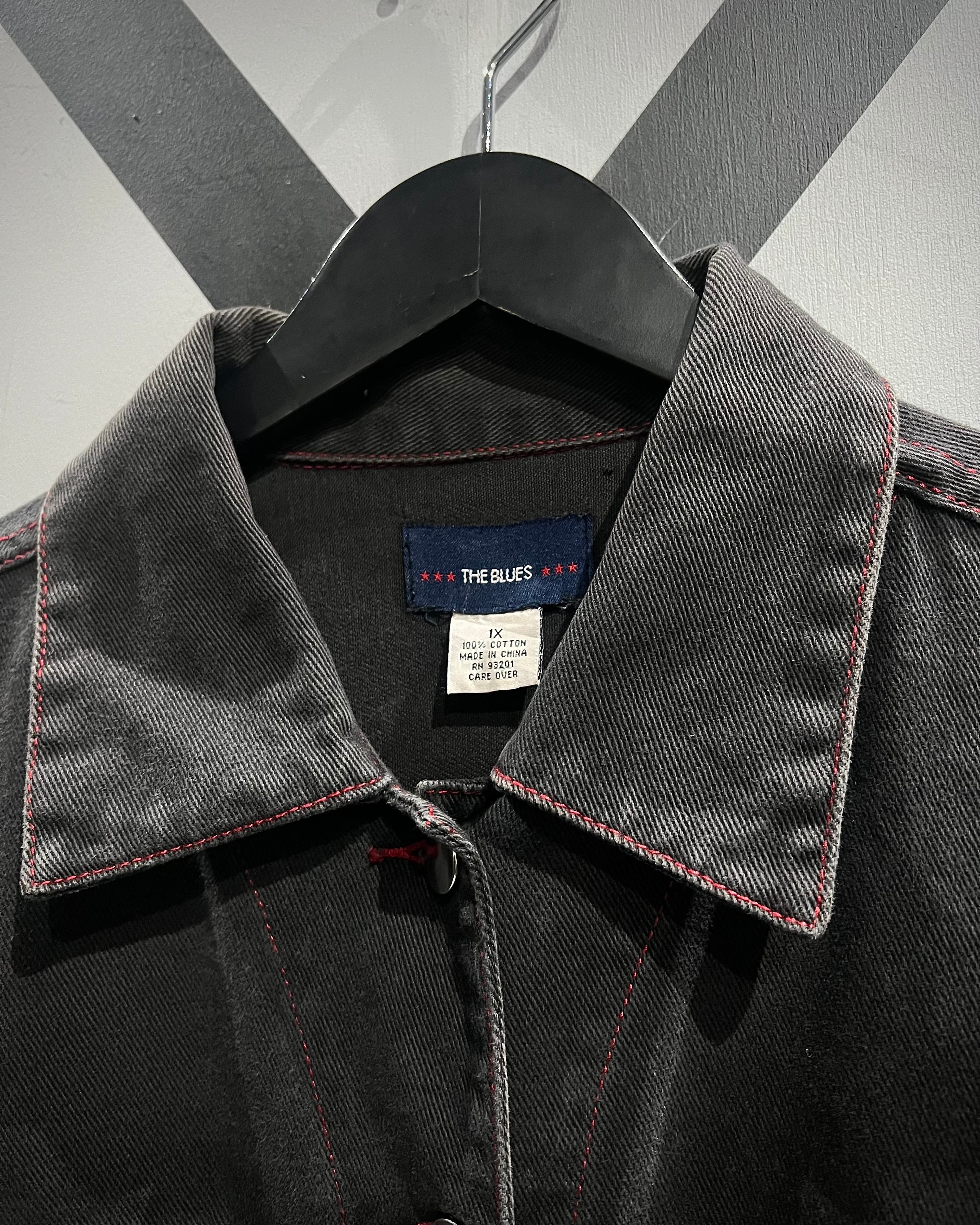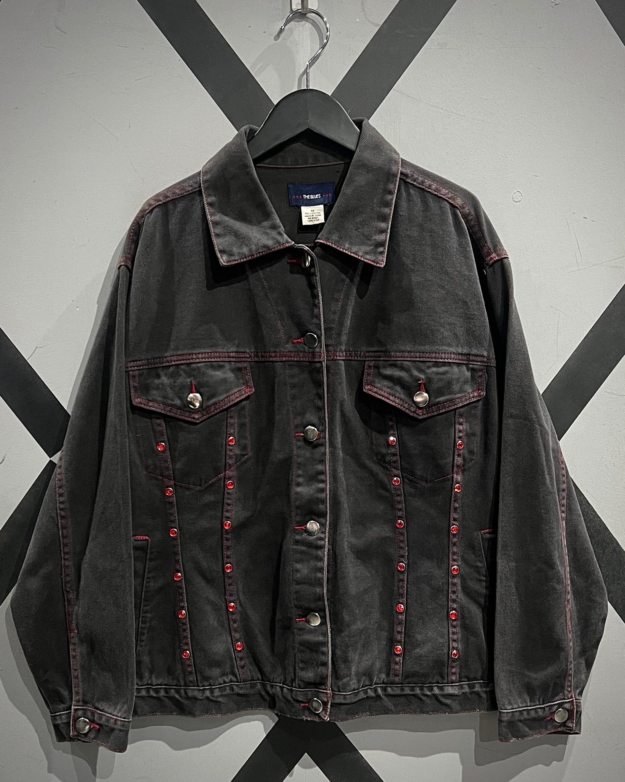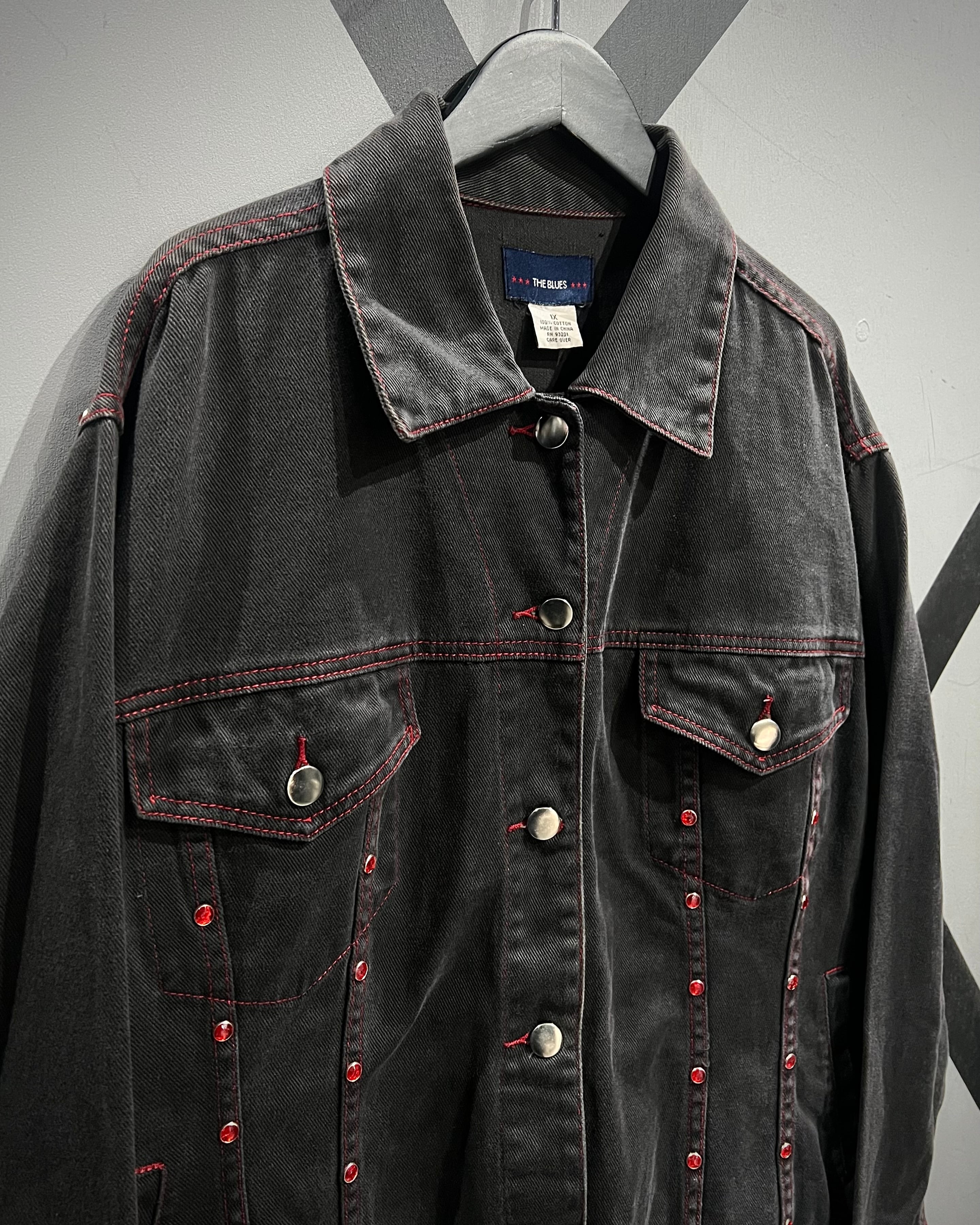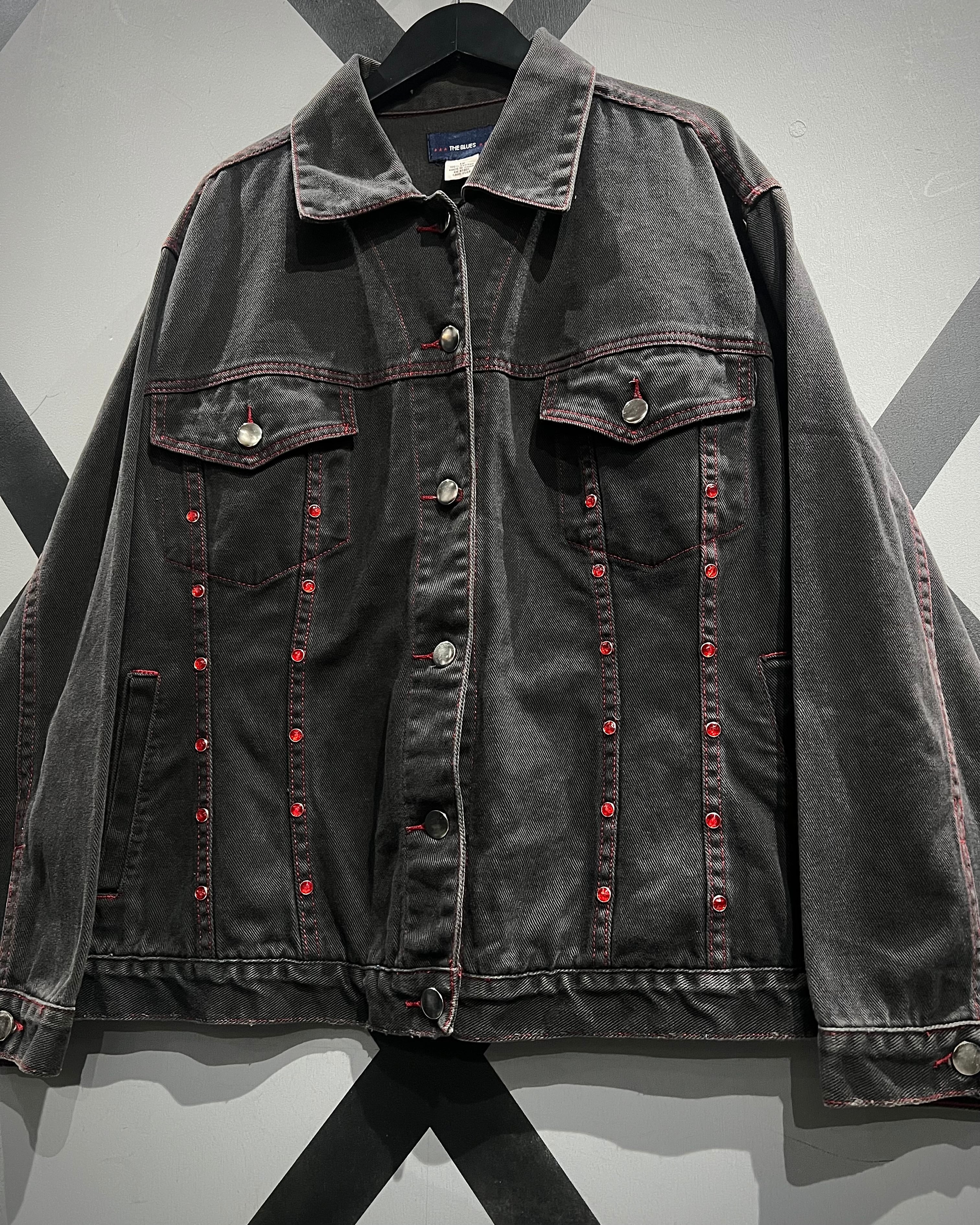 フェードの効いた墨黒のデニムをボディに使用し、シーム部分に赤のラインストーンの装飾が加わったデニムジャケット。