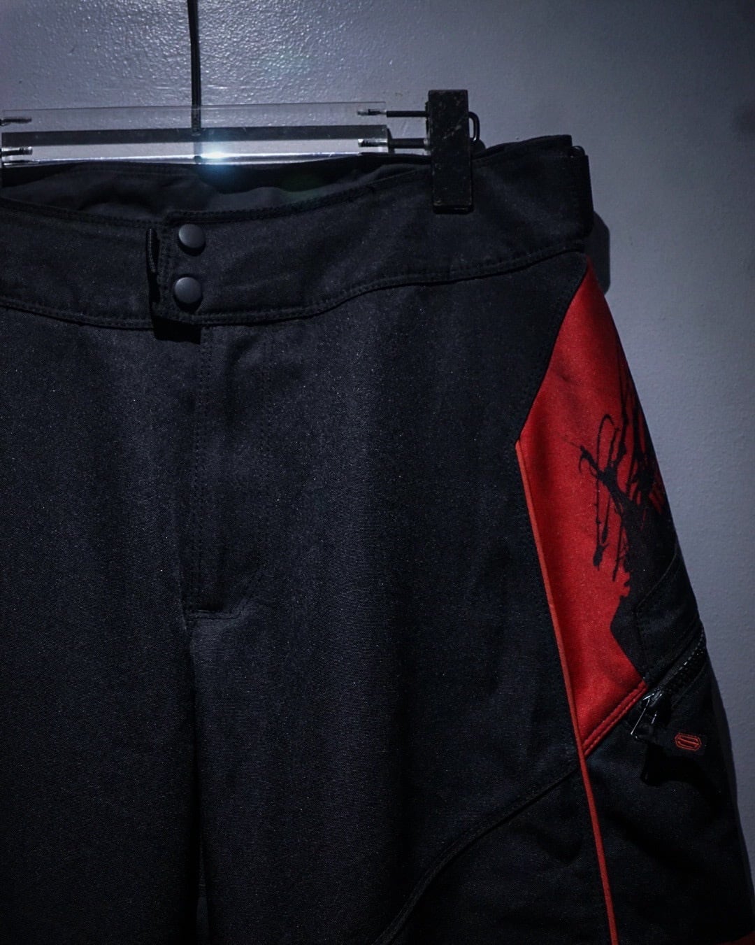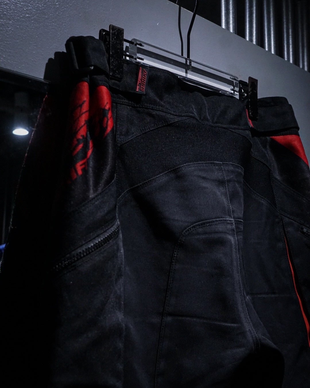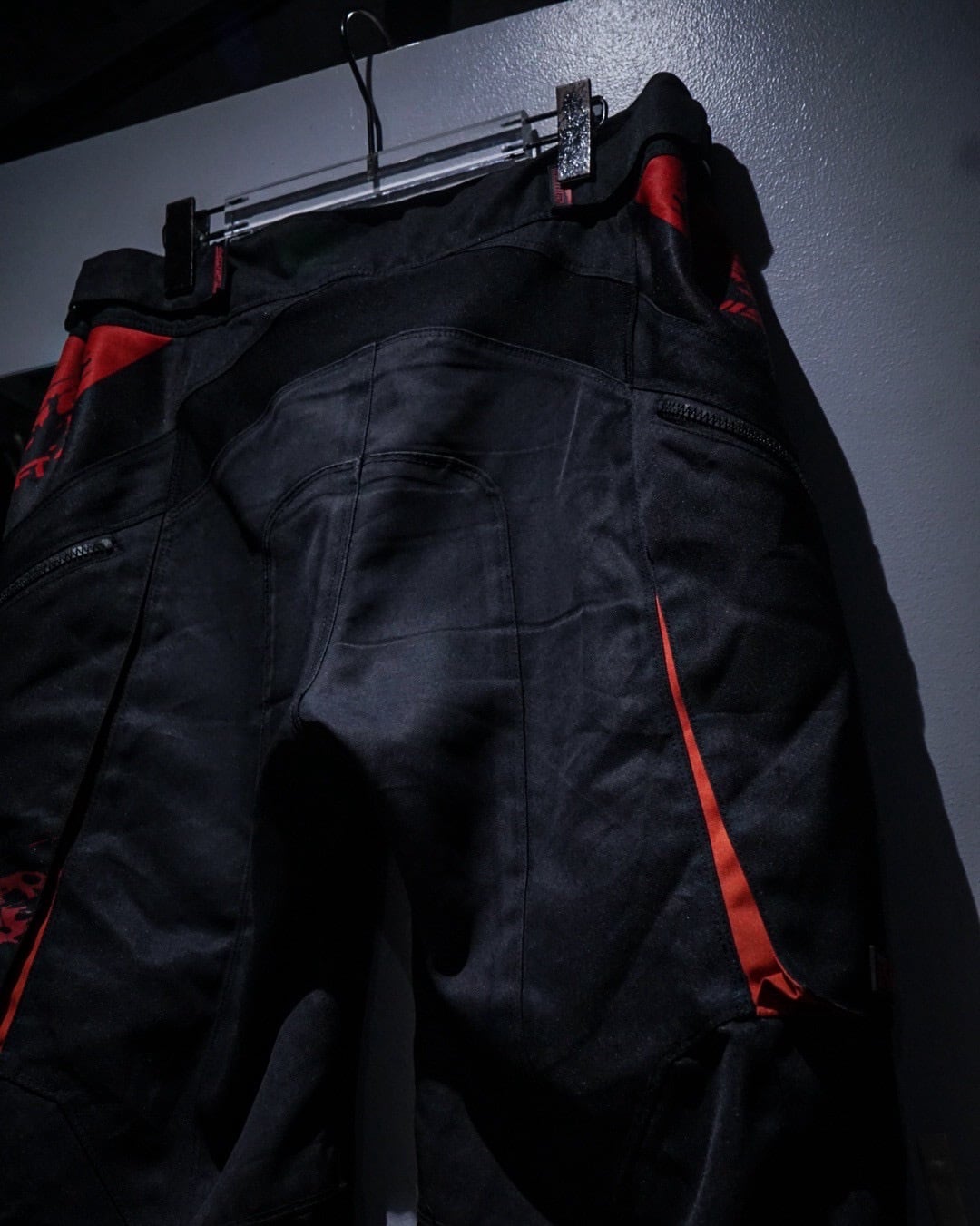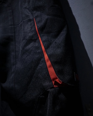 タフでハリのあるナイロンファブリックをベースに、ブラック×レッドのコントラストが効いた切り替えデザインが圧倒的な存在感を放つ一本。走行時を想定した機能美がそのままデザインとして昇華された、まさにレーシングギアならではのプロダクトです。