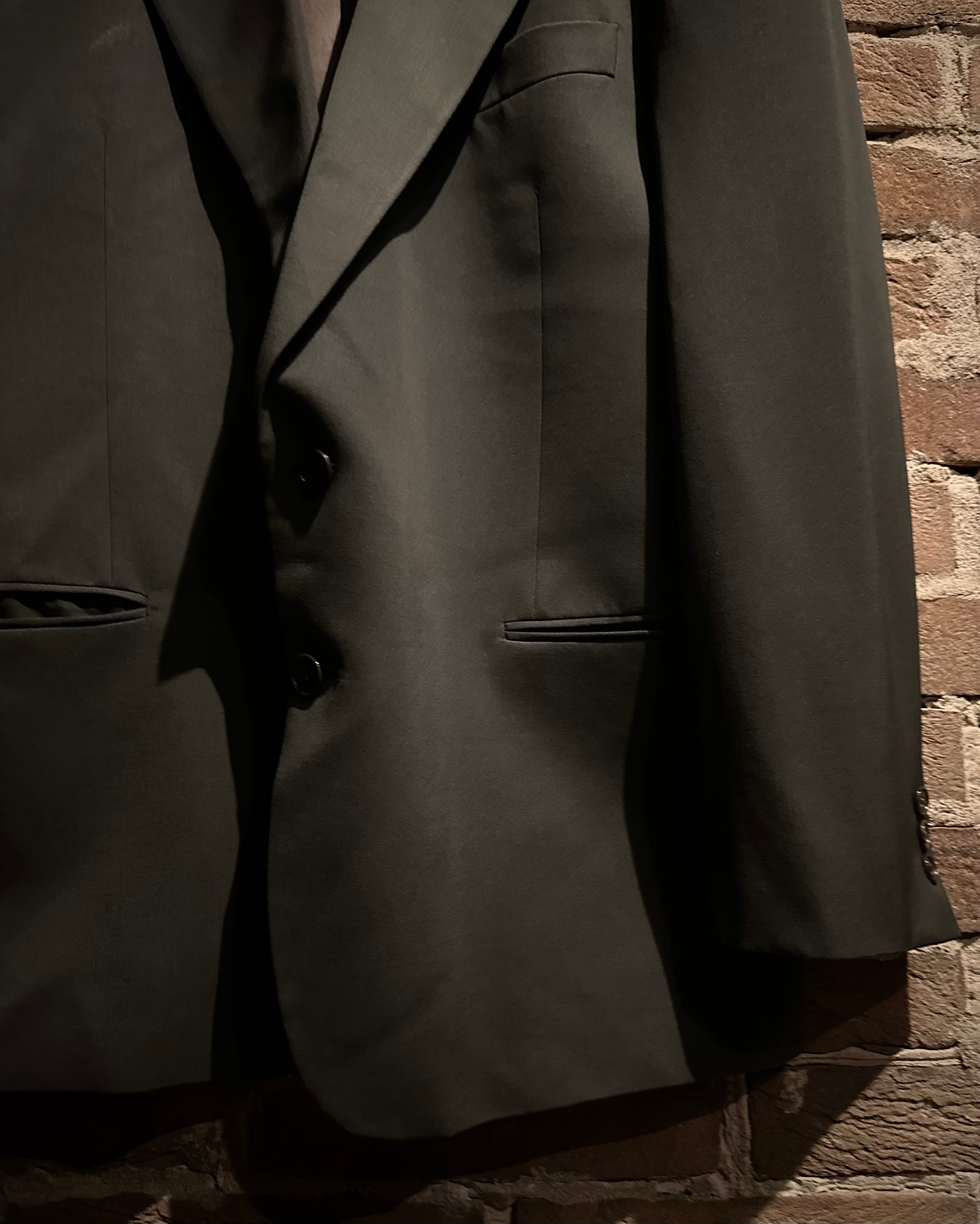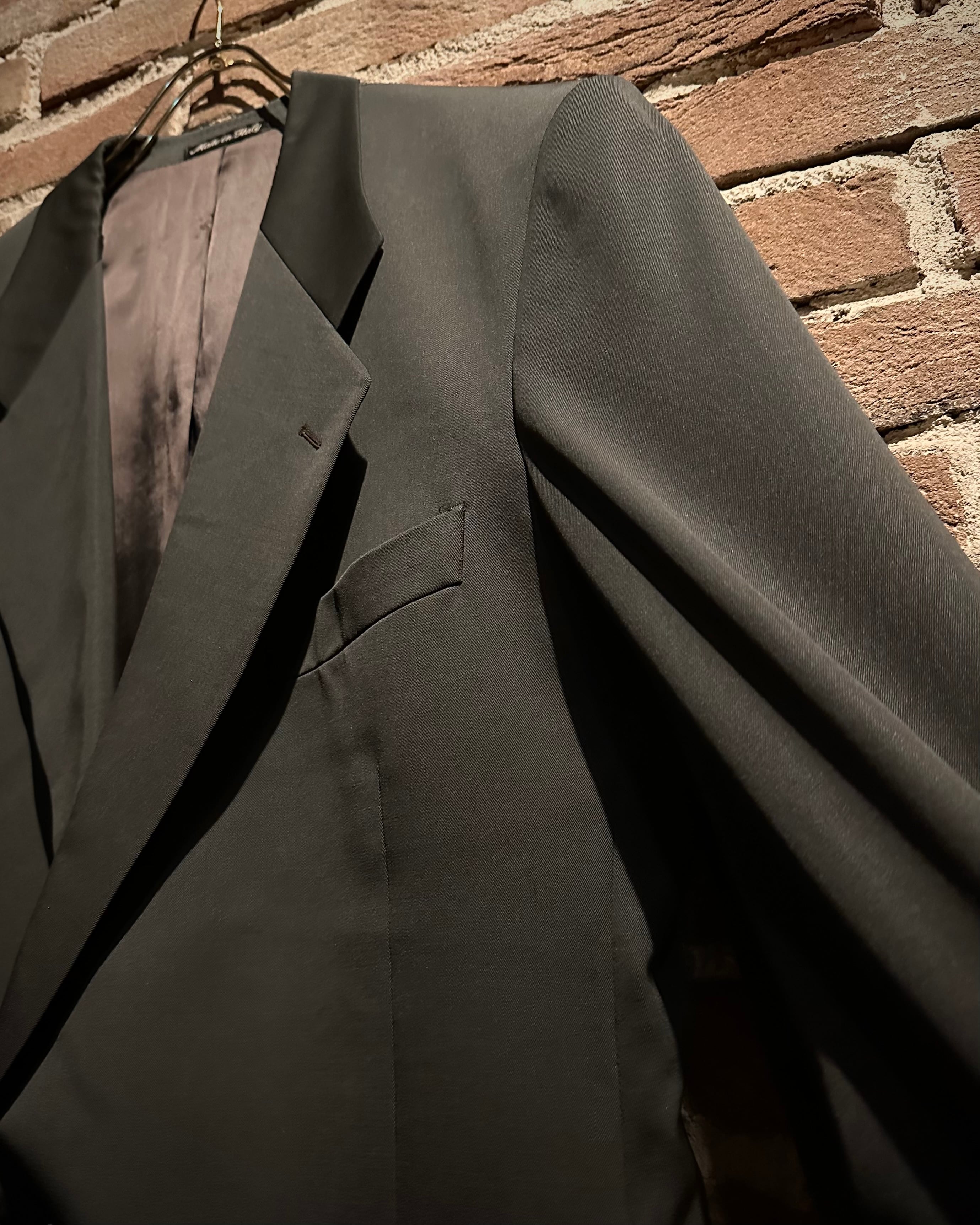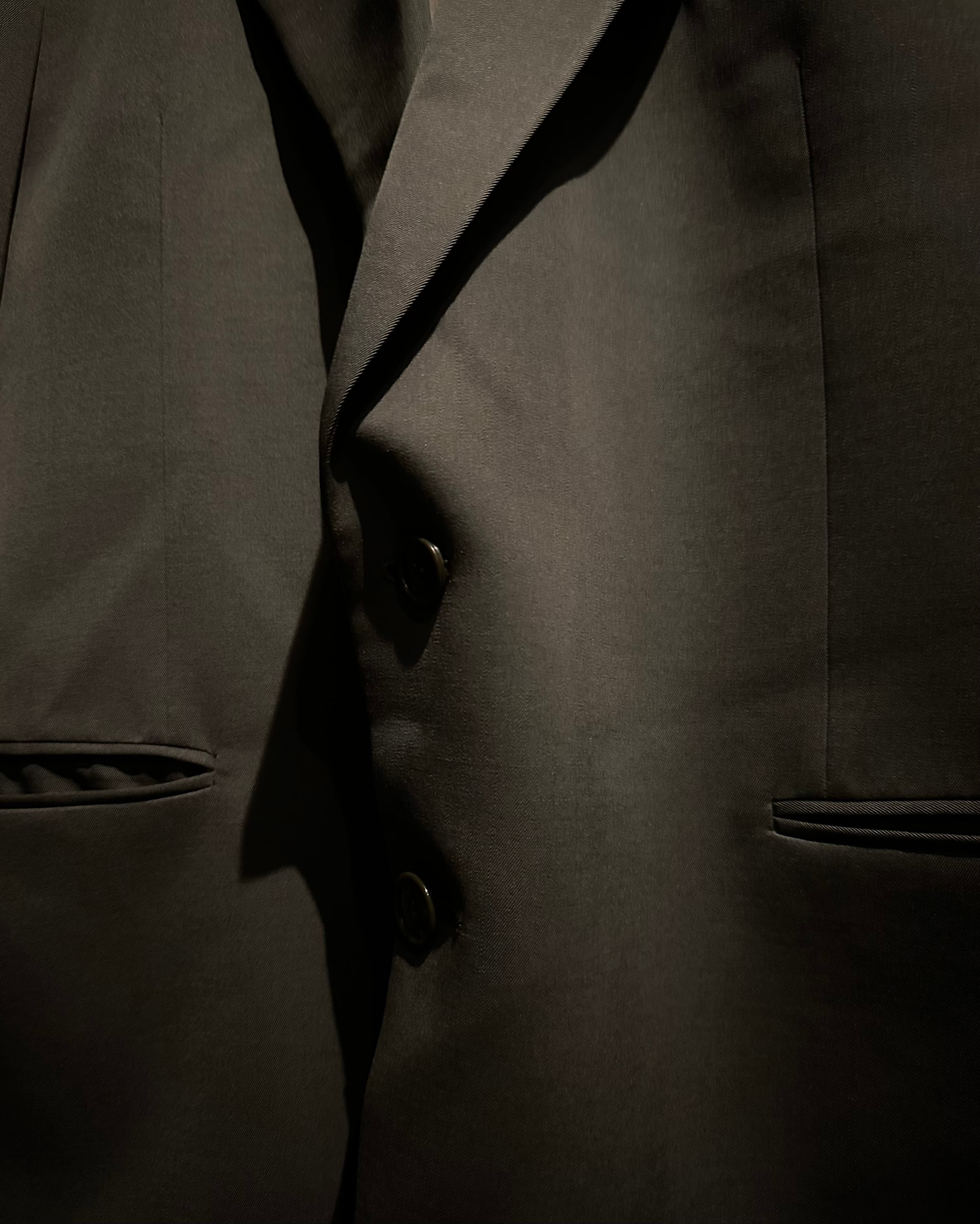 シングル2ボタン、ノッチドラペルといったクラシックなディテールに加え、秀逸なパターンメイクによって生まれる美しいラインが魅力。肩の収まりから裾にかけて流れるようなシルエットは、まさにアルマーニらしい洗練された佇まいです。