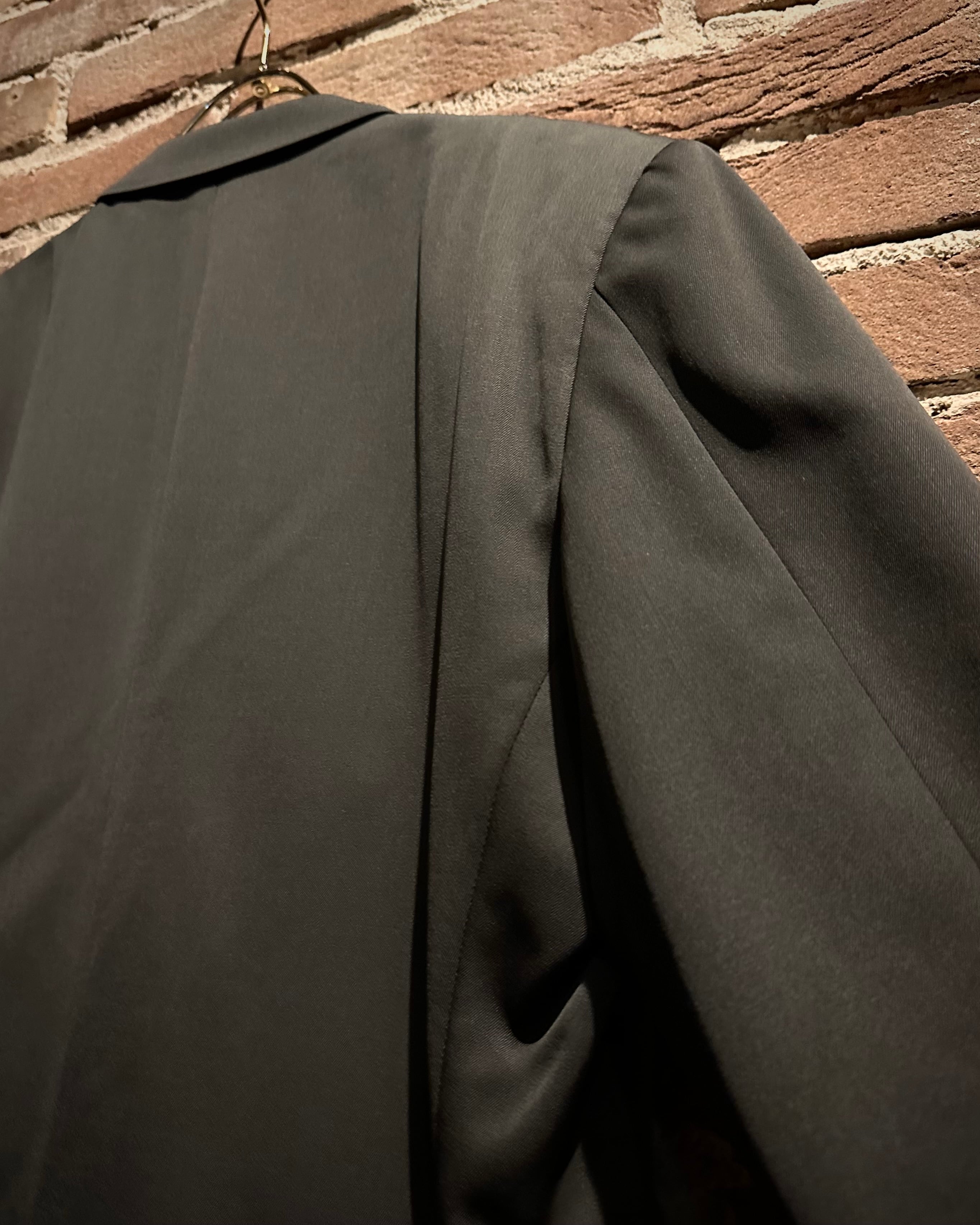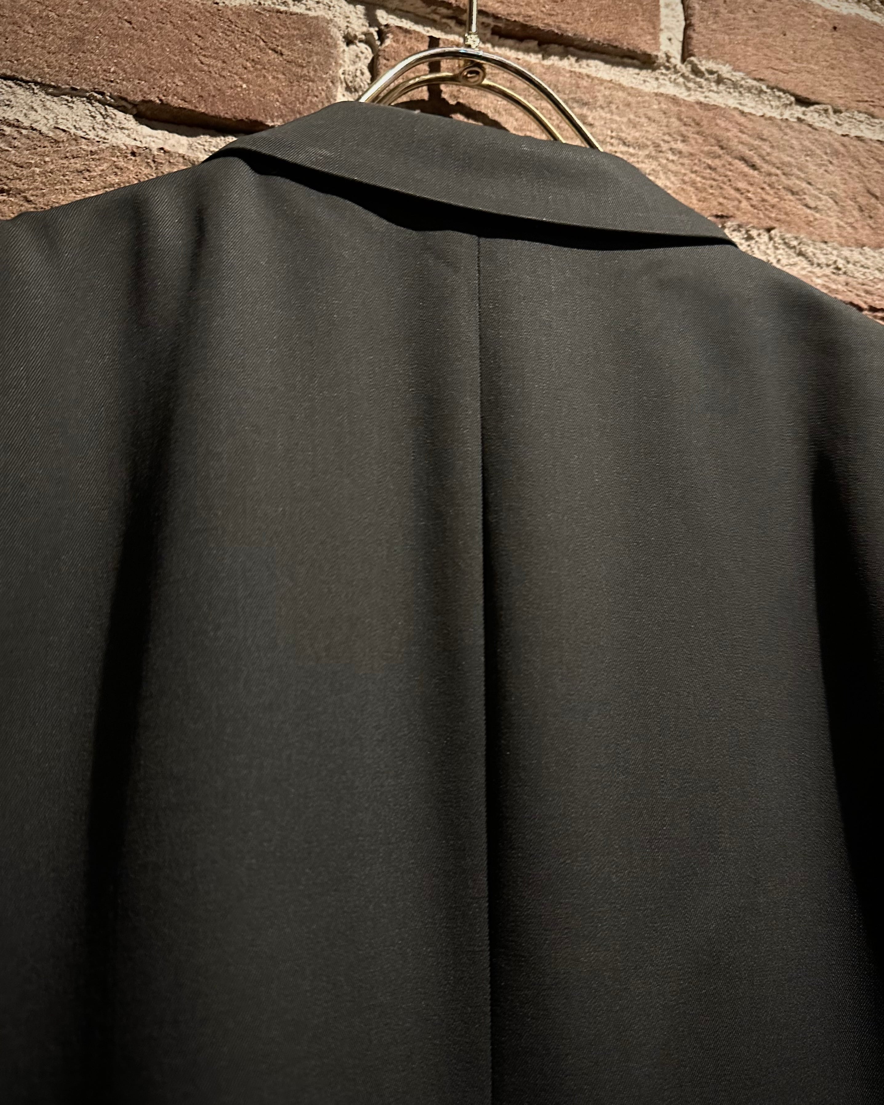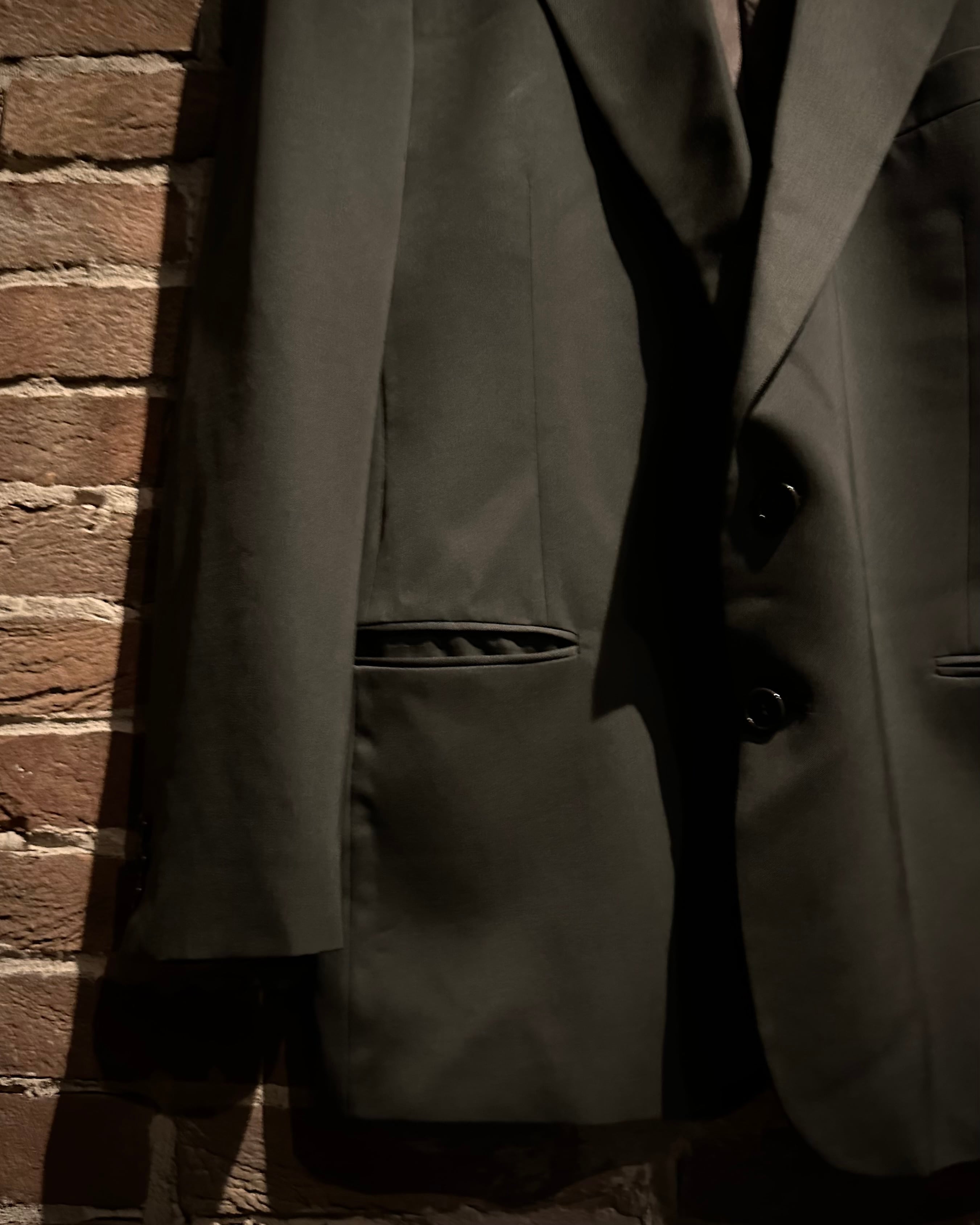 シングル2ボタン、ノッチドラペルといったクラシックなディテールに加え、秀逸なパターンメイクによって生まれる美しいラインが魅力。肩の収まりから裾にかけて流れるようなシルエットは、まさにアルマーニらしい洗練された佇まいです。