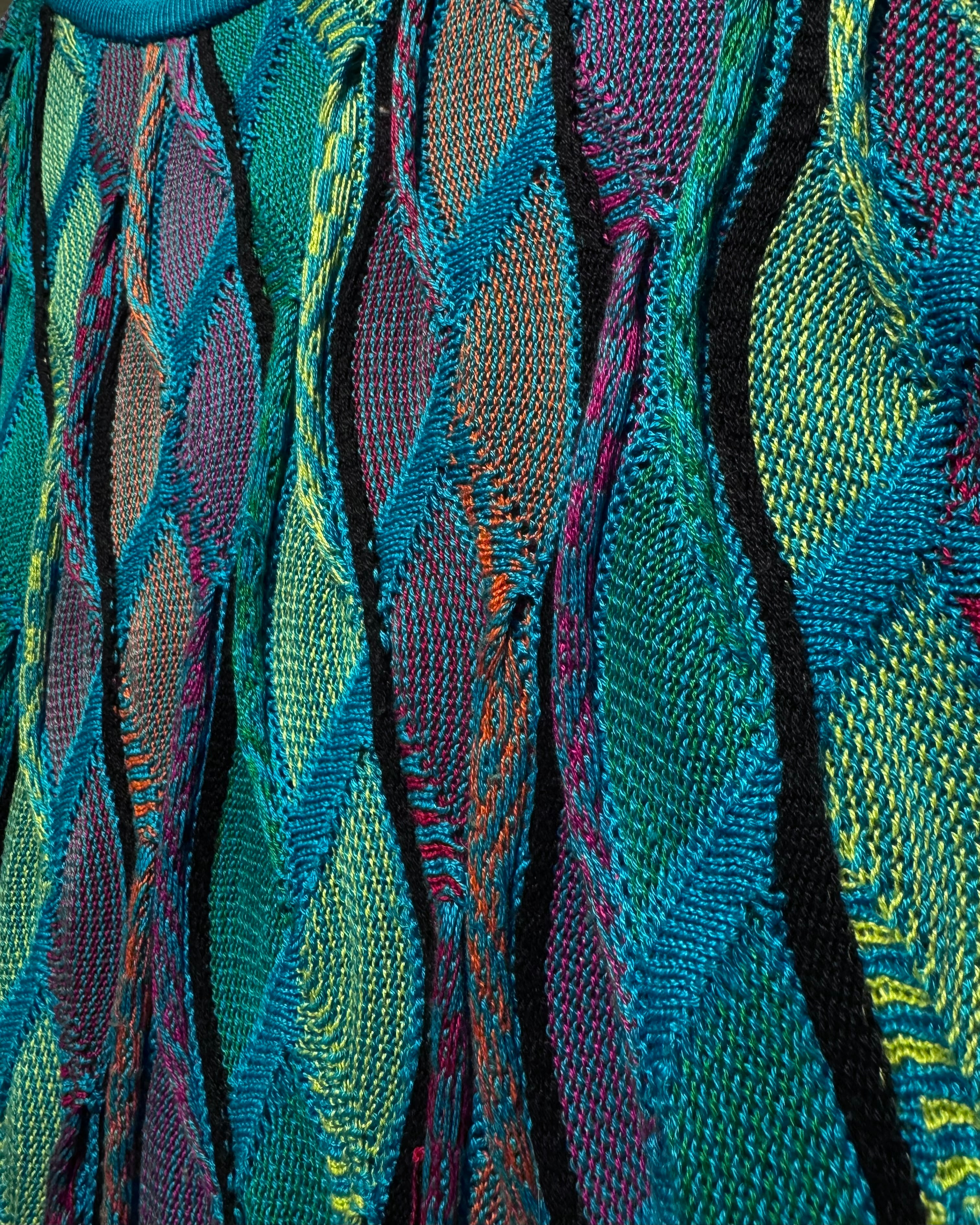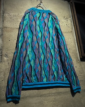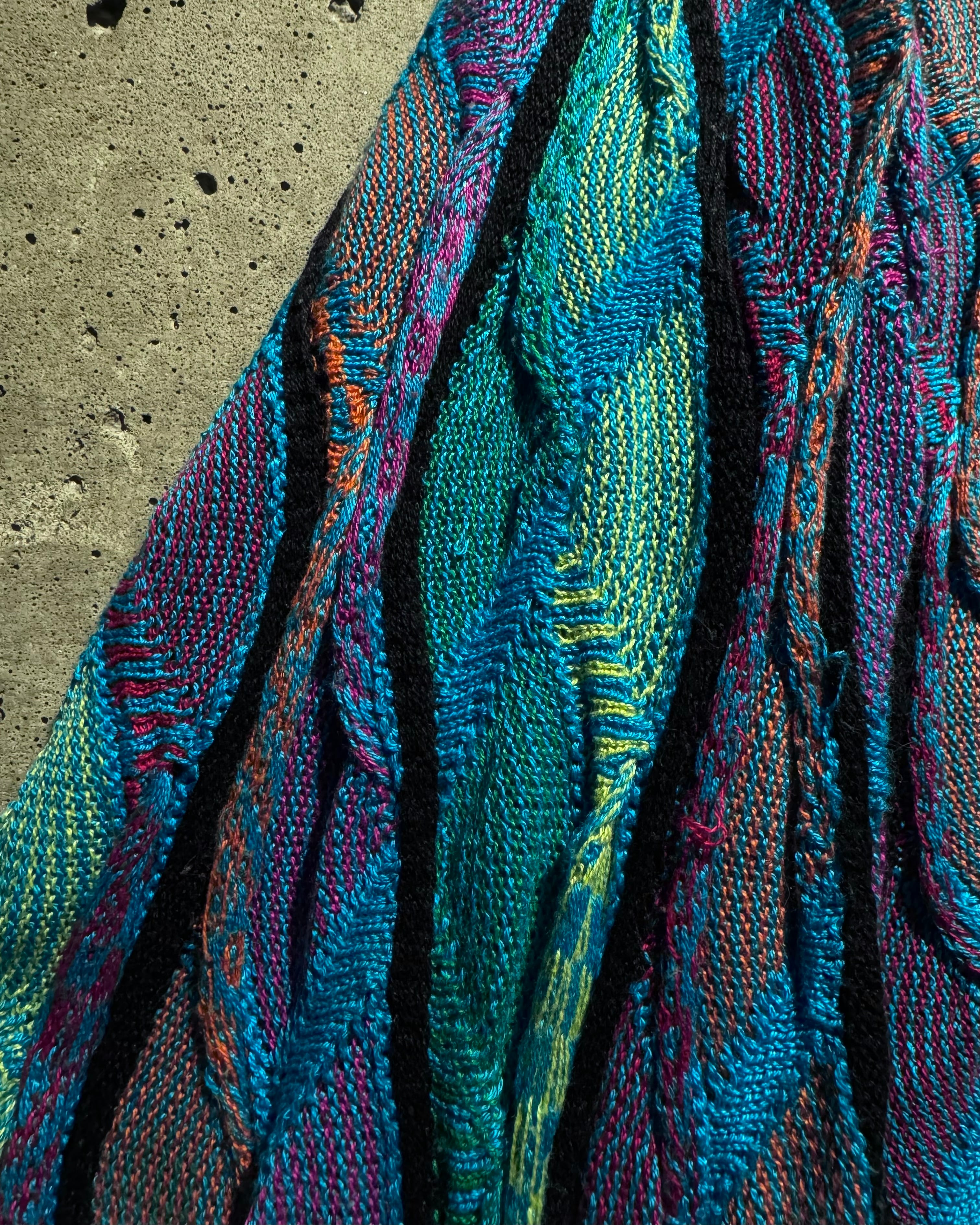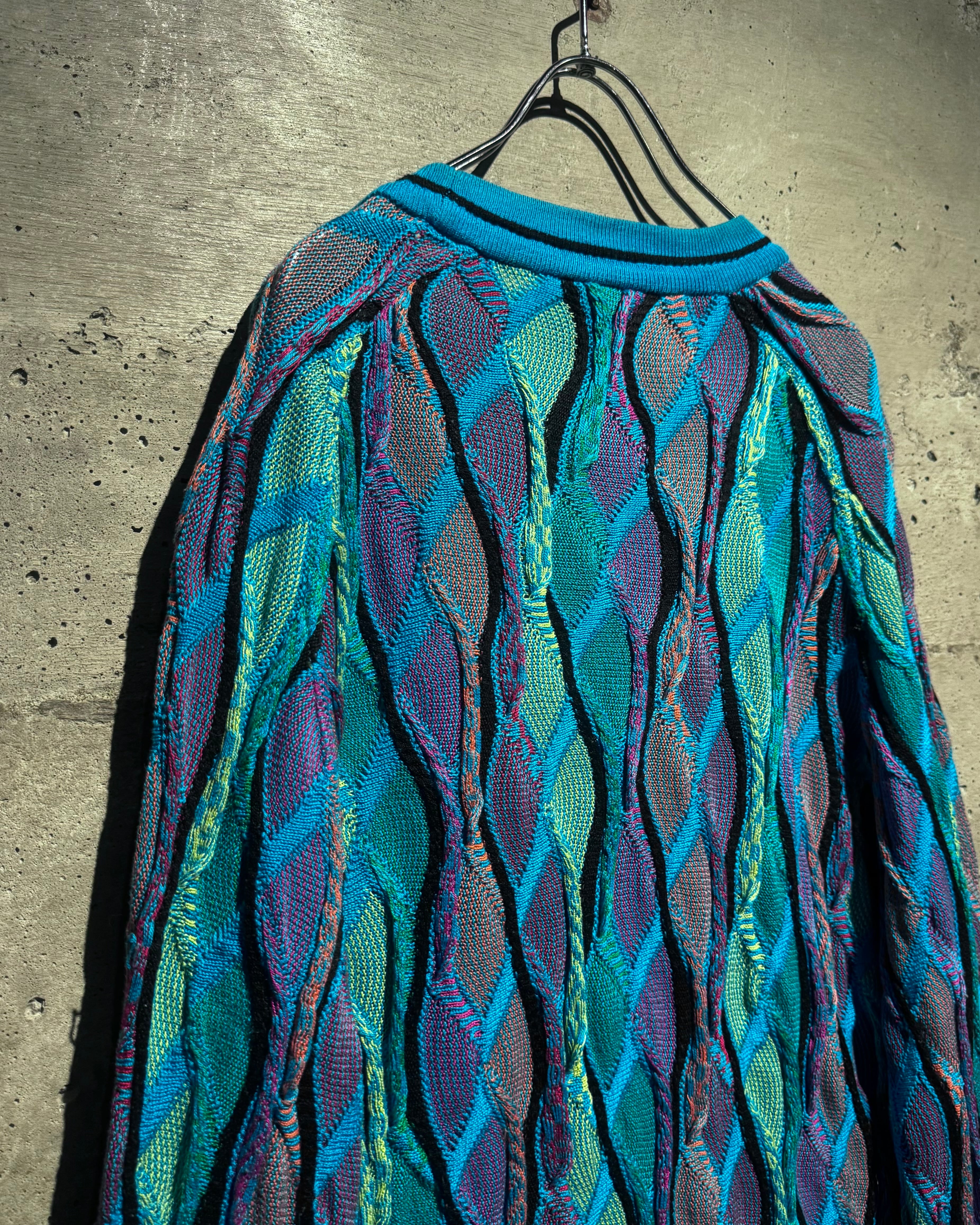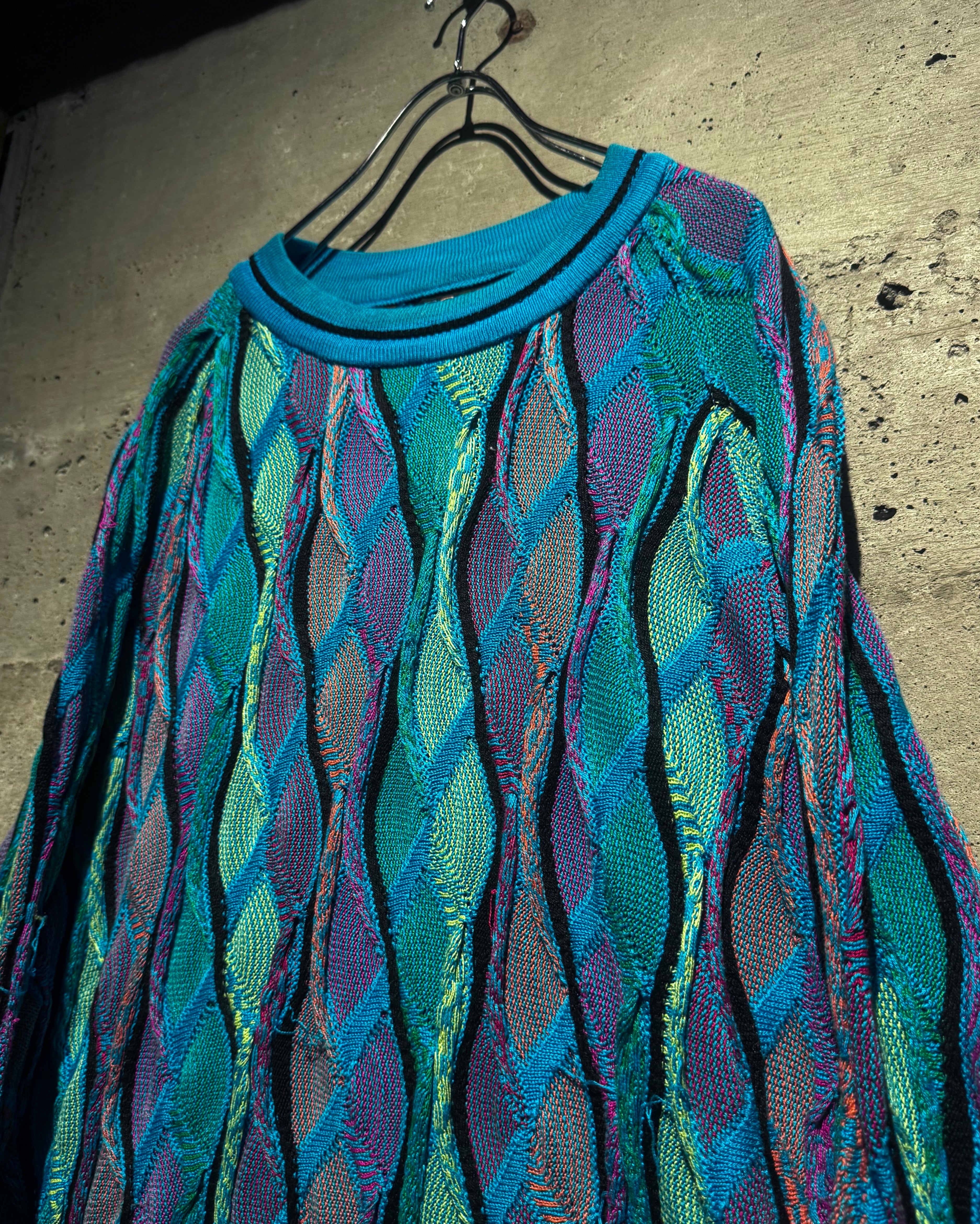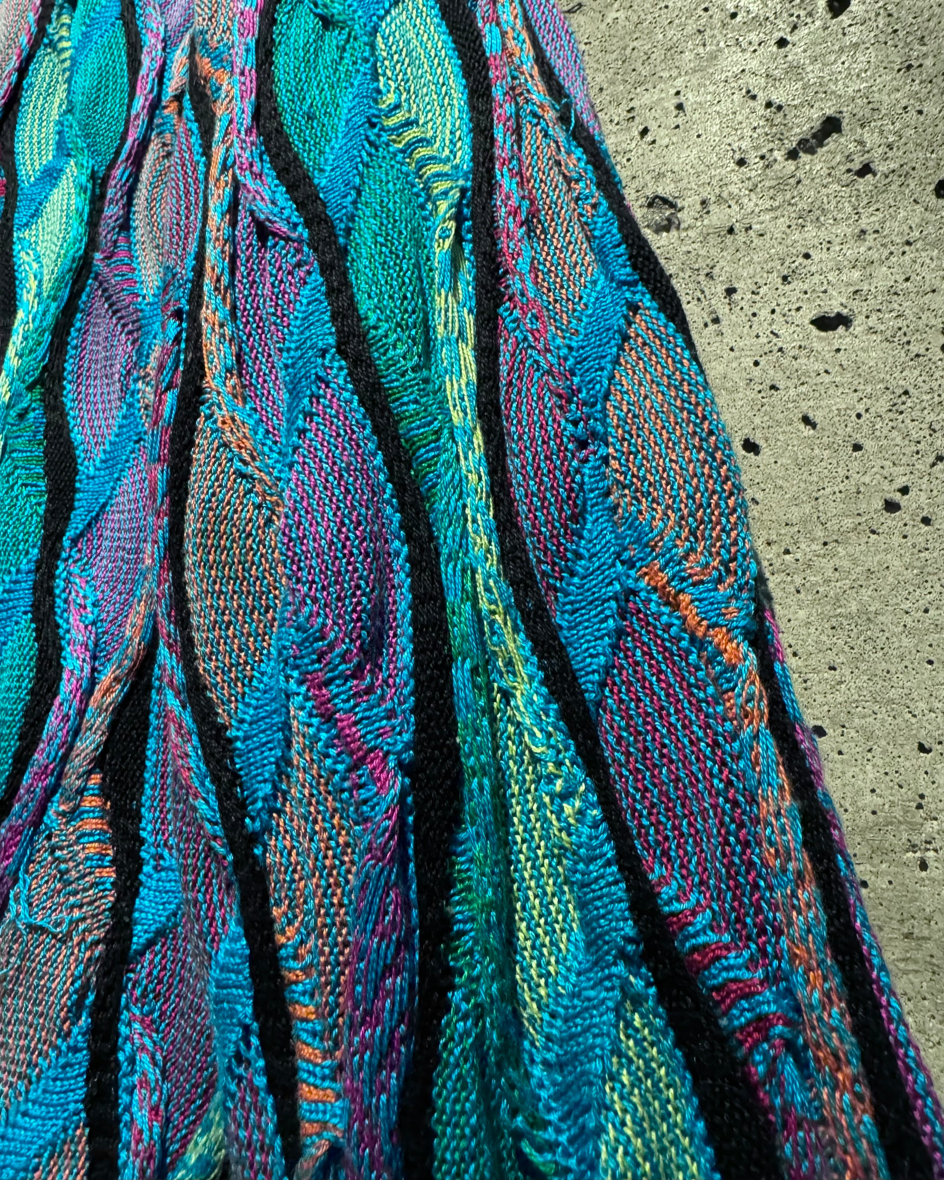 ターコイズを軸にパープルやグリーン、イエローなどを織り交ぜたネオン風のマルチカラーで仕上げられた1着。