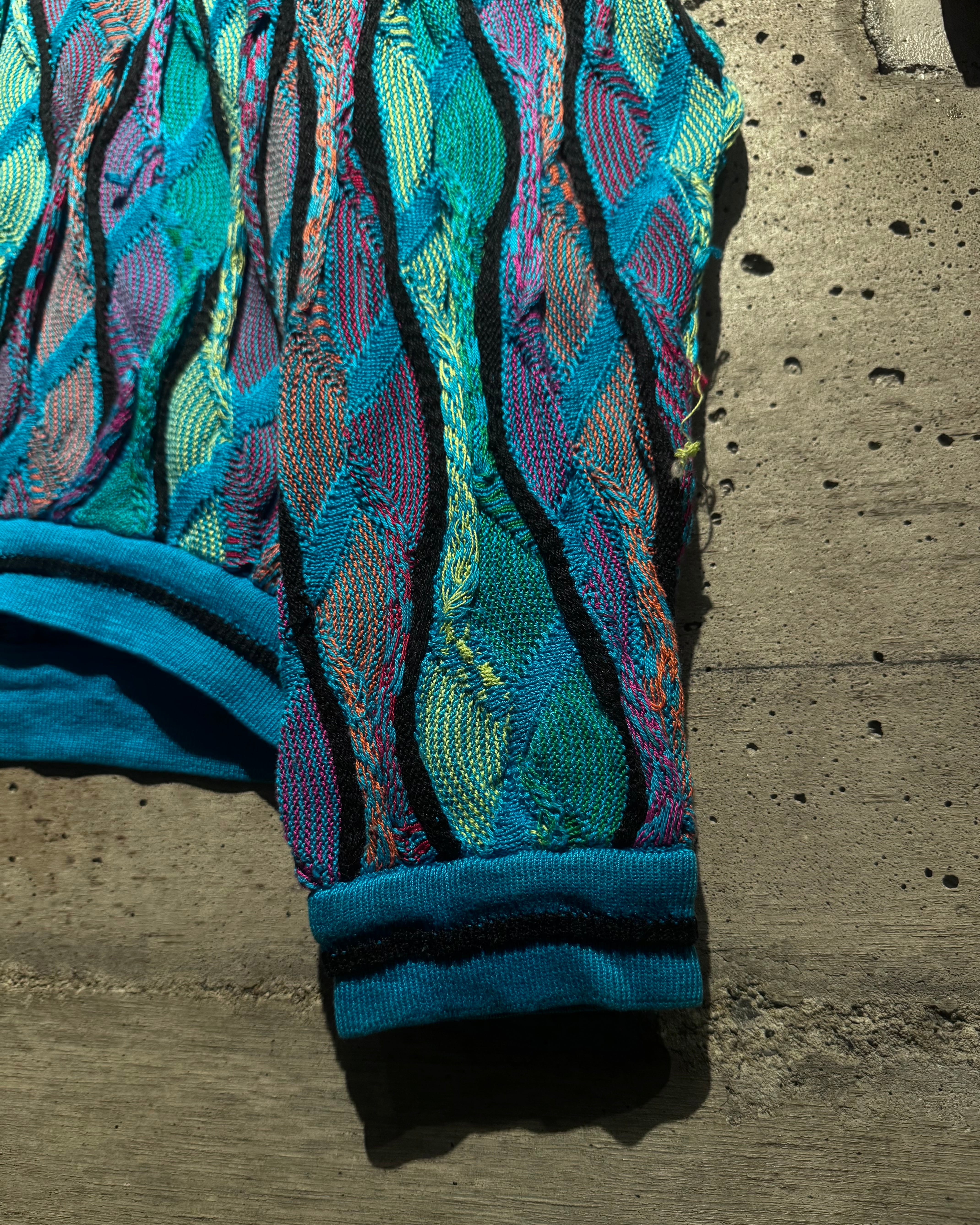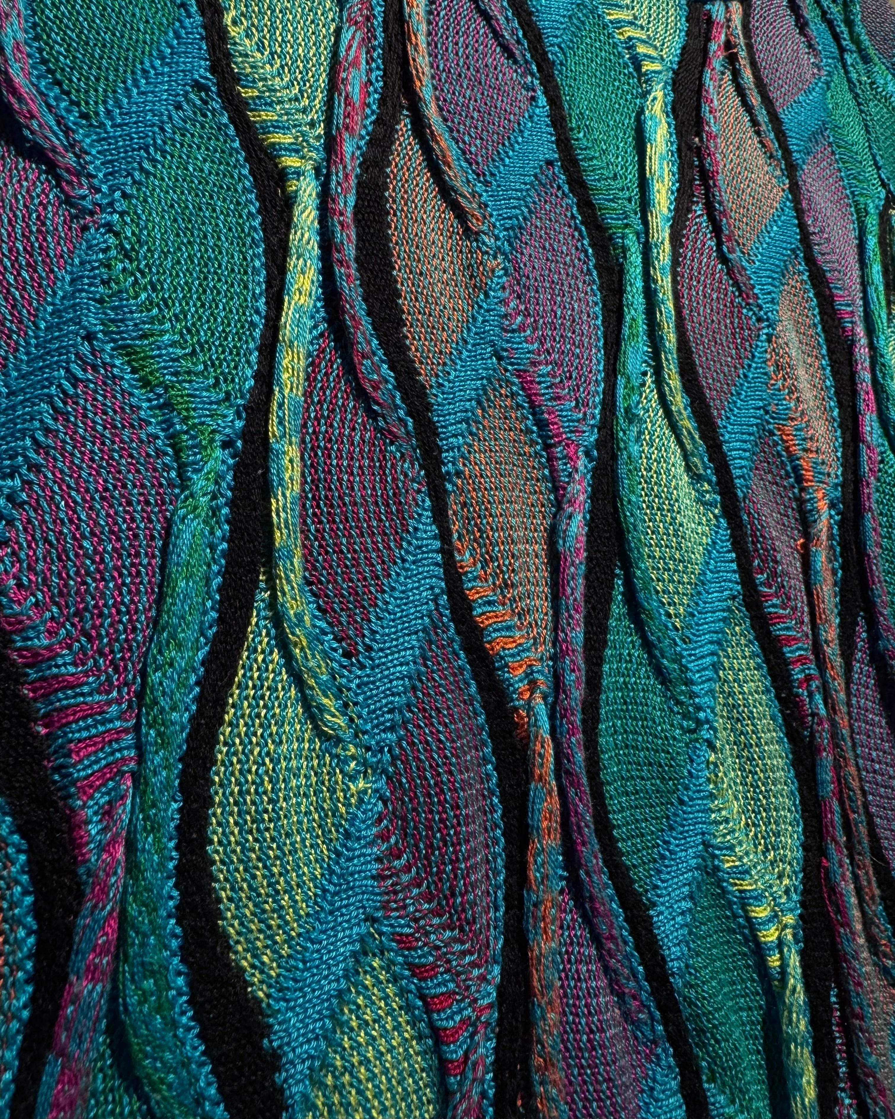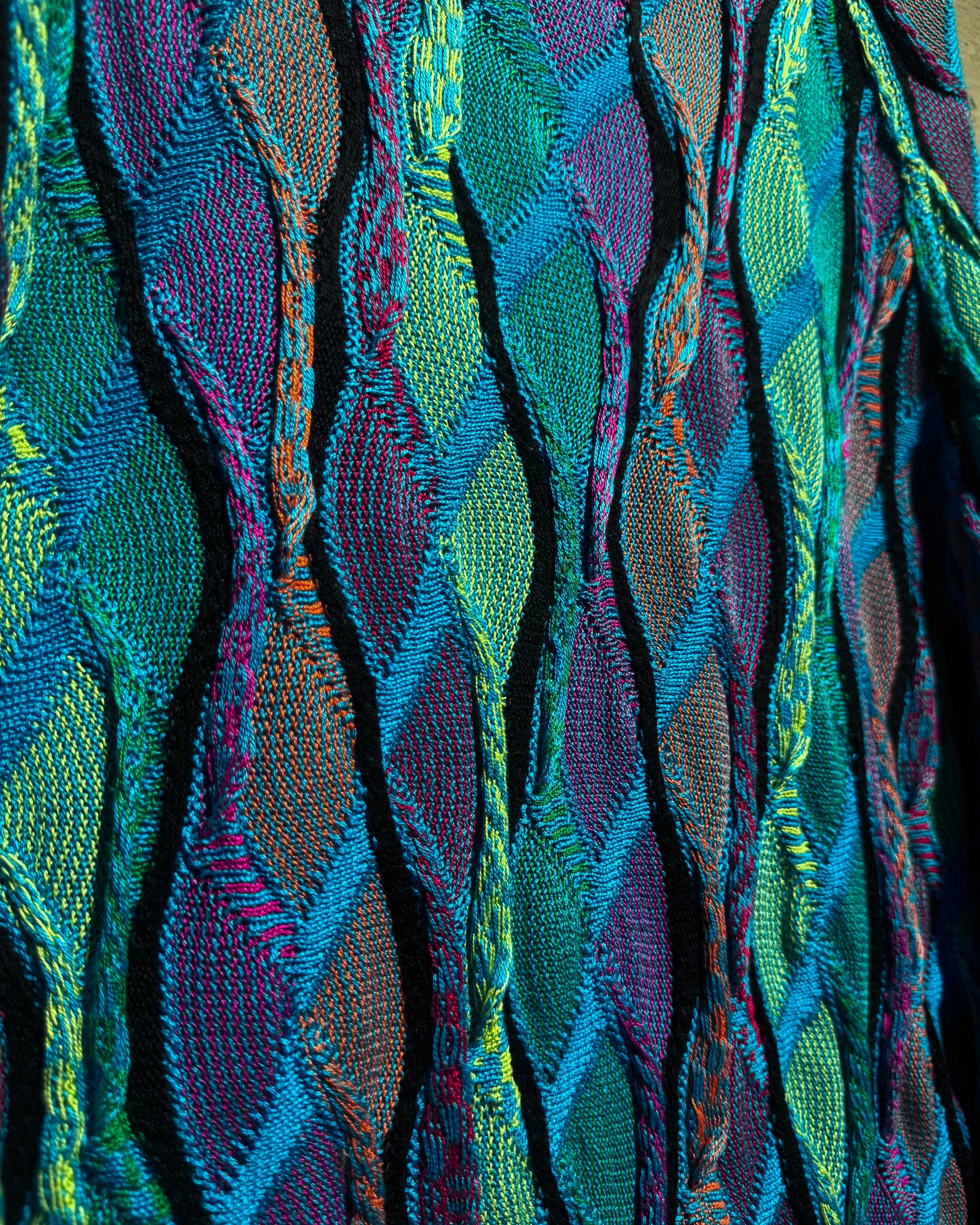 凹凸のある立体的な編み地と、サイケデリックなマルチカラーで構成された、クージーならではの圧巻の存在感を見せています。