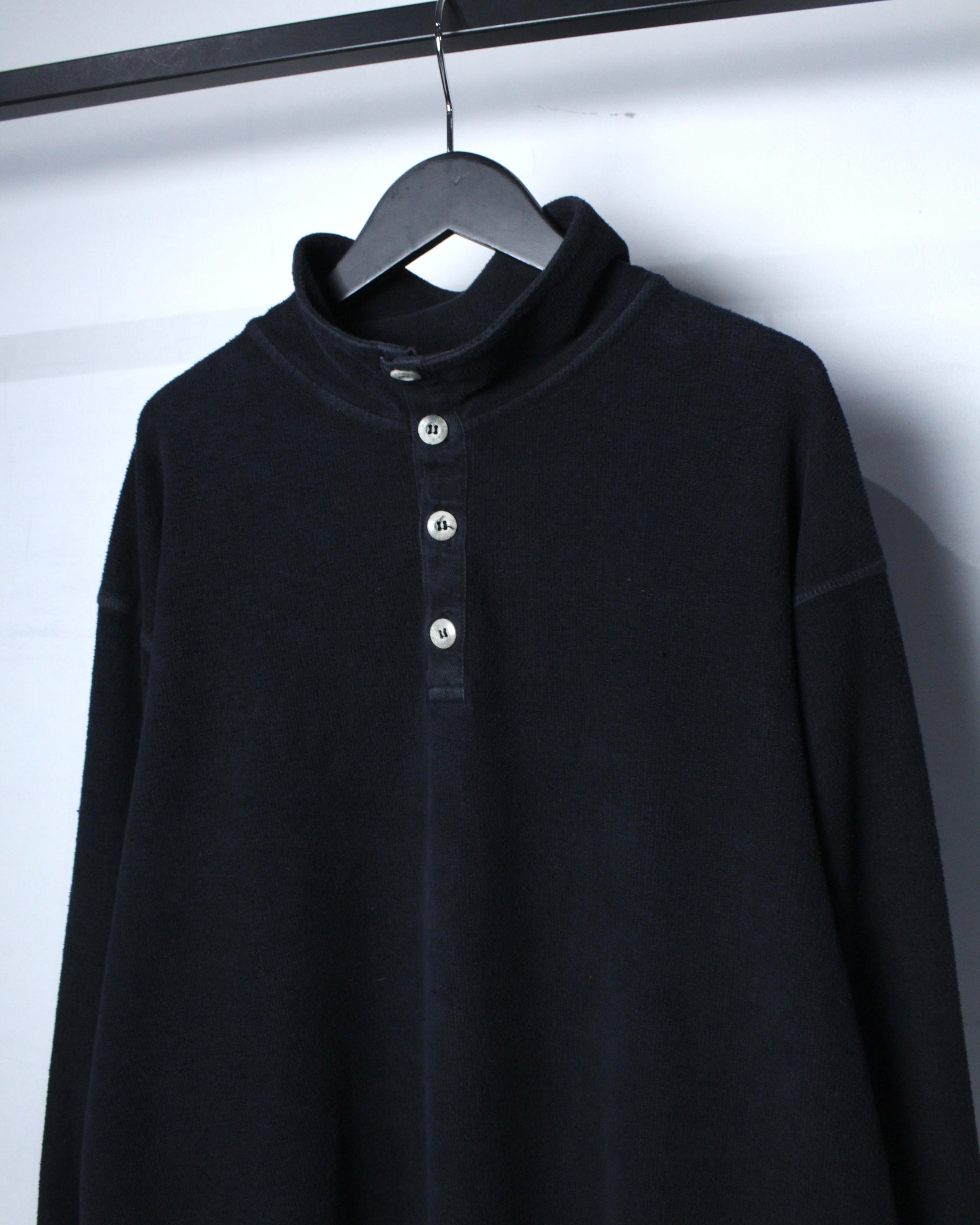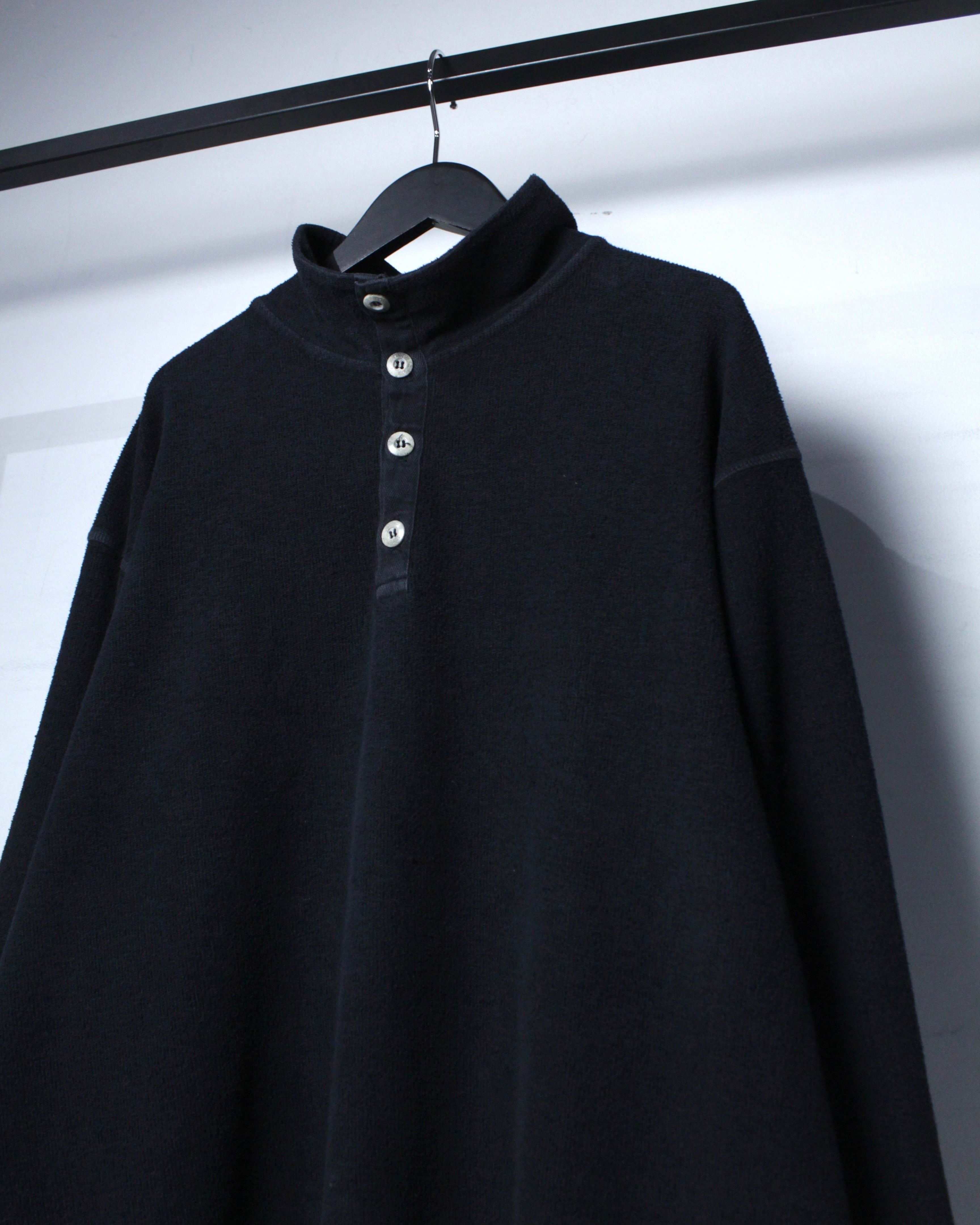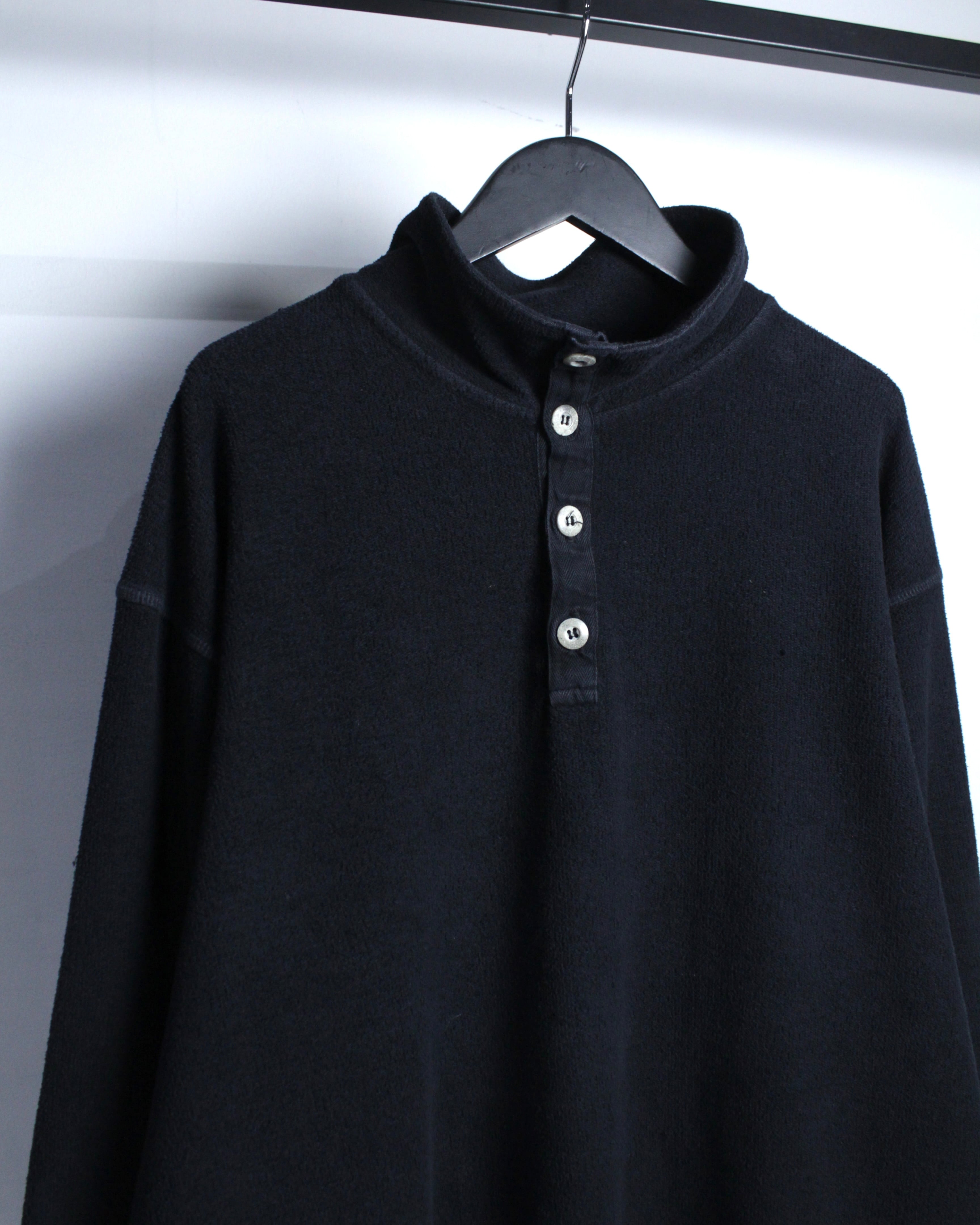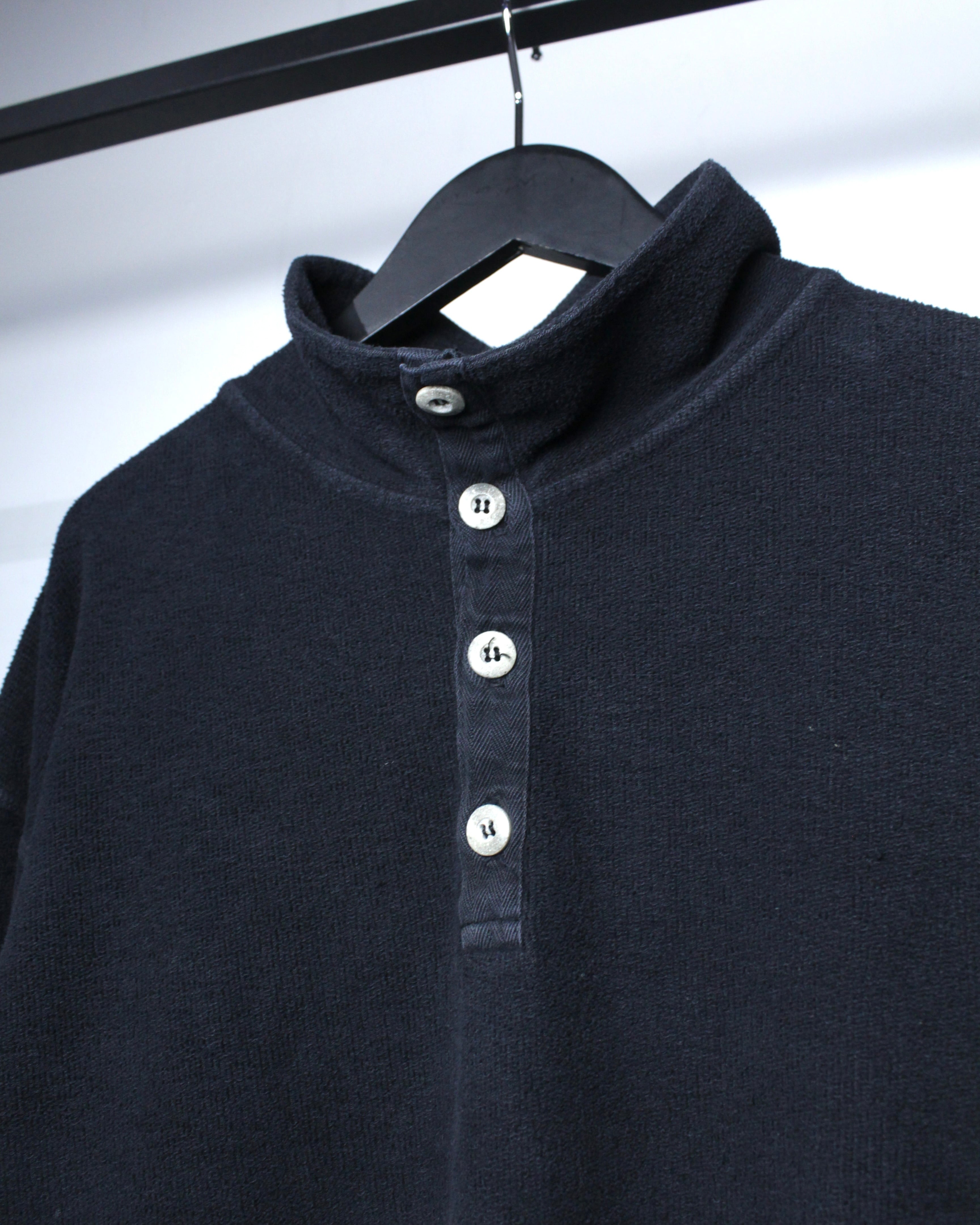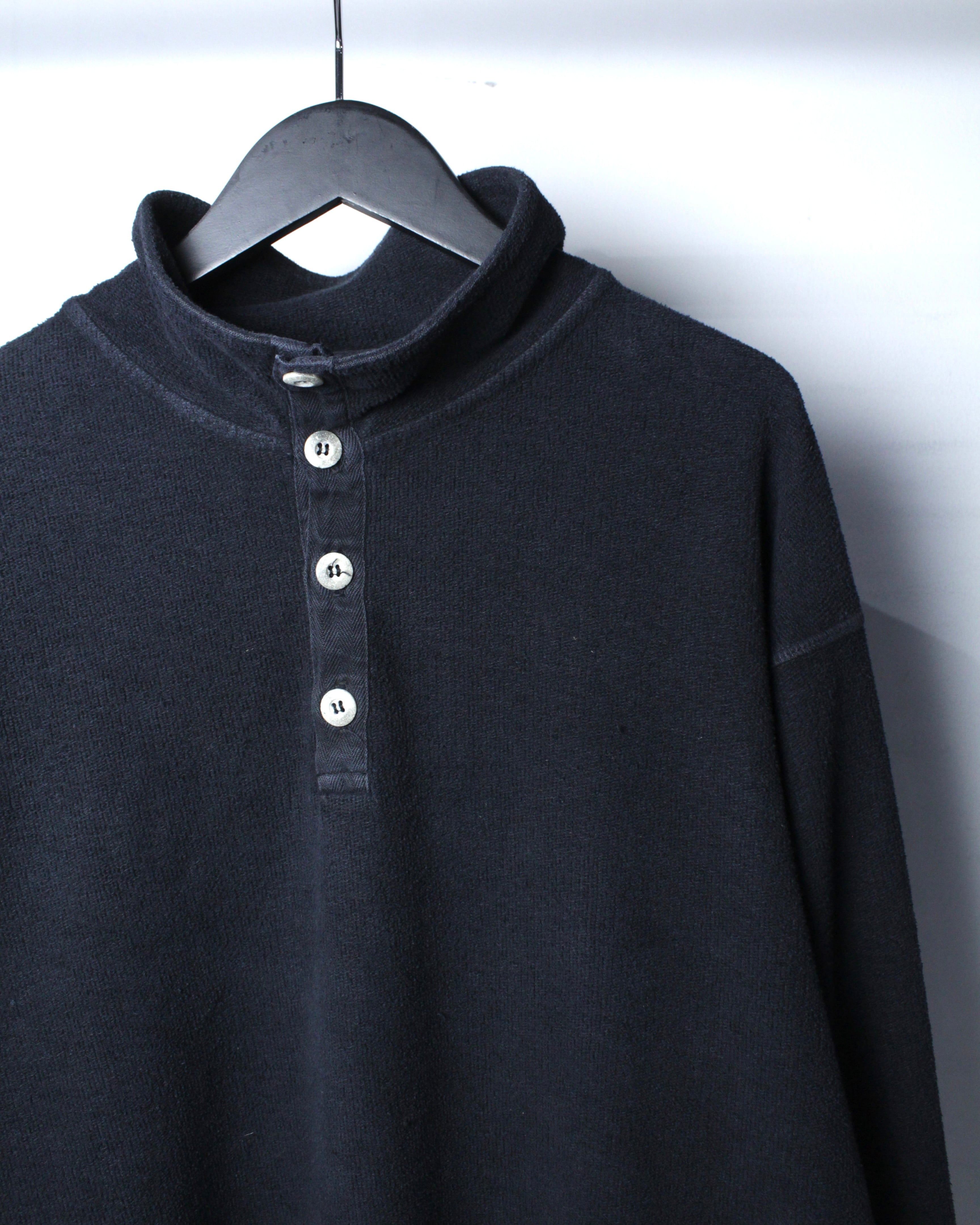 特徴的なのは、ヘンリーネックとハイネックを掛け合わせたような独特のネックデザイン。ボタンの配置や間隔、さりげない光沢感がアクセントとなり、シンプルな中にしっかりと個性を宿しています。