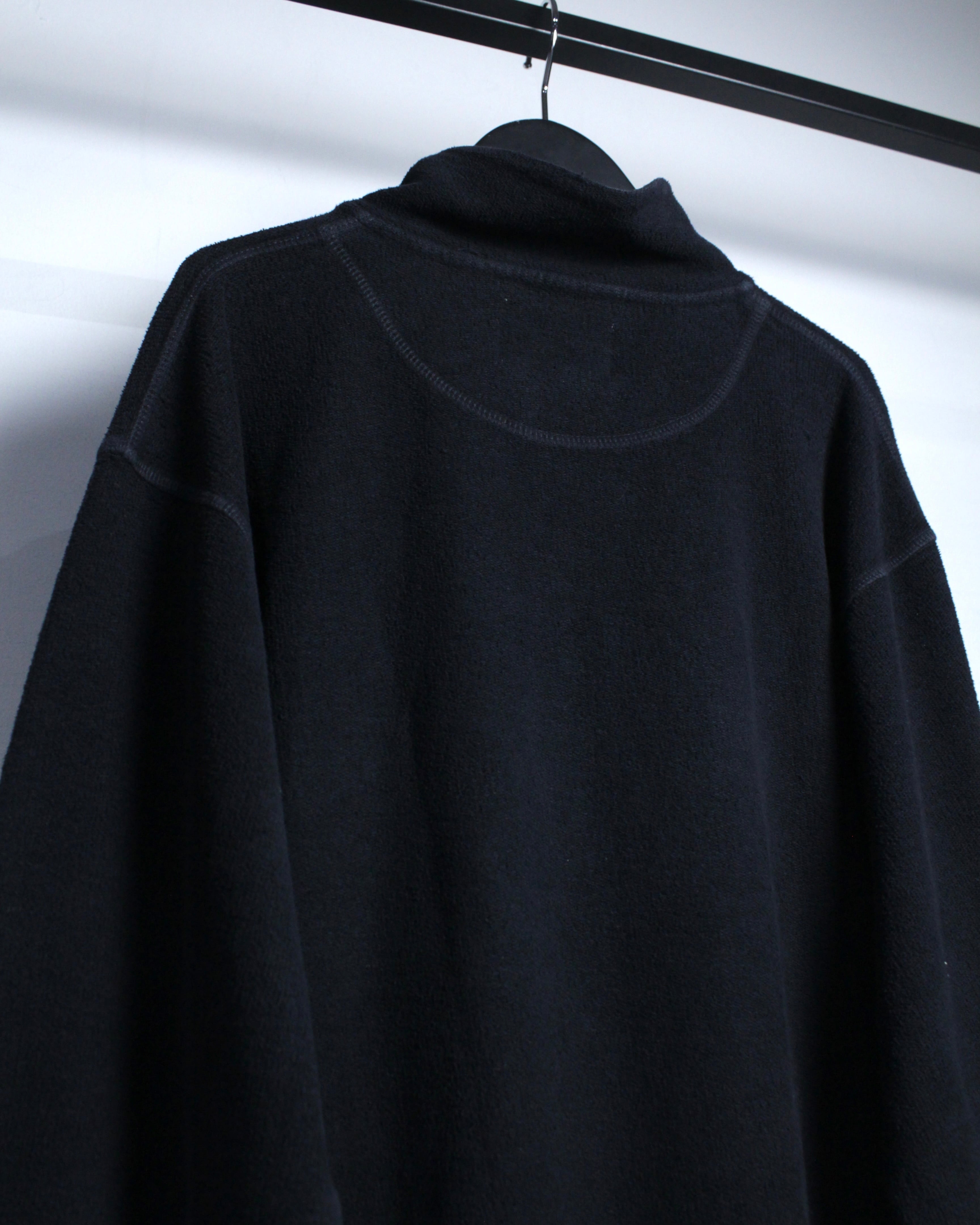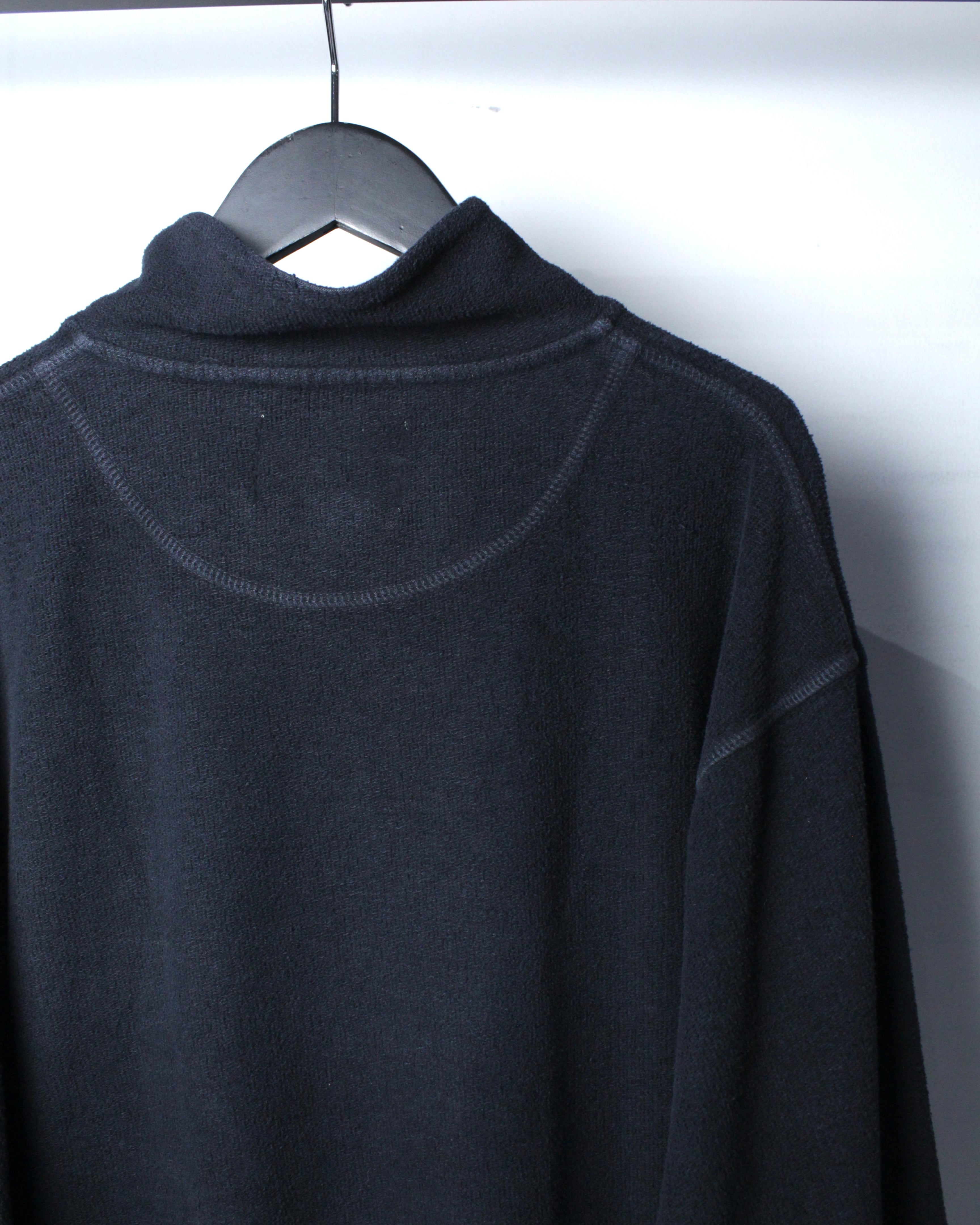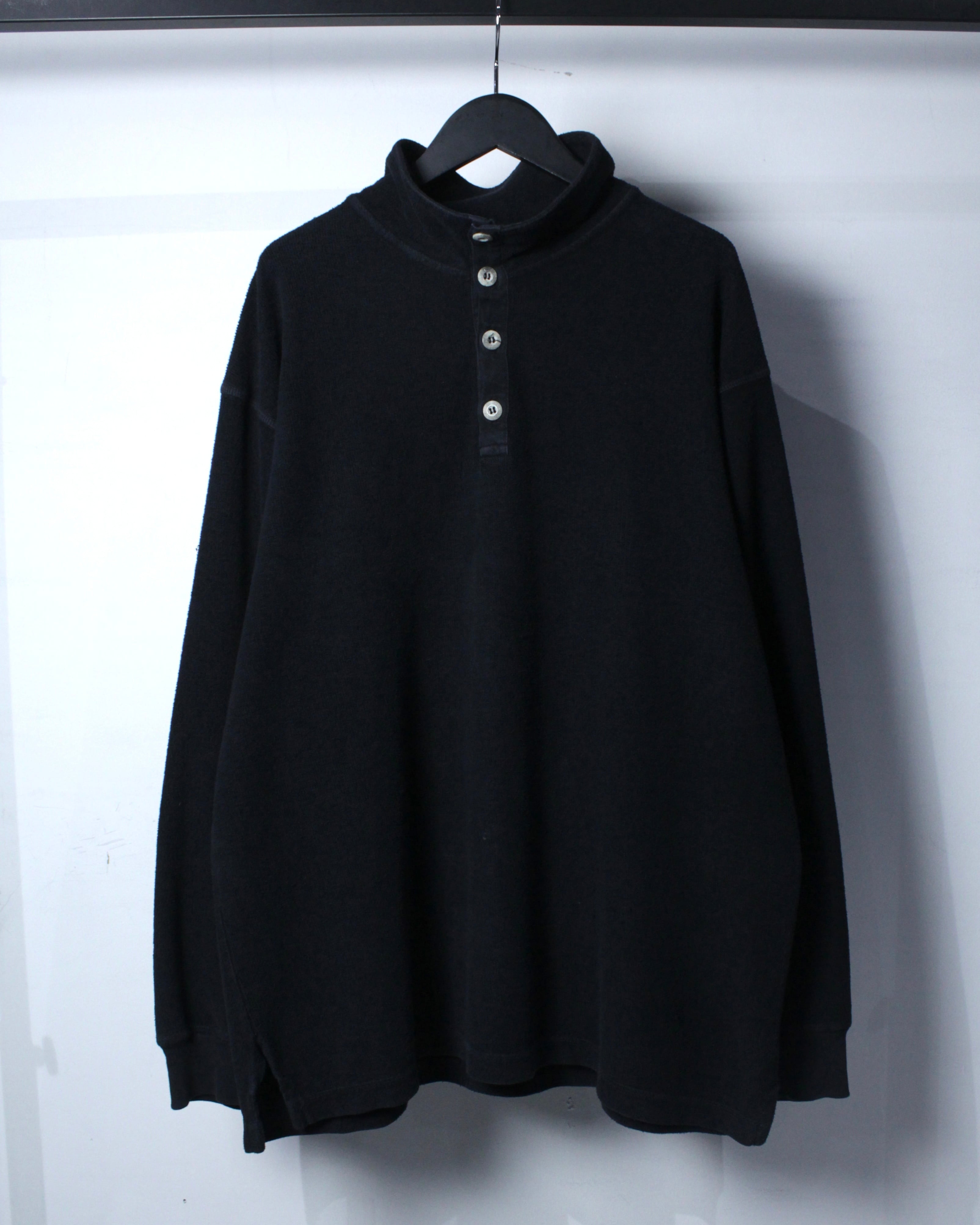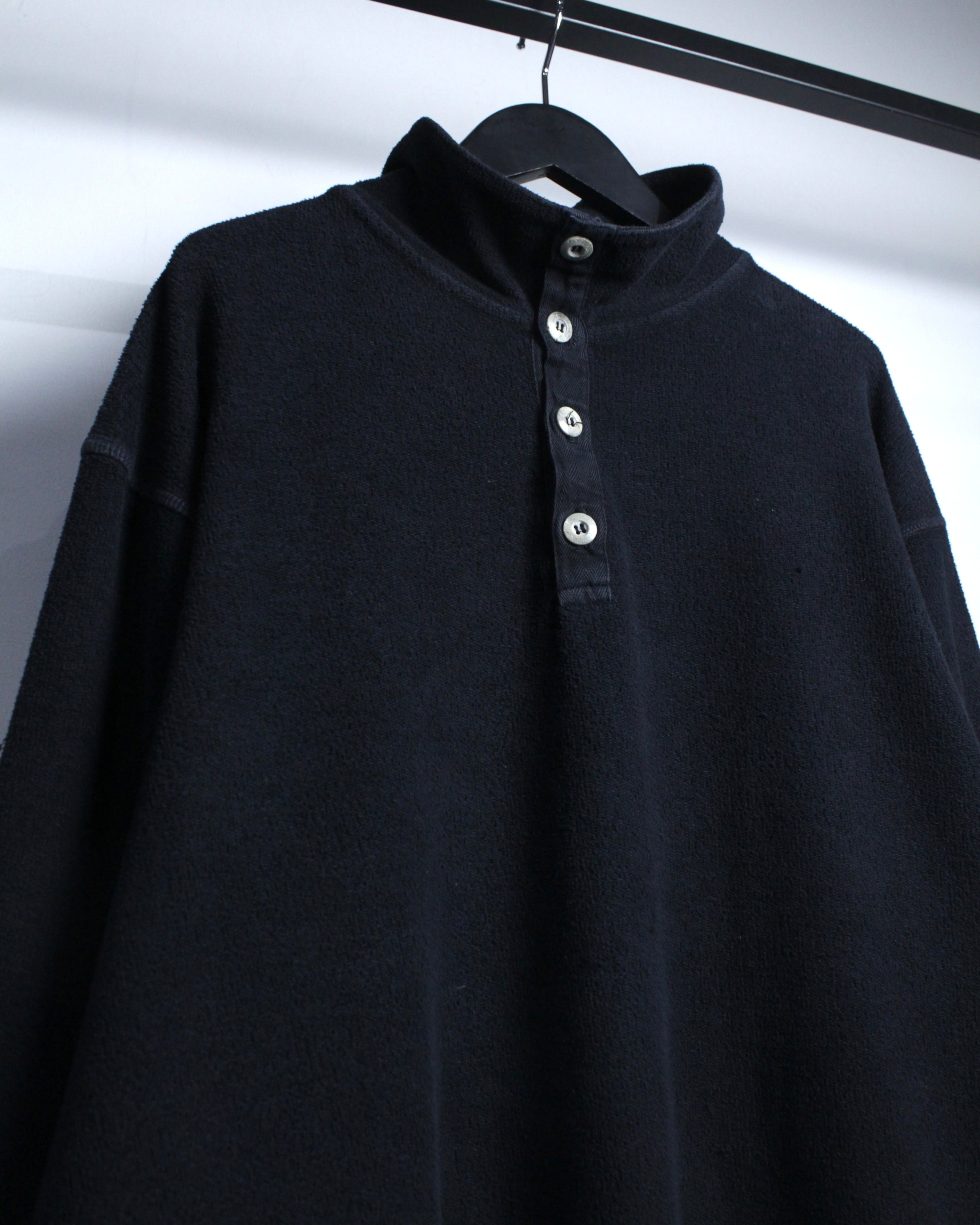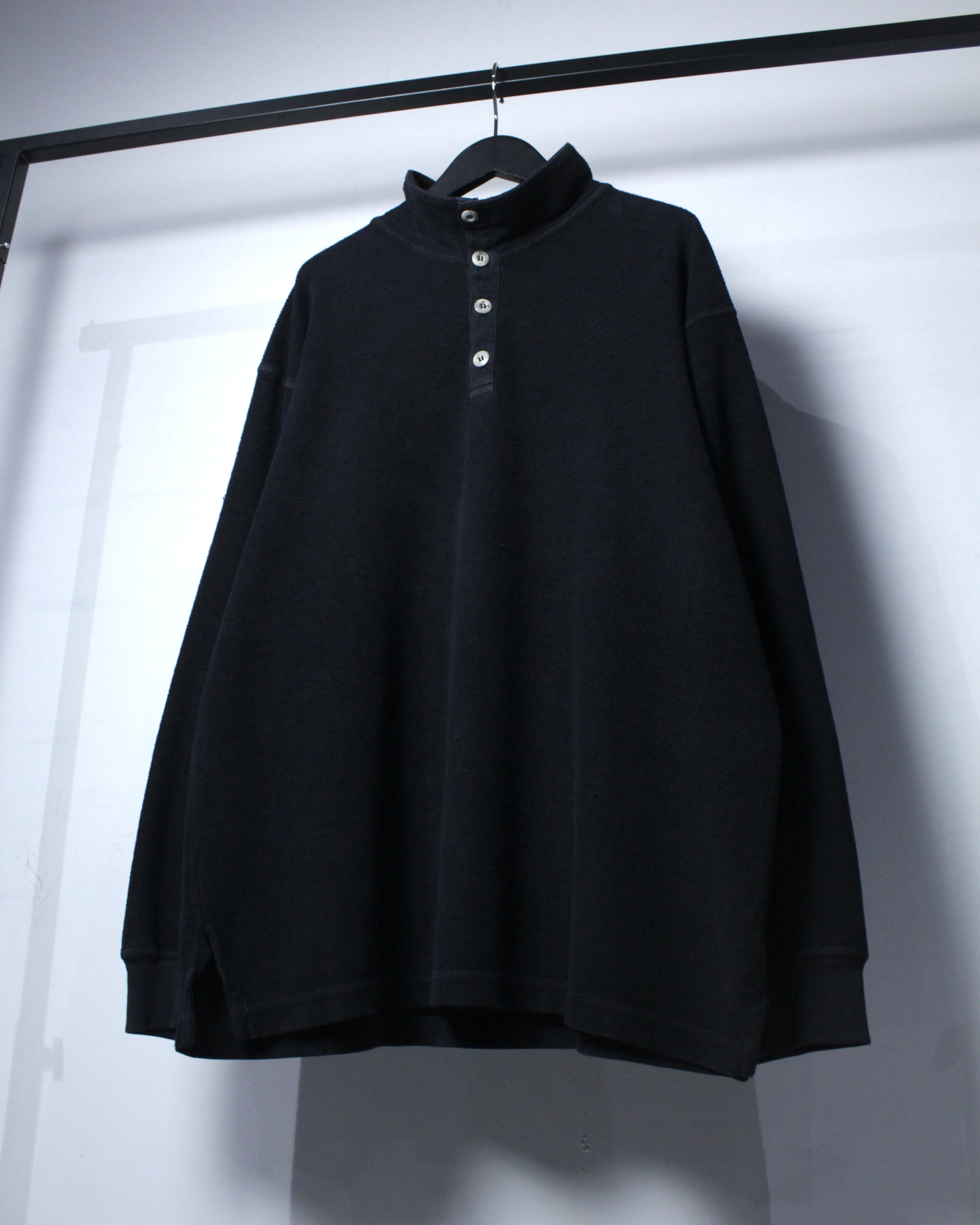 特徴的なのは、ヘンリーネックとハイネックを掛け合わせたような独特のネックデザイン。ボタンの配置や間隔、さりげない光沢感がアクセントとなり、シンプルな中にしっかりと個性を宿しています。