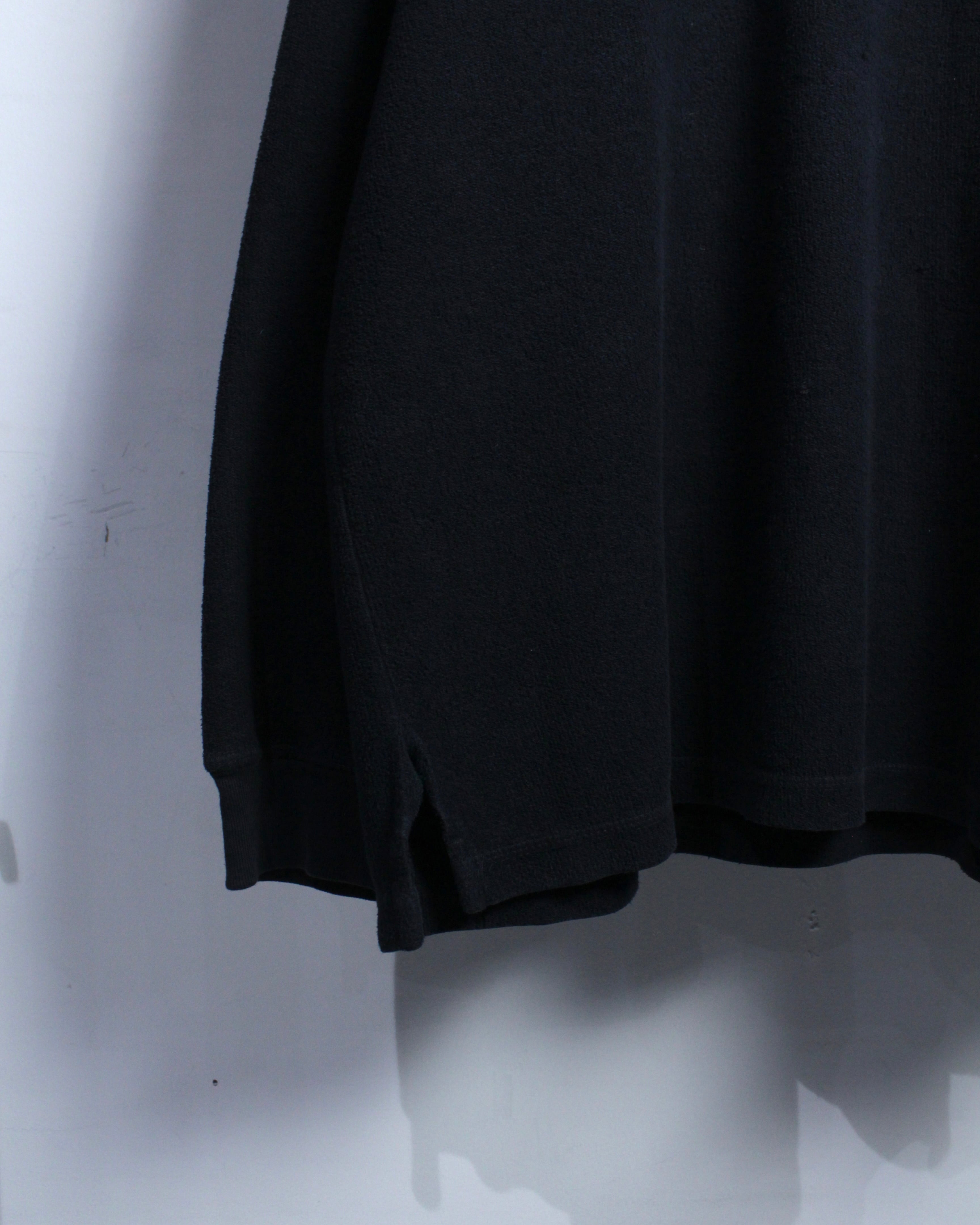 ブラックで統一されたボディに、ふっくらとした編み地の表情が乗ることで、無地ながらも奥行きのある質感を演出。派手さではなく、素材そのものの魅力で惹きつける一着に仕上がっています。