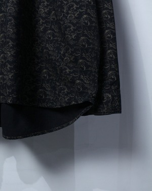 ブラックベースにグレイッシュな草花模様が浮かび上がるファブリックは、光の当たり方で表情を変え、静かに主張する奥行きのある一枚。総柄でありながらも派手さに寄らず、落ち着いたトーンでまとめられたバランス感が秀逸です。