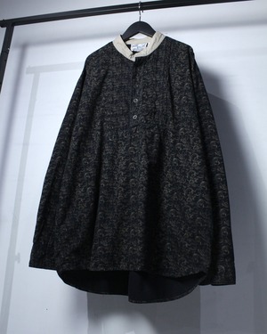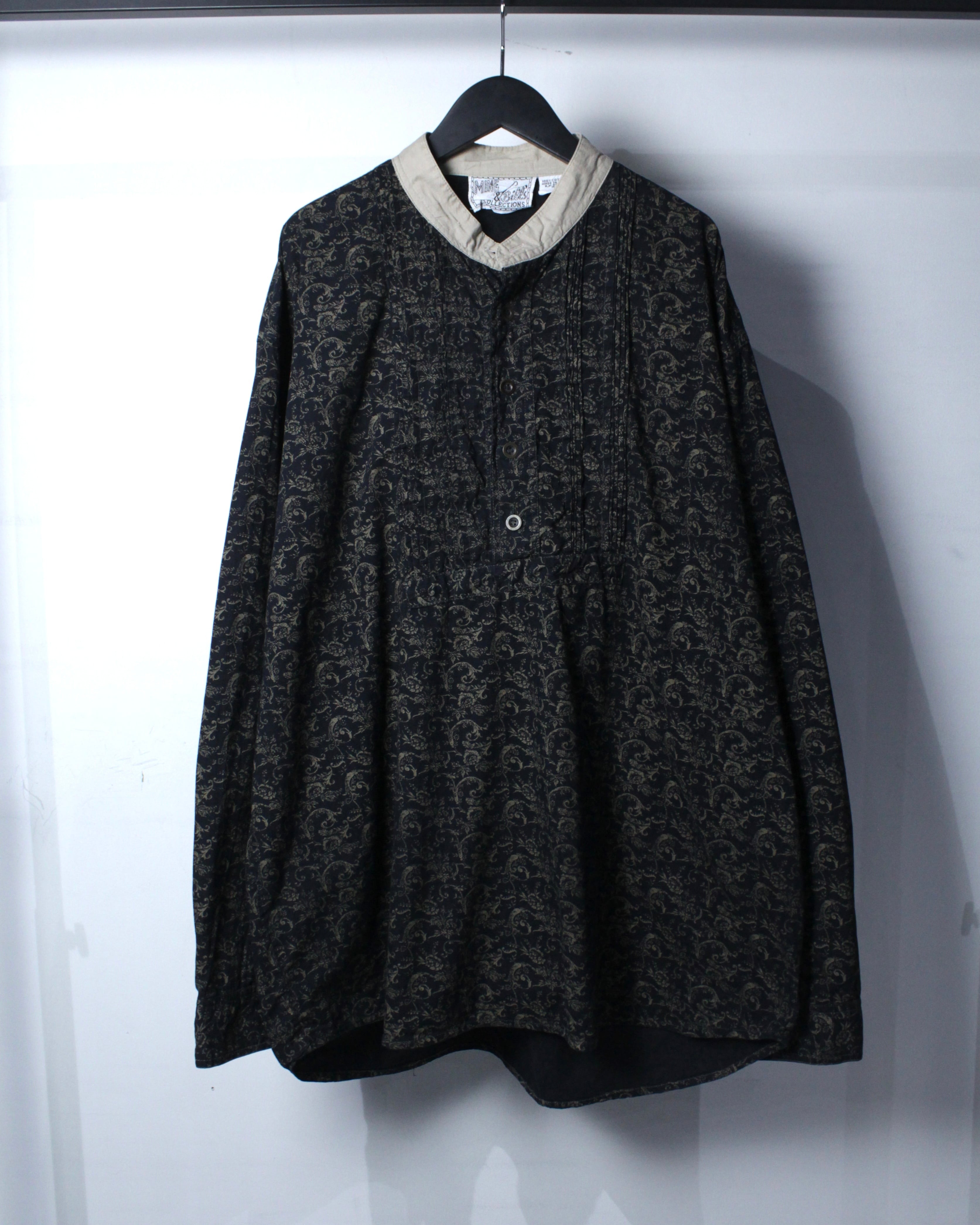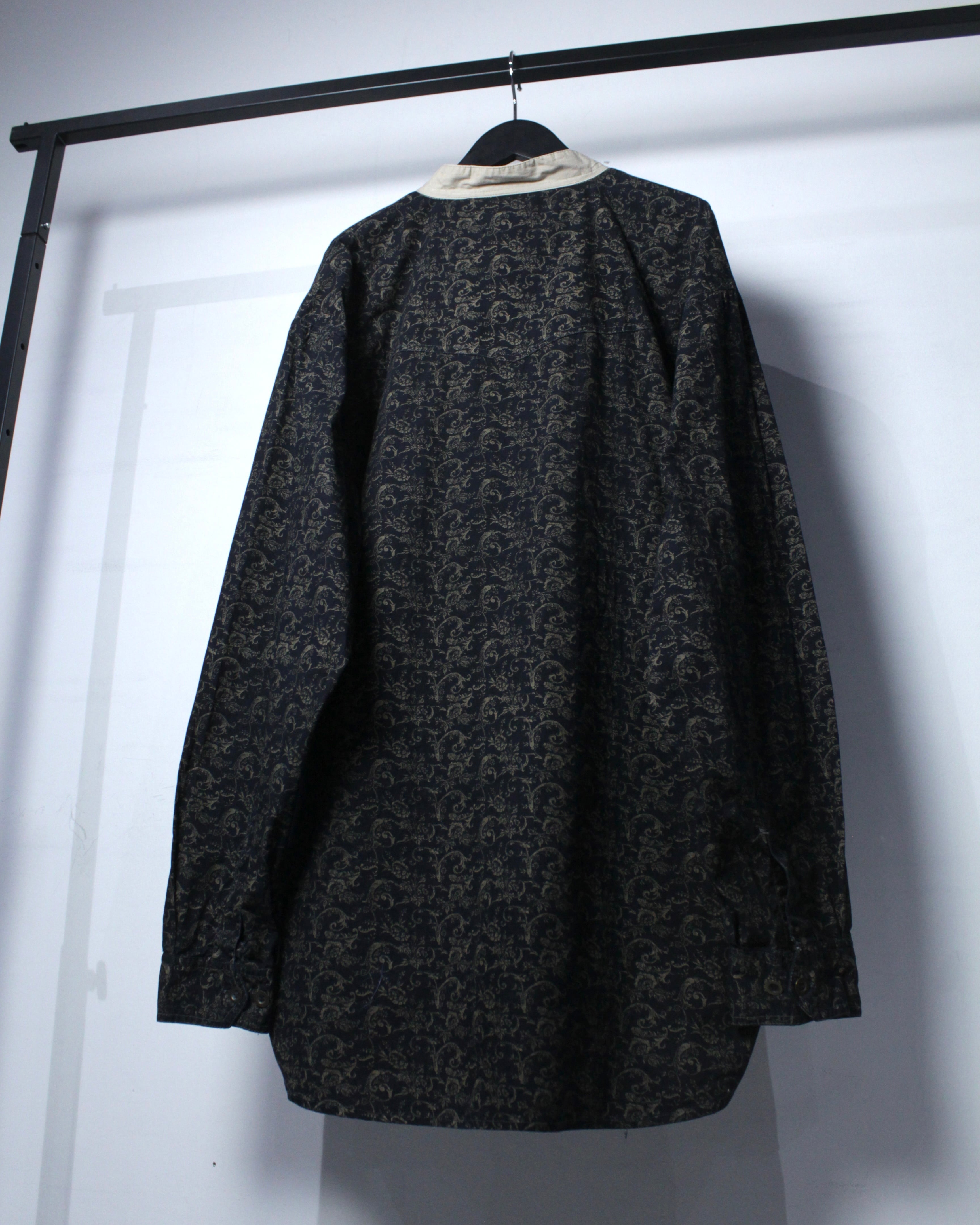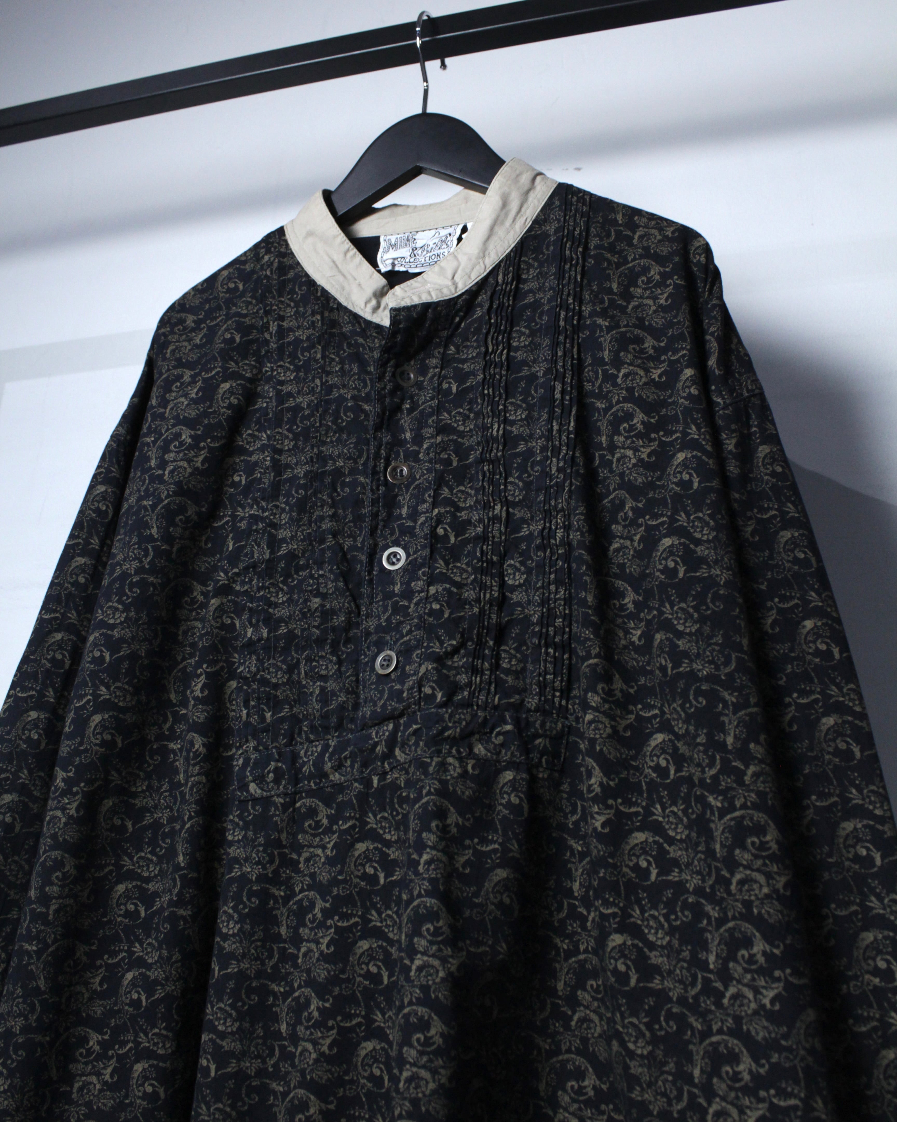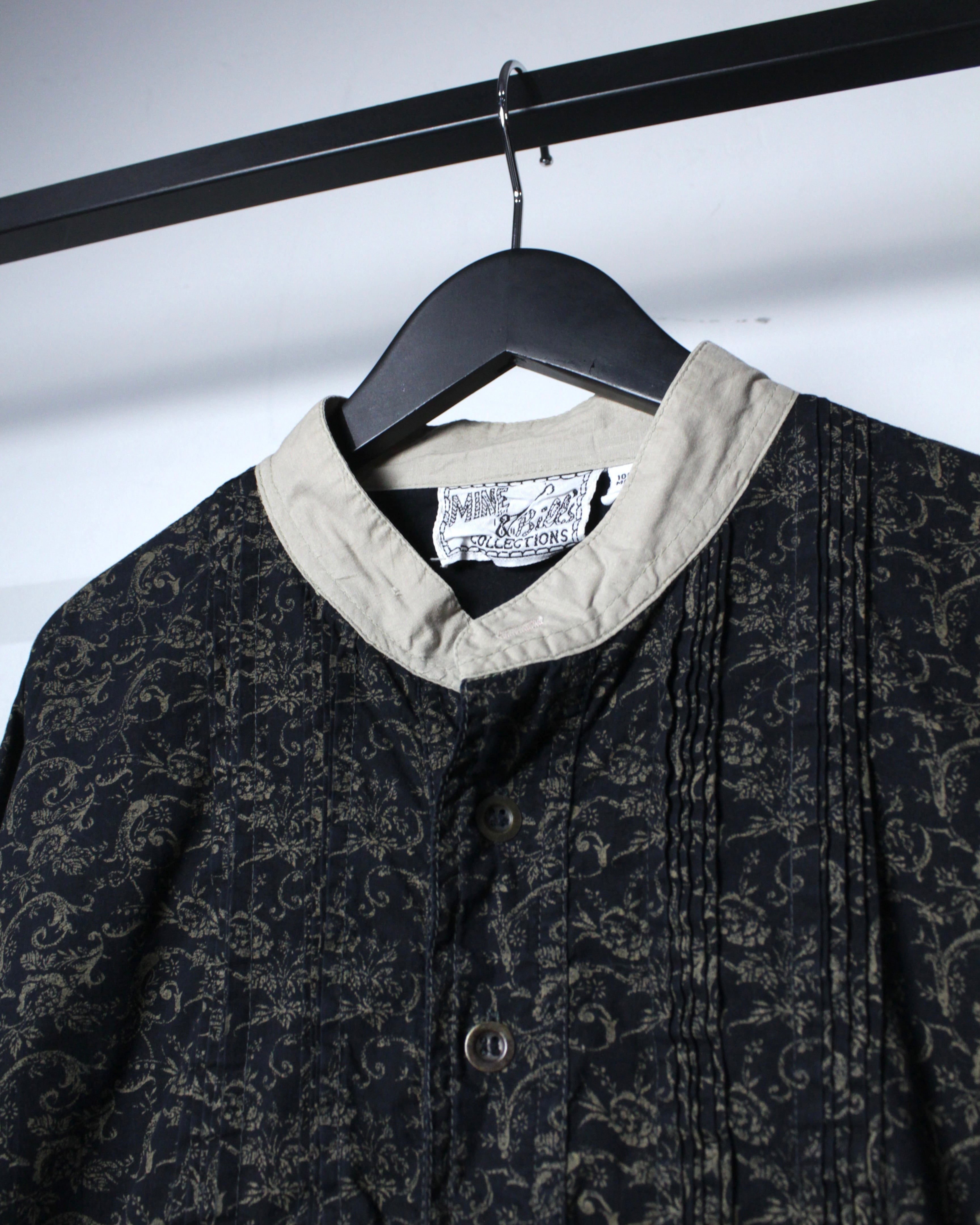 ネックはヘンリーネック仕様。フロントには細かなピンタックを施し、単なる総柄に留まらない立体的なデザインへと昇華しています。襟元には切り替えで淡いカラーを配し、さりげないコントラストが全体を引き締めています。
