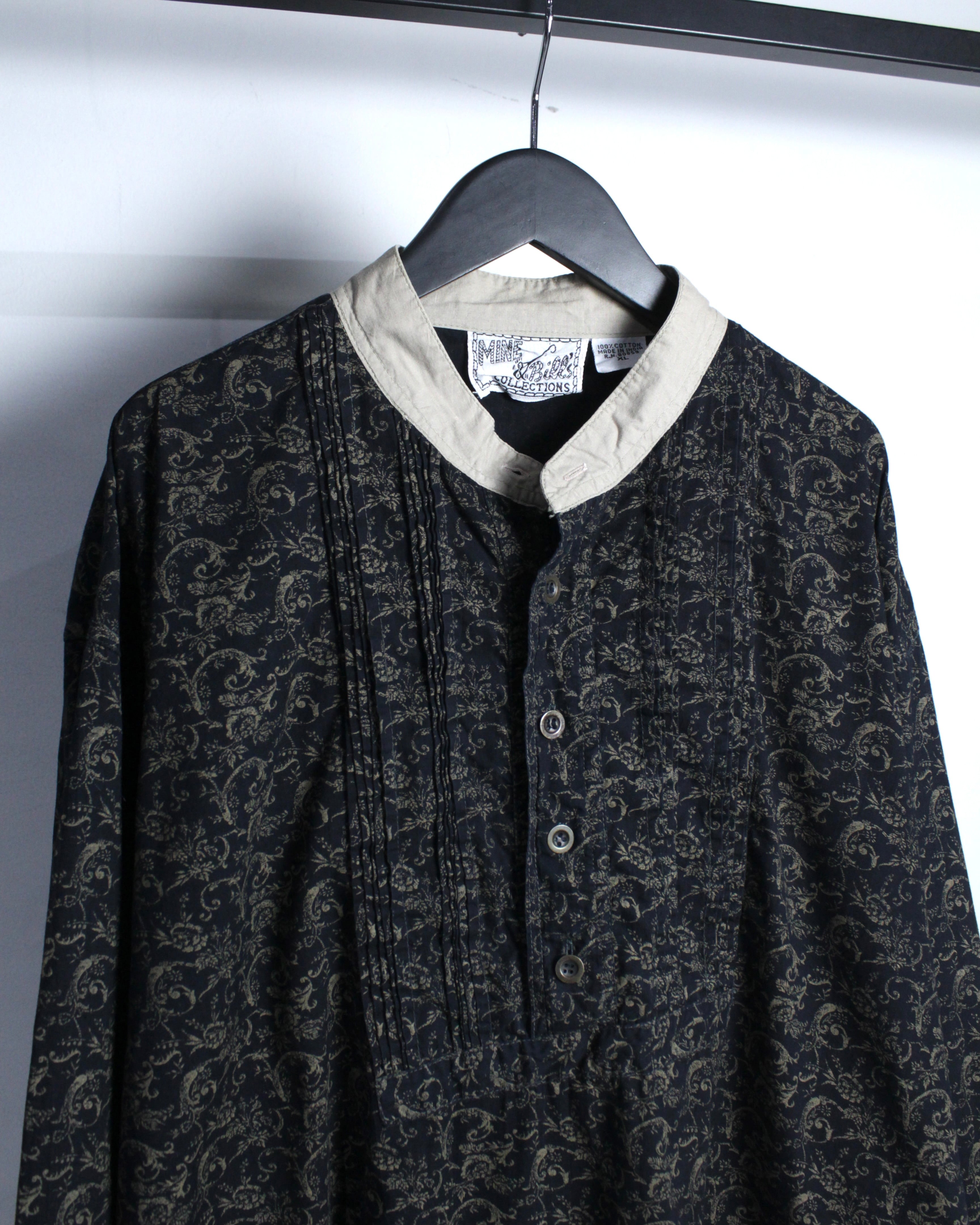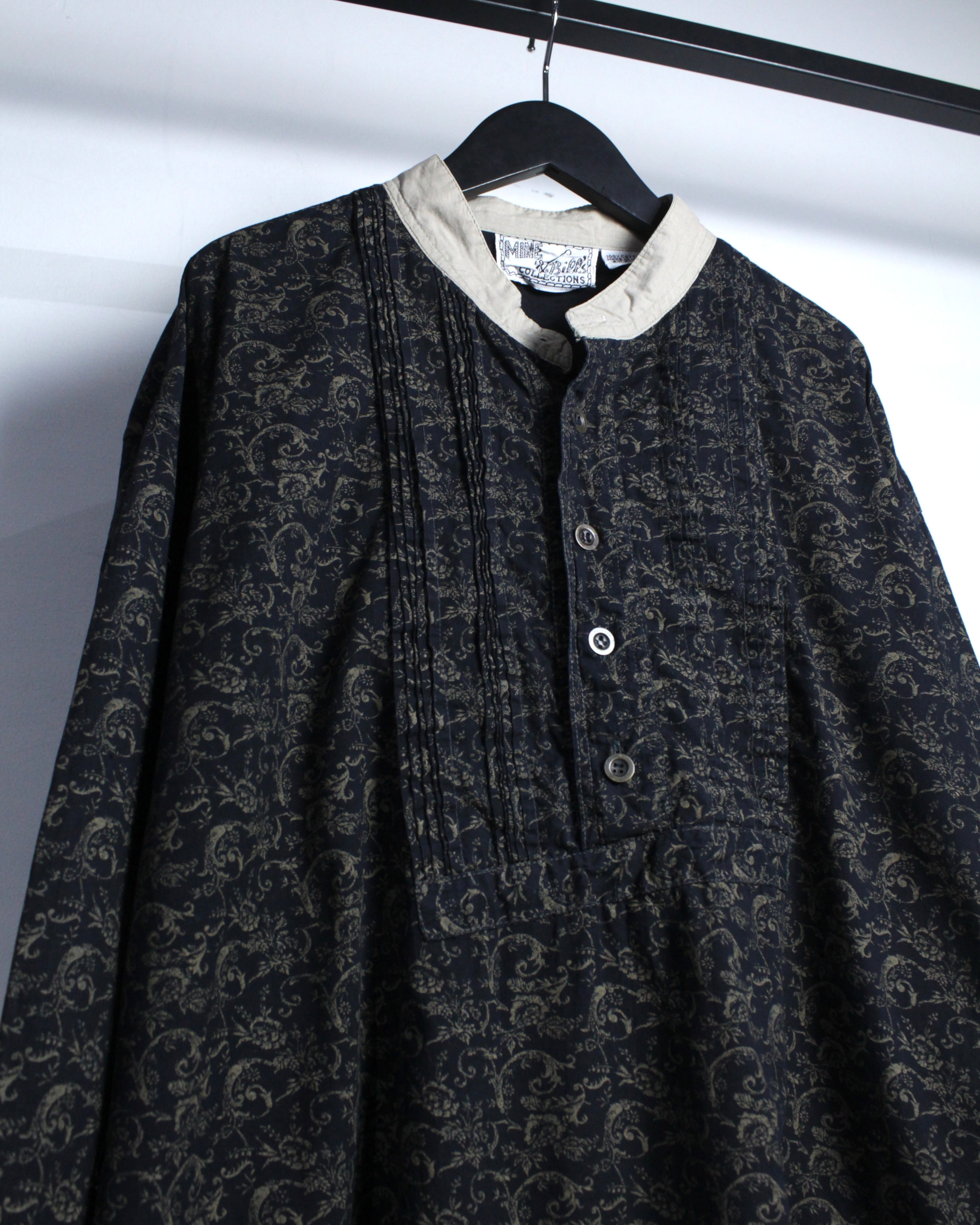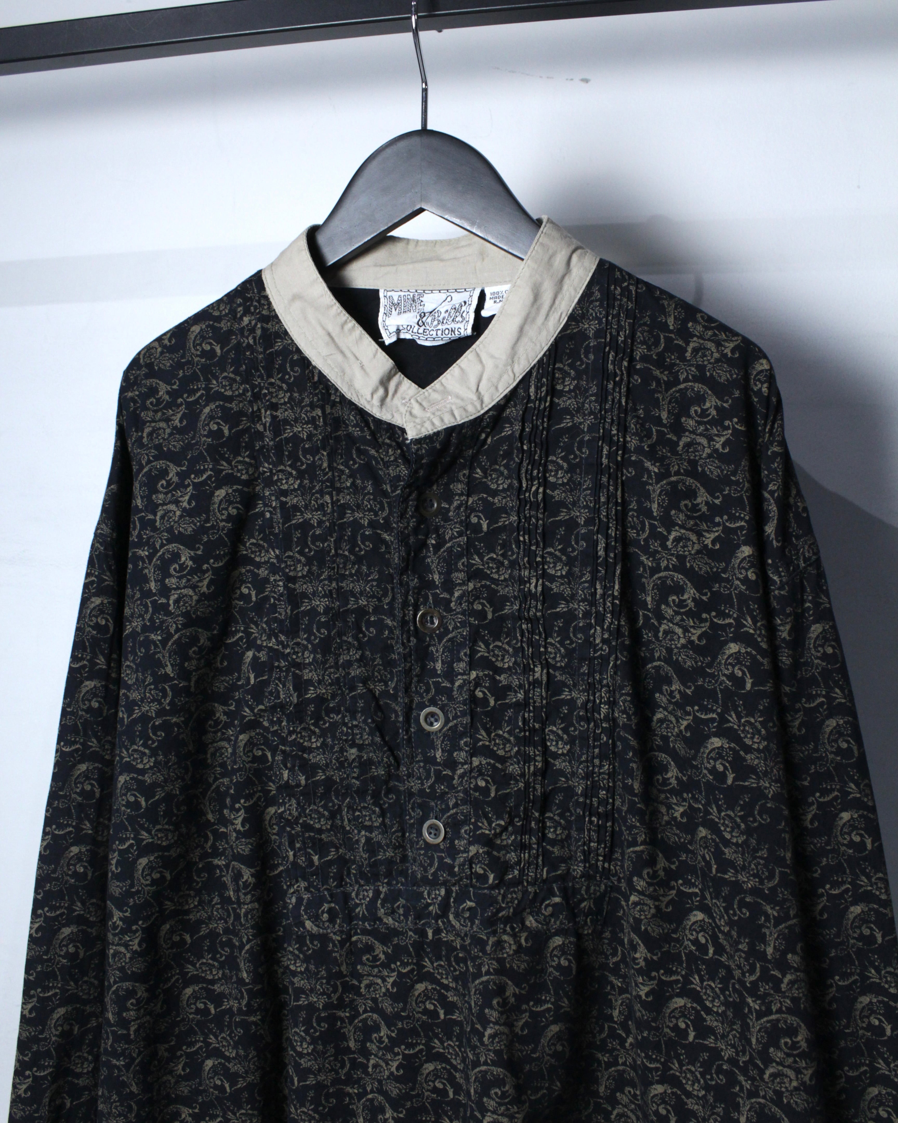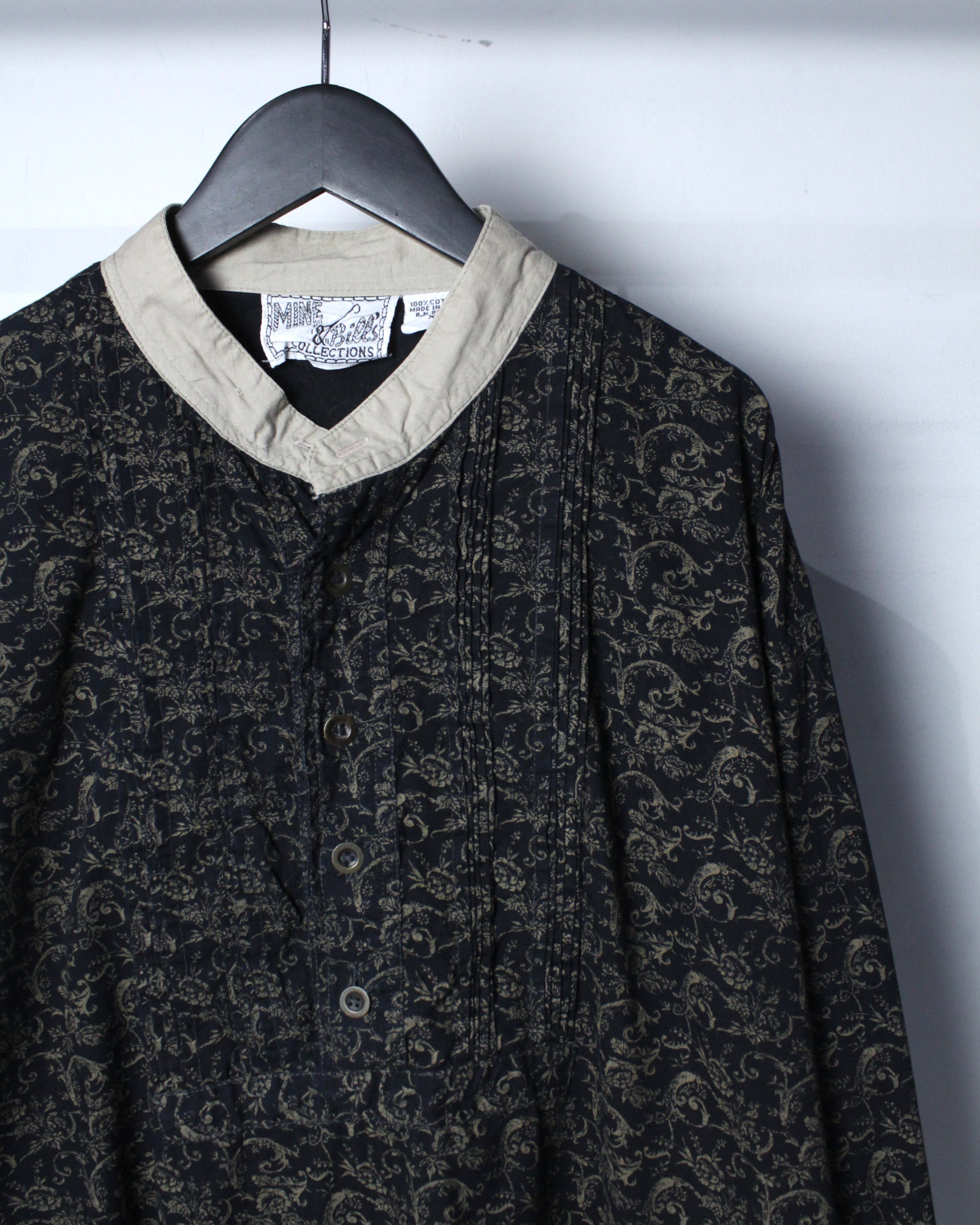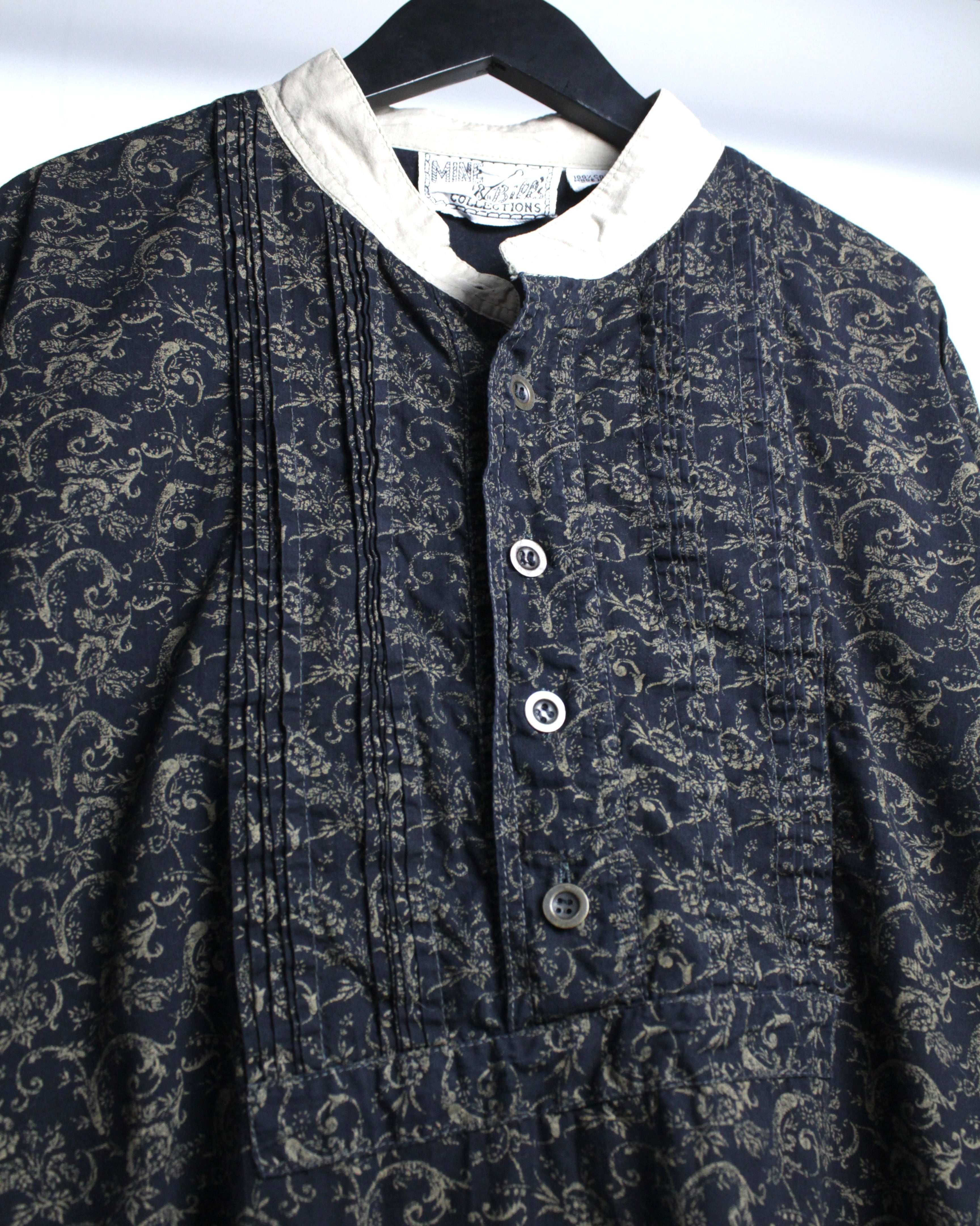 ネックはヘンリーネック仕様。フロントには細かなピンタックを施し、単なる総柄に留まらない立体的なデザインへと昇華しています。襟元には切り替えで淡いカラーを配し、さりげないコントラストが全体を引き締めています。