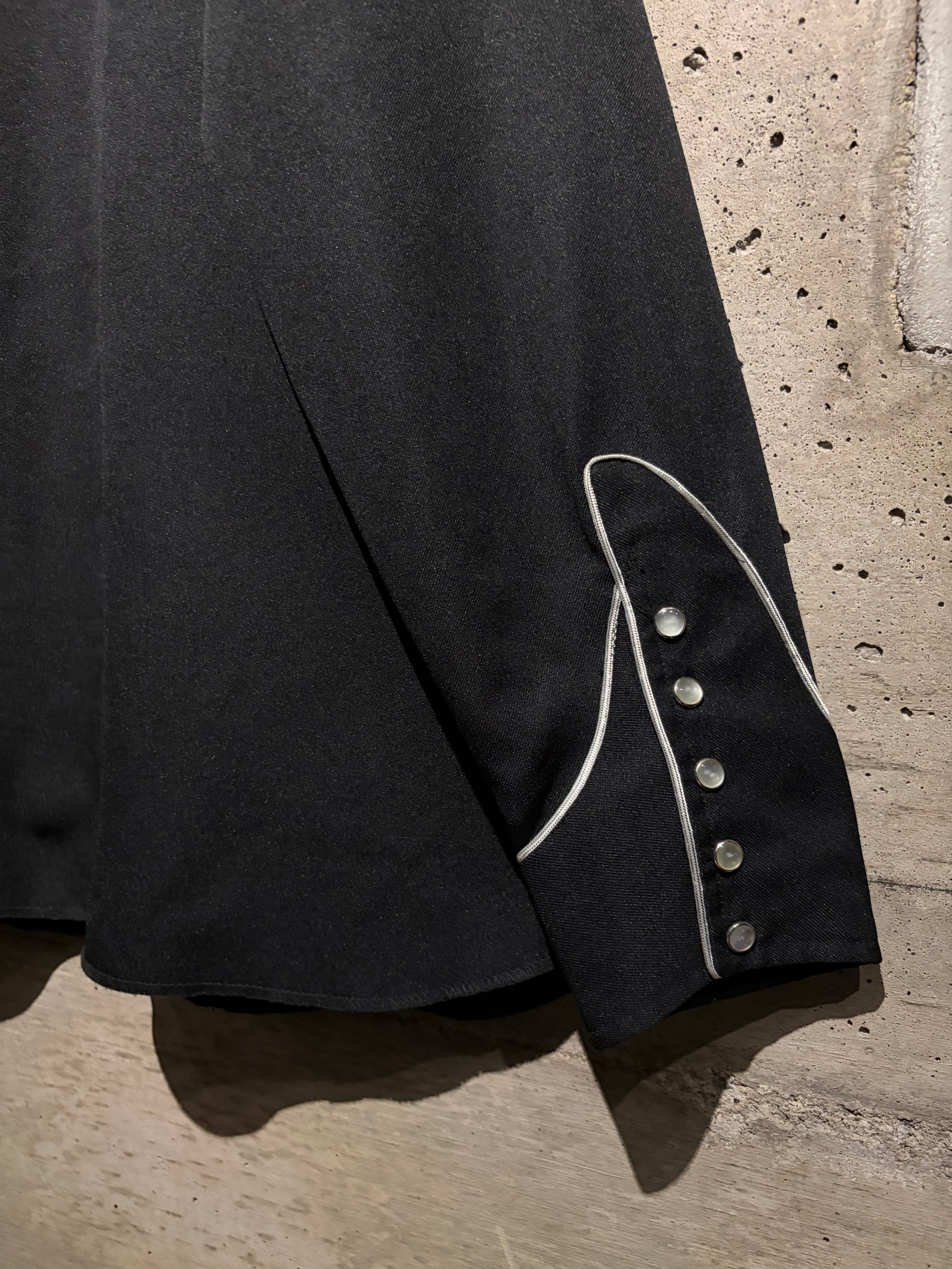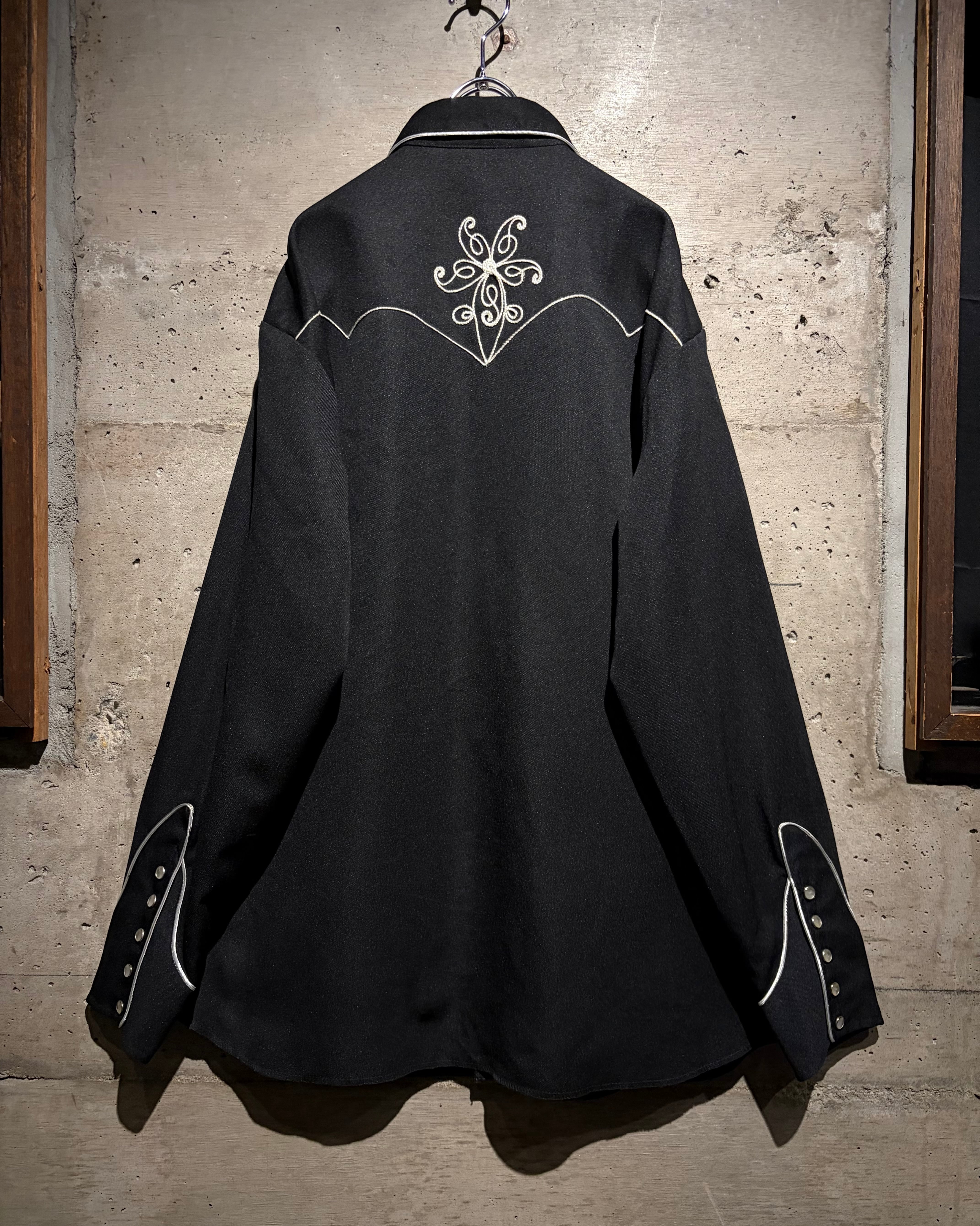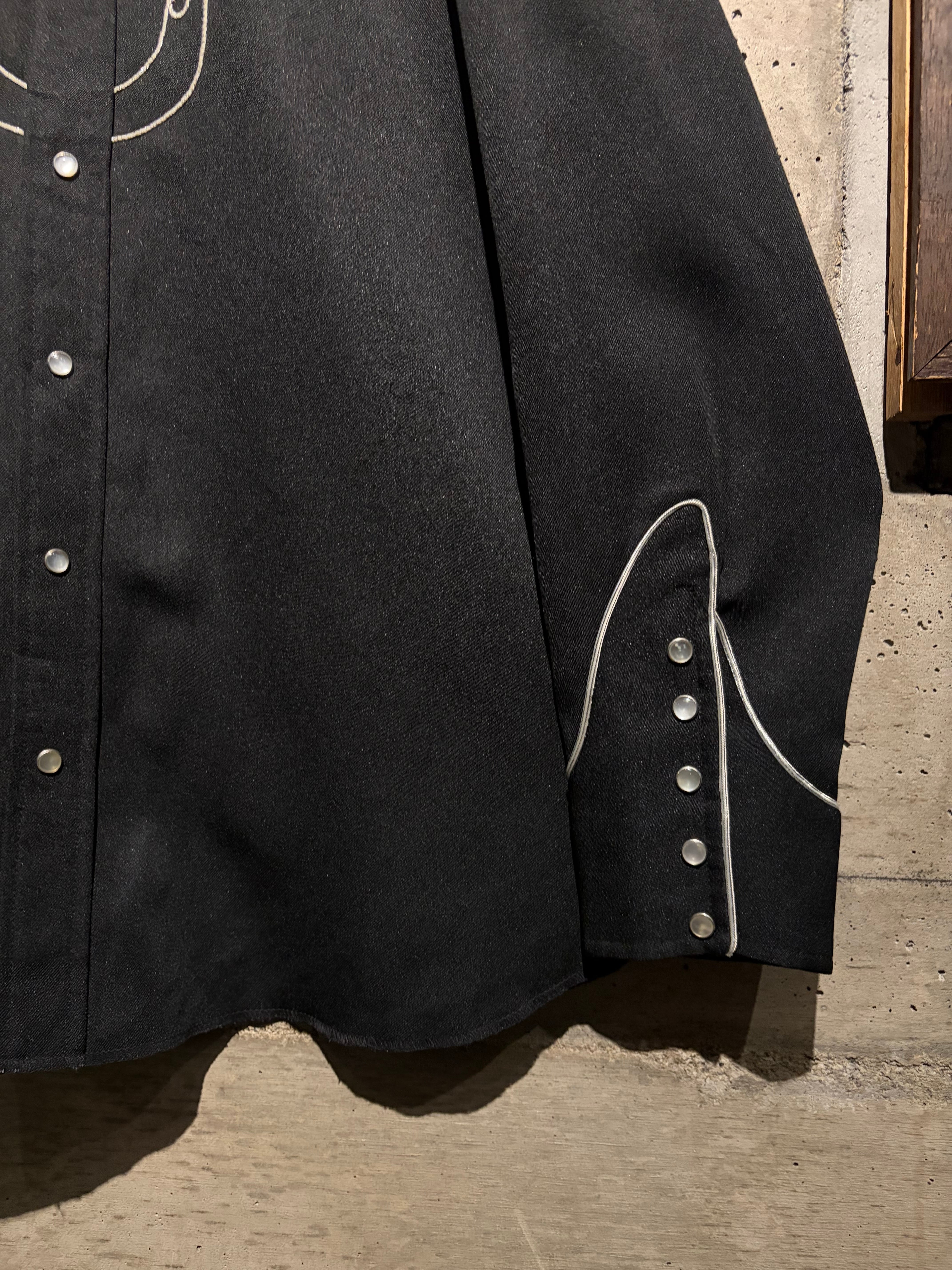 独特な雰囲気を漂わせるデザインは、クラシックなウエスタンシャツの文脈にありながらどこかモードな空気感を纏っています。フロントはスナップボタン仕様、パイピングで縁取られた襟、ウエスタンヨークカフス、アローポケットなど、王道のディテールの作り込みも抜かりありません。