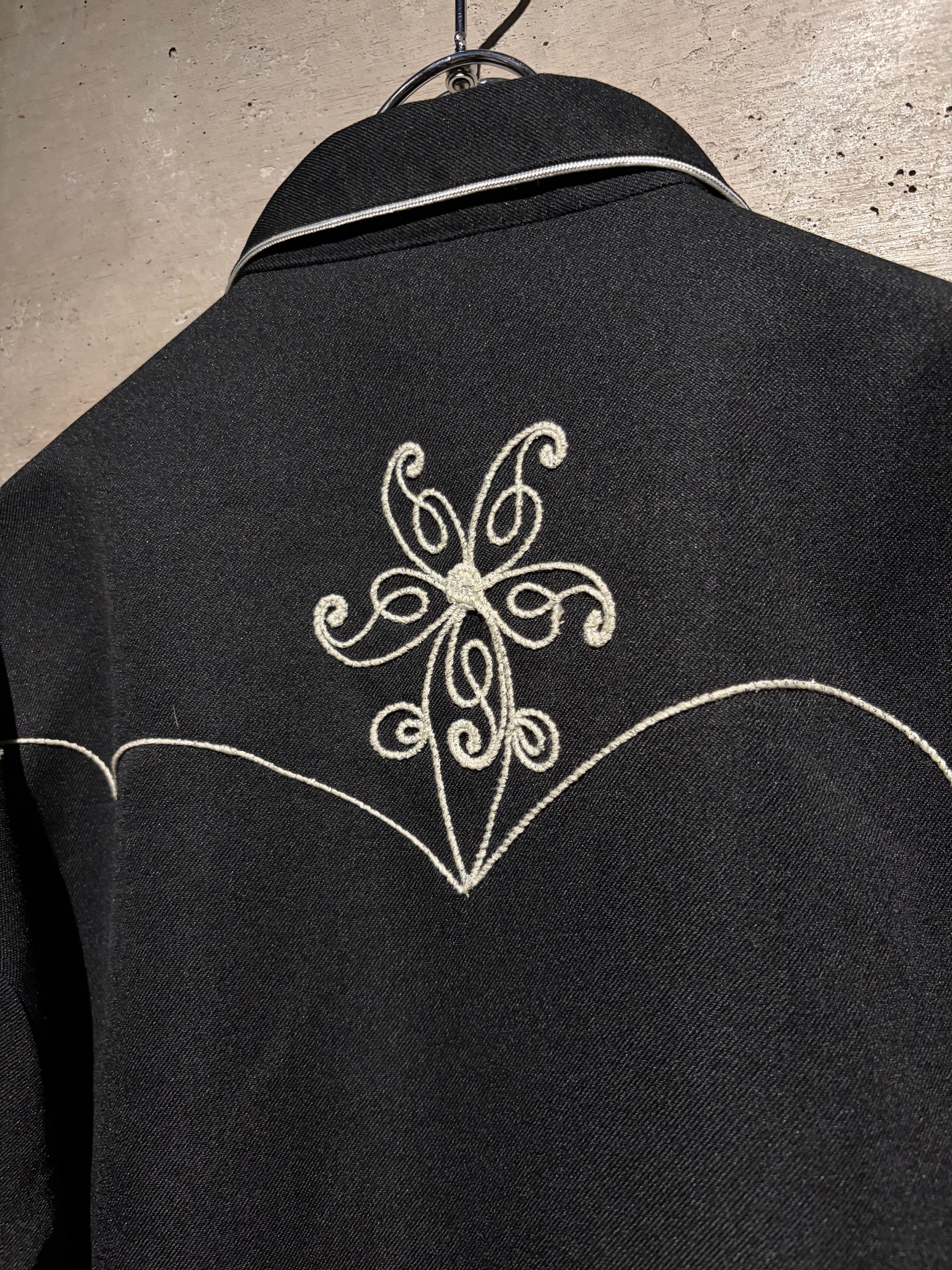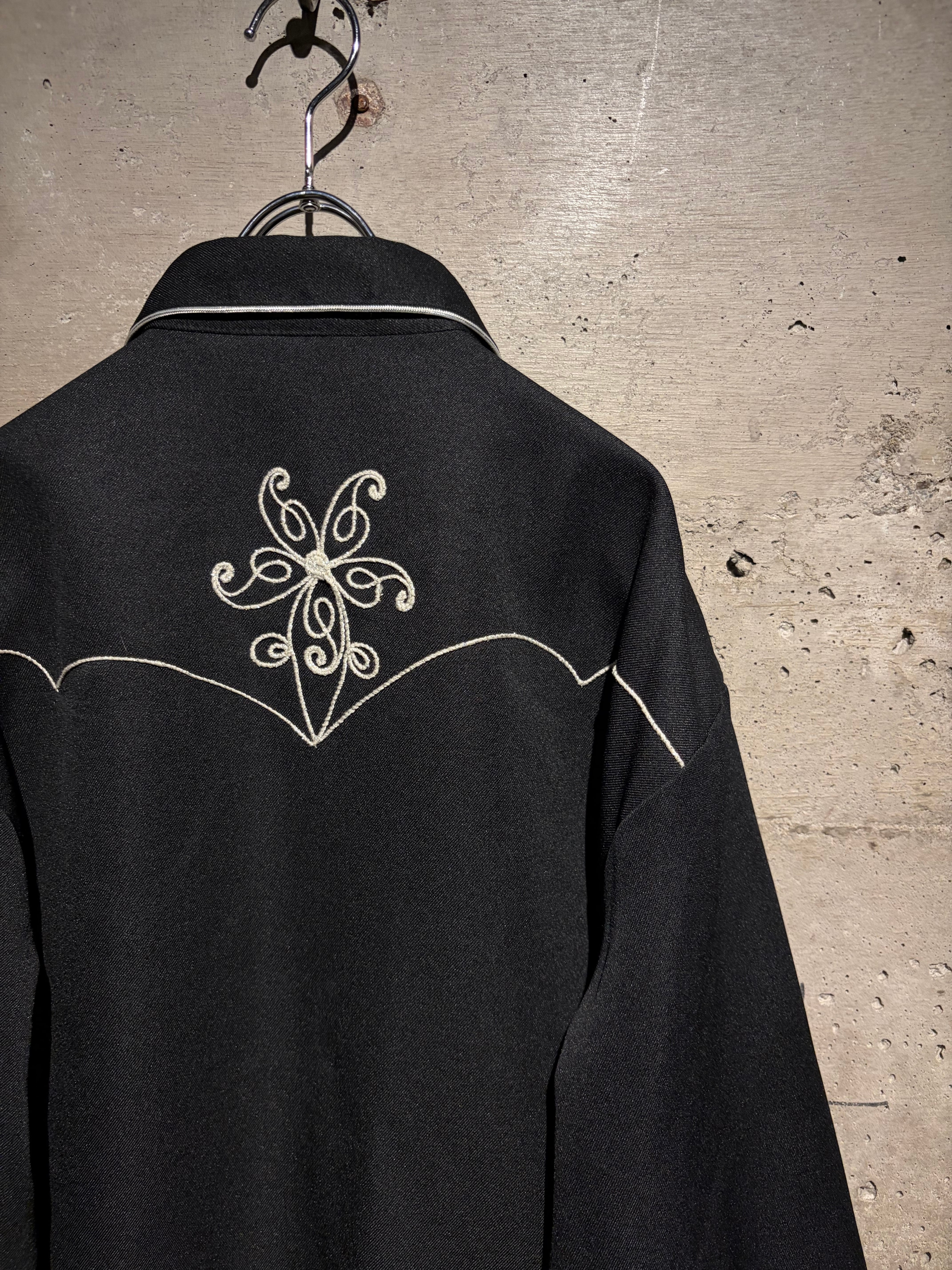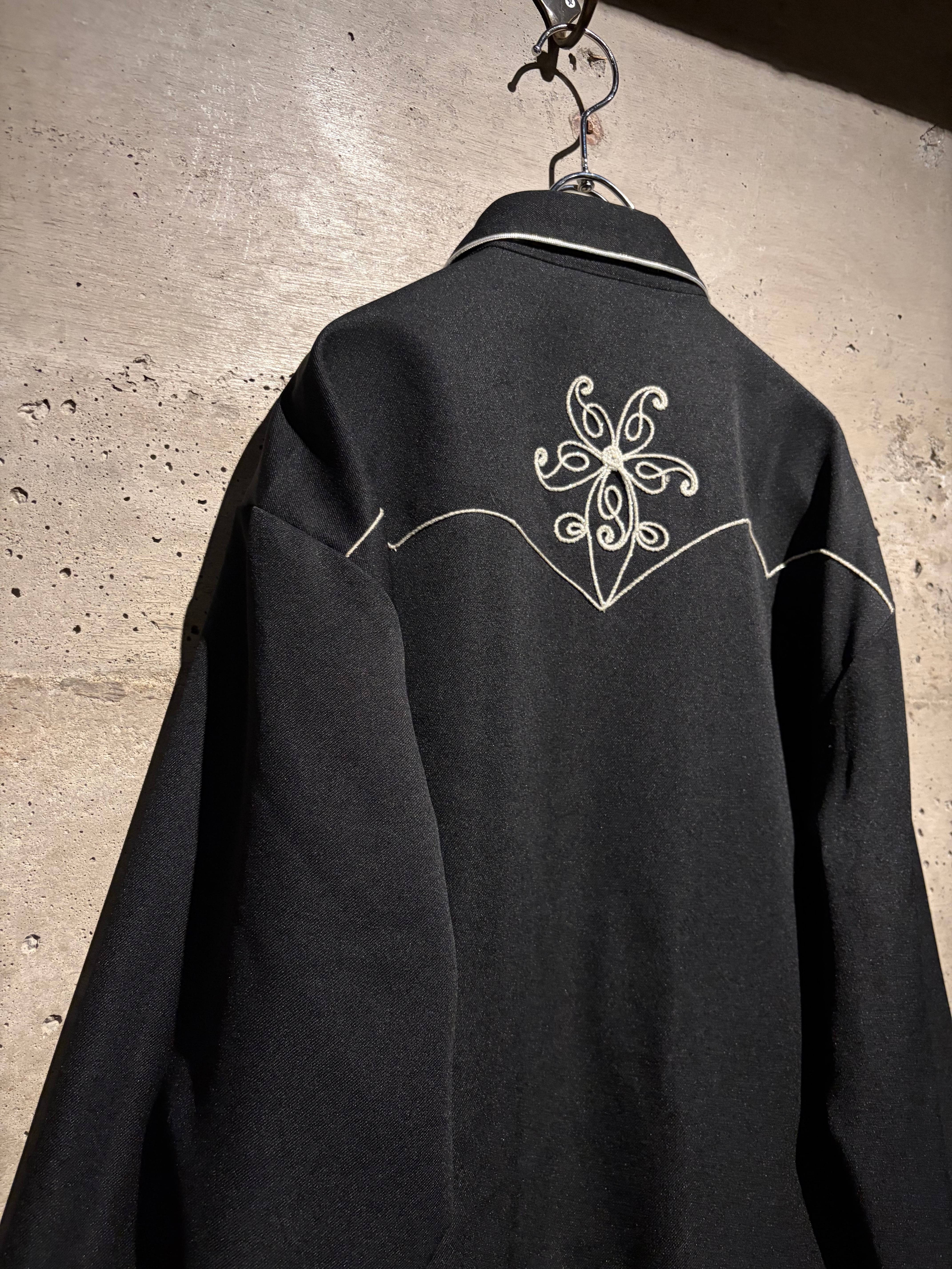 ブラックボディをベースに、フロントからバックヨークにかけて大胆に配された花モチーフの刺繍が目を惹く1着。