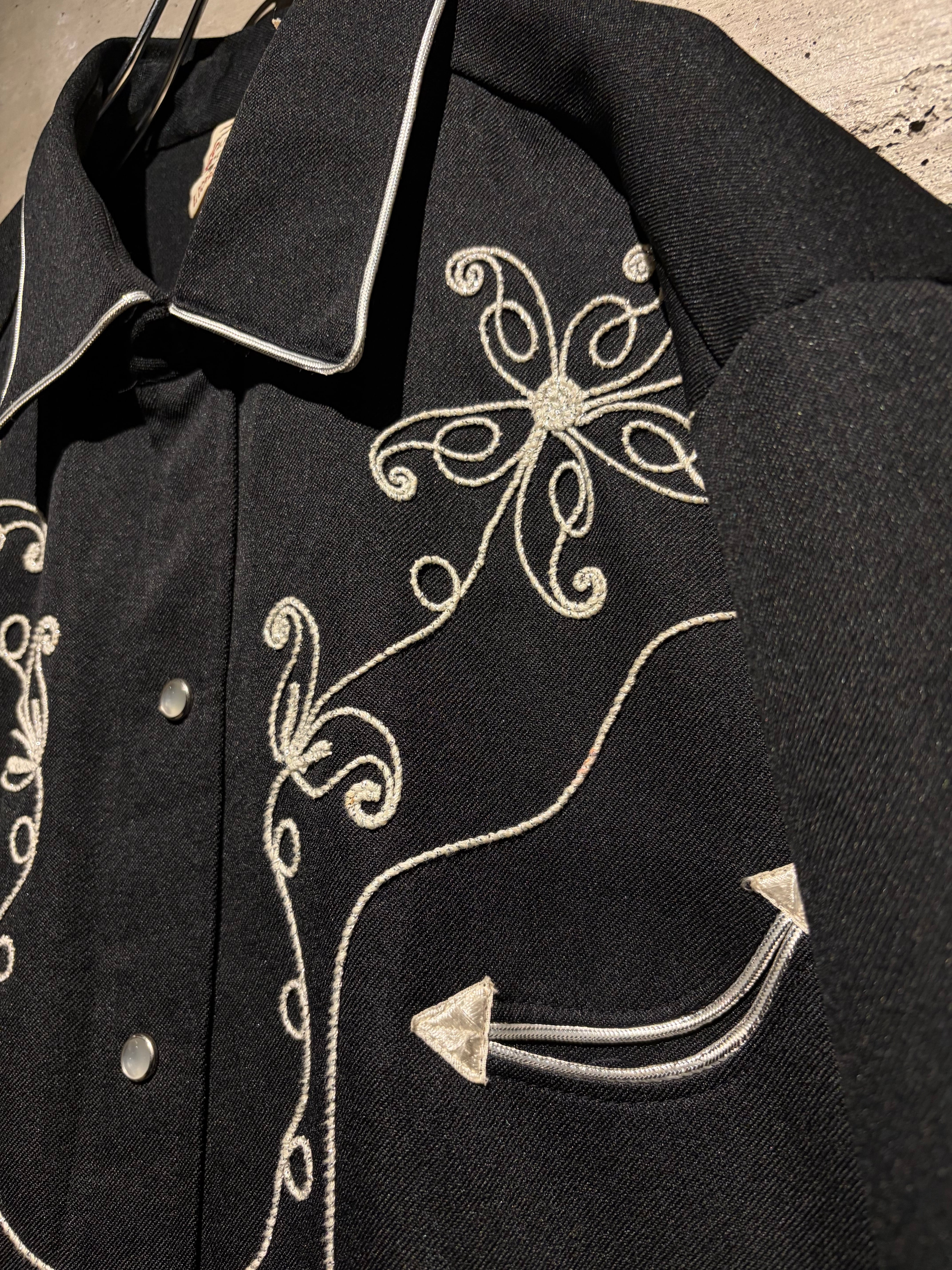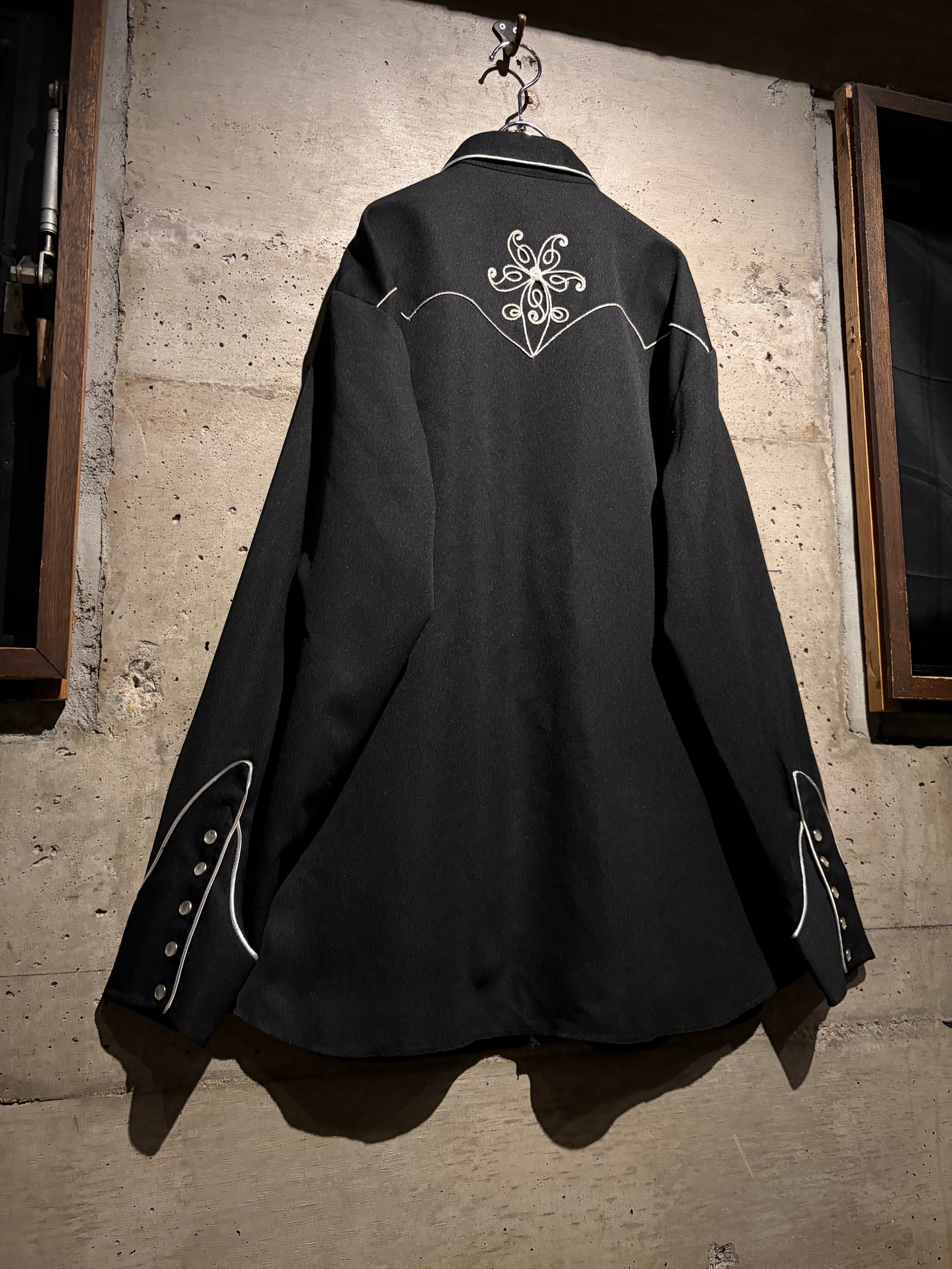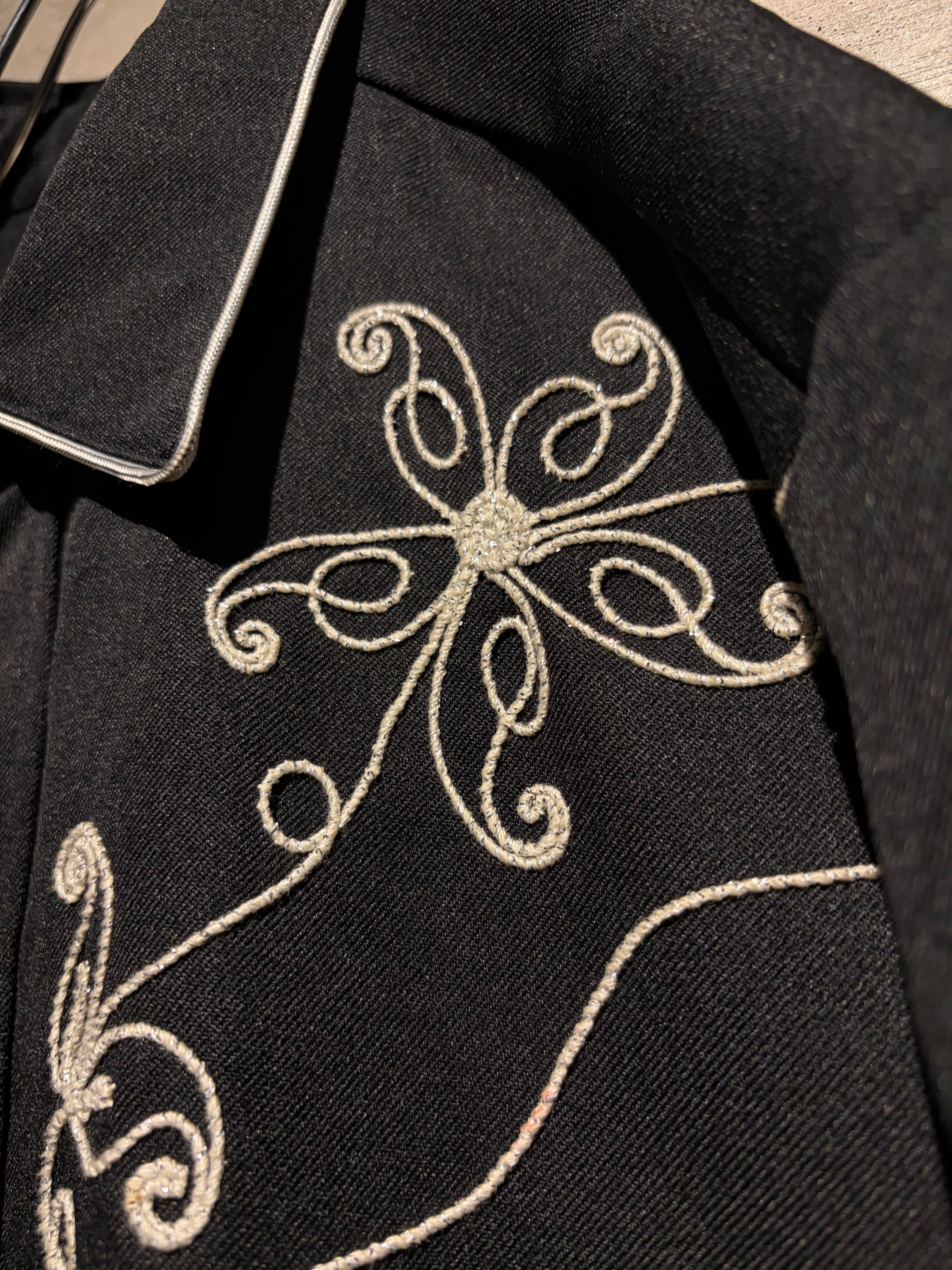 ブラックボディをベースに、フロントからバックヨークにかけて大胆に配された花モチーフの刺繍が目を惹く1着。