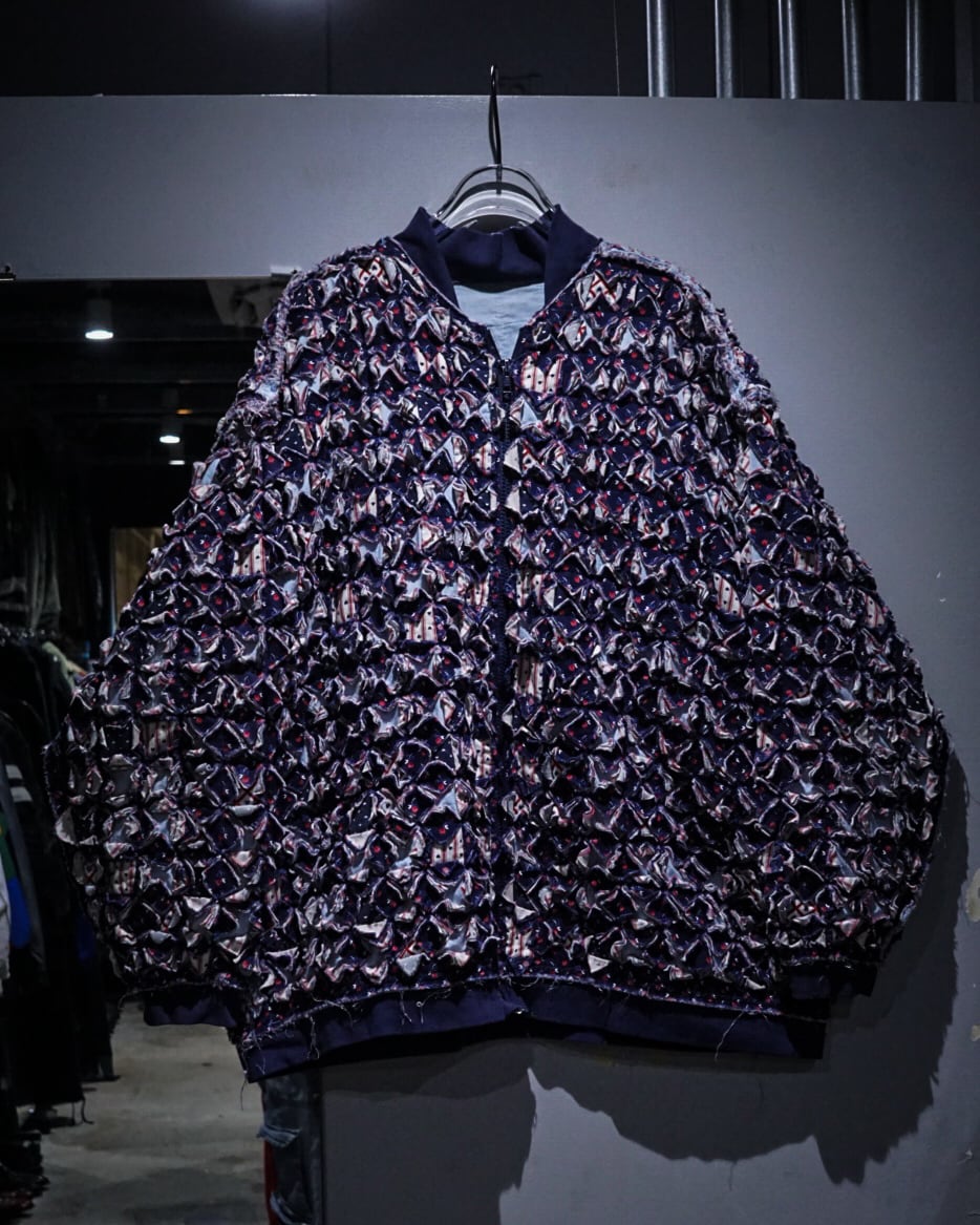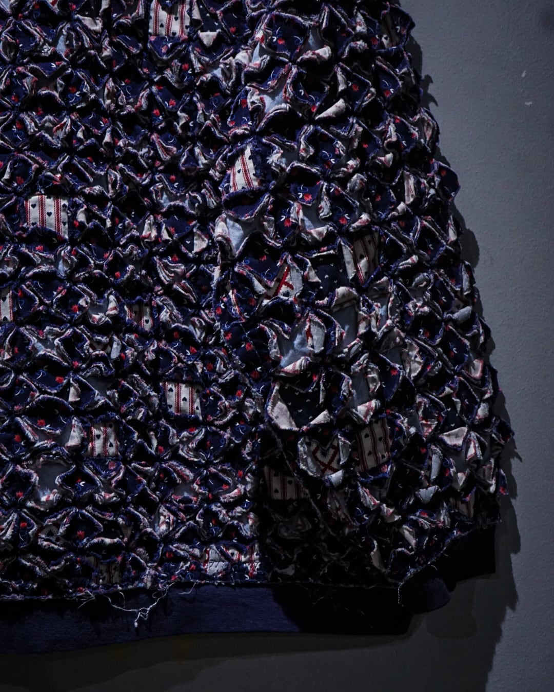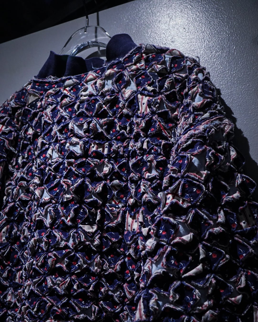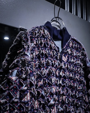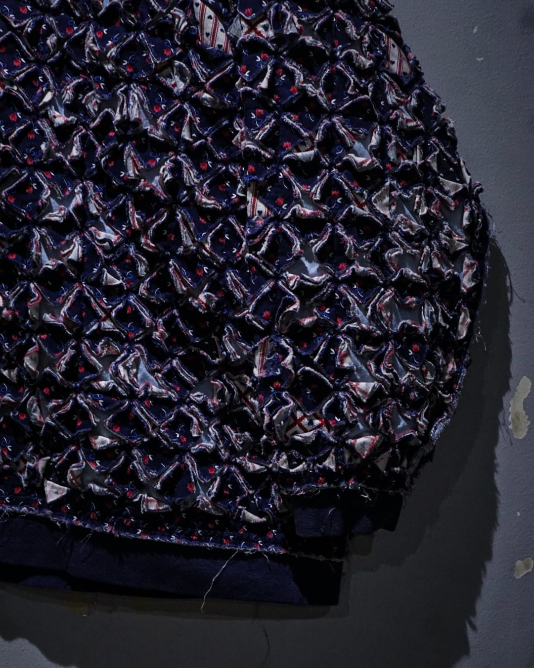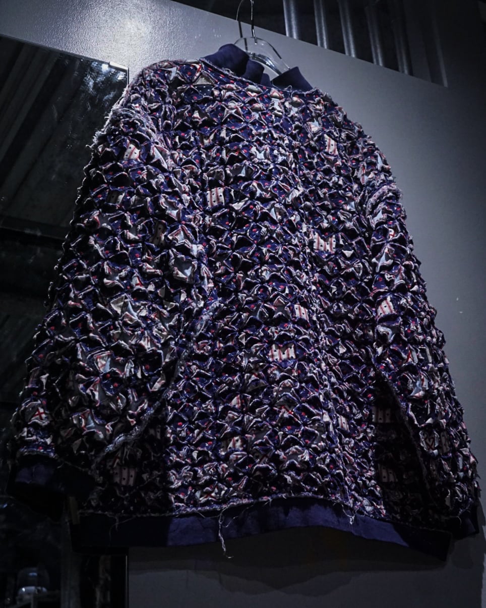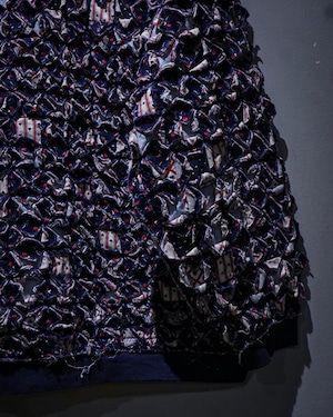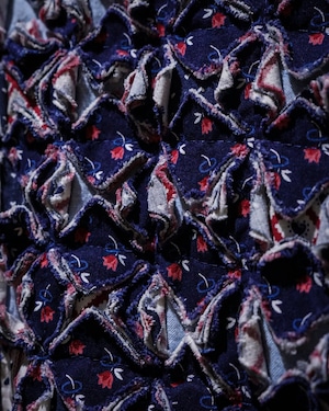 細かくカットされたキルト生地をこれでもかとパッチワークし、立体感とボリューム感は圧巻。凹凸感、ほつれを活かしたラフなエッジ処理など、クラフト感とアーティスティックな雰囲気を放っています。
