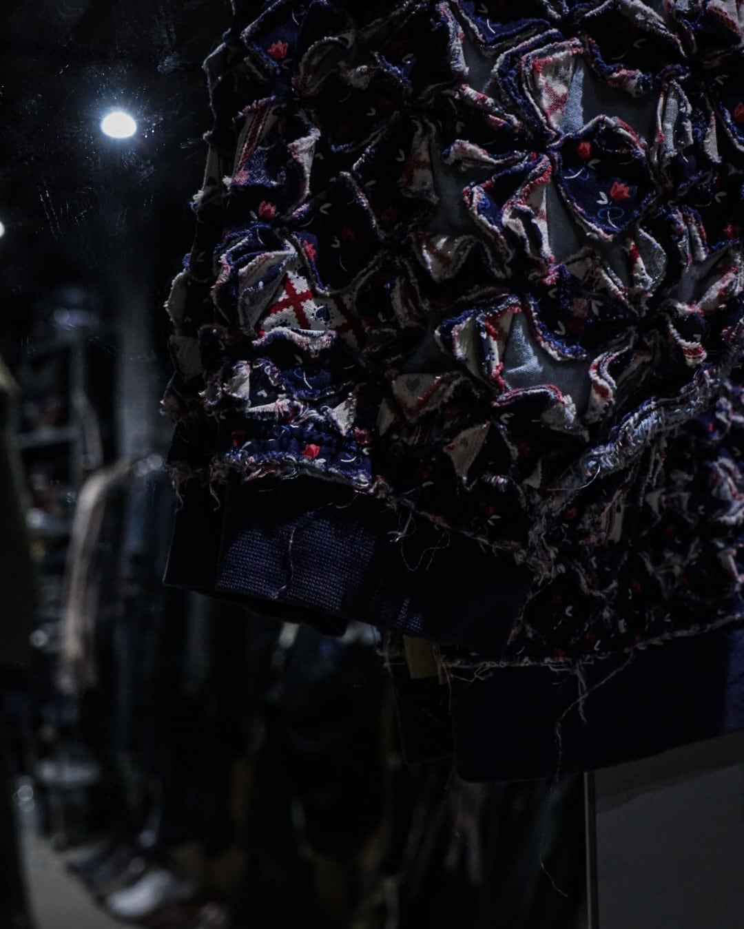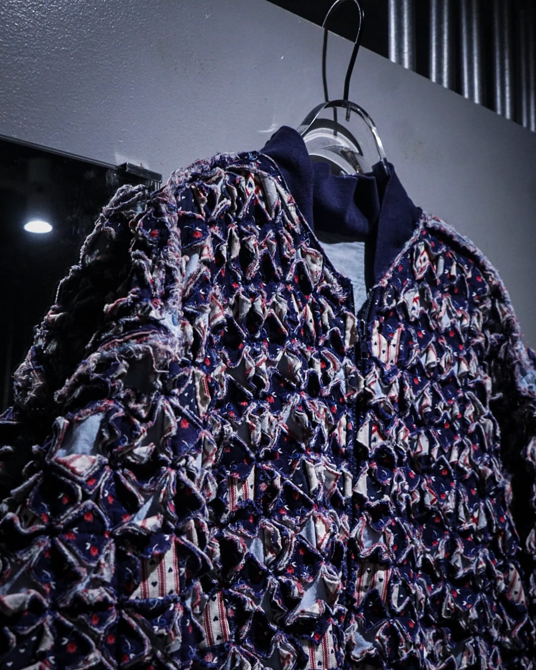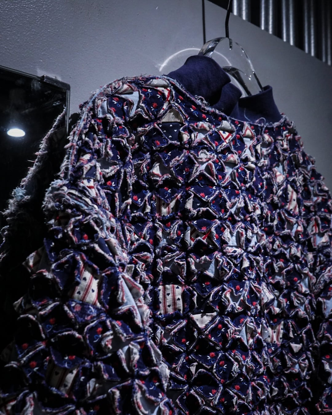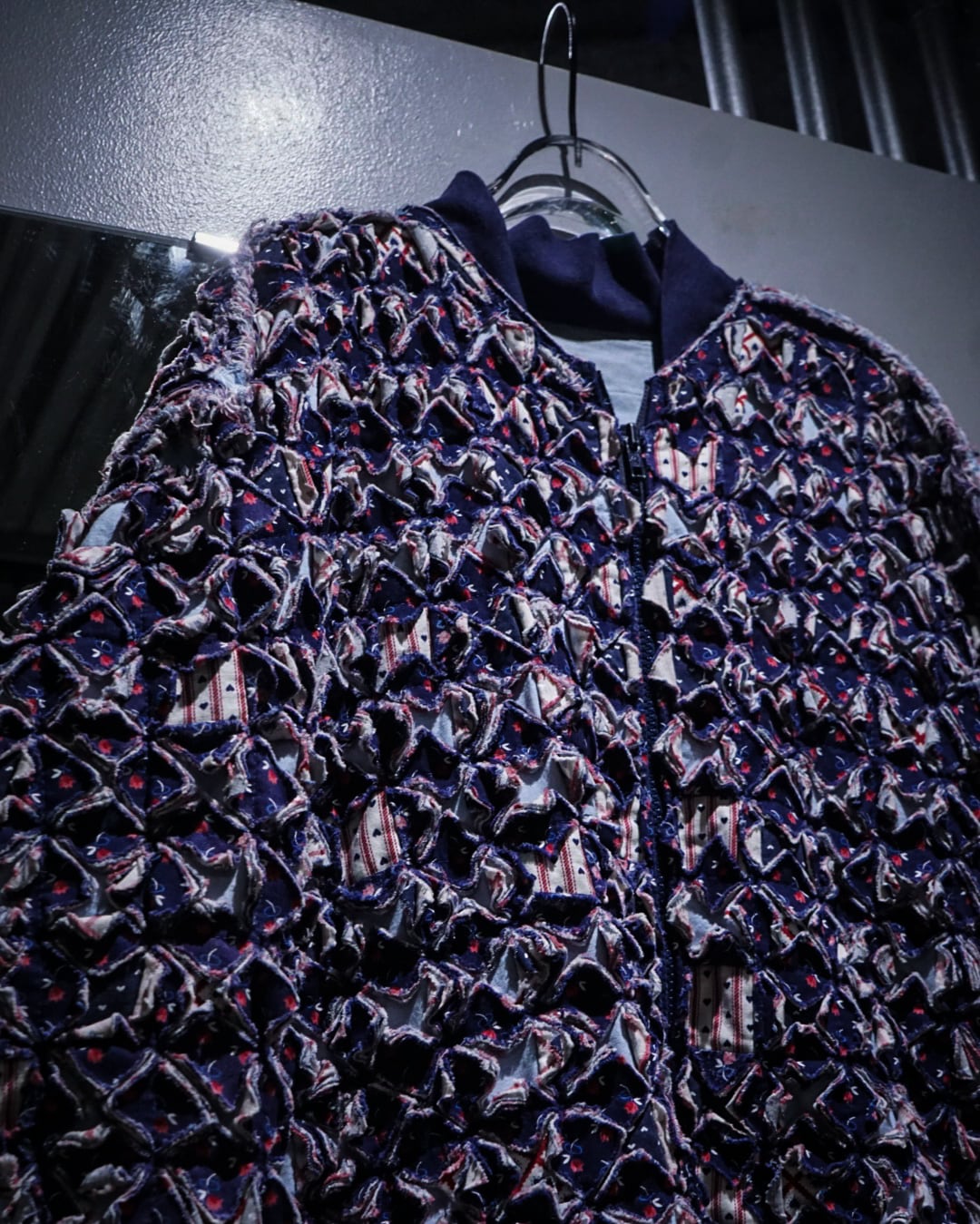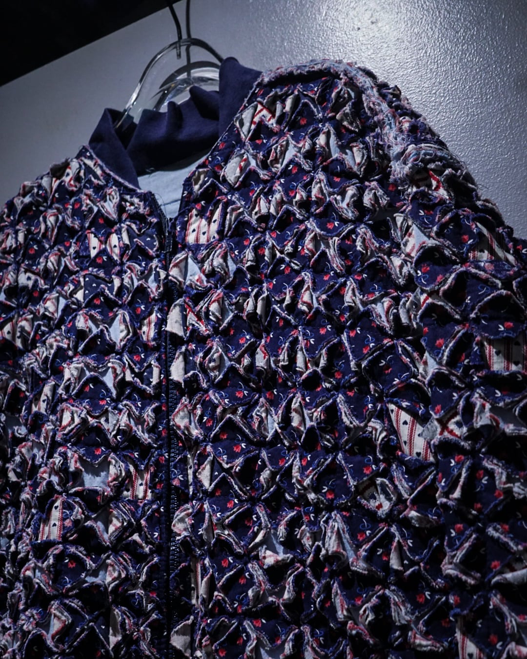 細かくカットされたキルト生地をこれでもかとパッチワークし、立体感とボリューム感は圧巻。凹凸感、ほつれを活かしたラフなエッジ処理など、クラフト感とアーティスティックな雰囲気を放っています。