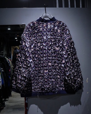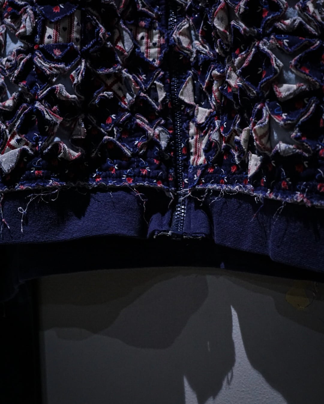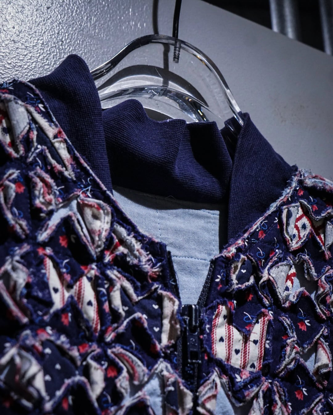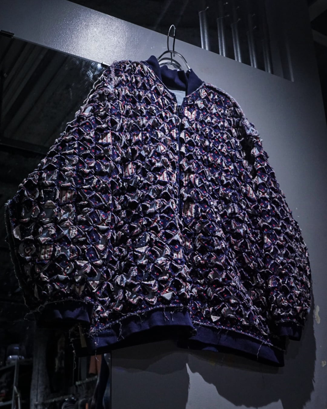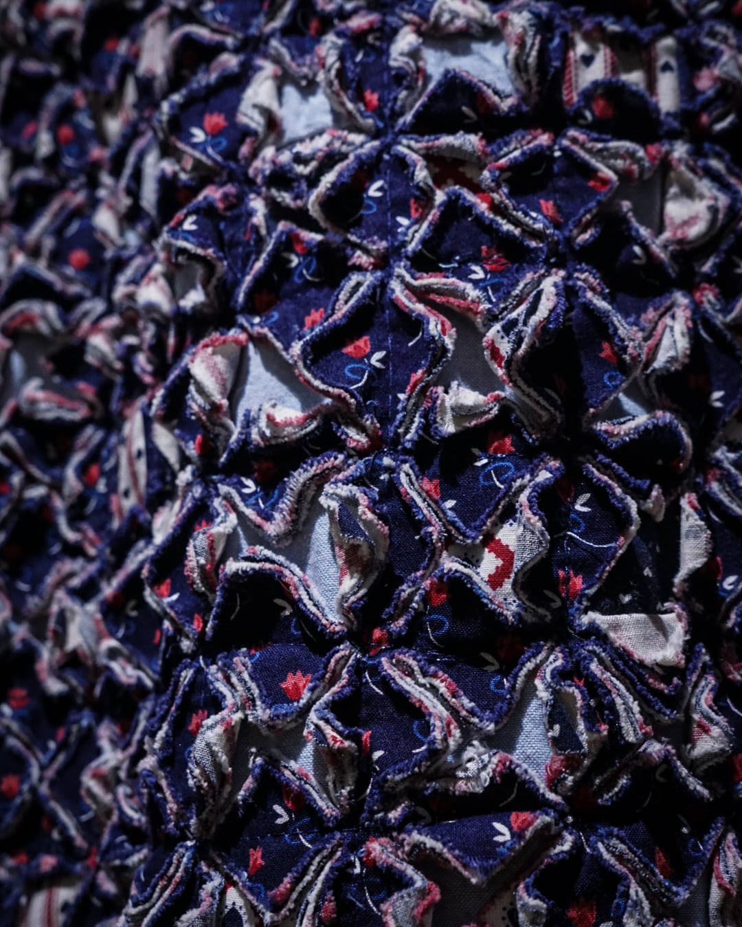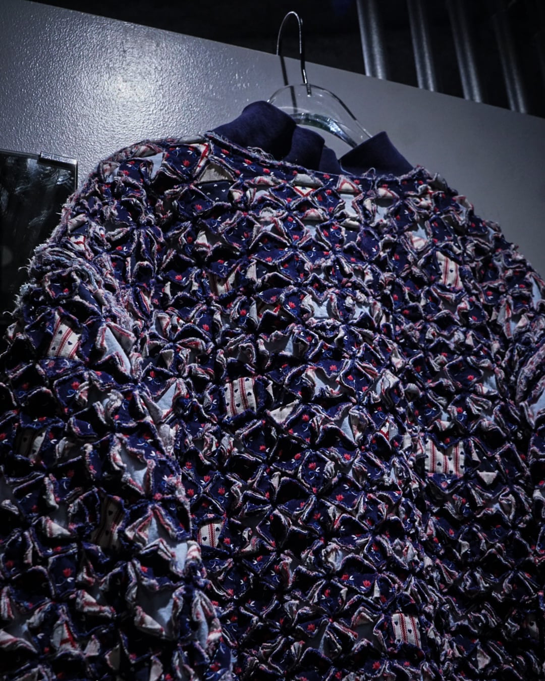 細かくカットされたキルト生地をこれでもかとパッチワークし、立体感とボリューム感は圧巻。凹凸感、ほつれを活かしたラフなエッジ処理など、クラフト感とアーティスティックな雰囲気を放っています。