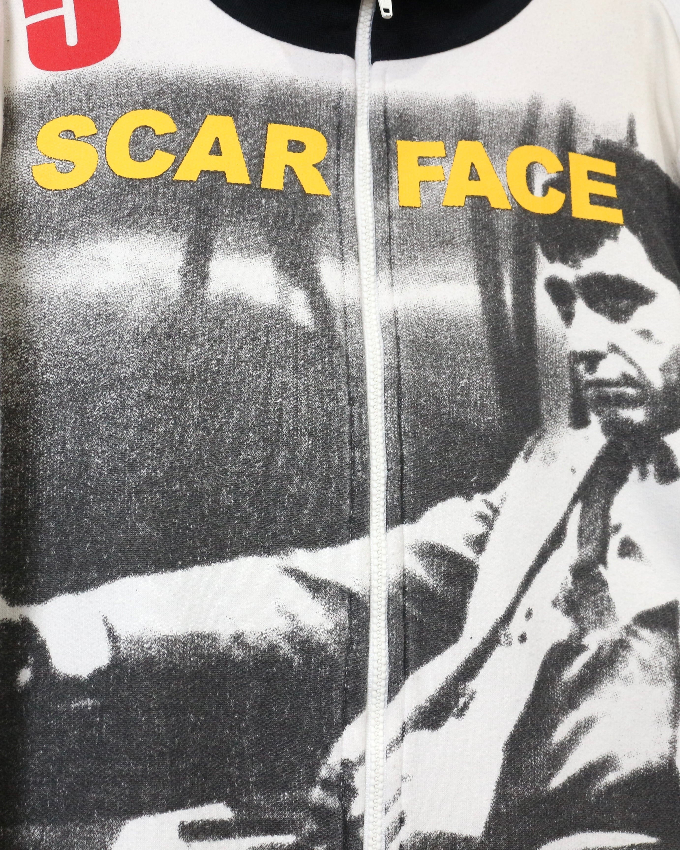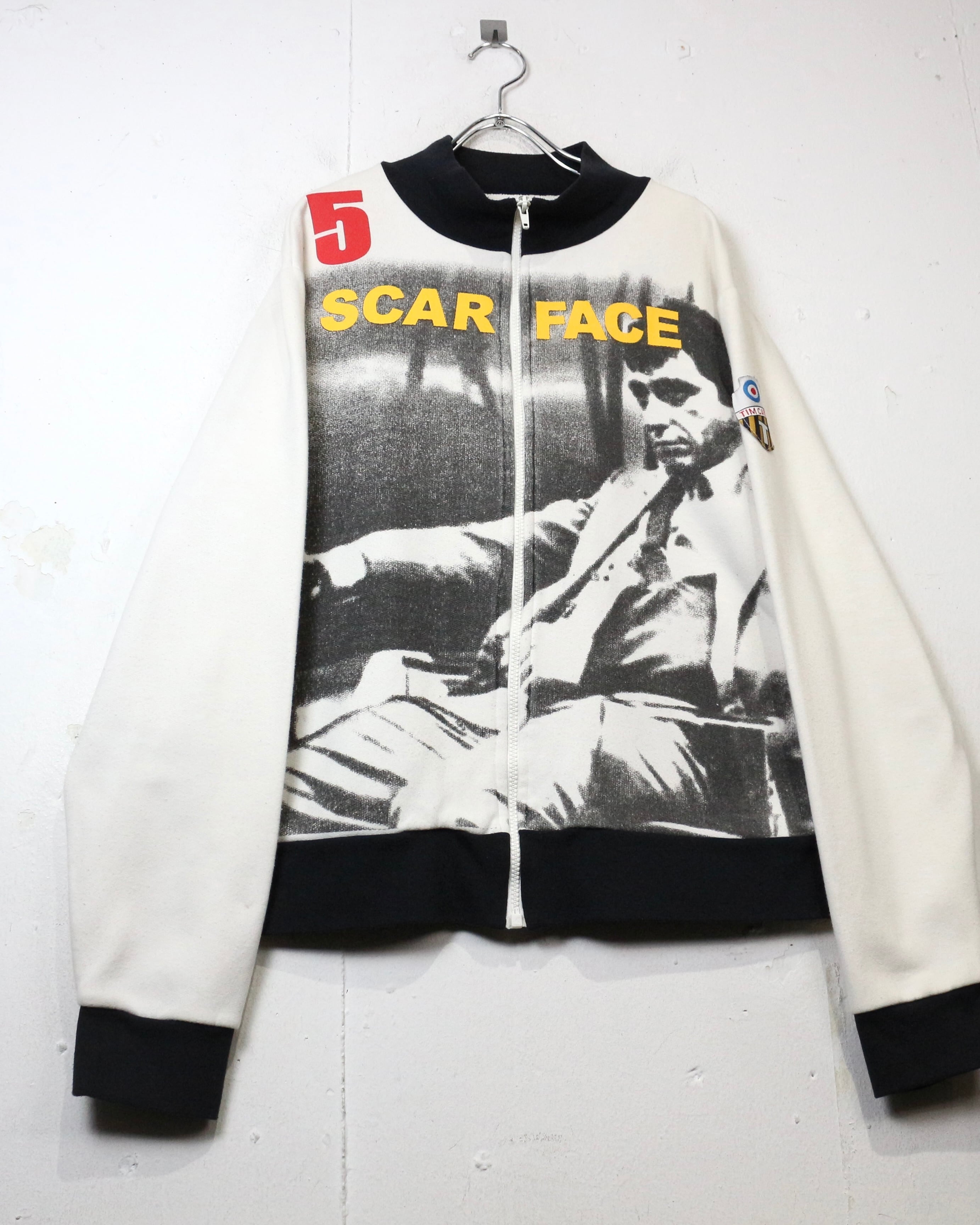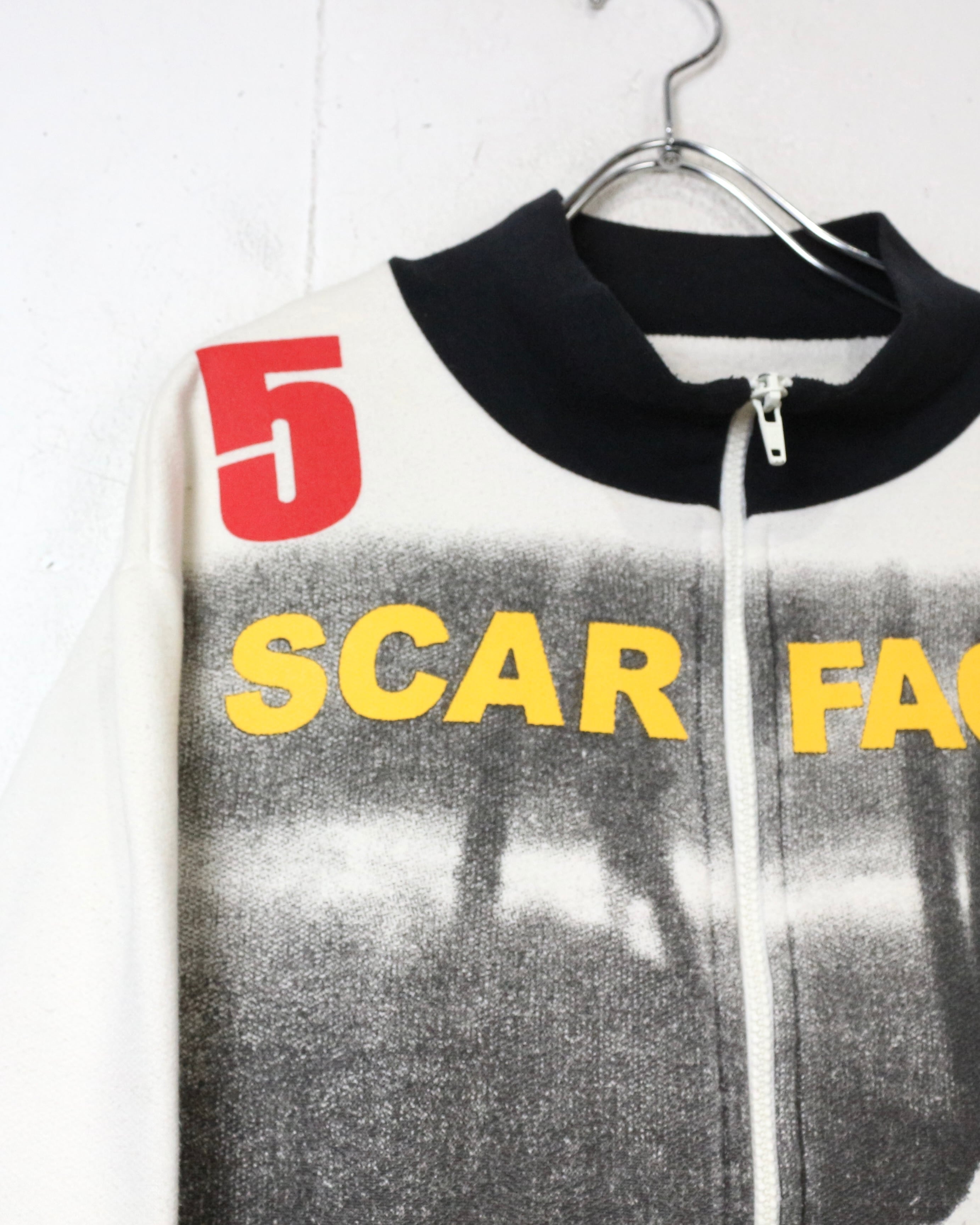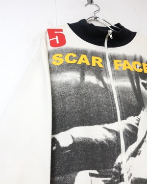 映画業界を飛び越え、ファッションシーンにも多大な影響を与え続ける名作映画“SCARFACE”より、アイコニックなグラフィックを落とし込んだ90'sスウェットジャケット。