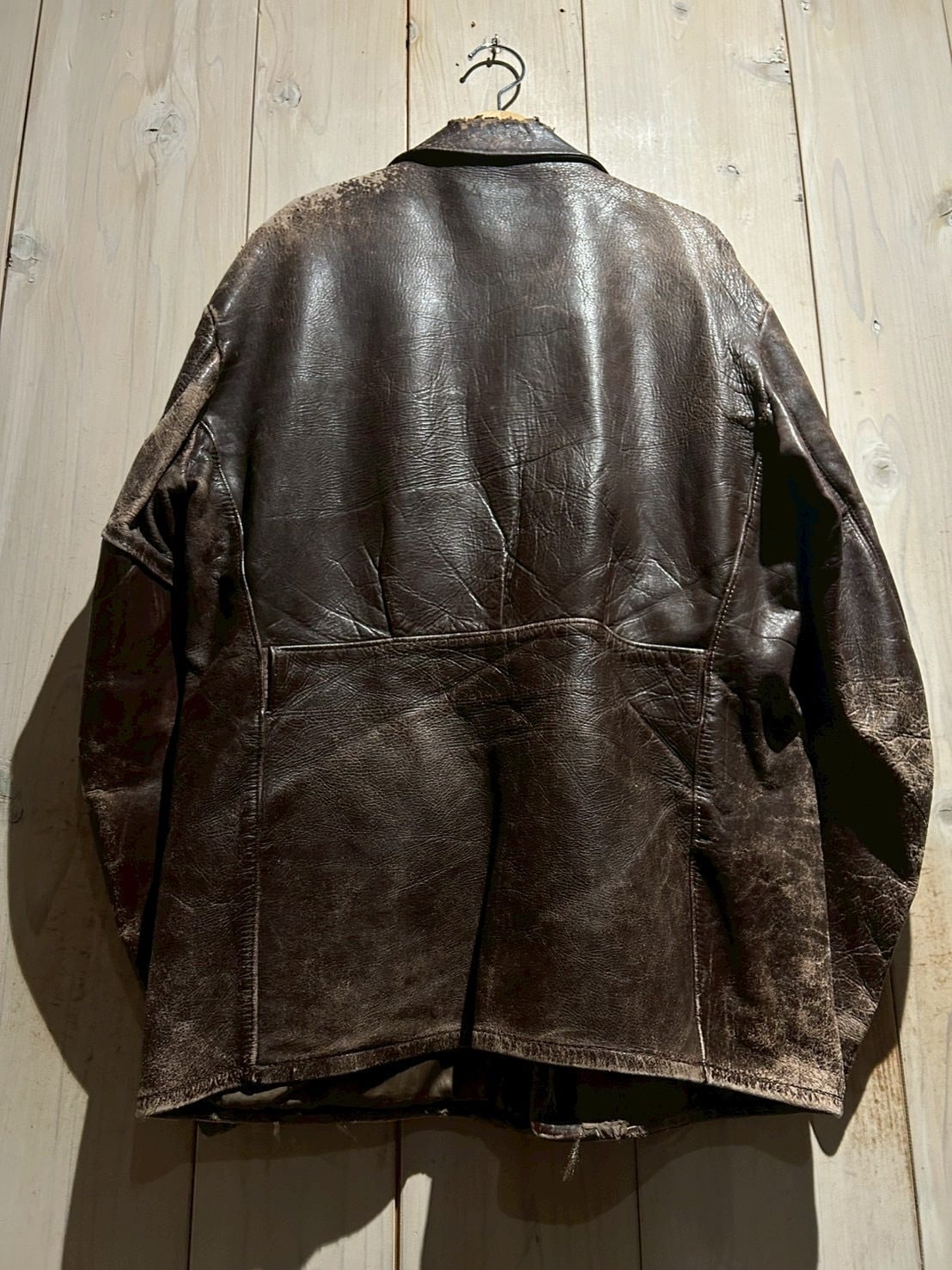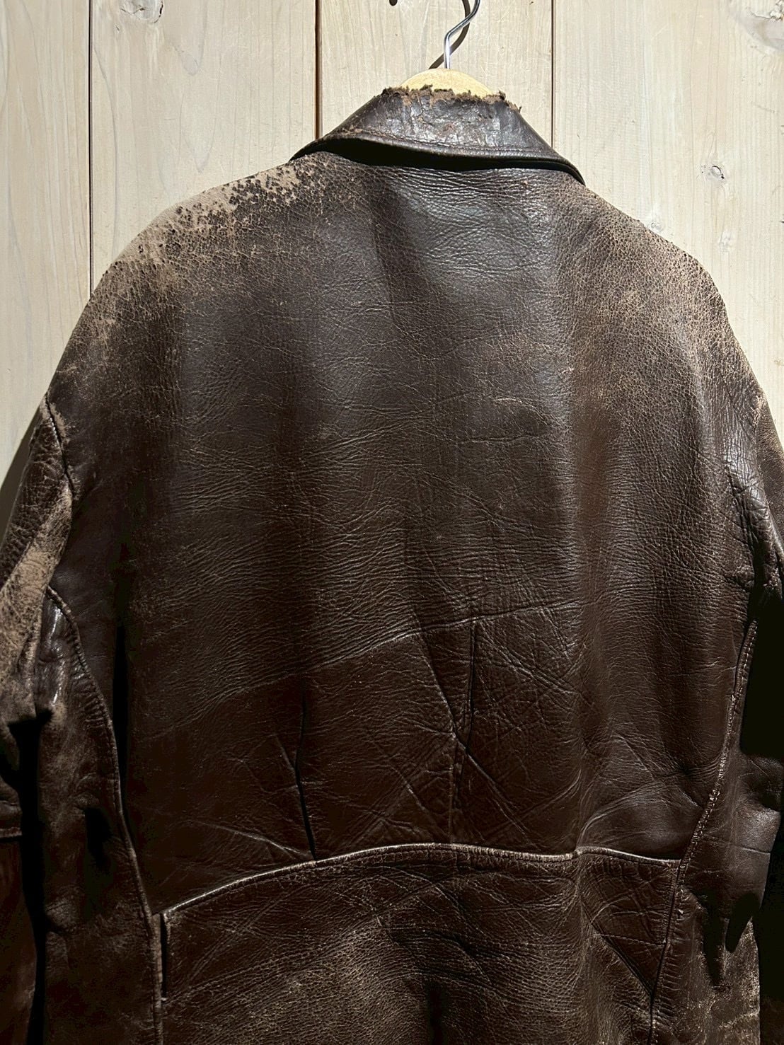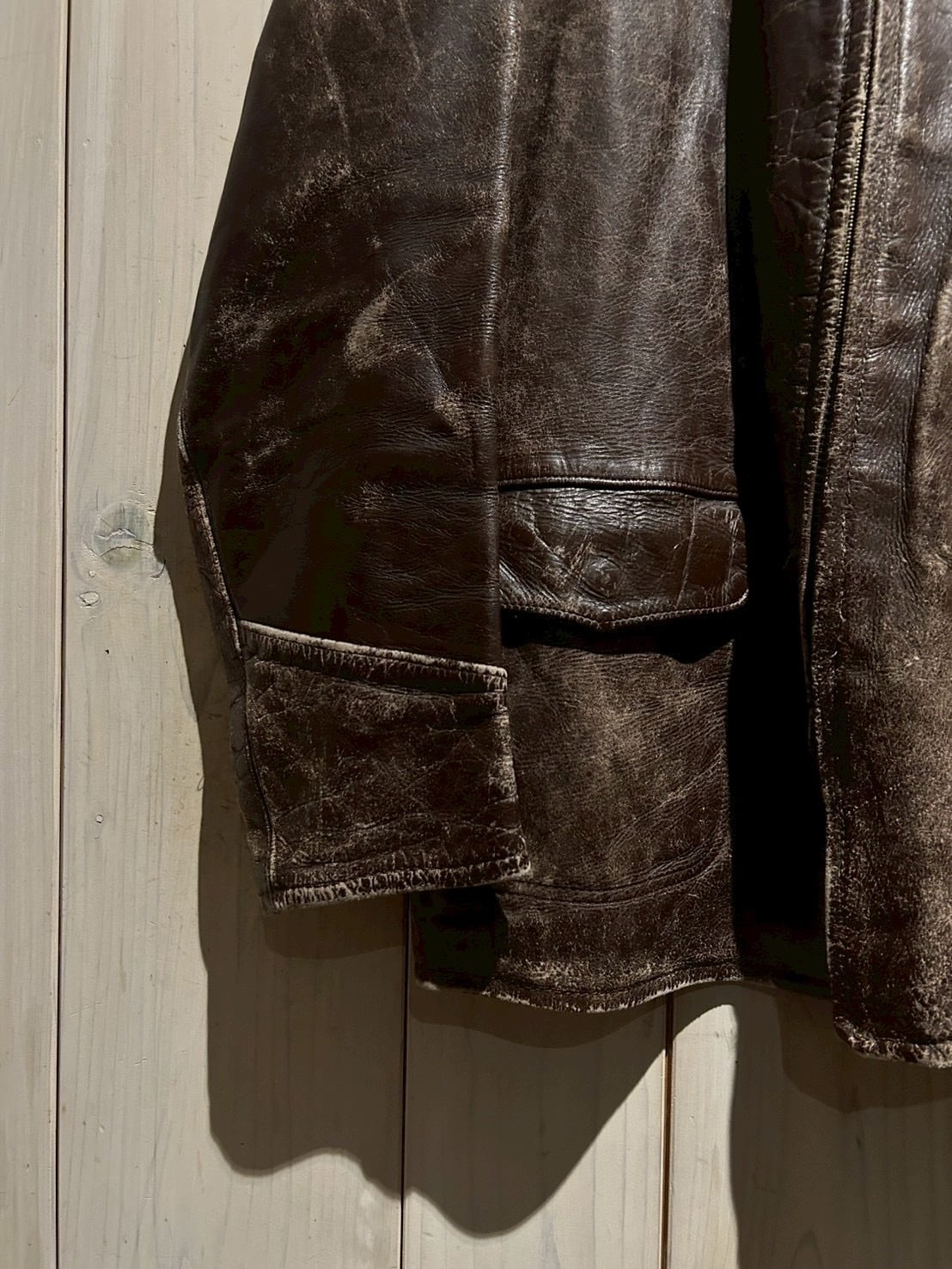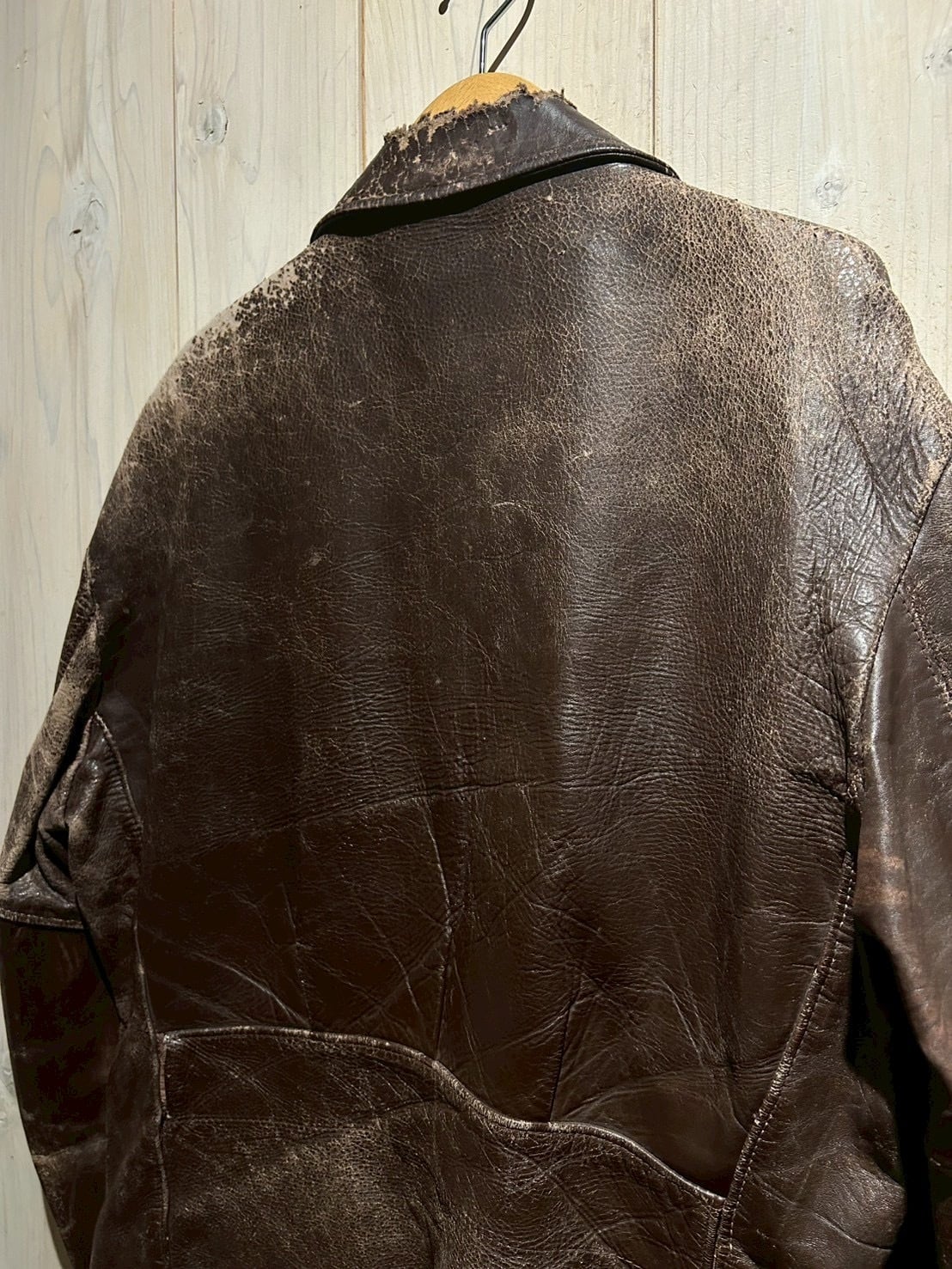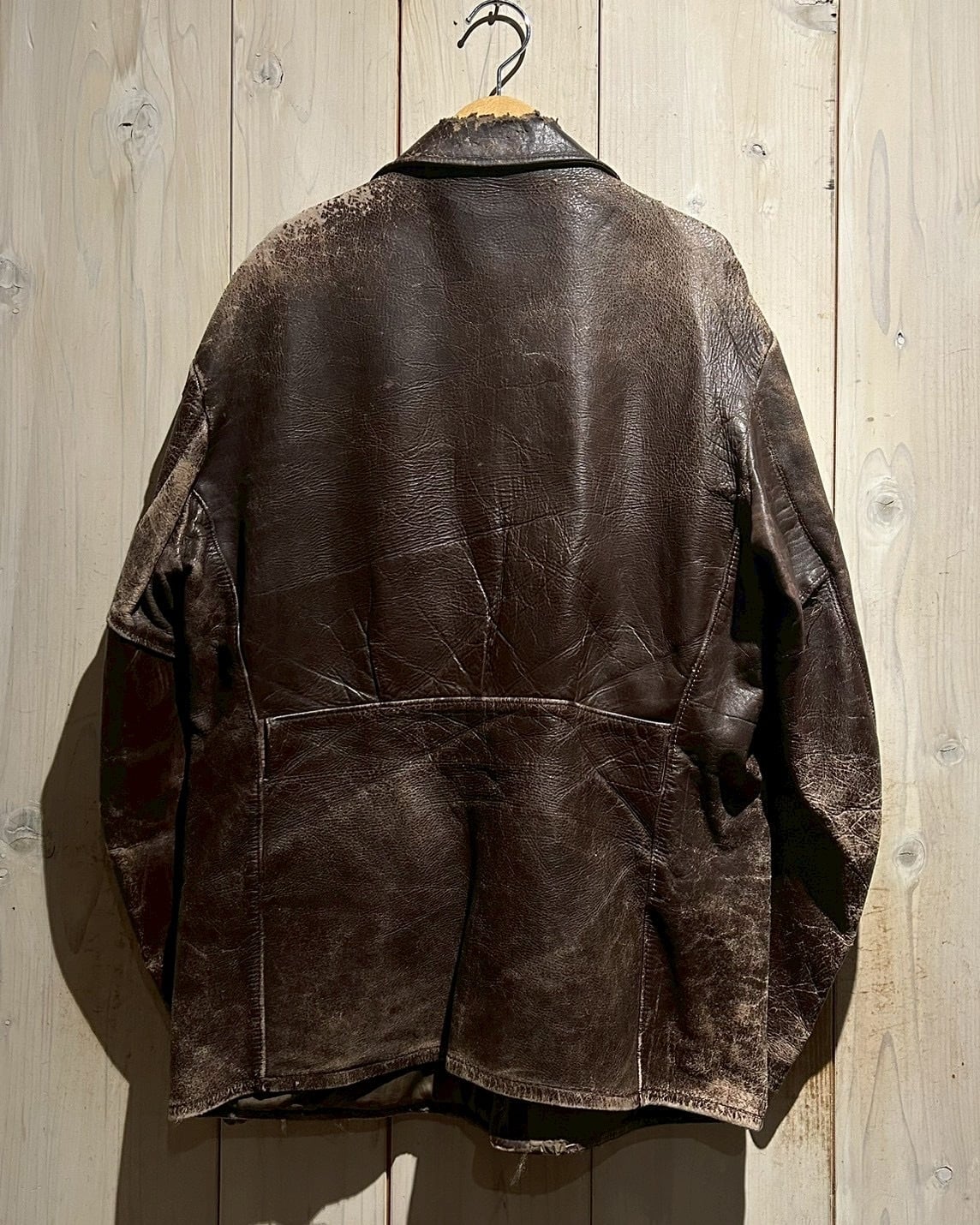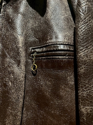 肉厚で重厚なステアハイドをボディに使用し、長年の着用によって刻まれたシワやヒビ割れ、色の抜け方が唯一無二の表情を演出。荒々しくもどこか品のあるこの経年変化は、現行では再現し難いヴィンテージならではの魅力です。