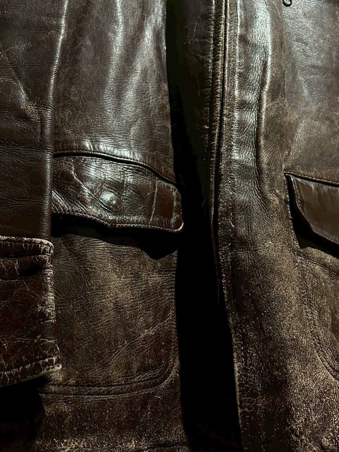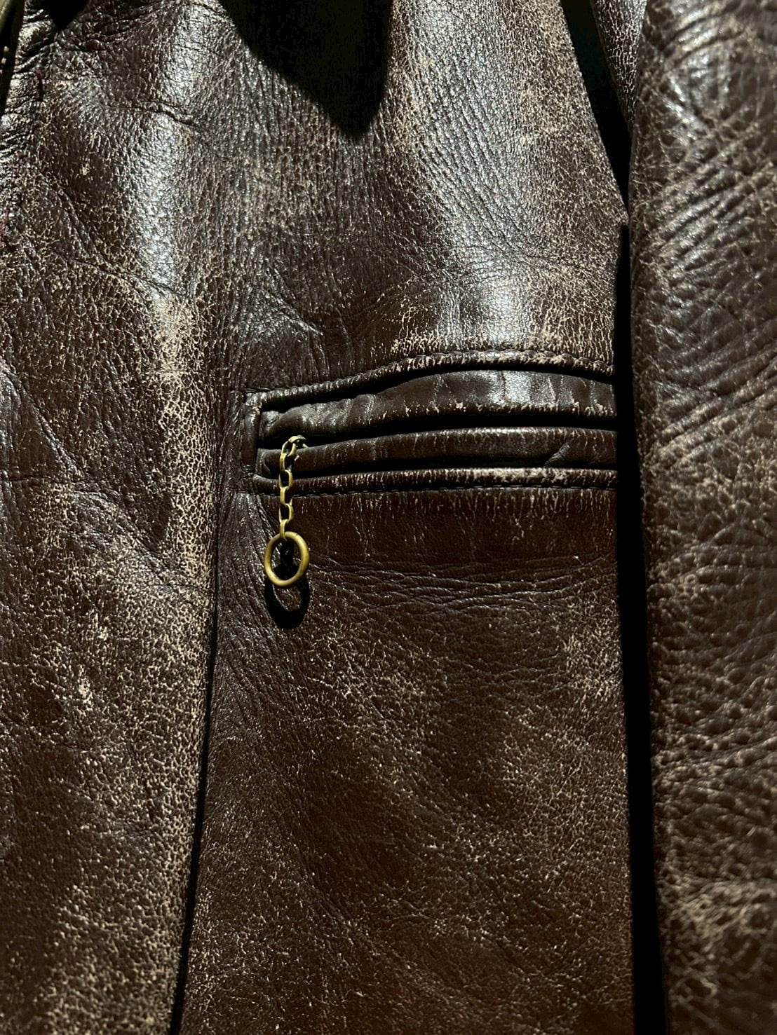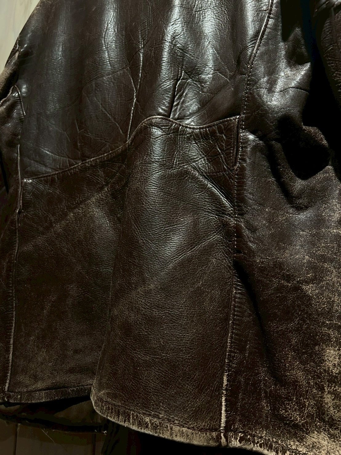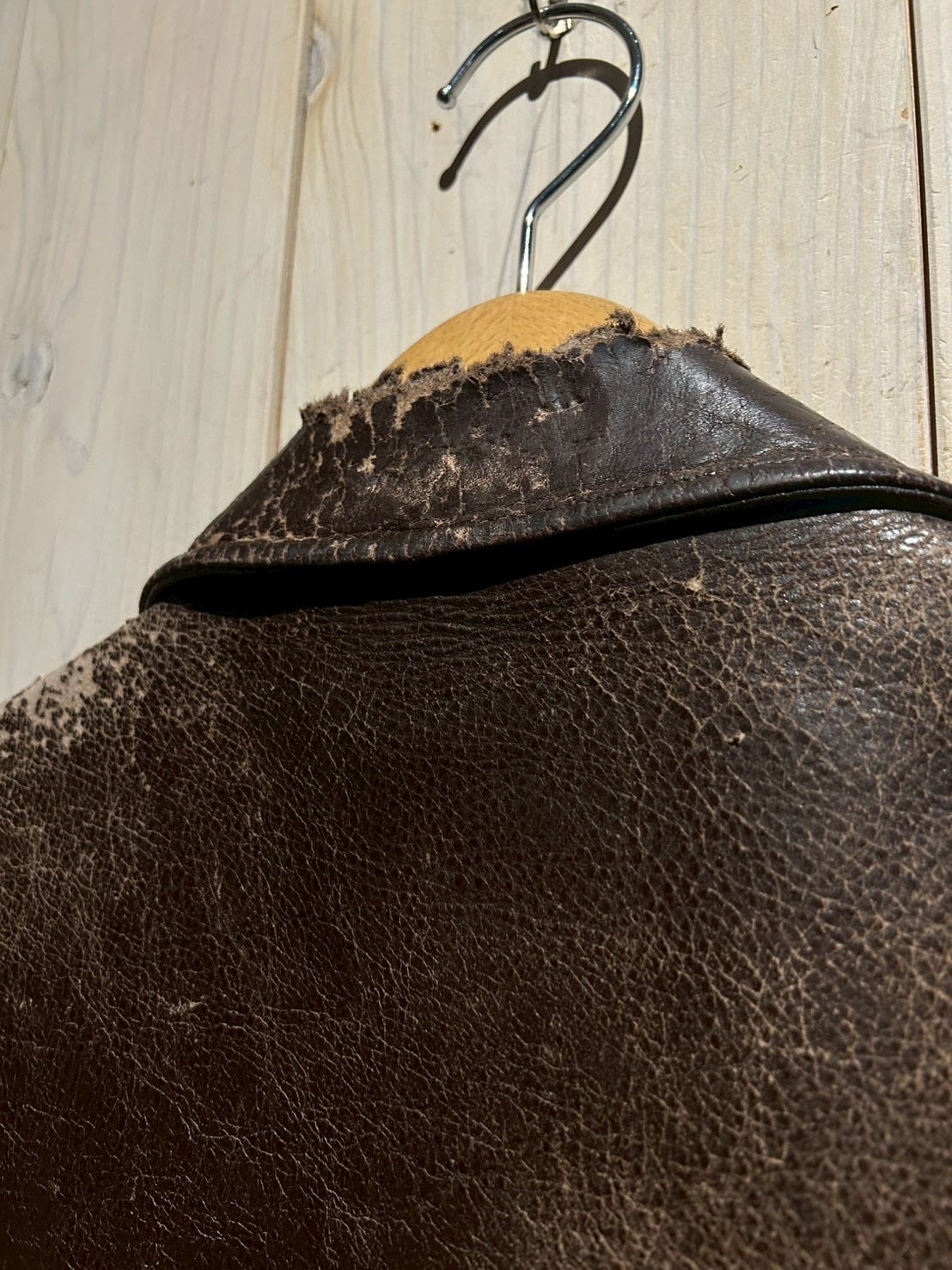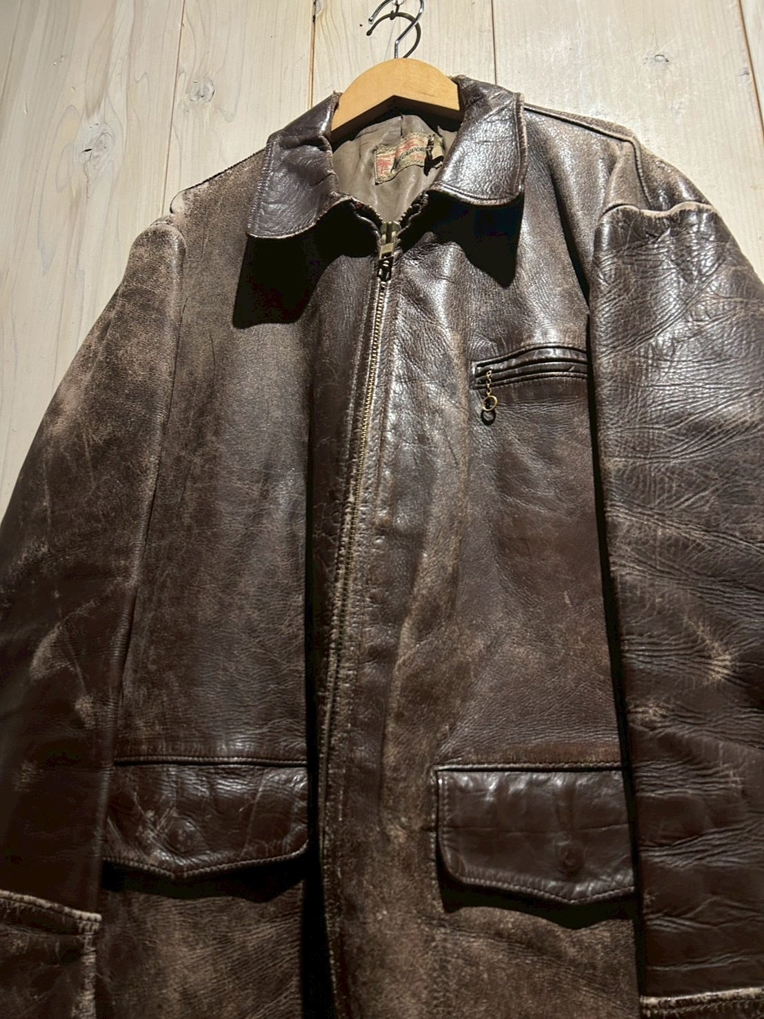 肉厚で重厚なステアハイドをボディに使用し、長年の着用によって刻まれたシワやヒビ割れ、色の抜け方が唯一無二の表情を演出。荒々しくもどこか品のあるこの経年変化は、現行では再現し難いヴィンテージならではの魅力です。