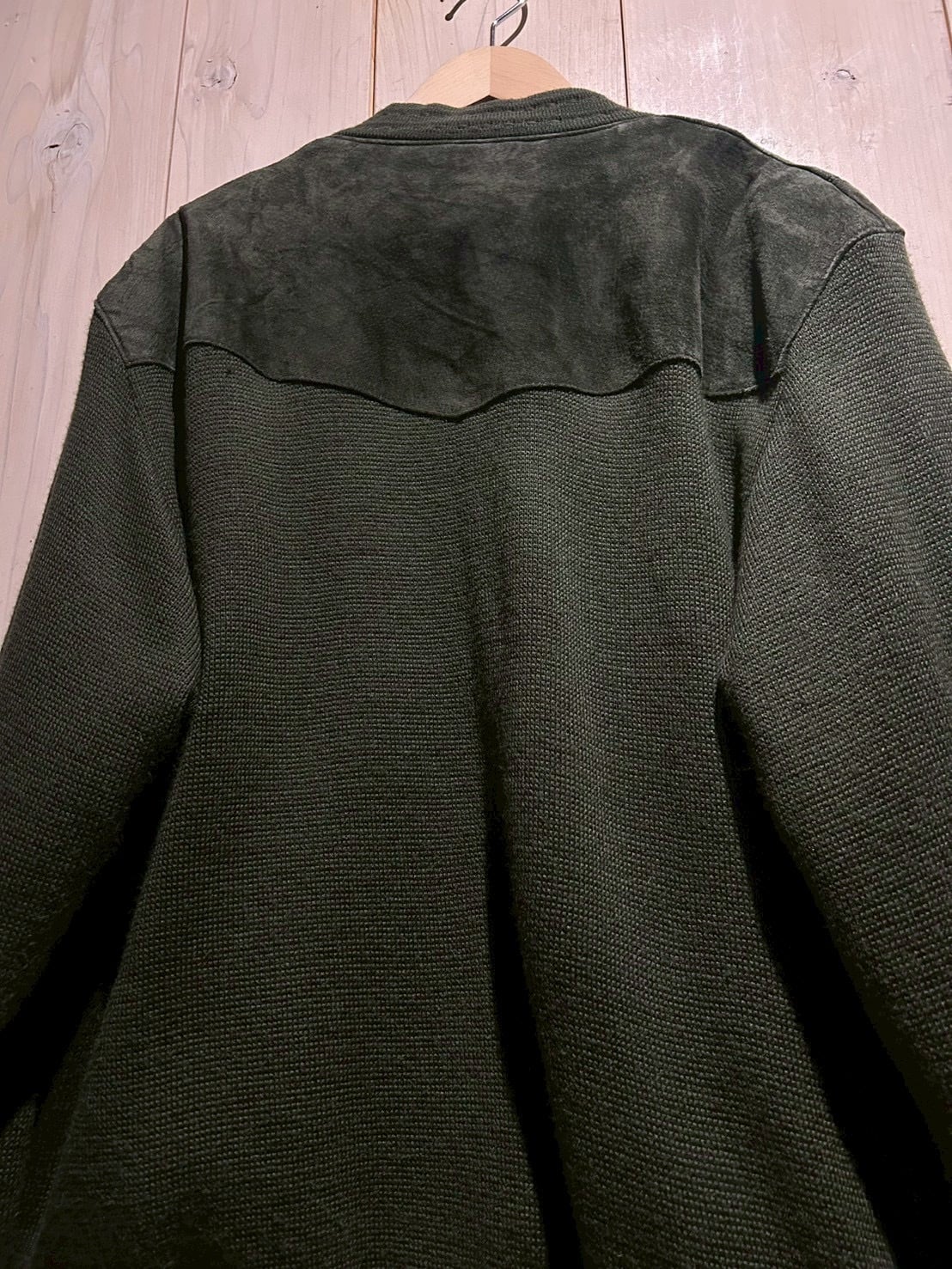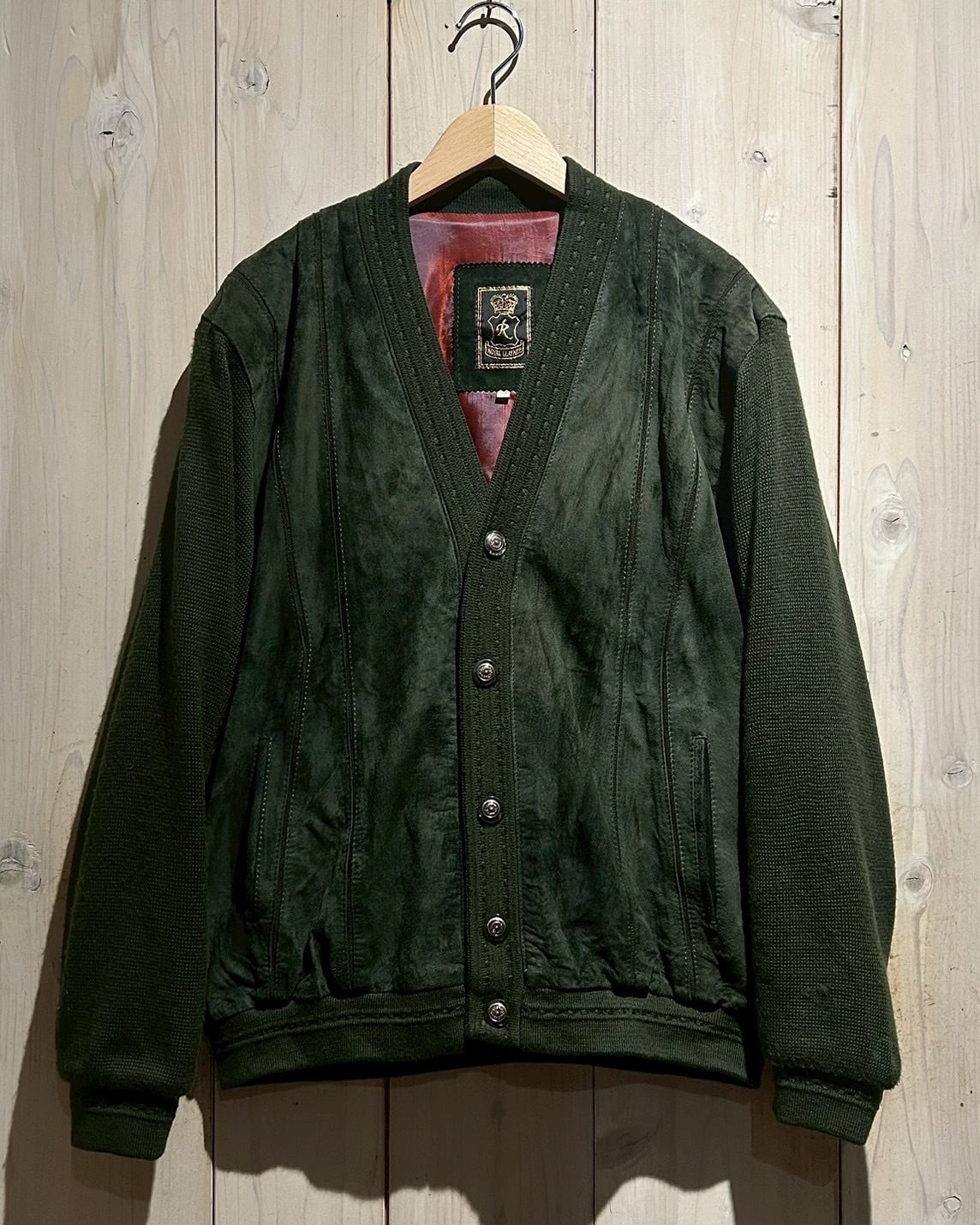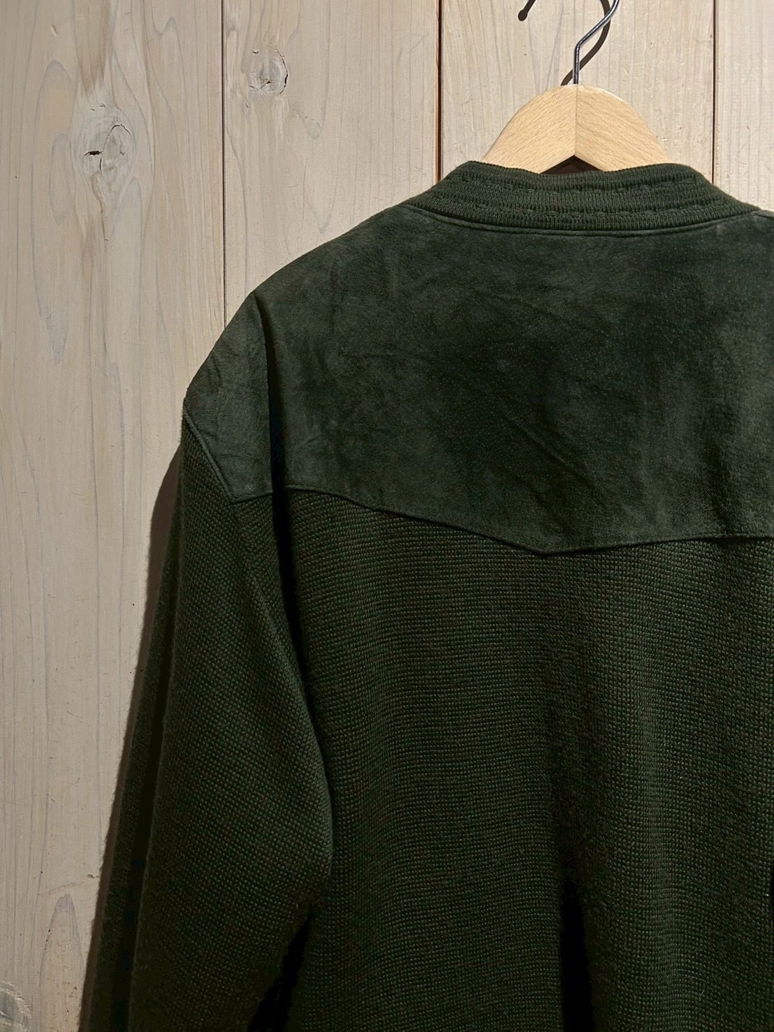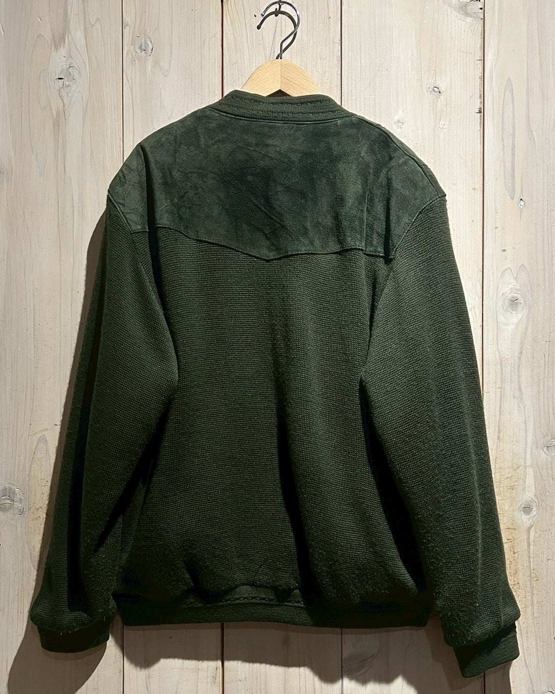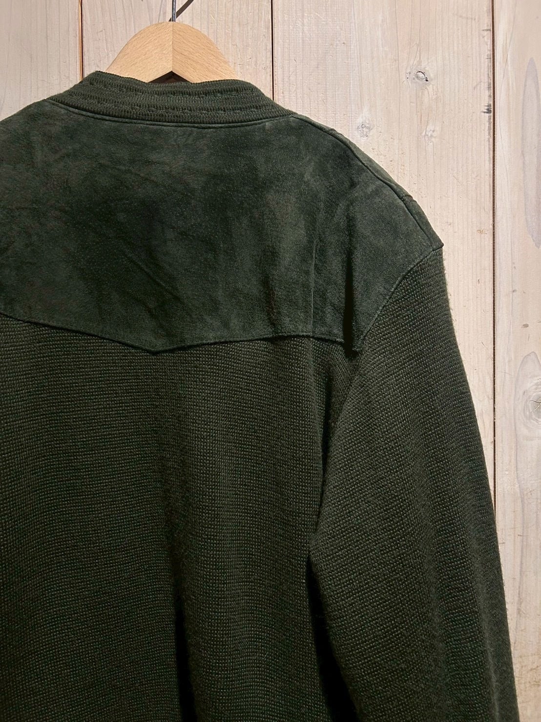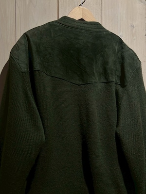 深みのあるグリーンカラーをベースに、フロントへスエードを大胆に切り替えた80'sユーロヴィンテージのカーディガンジャケット。