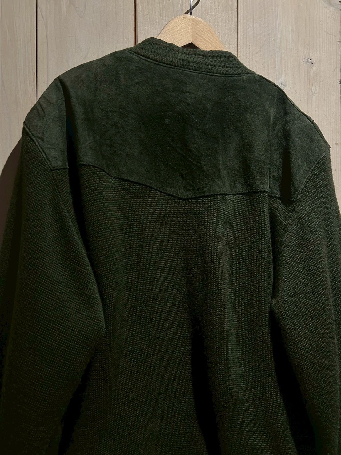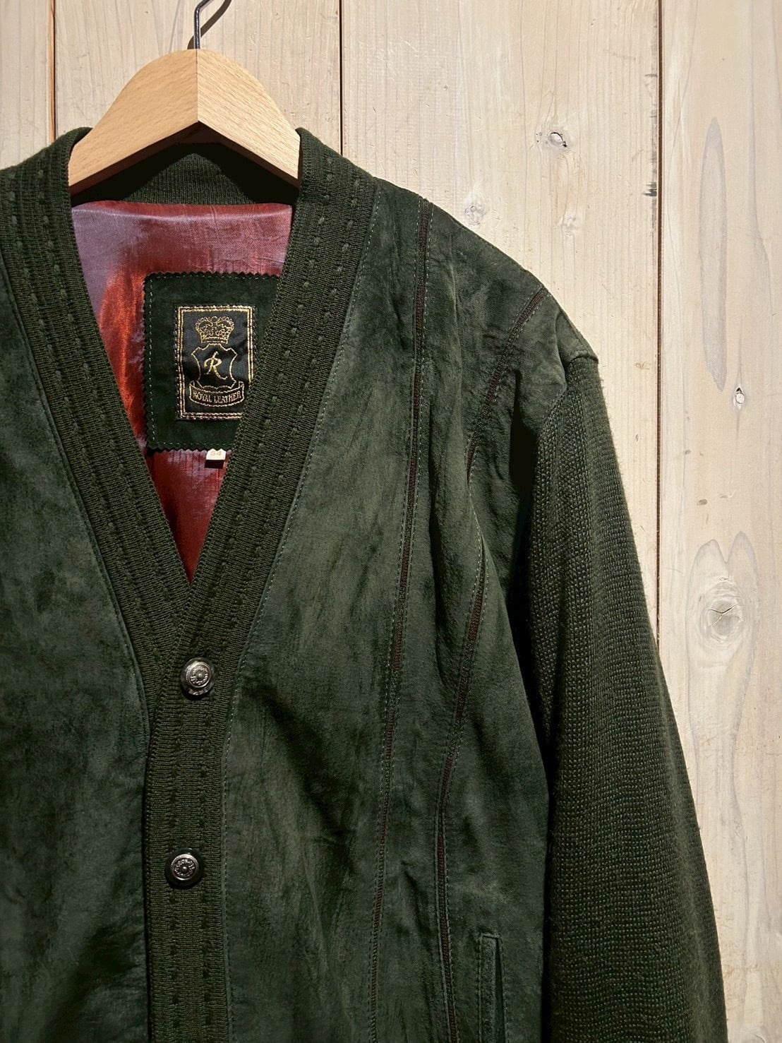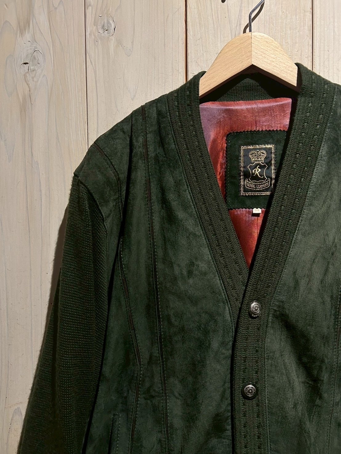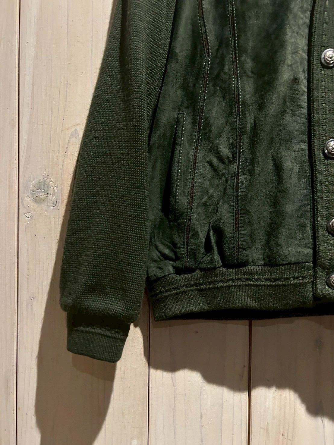 深みのあるグリーンカラーをベースに、フロントへスエードを大胆に切り替えた80'sユーロヴィンテージのカーディガンジャケット。