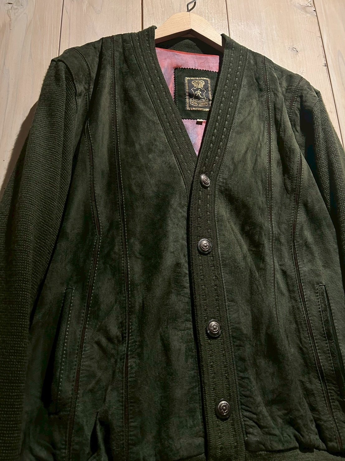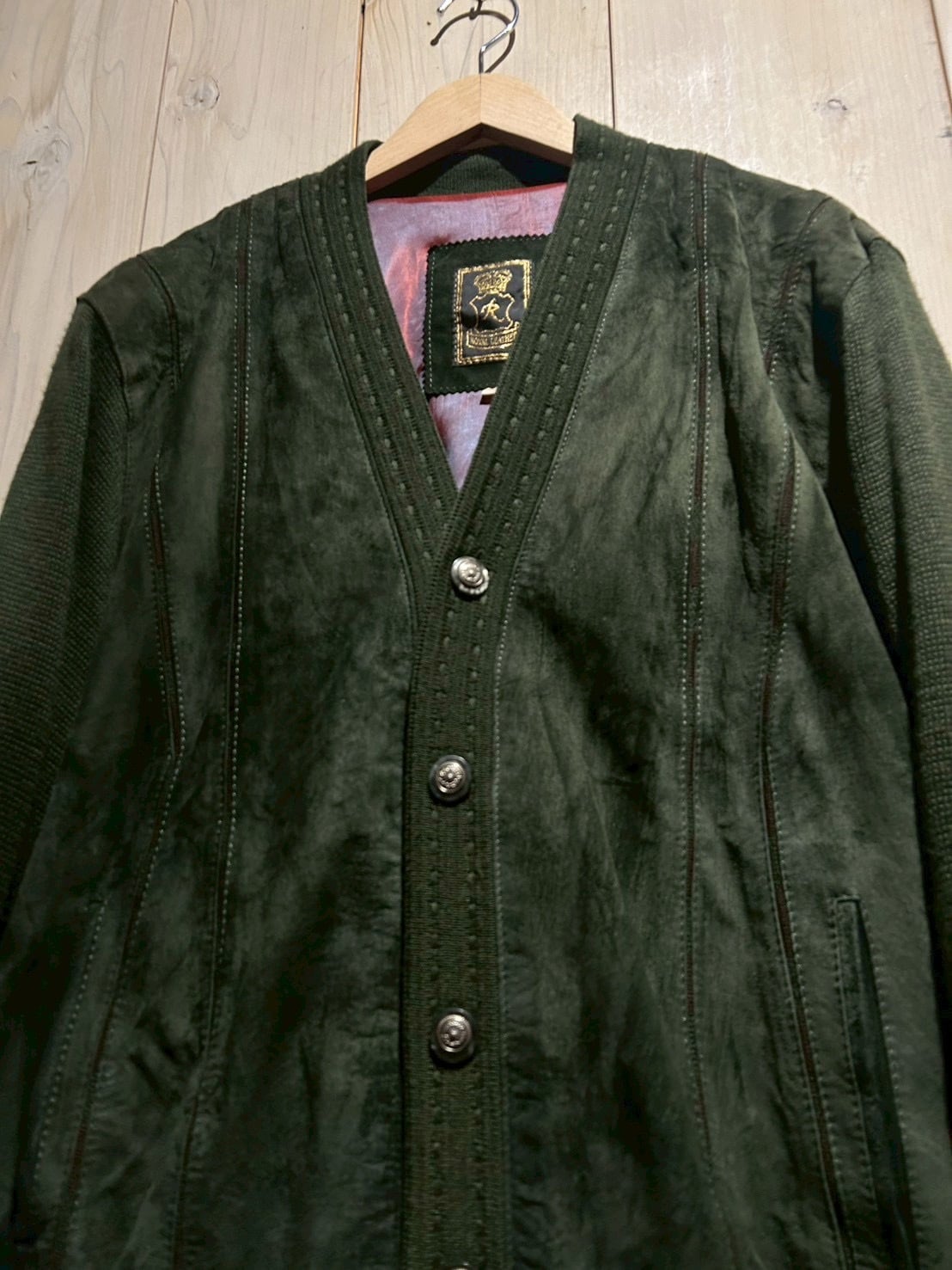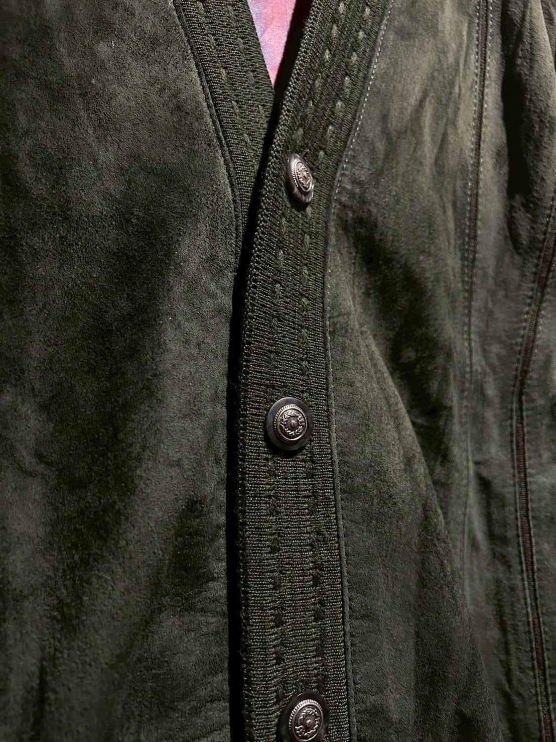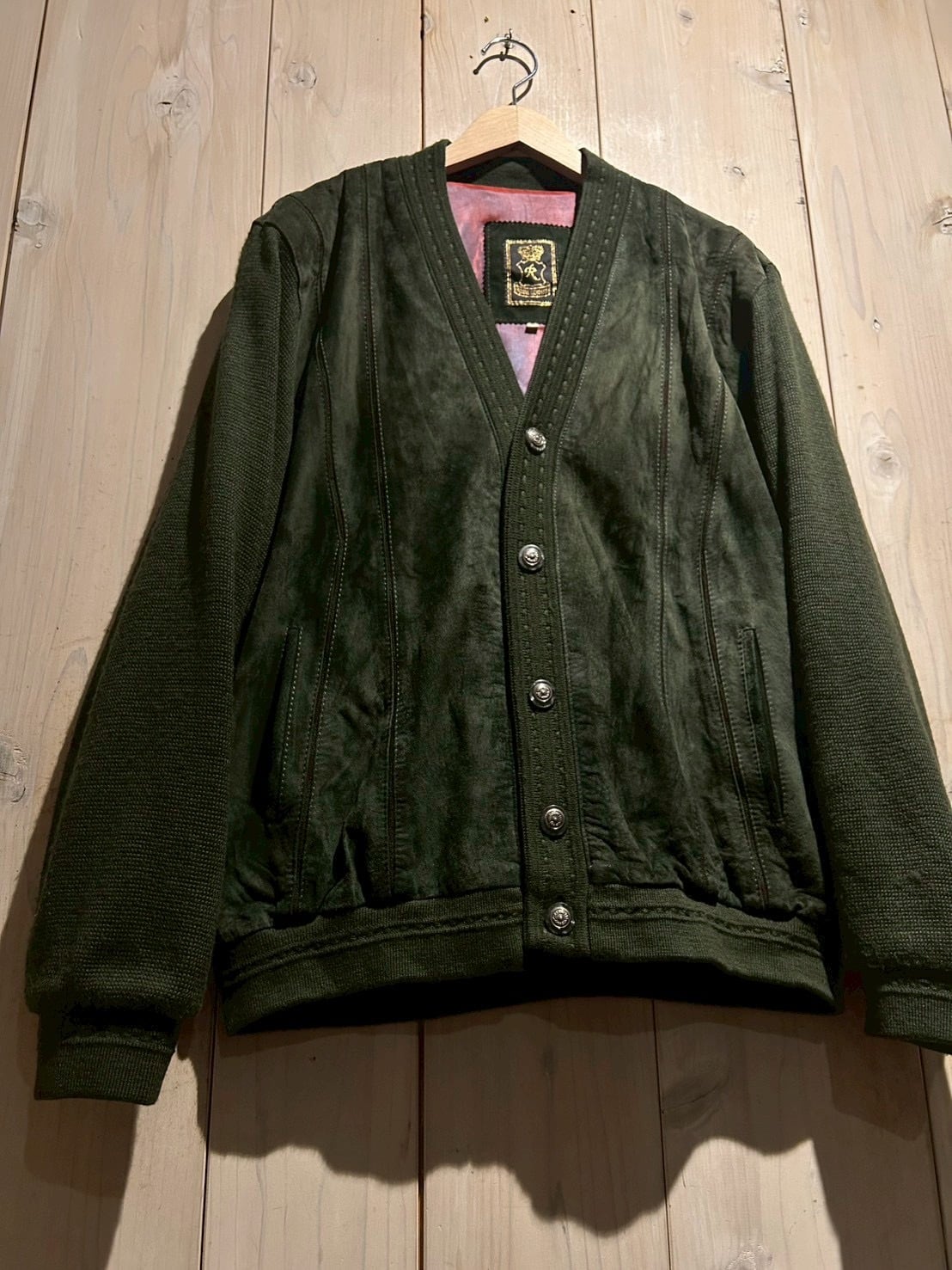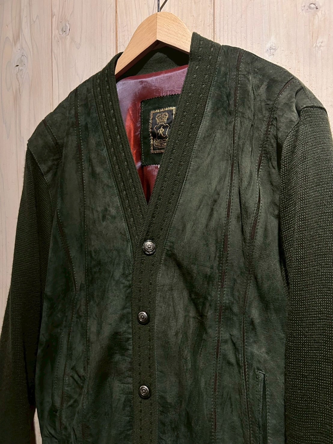 深みのあるグリーンカラーをベースに、フロントへスエードを大胆に切り替えた80'sユーロヴィンテージのカーディガンジャケット。