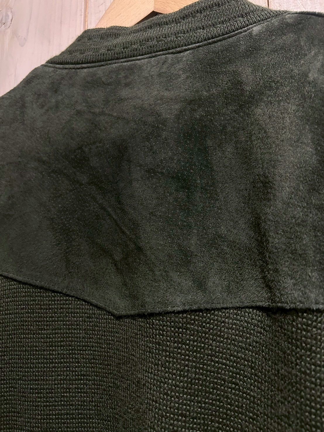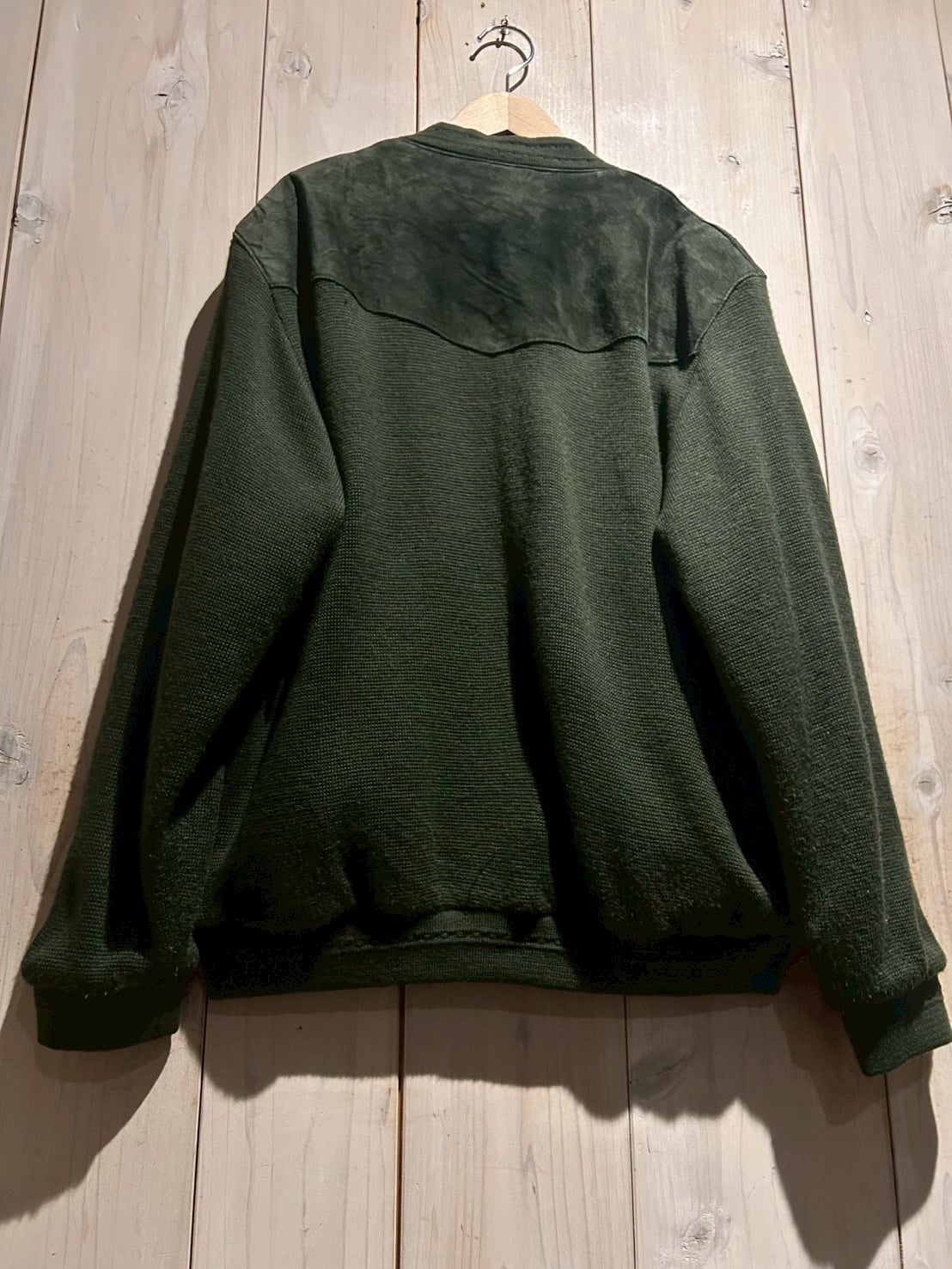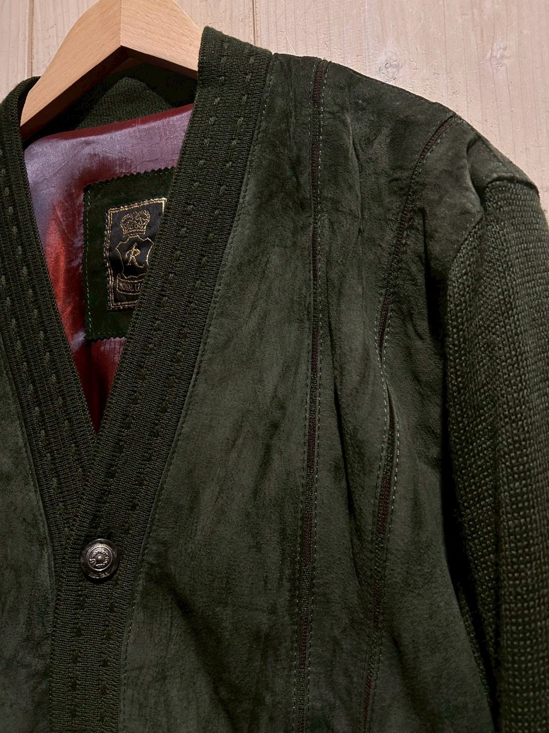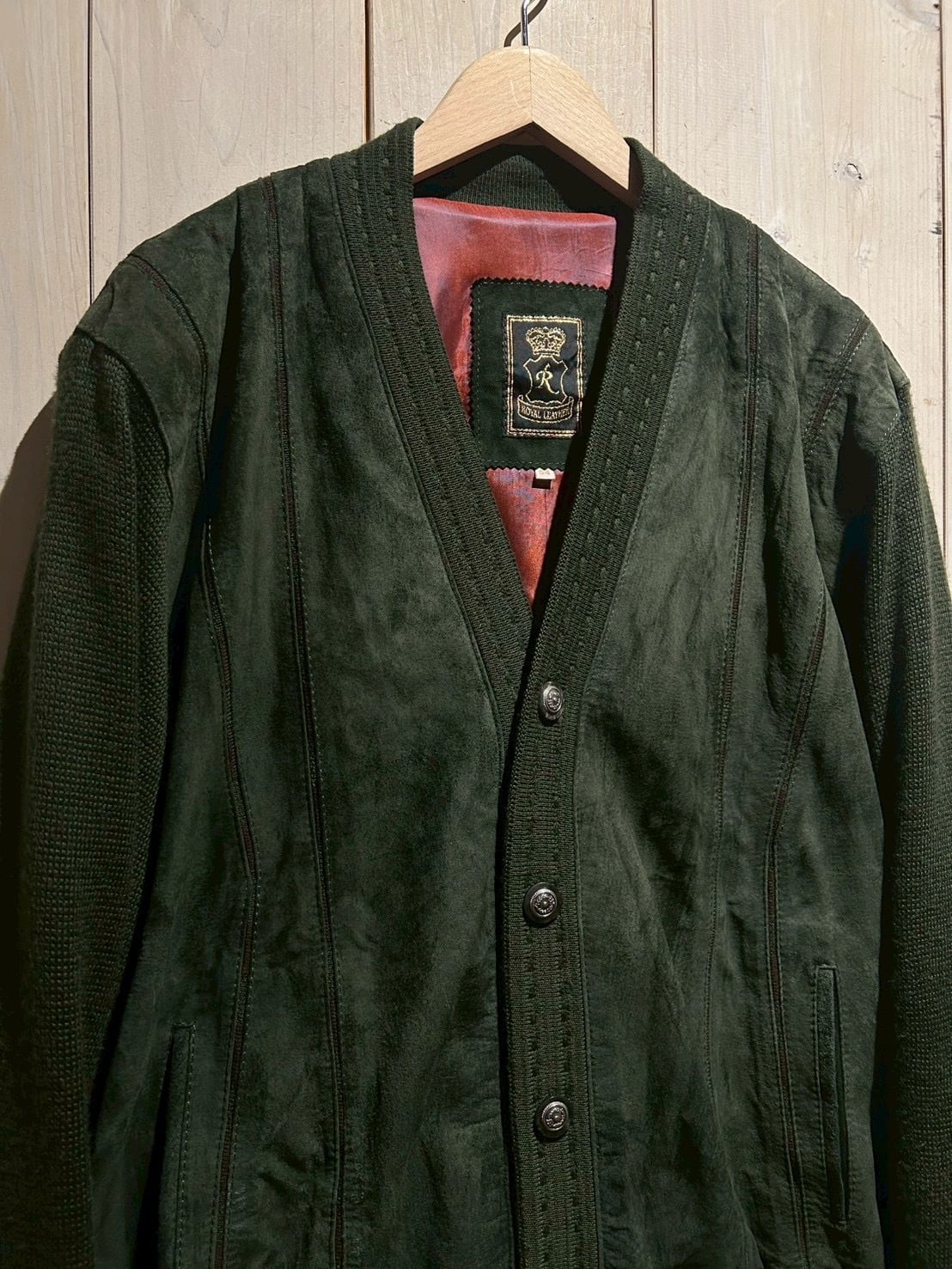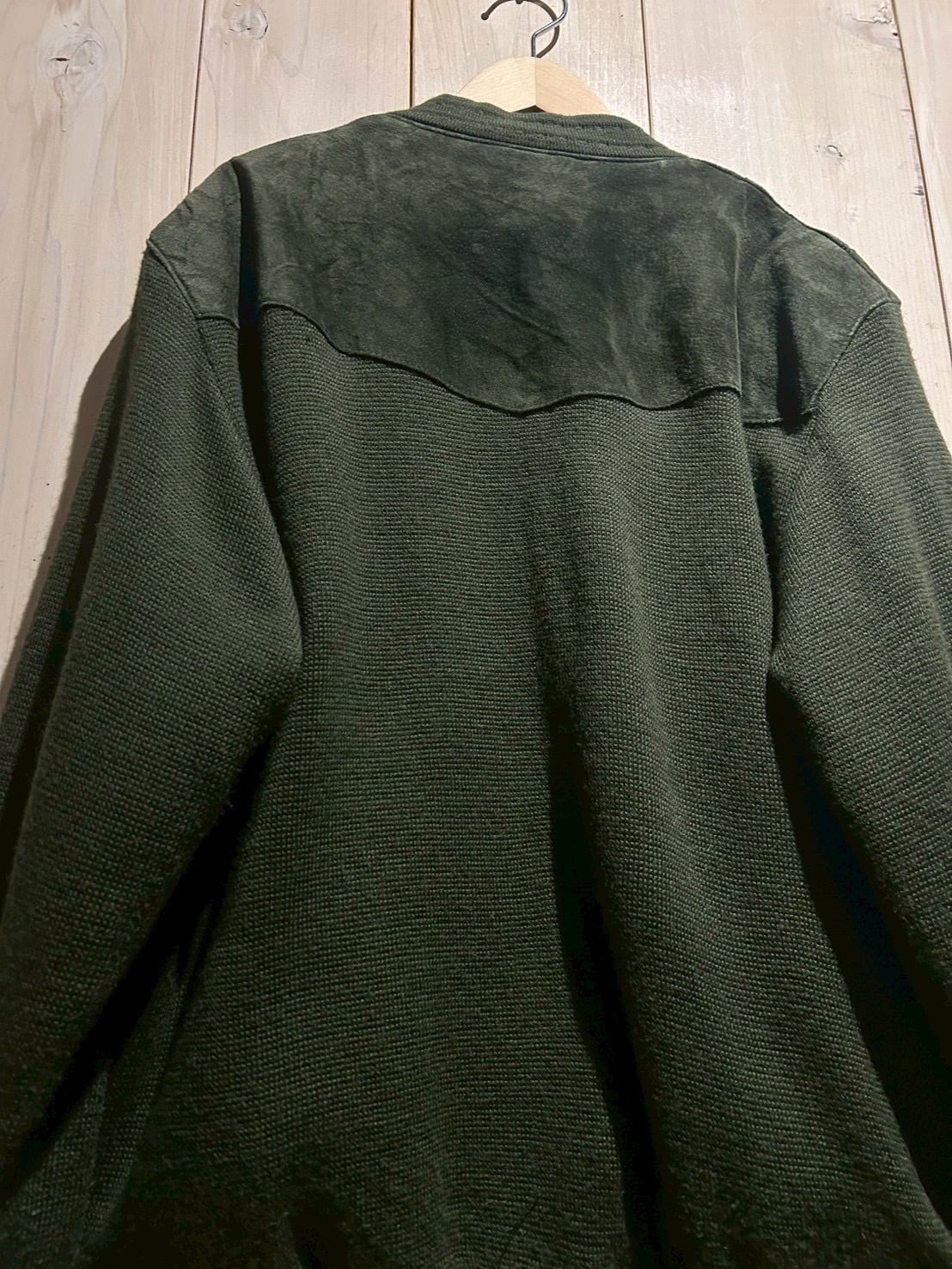 深みのあるグリーンカラーをベースに、フロントへスエードを大胆に切り替えた80'sユーロヴィンテージのカーディガンジャケット。