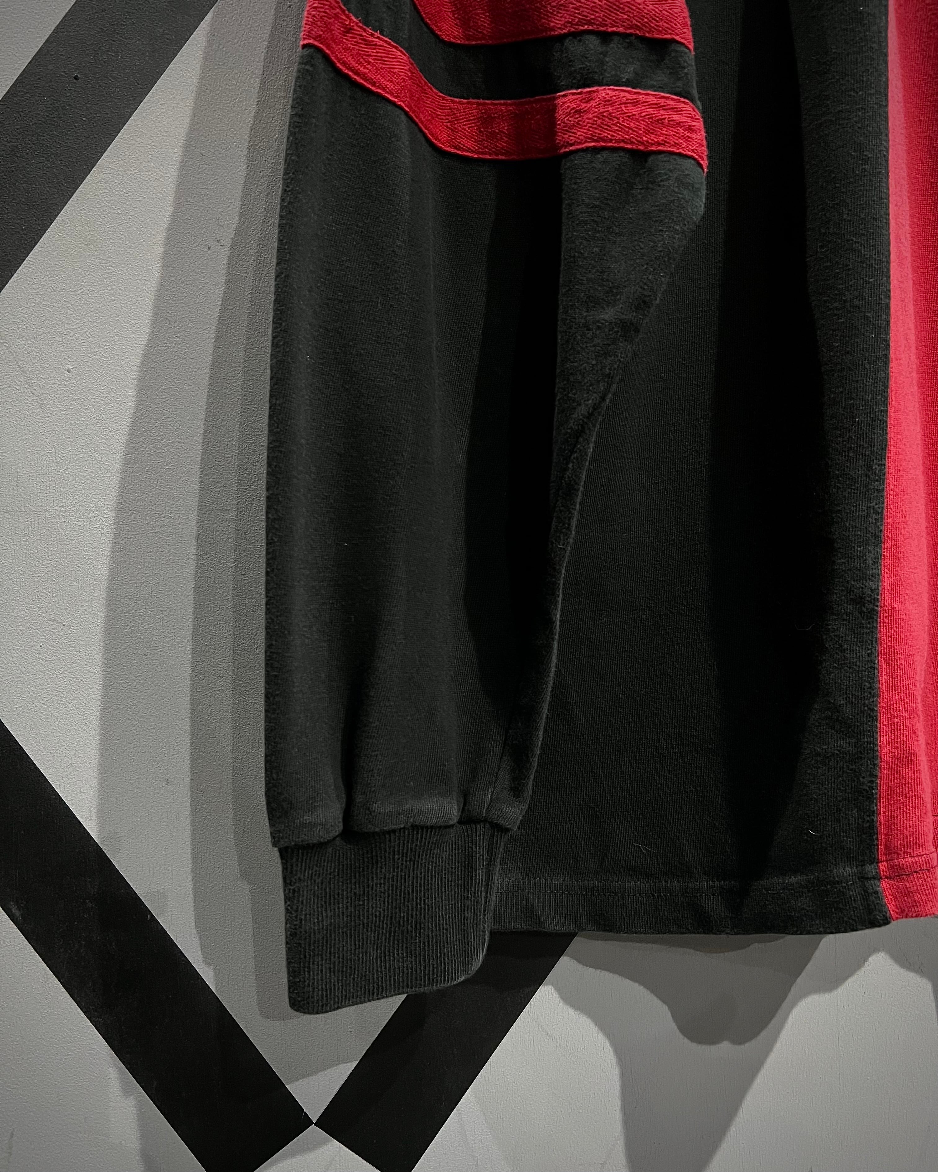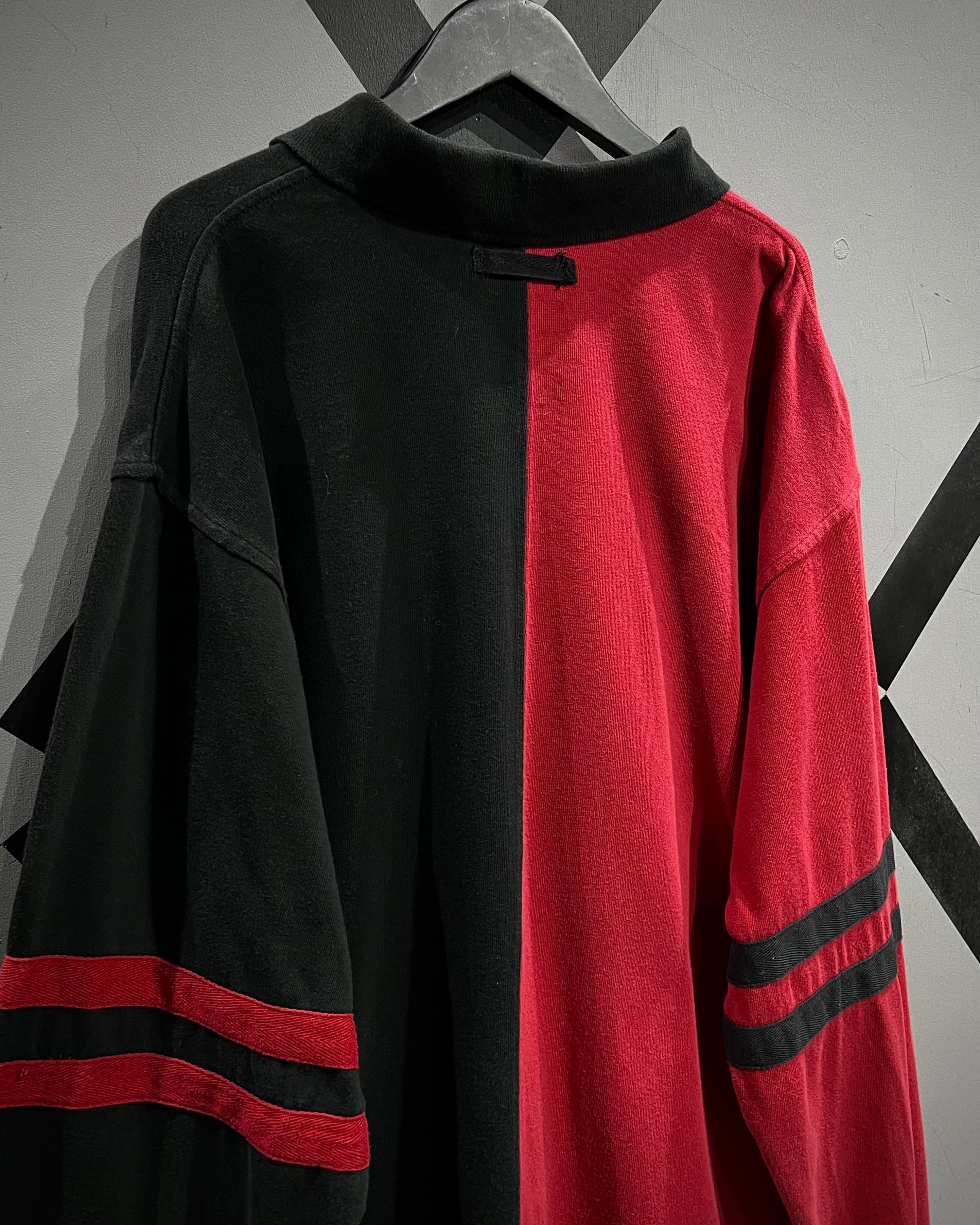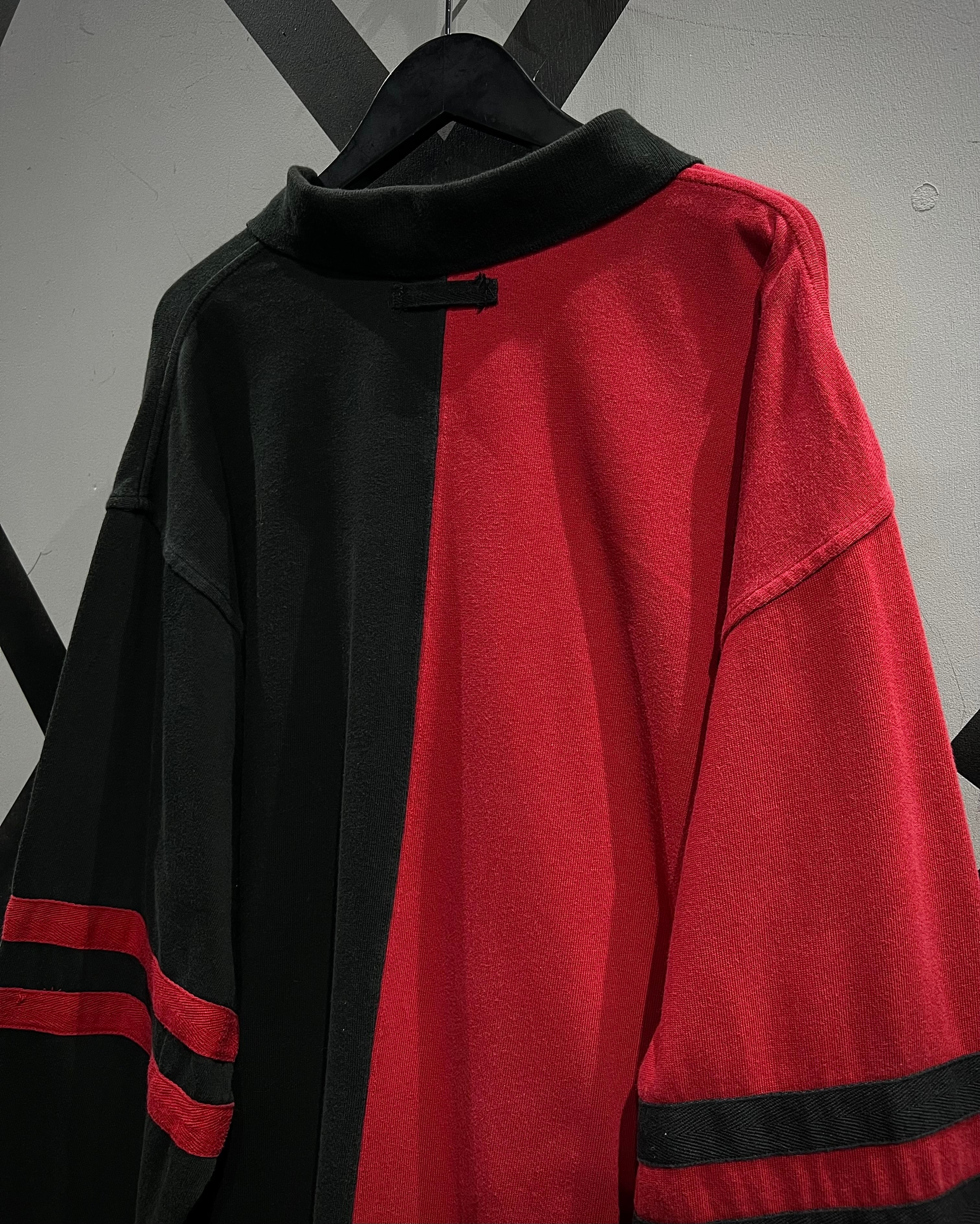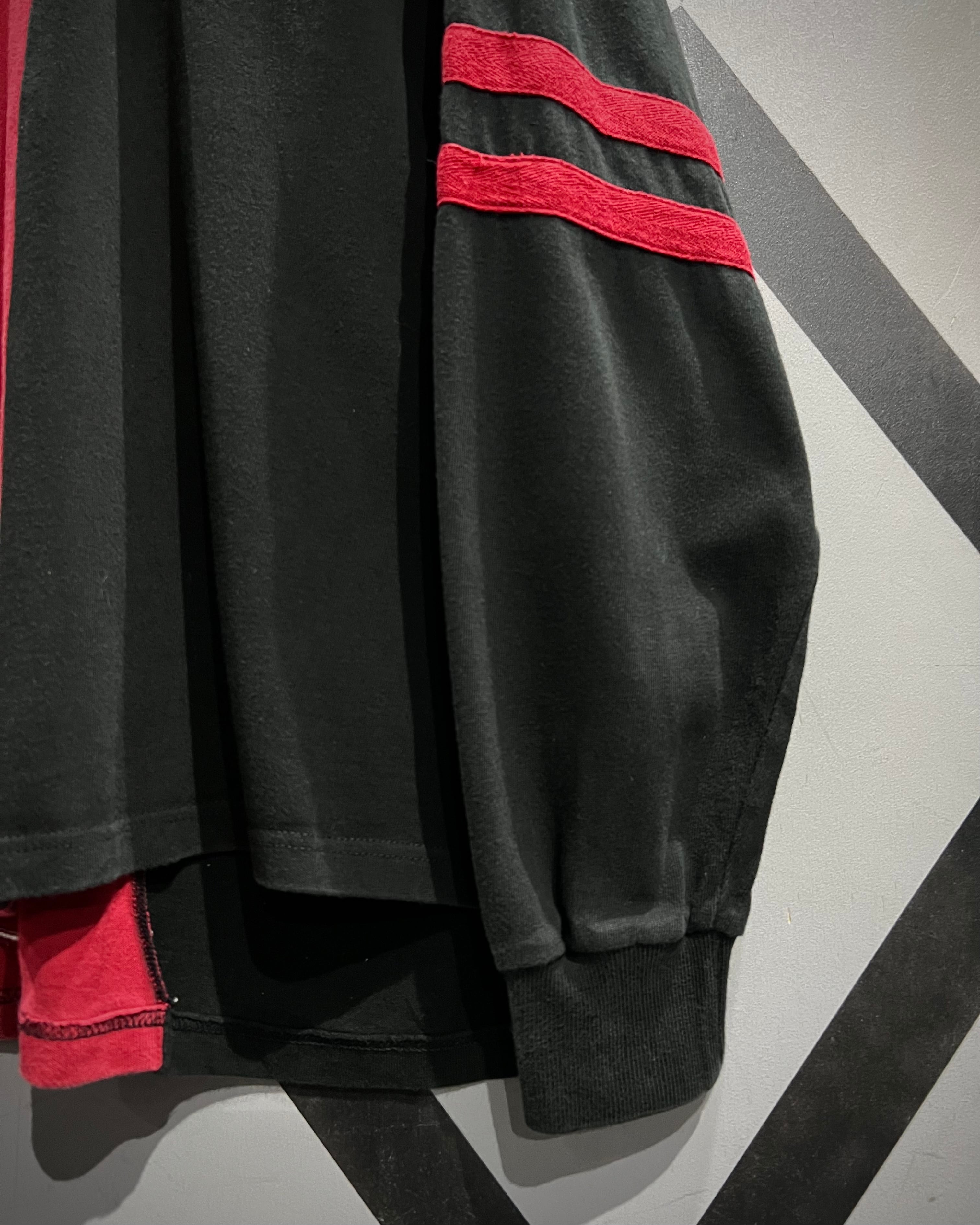 センターで大胆に切り替えた赤×黒の配色が目を惹く1着。コットンベースの柔らかなボディに、カラーコントラストでインパクトを持たせつつも、ブランドらしさがしっかりと落とし込まれた、カルチャーを感じられる希少なデザイン。