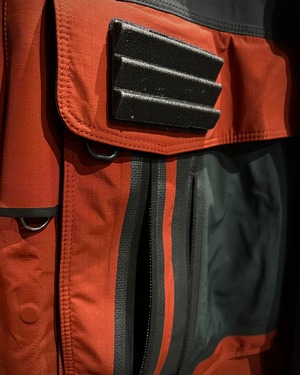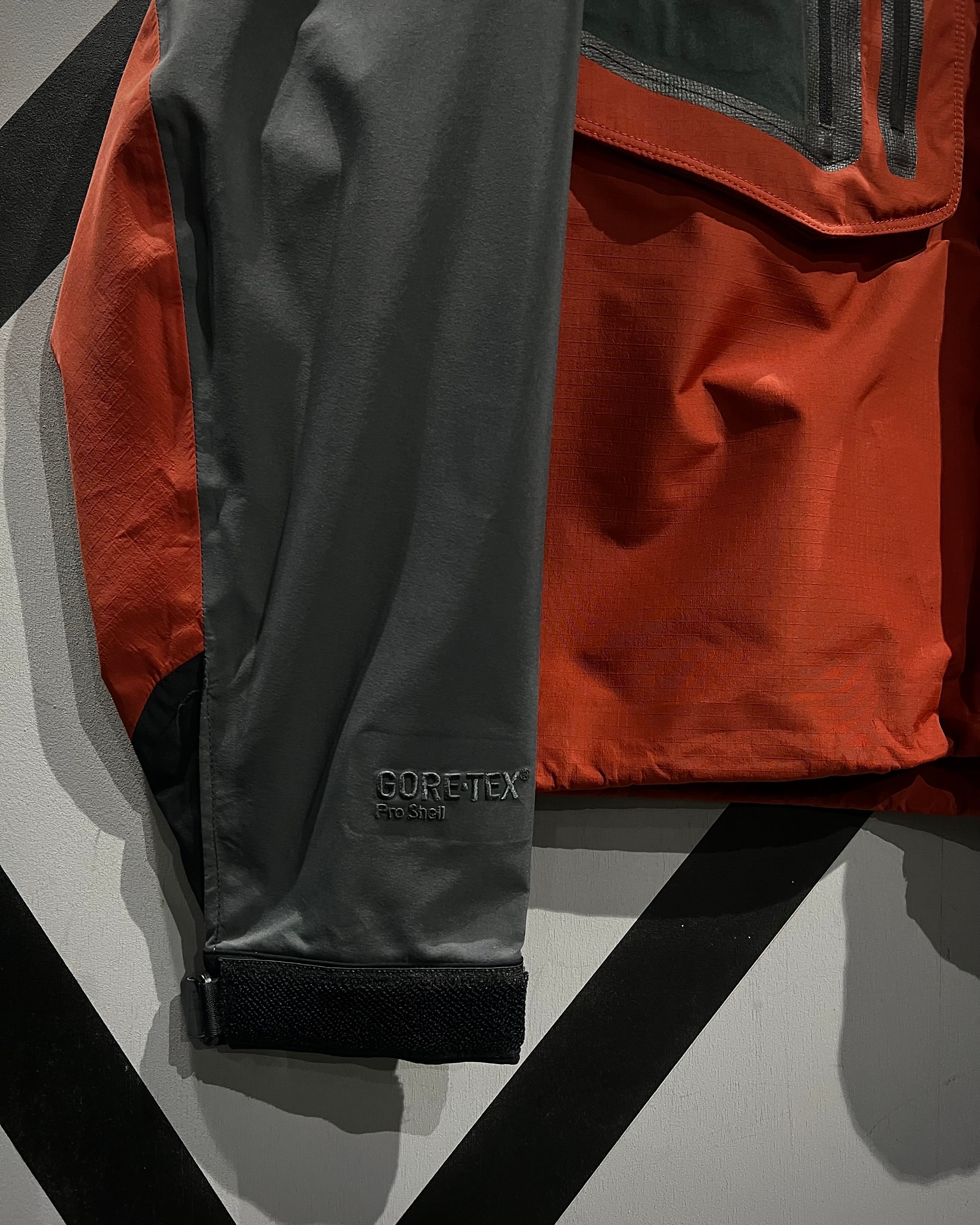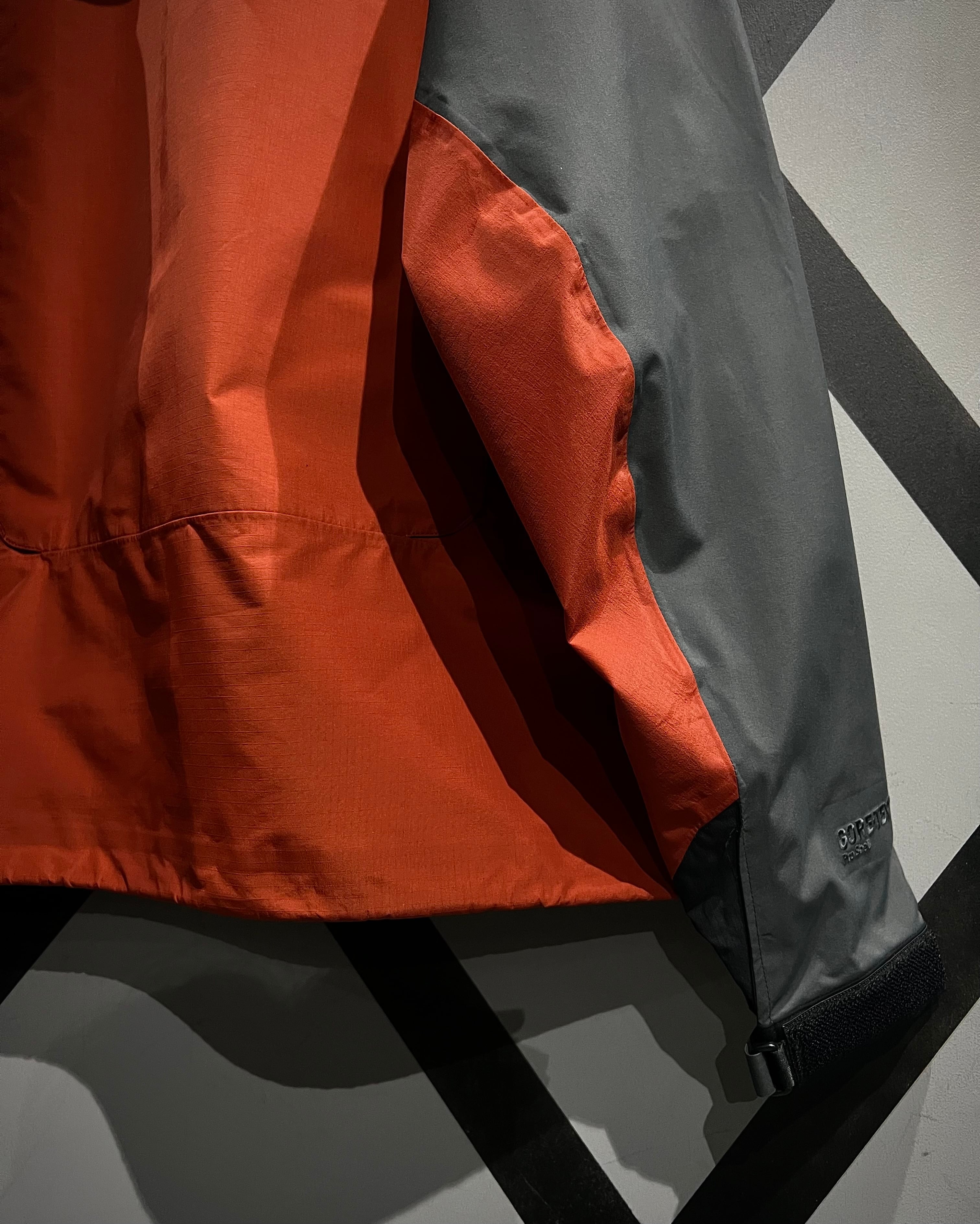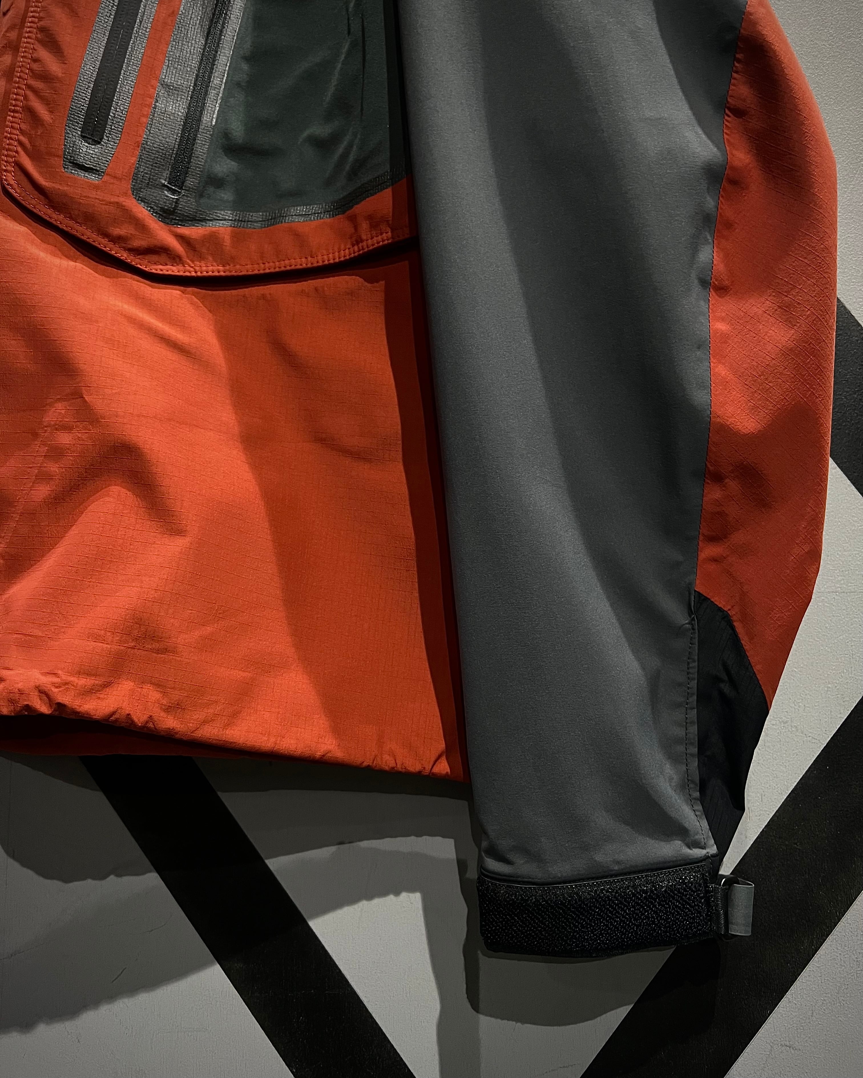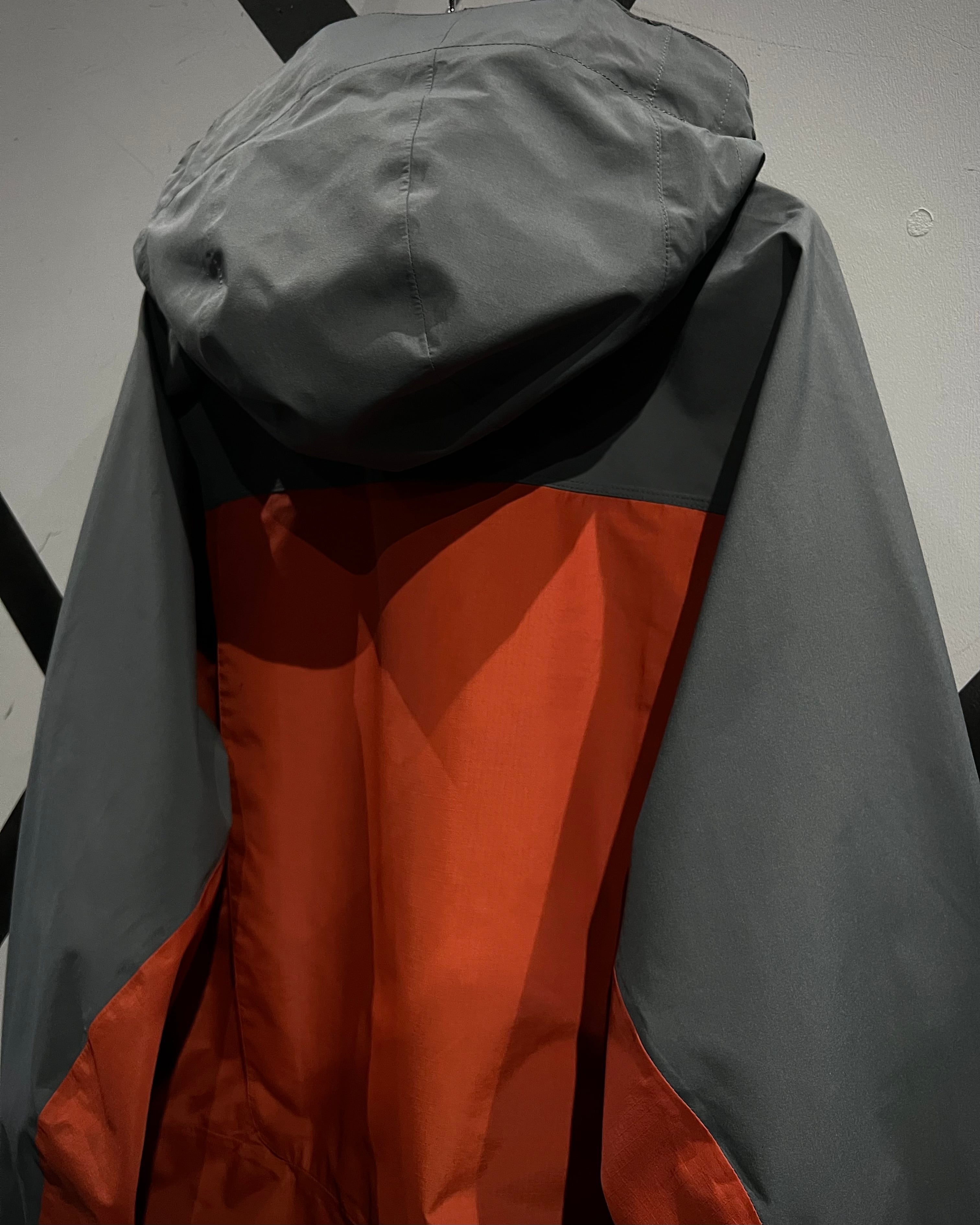 グレー×オレンジの切り替えによるコントラストの効いた配色に、GORE-TEX Pro Shellを搭載したハイスペックなシェル。マットな質感と張りのあるファブリックが、アウトドアギアらしいタフと都会的なテック感を両立しています。