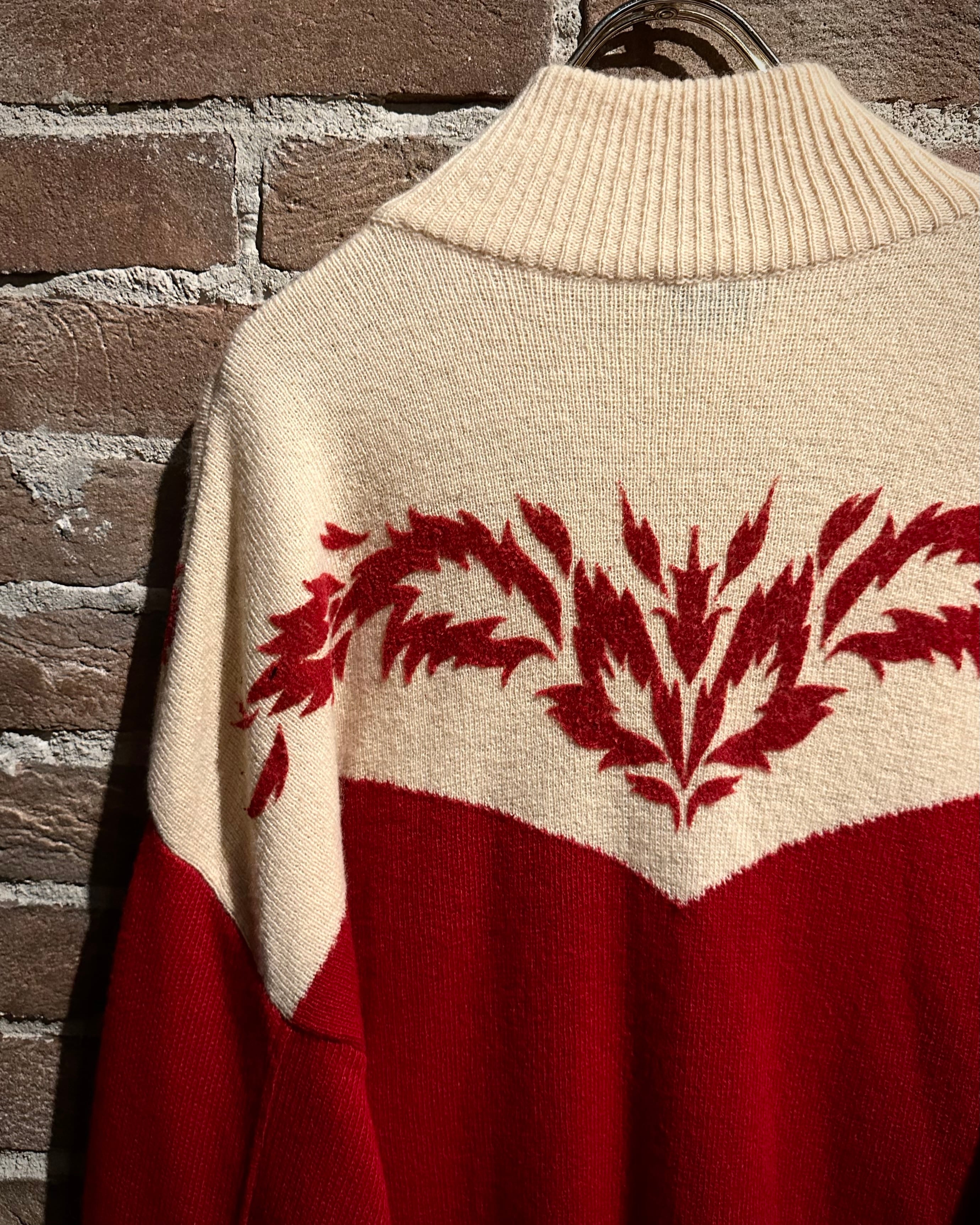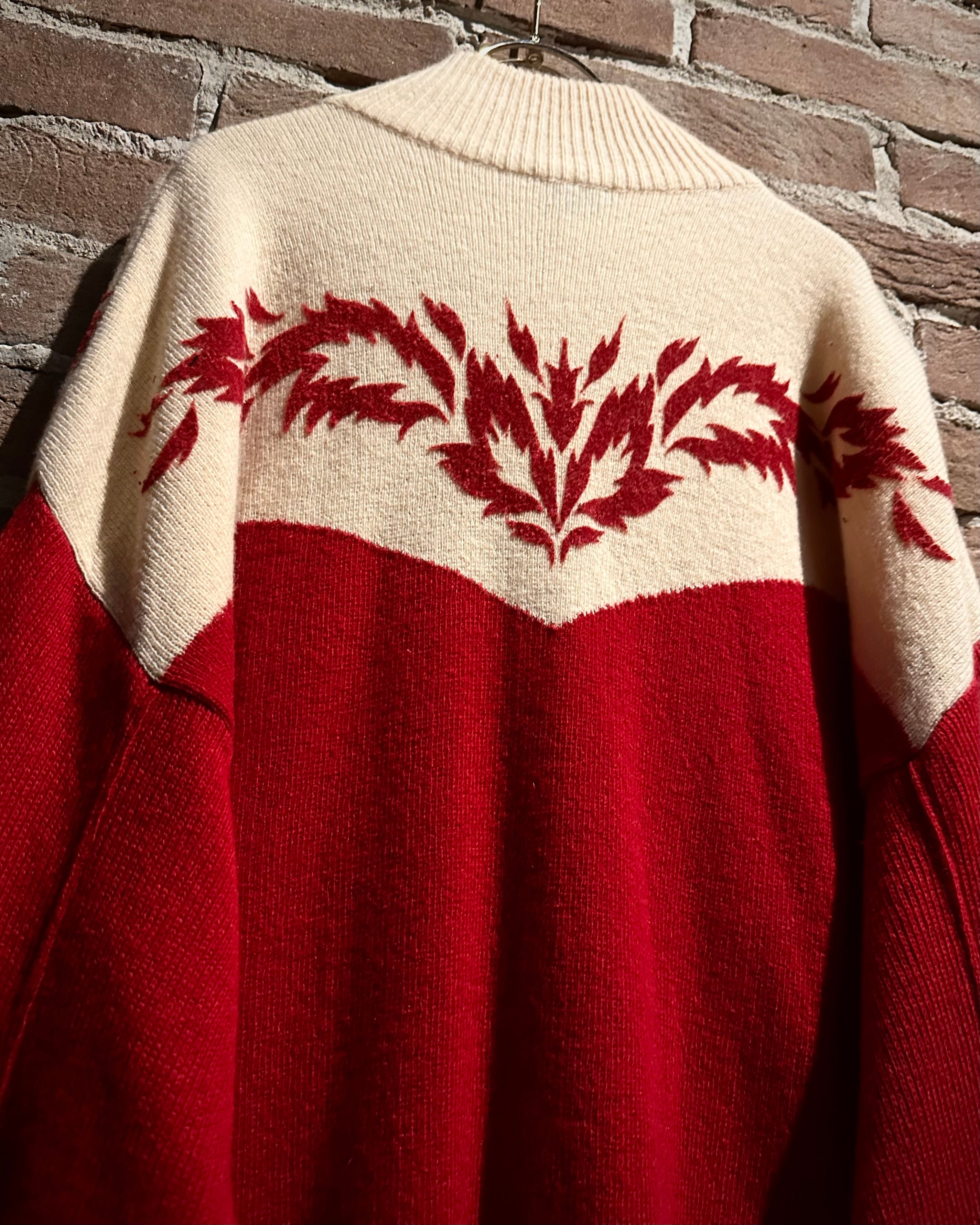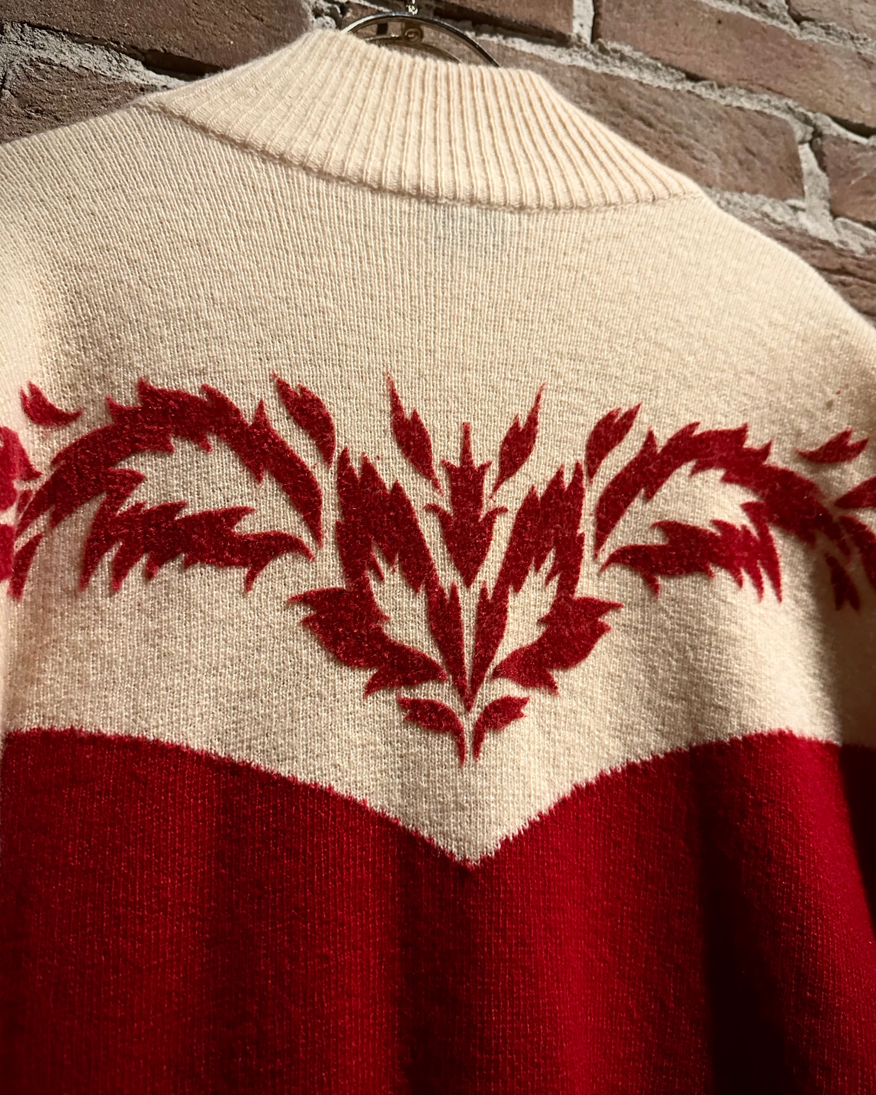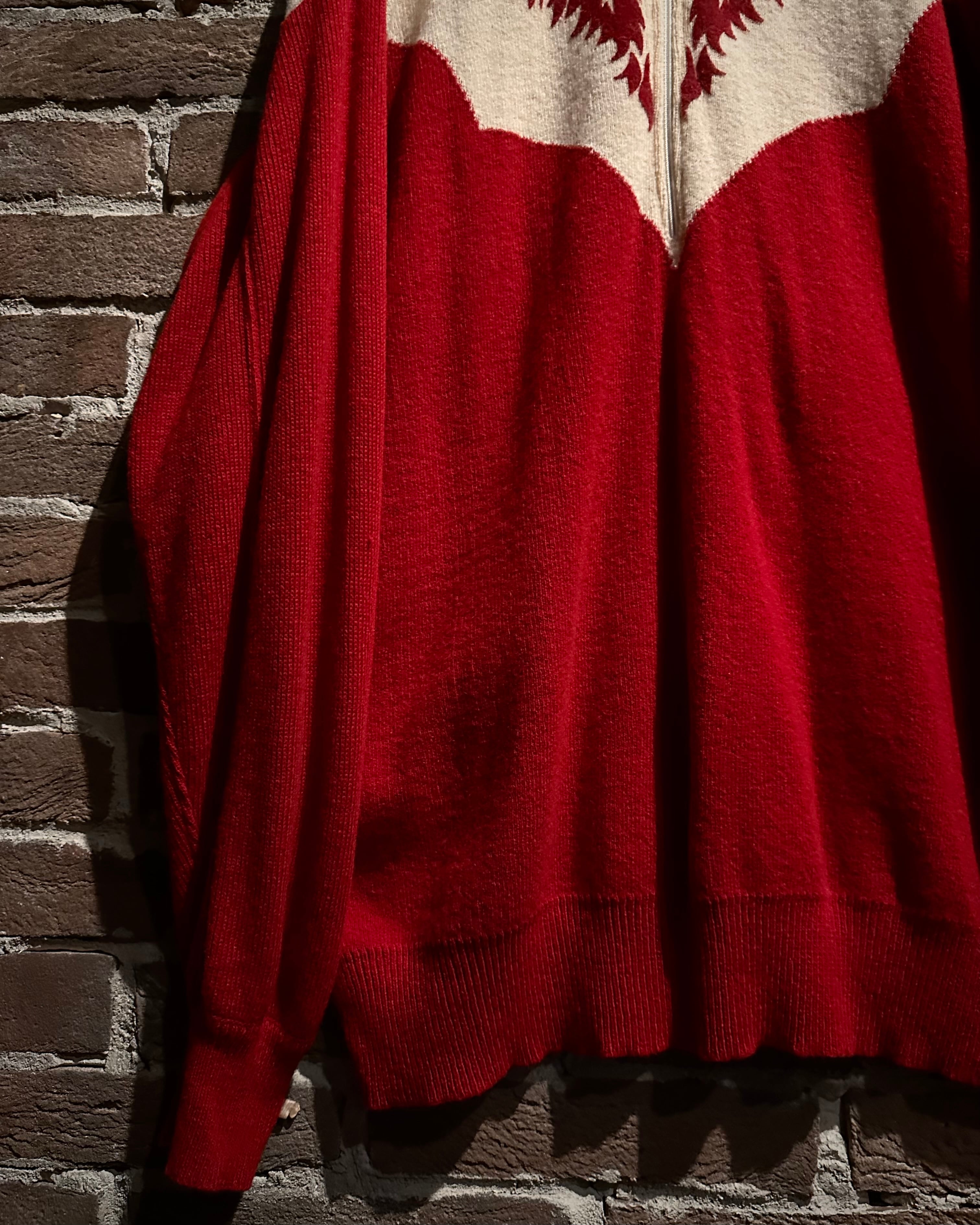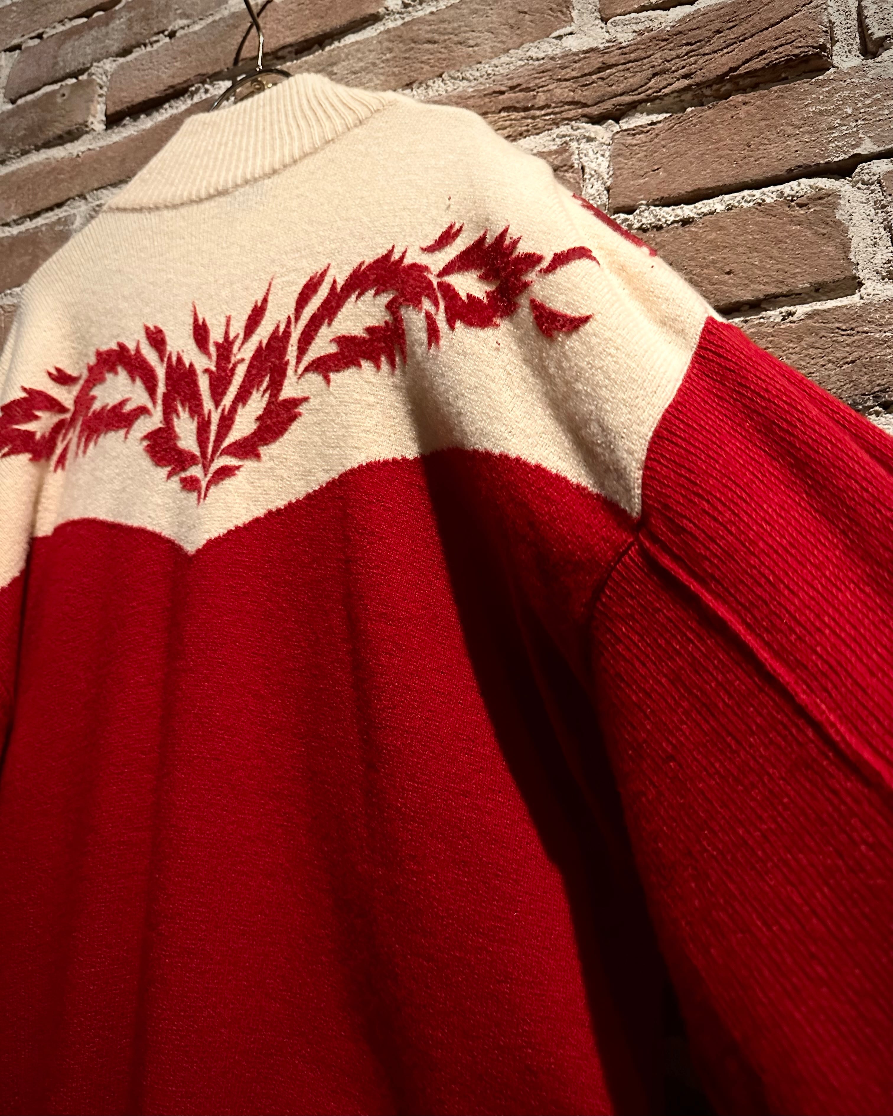 パキッとしたレッド×アイボリーの切り替えをウエスタンヨークで表現したボディに、フロッキープリントでウエスタン調のモチーフを載せたハーフジップニット。