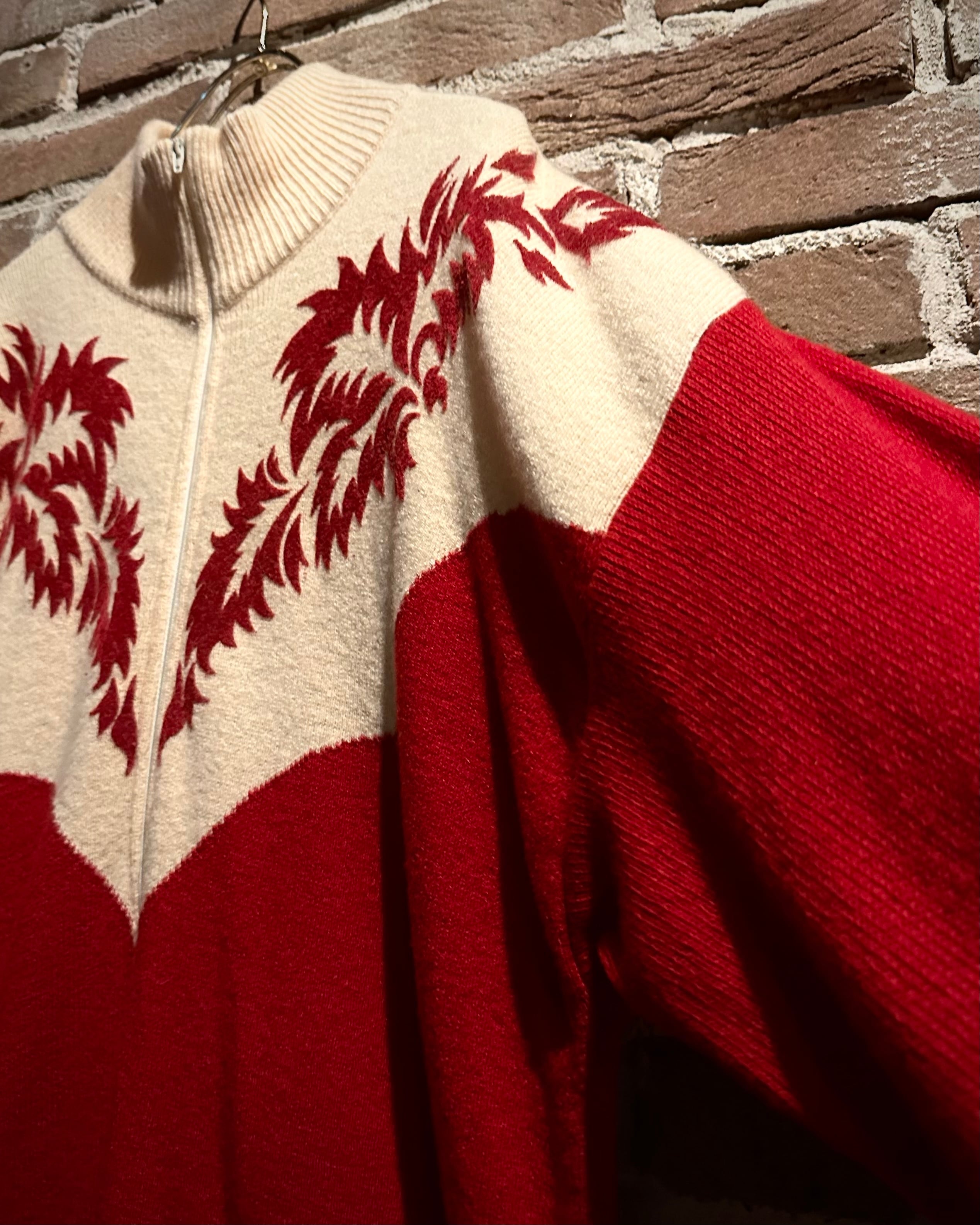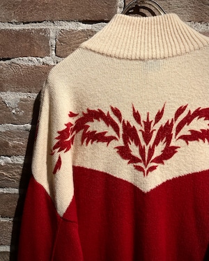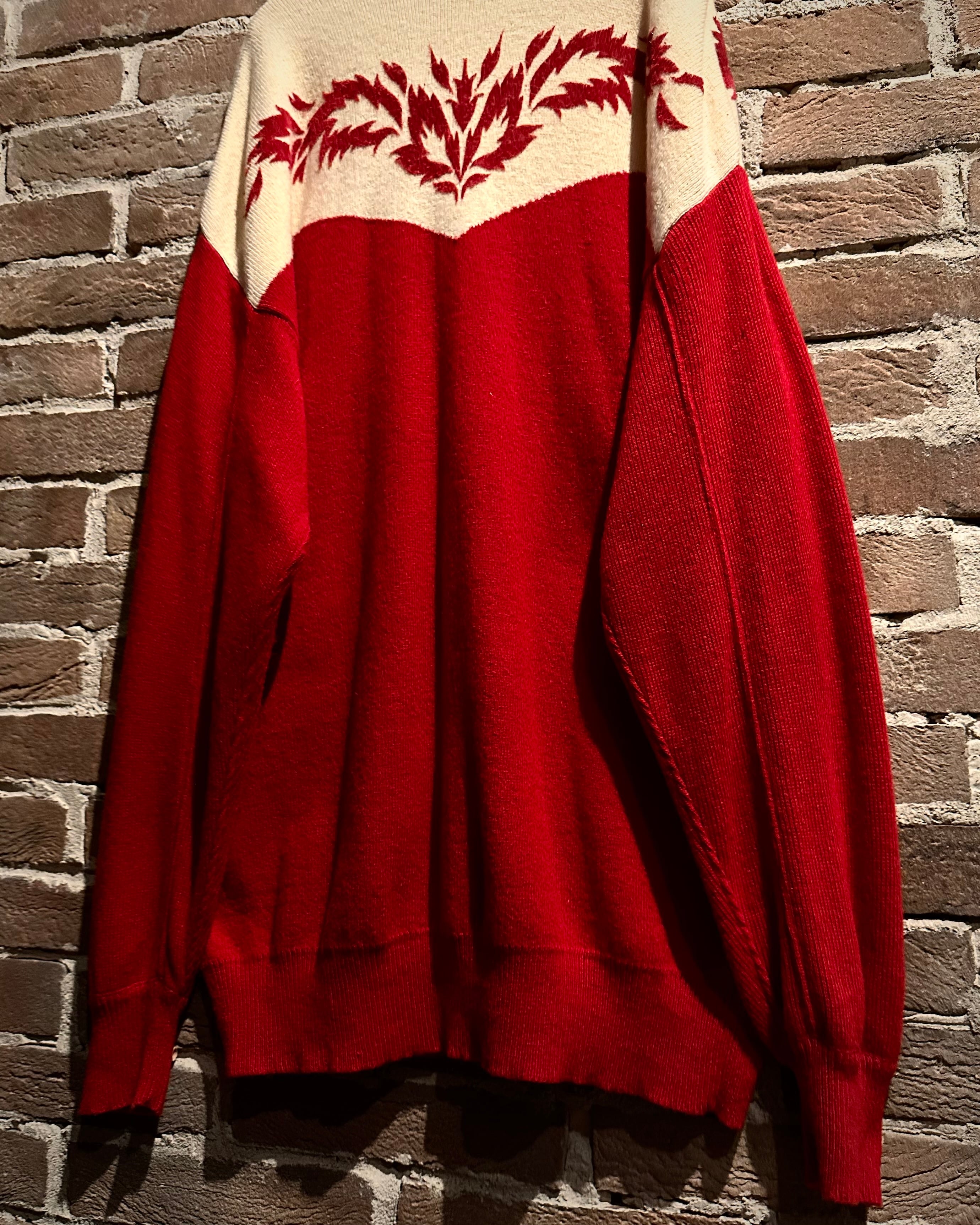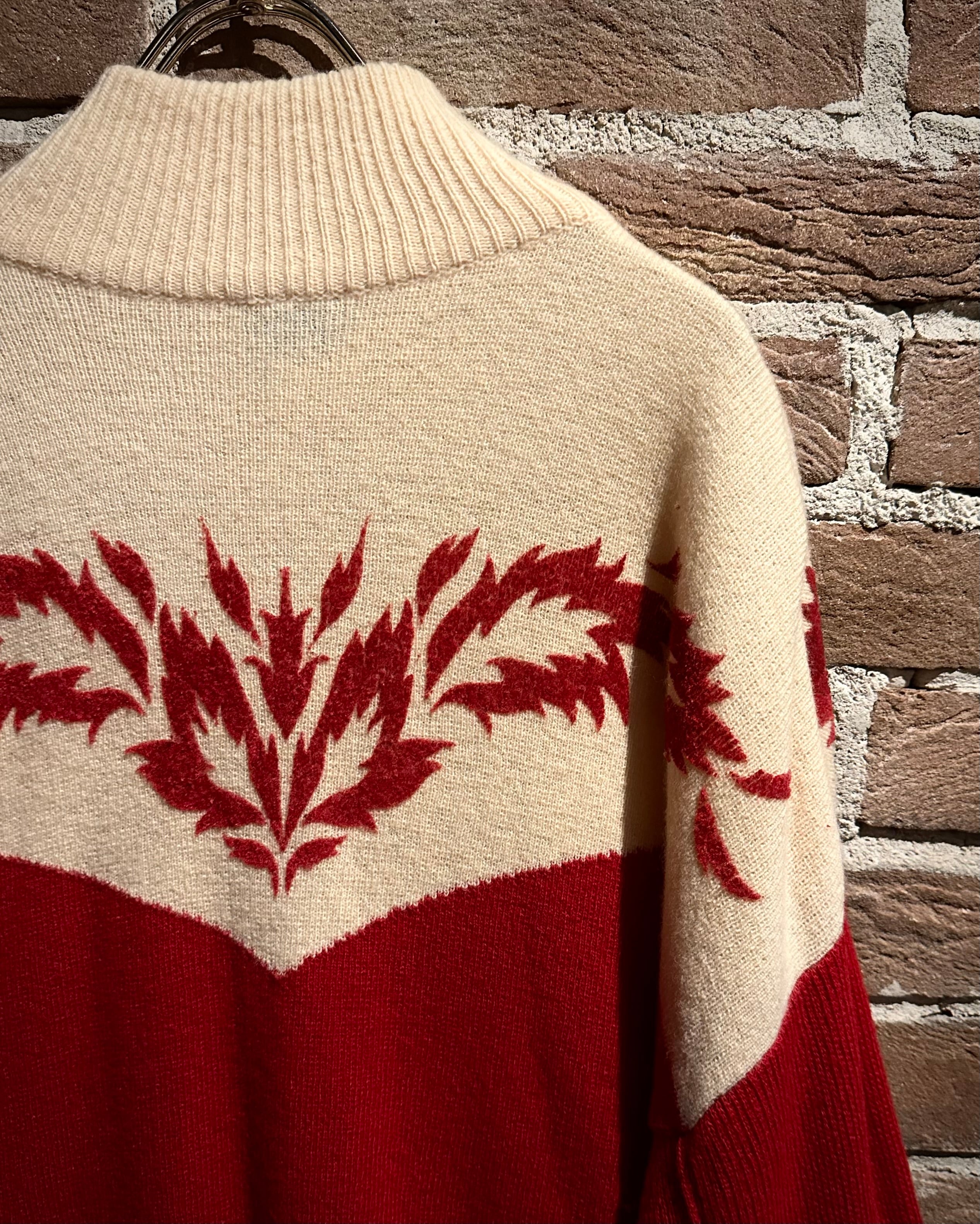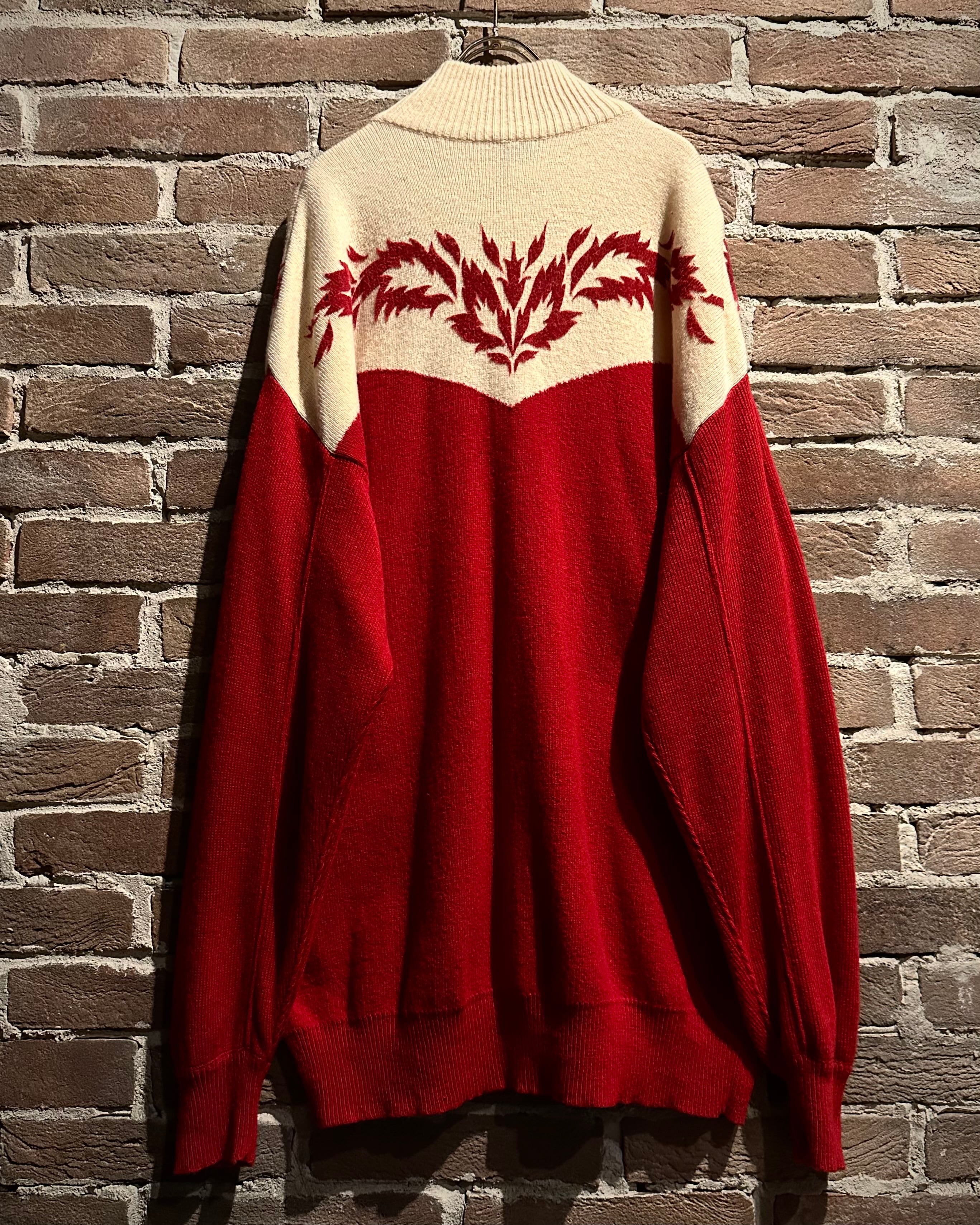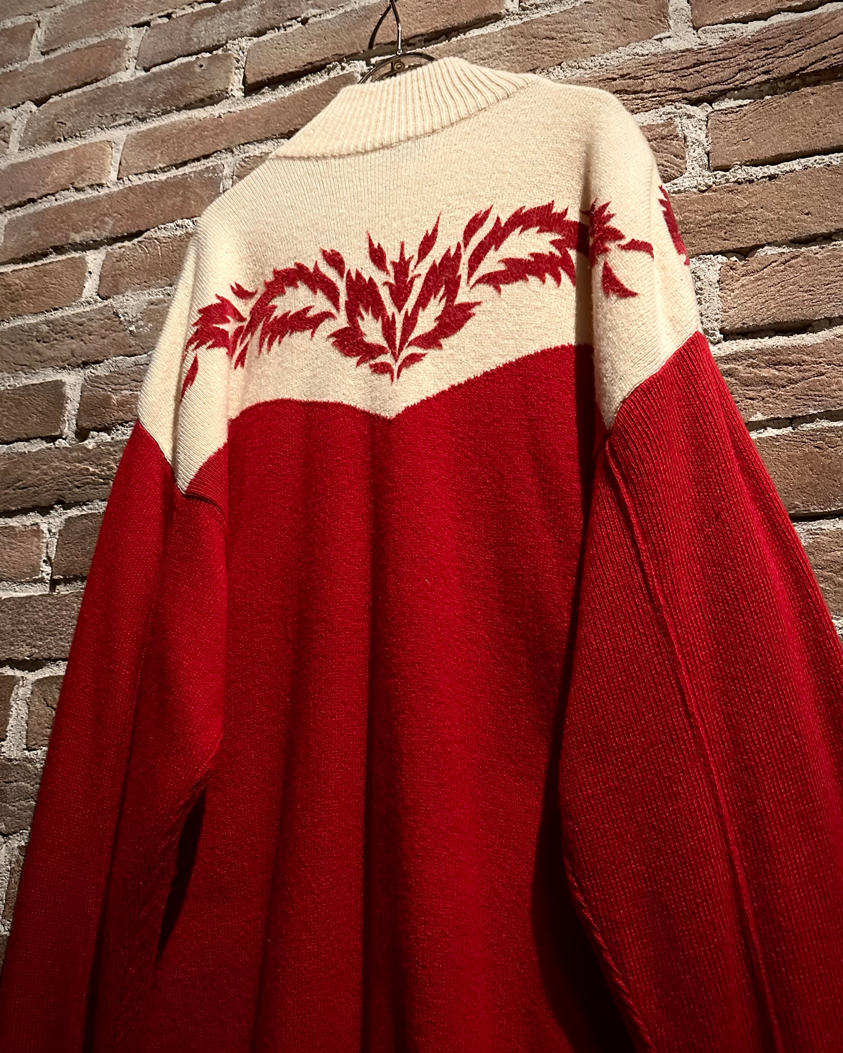 パキッとしたレッド×アイボリーの切り替えをウエスタンヨークで表現したボディに、フロッキープリントでウエスタン調のモチーフを載せたハーフジップニット。
