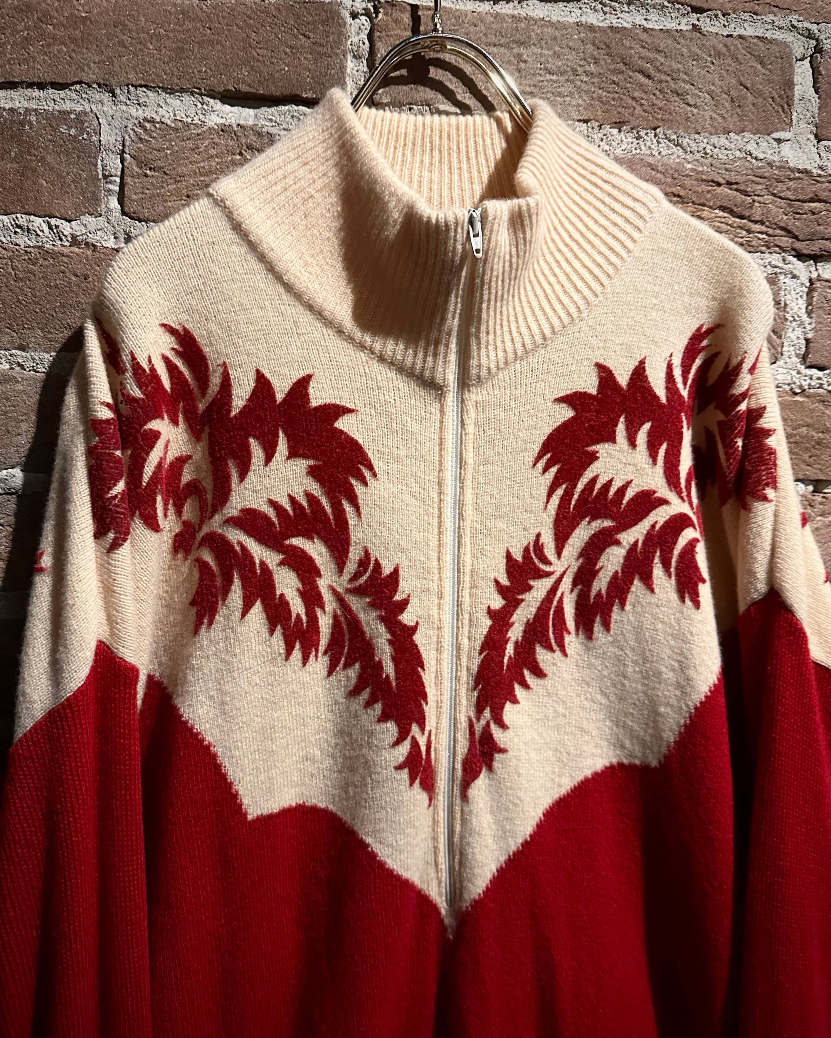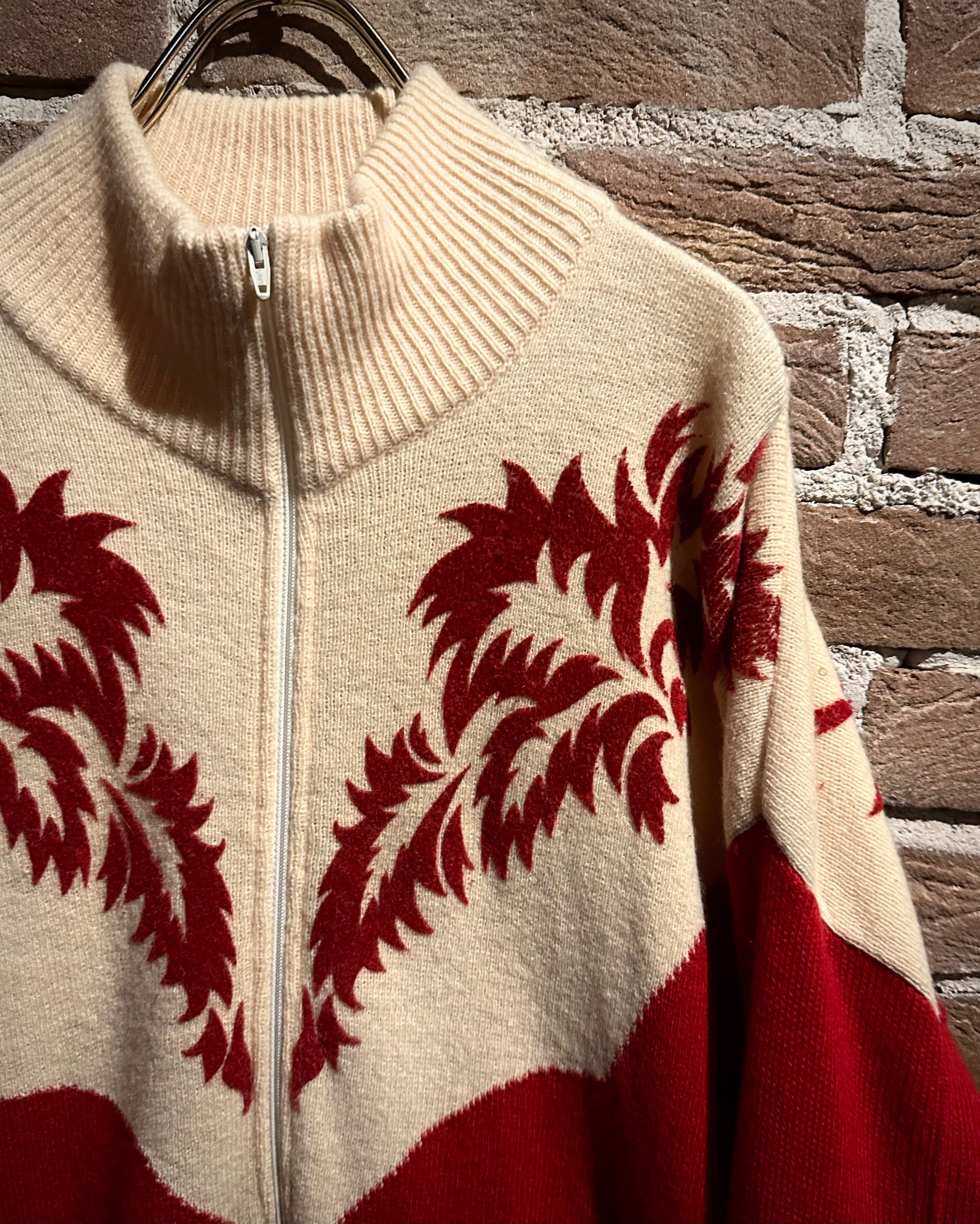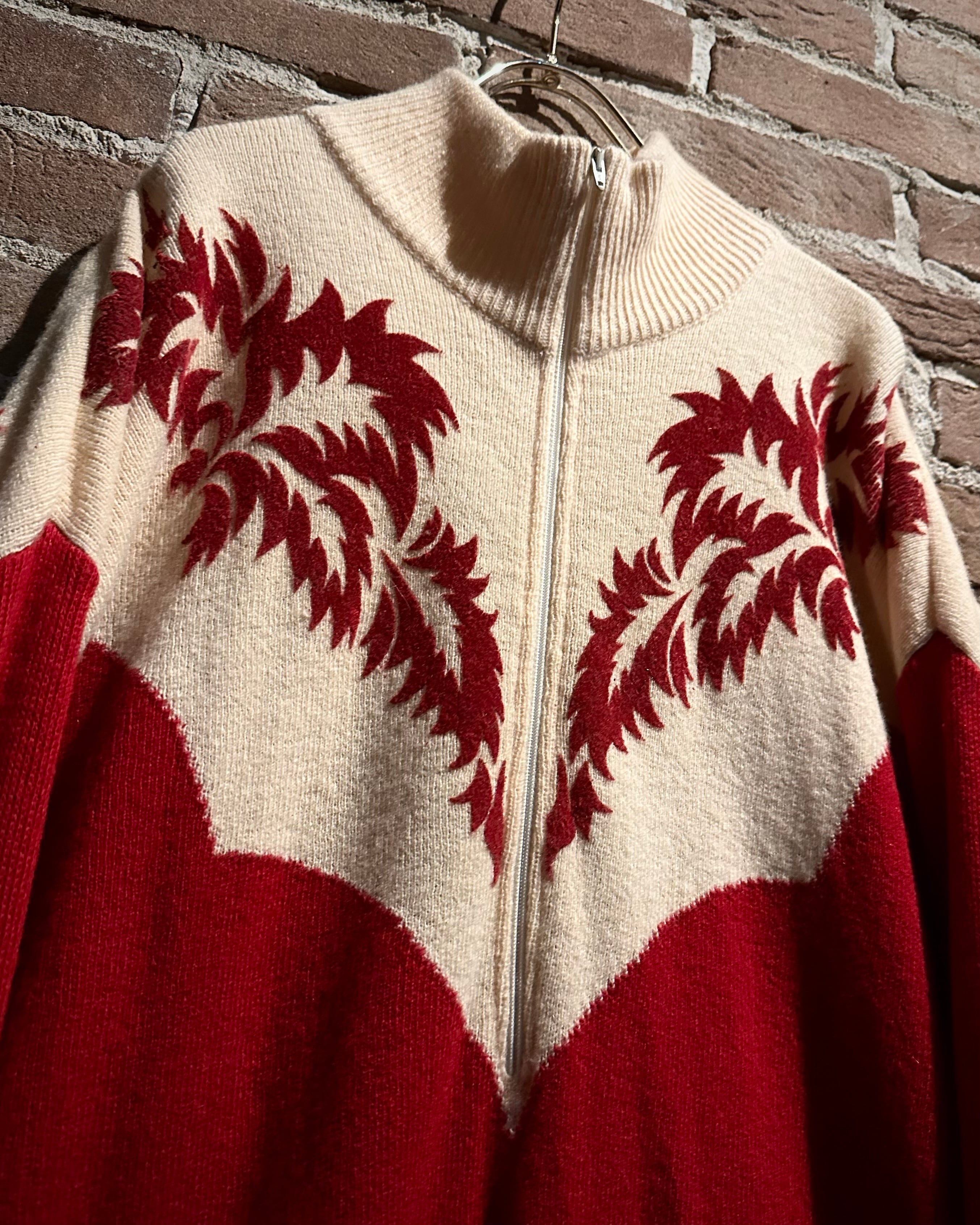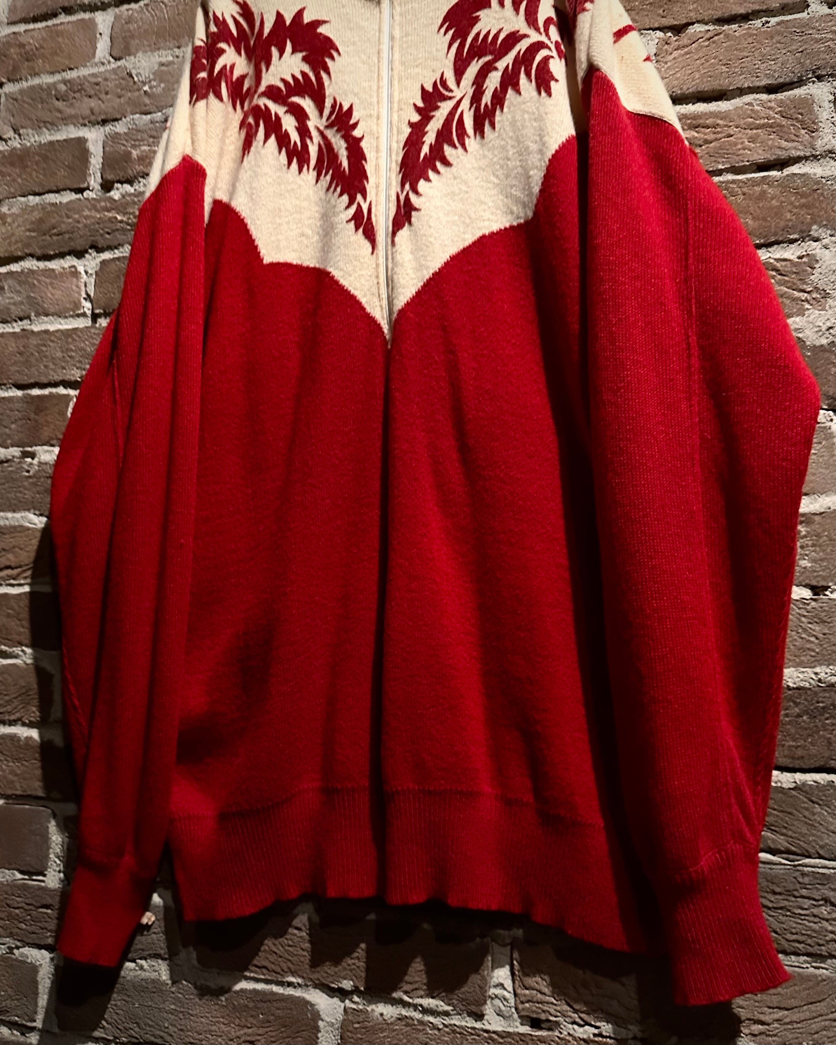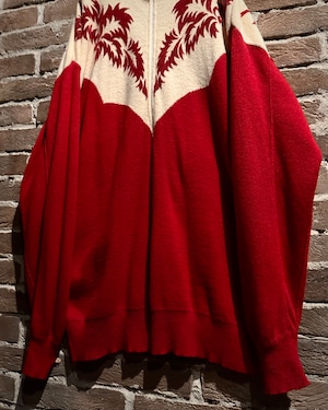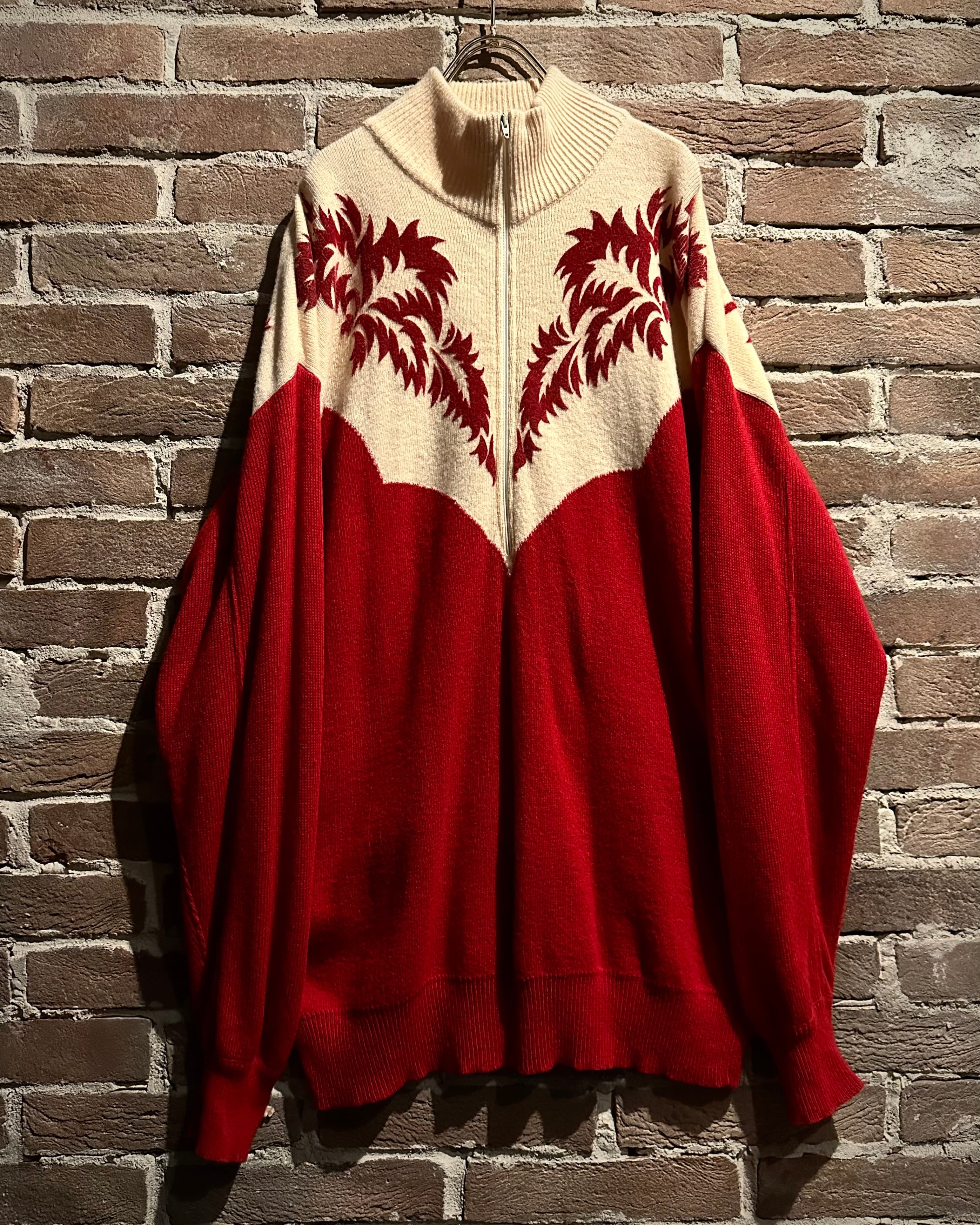 パキッとしたレッド×アイボリーの切り替えをウエスタンヨークで表現したボディに、フロッキープリントでウエスタン調のモチーフを載せたハーフジップニット。