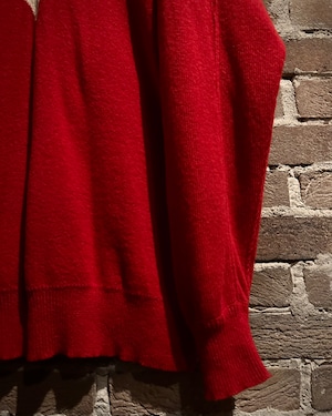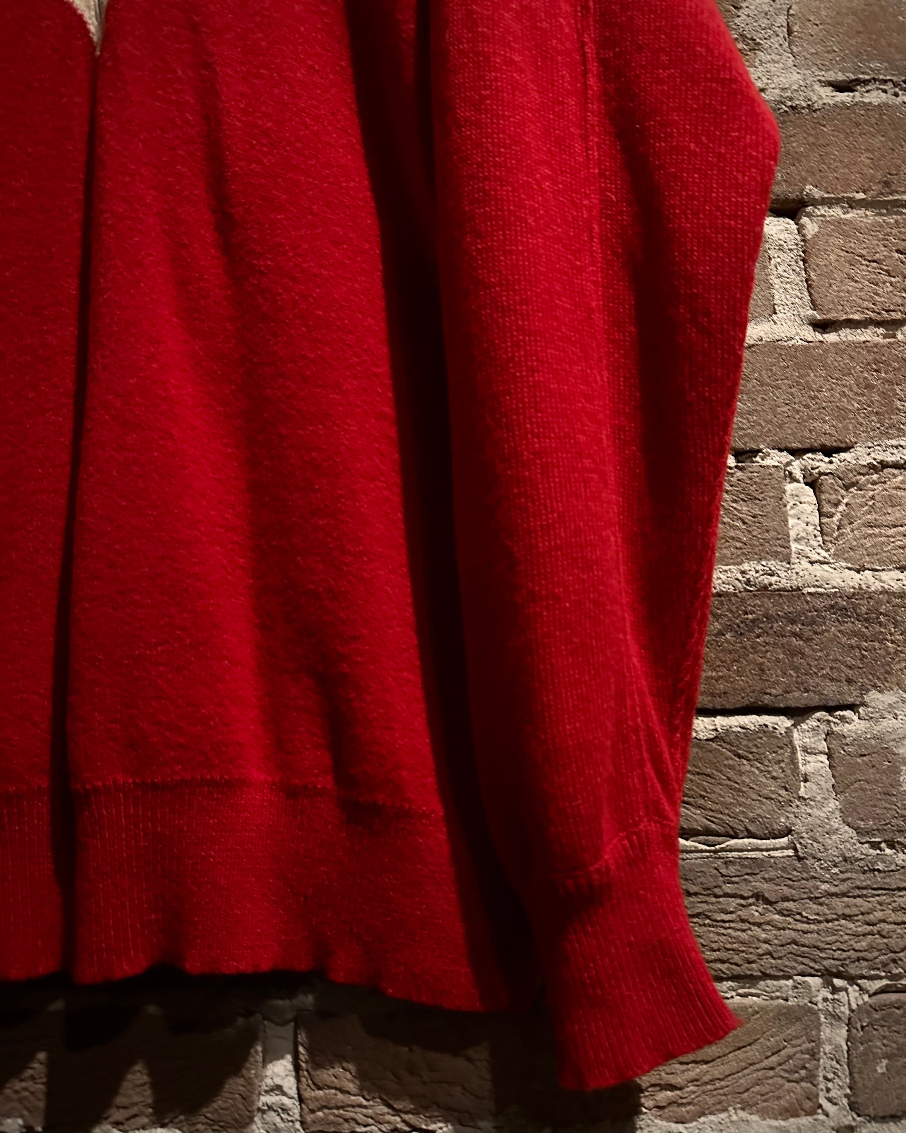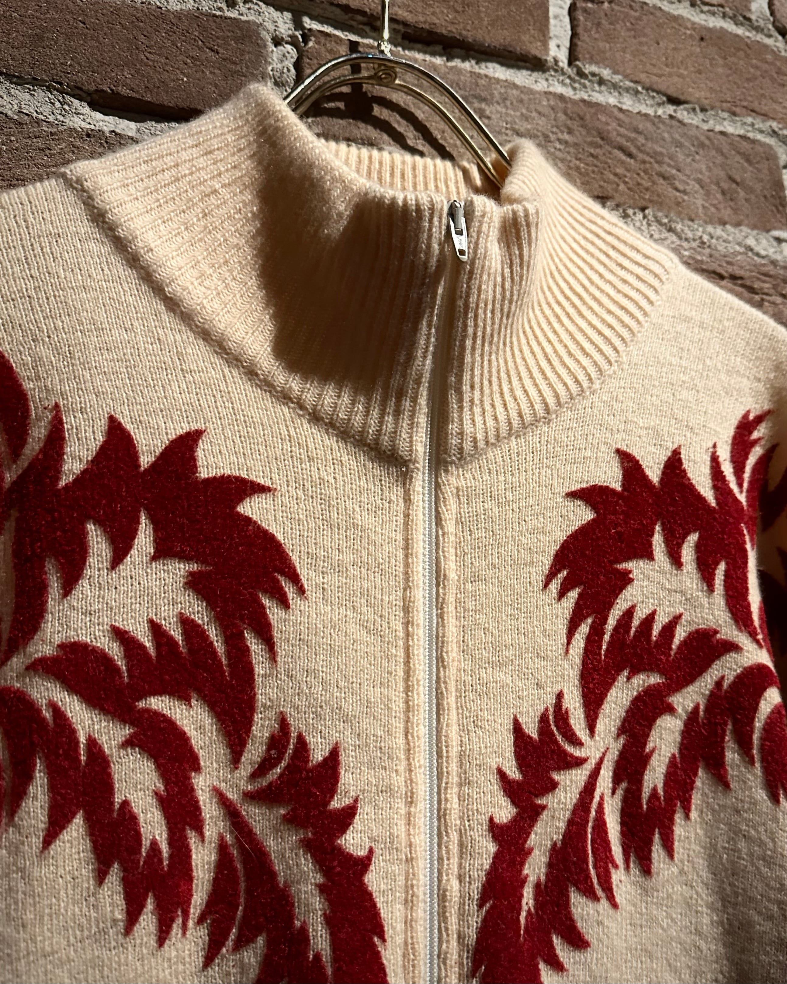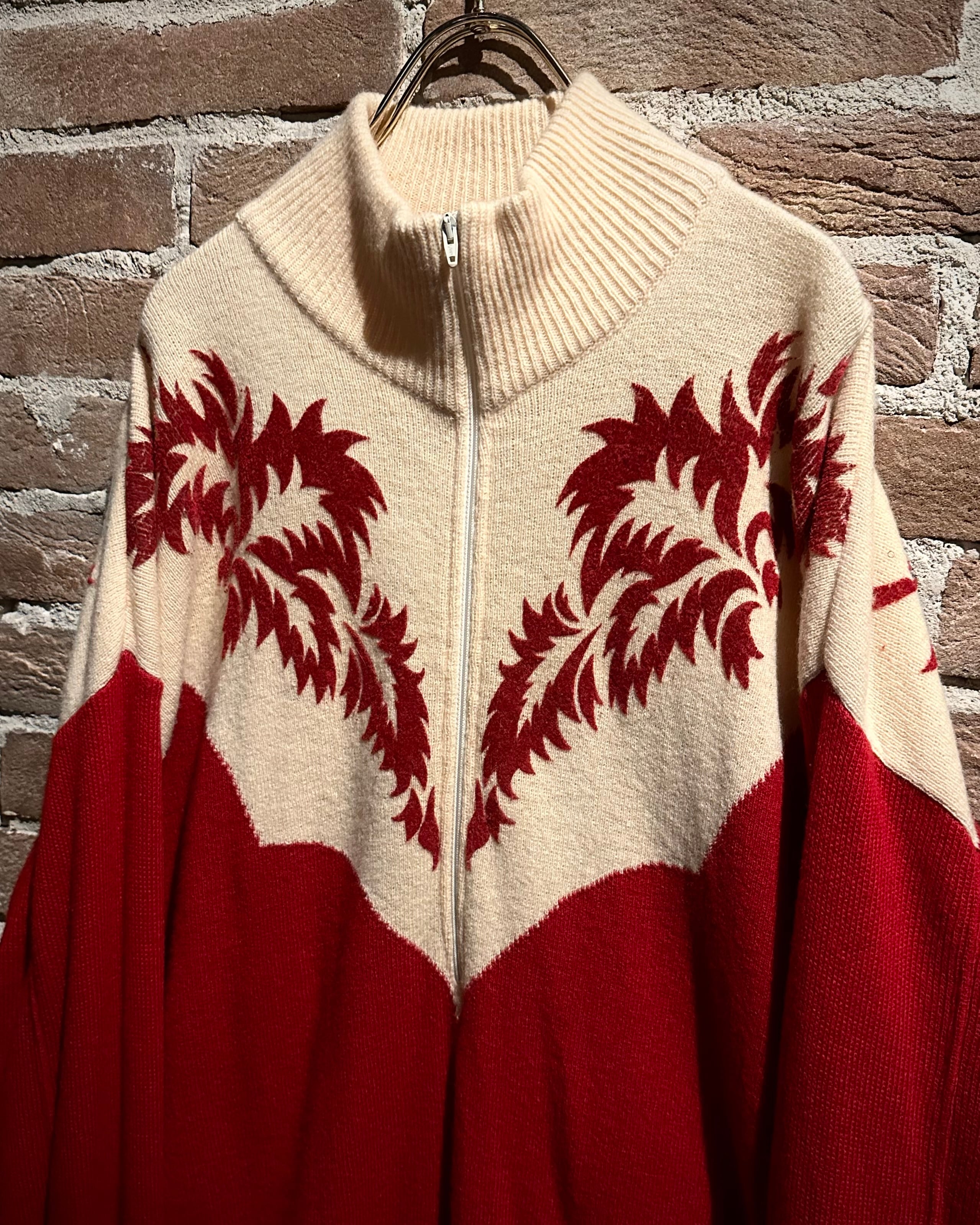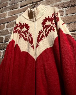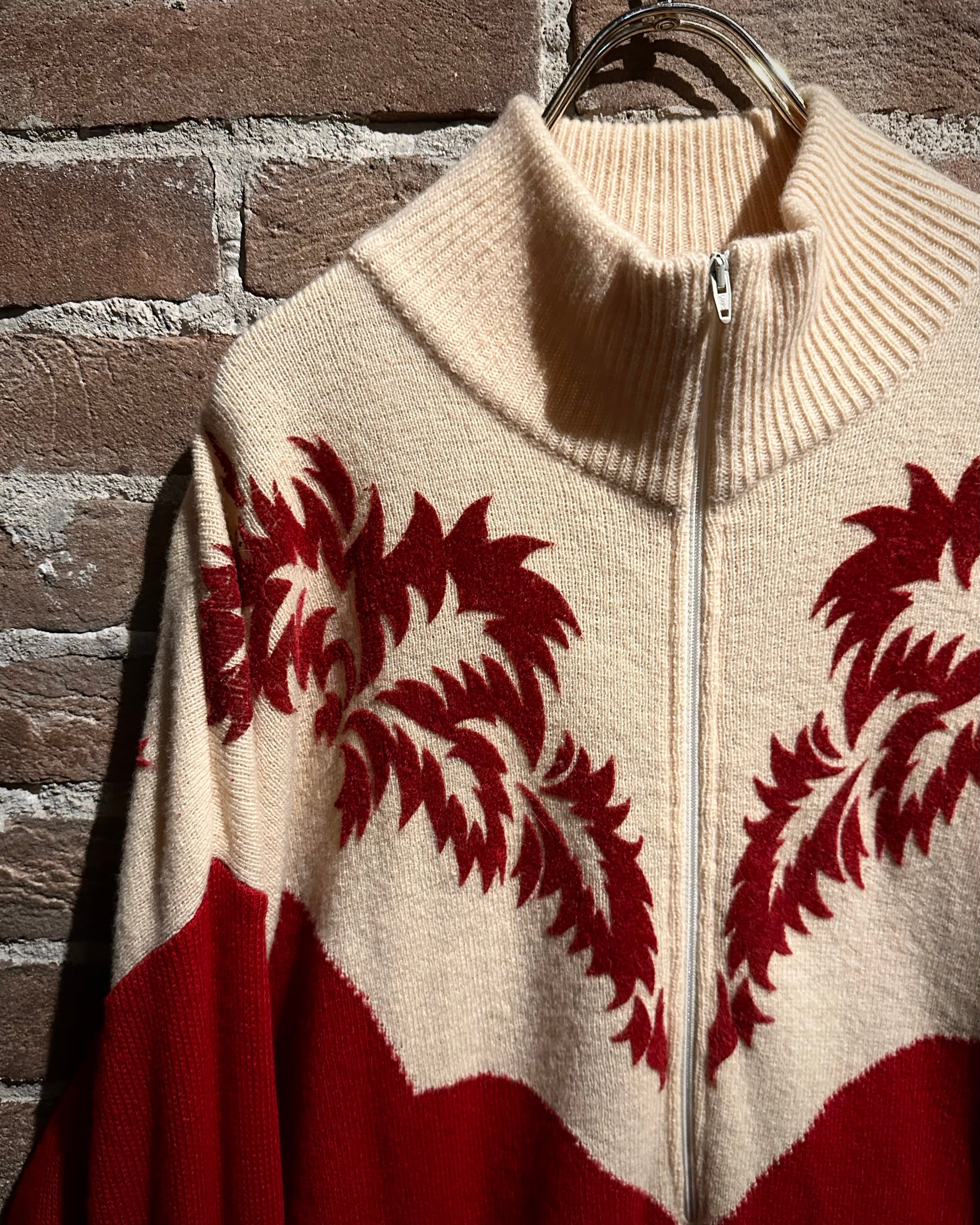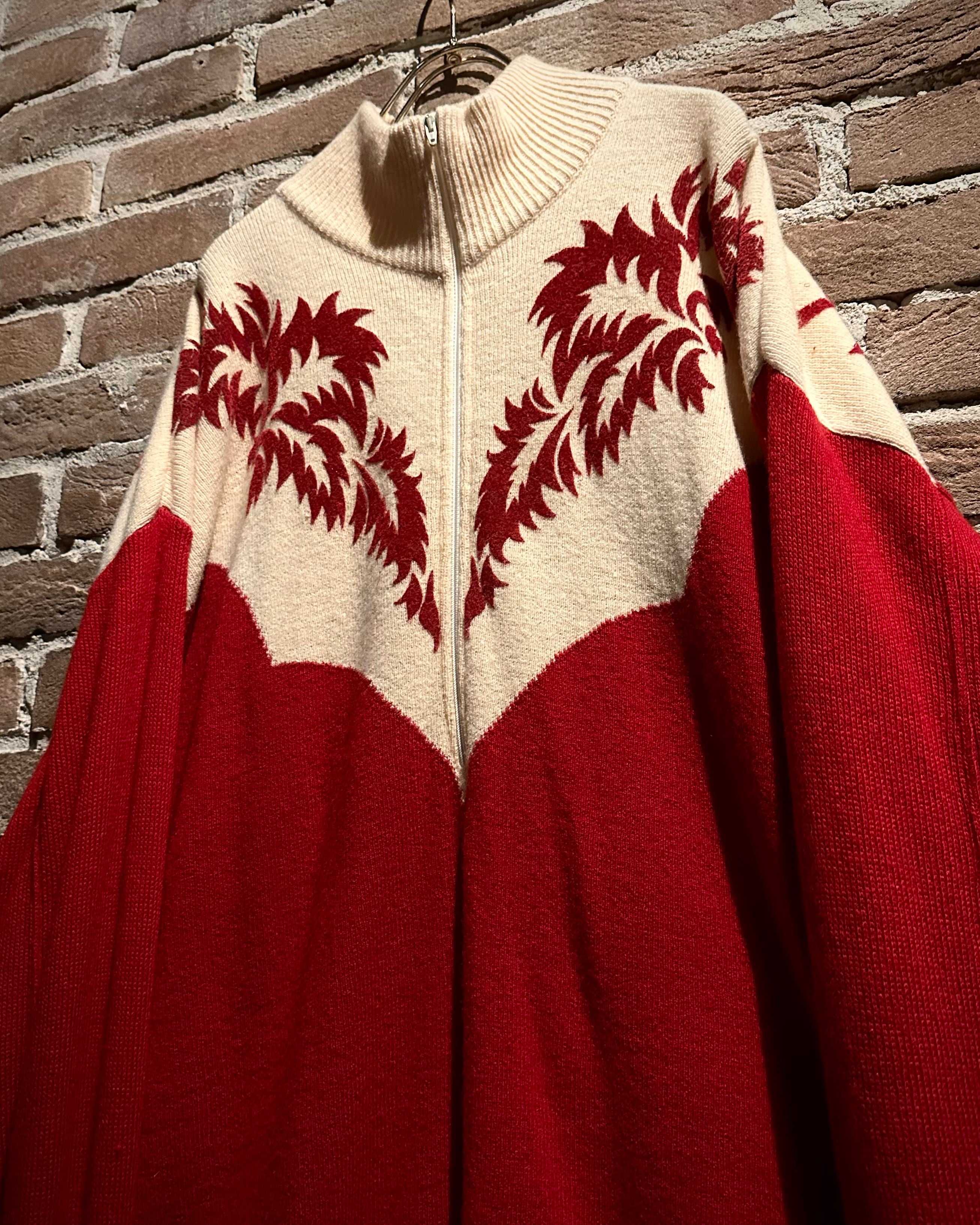 パキッとしたレッド×アイボリーの切り替えをウエスタンヨークで表現したボディに、フロッキープリントでウエスタン調のモチーフを載せたハーフジップニット。