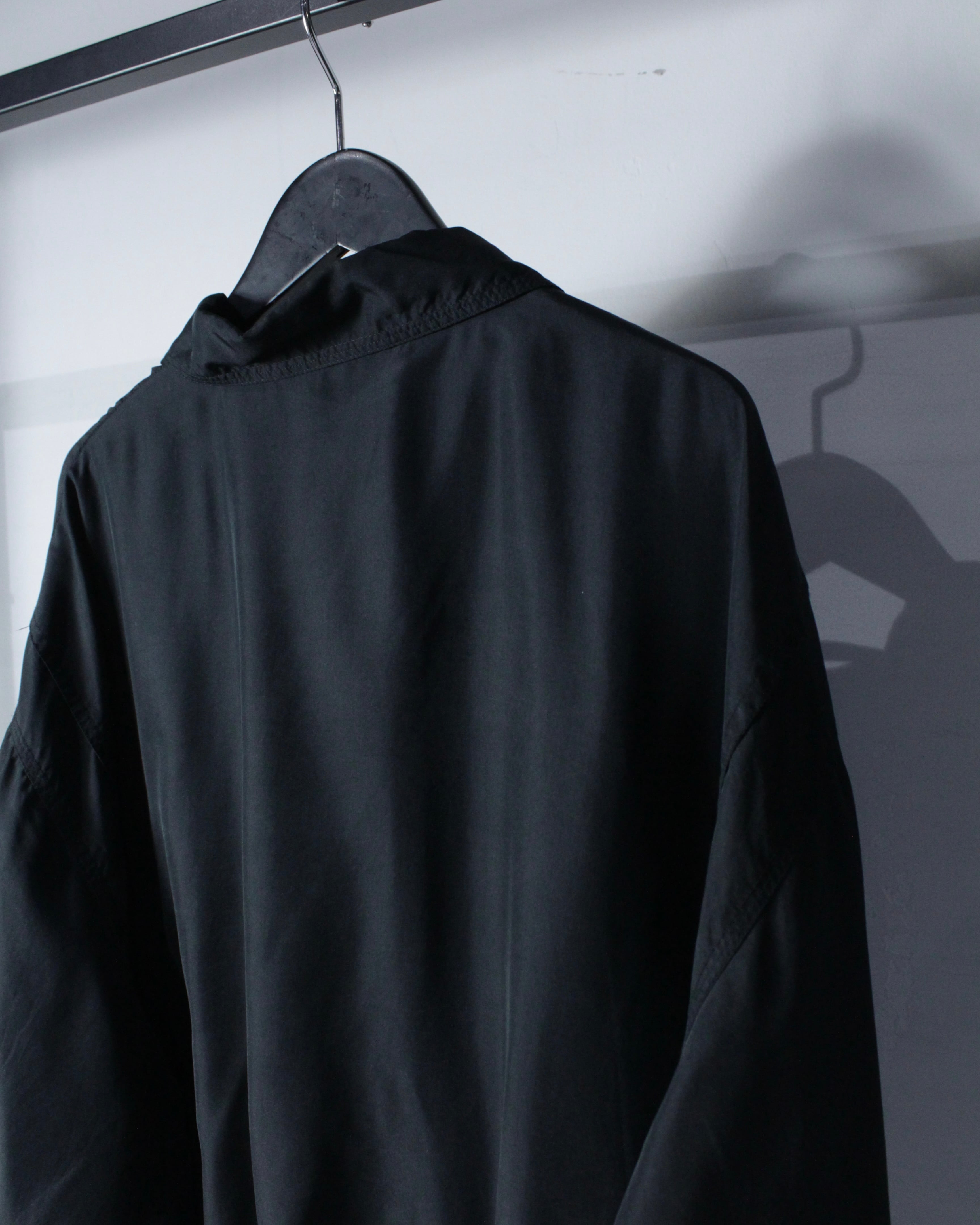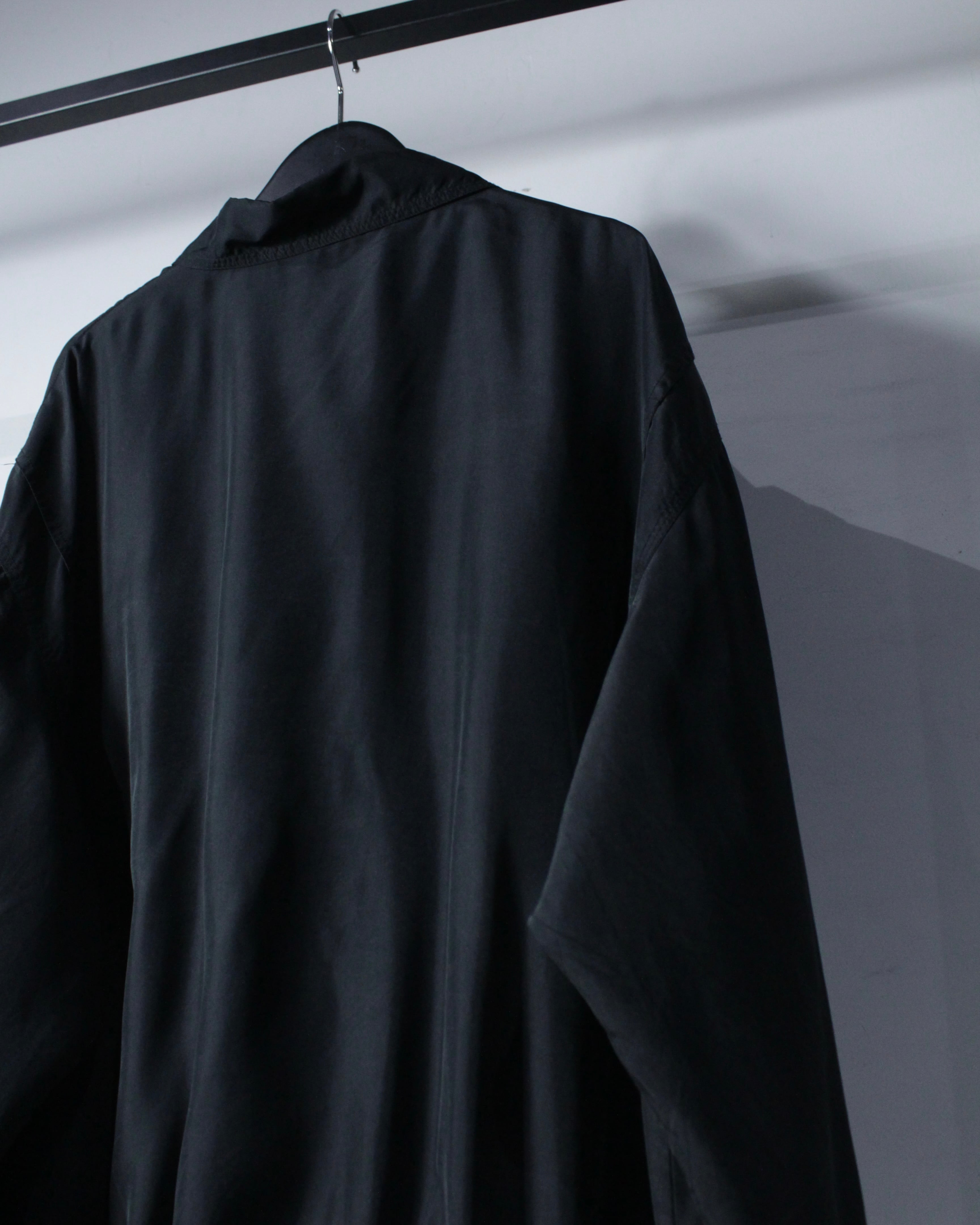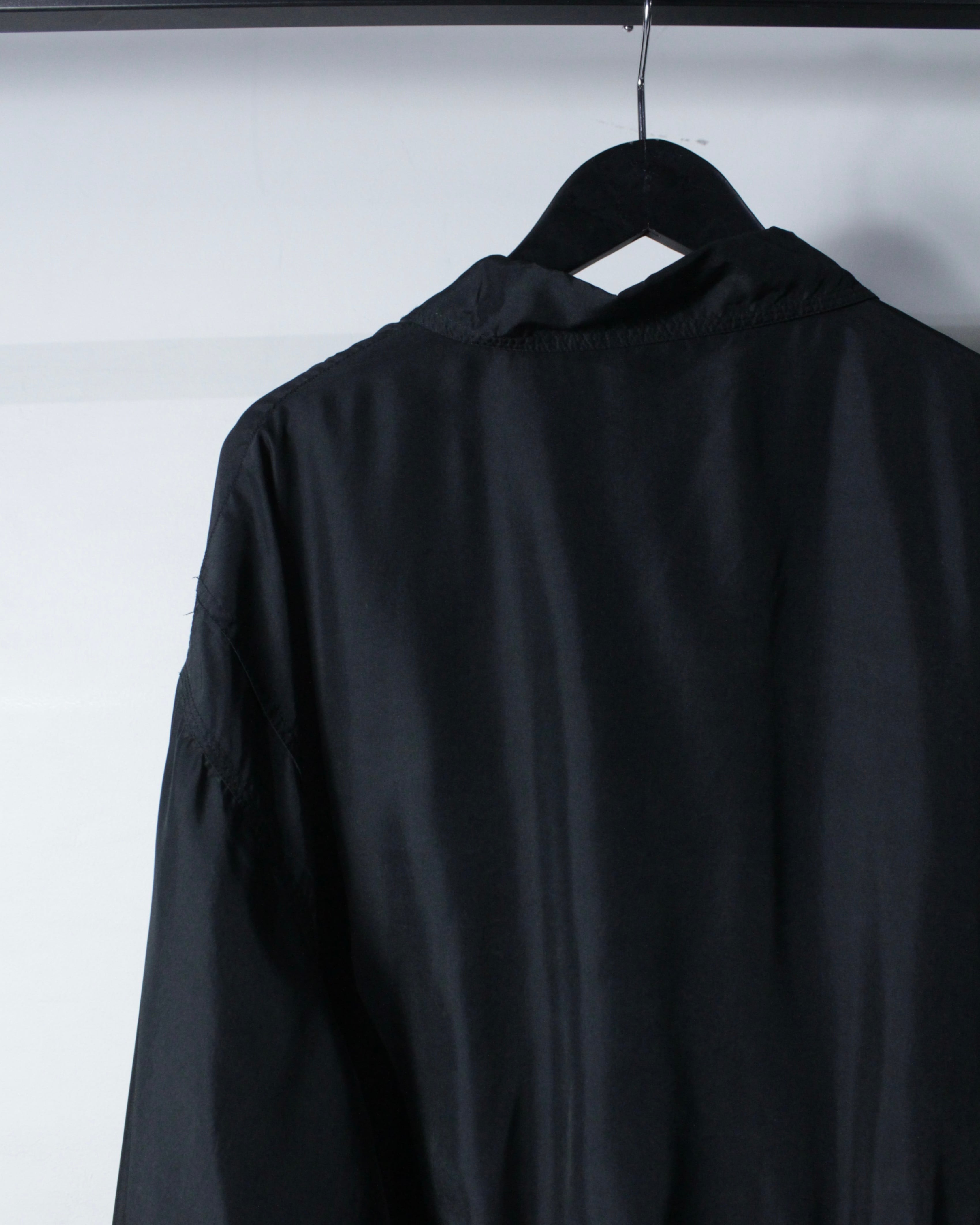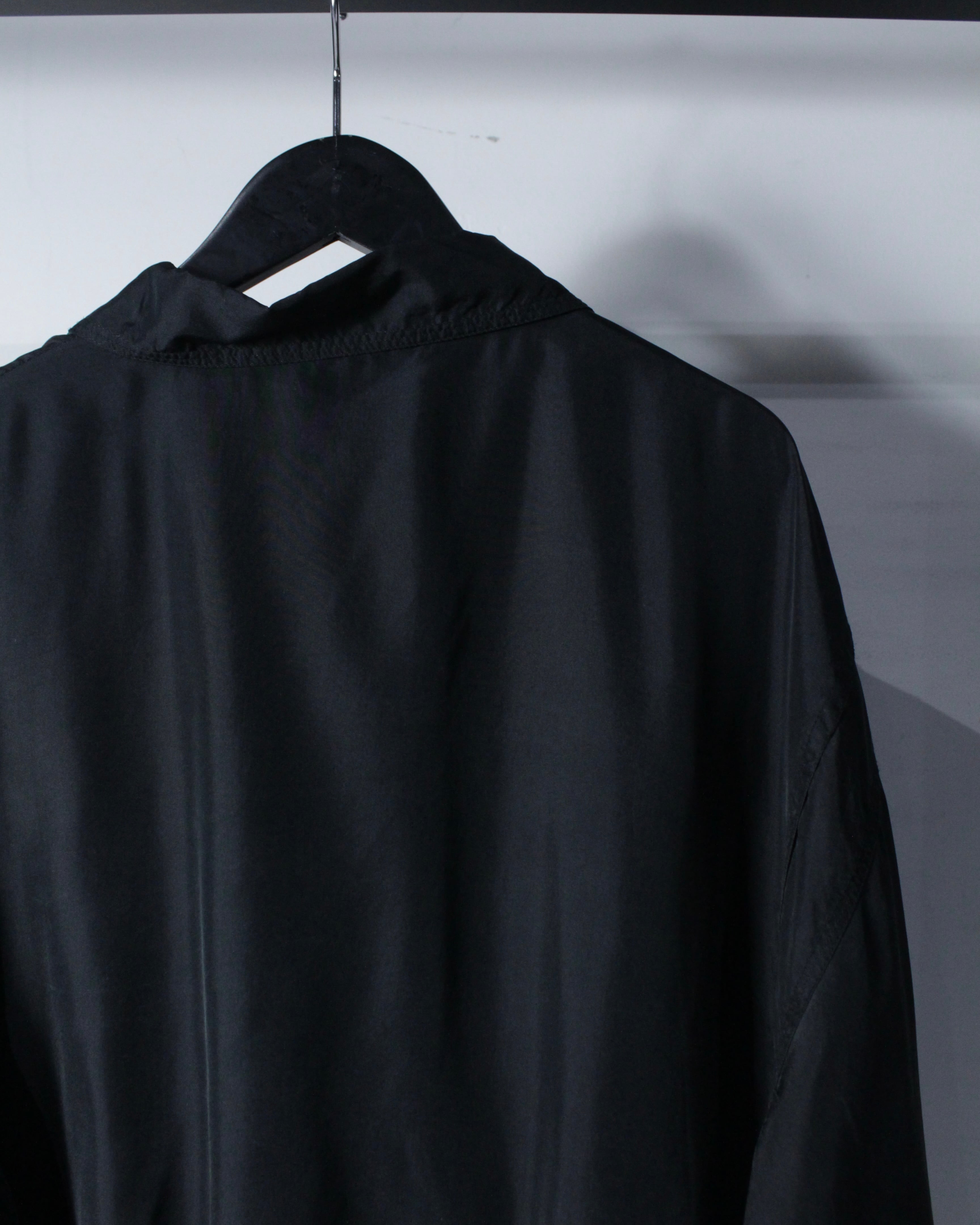 滑らかで上品な光沢を放つシルク素材を贅沢に使用した一着。ブラックボディに宿る鈍い艶が、シンプルでありながらラグジュアリーなムードをしっかりと演出してくれます。