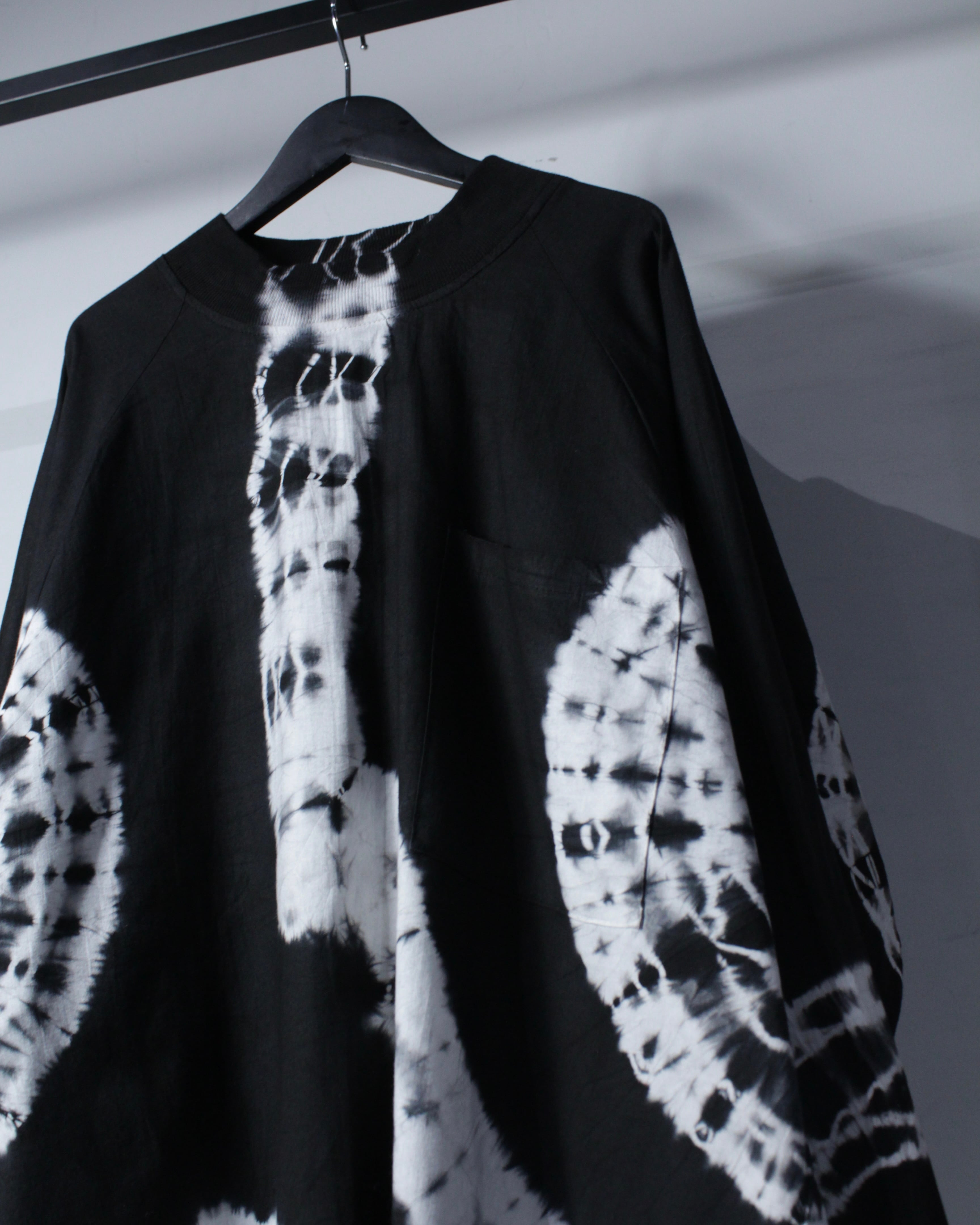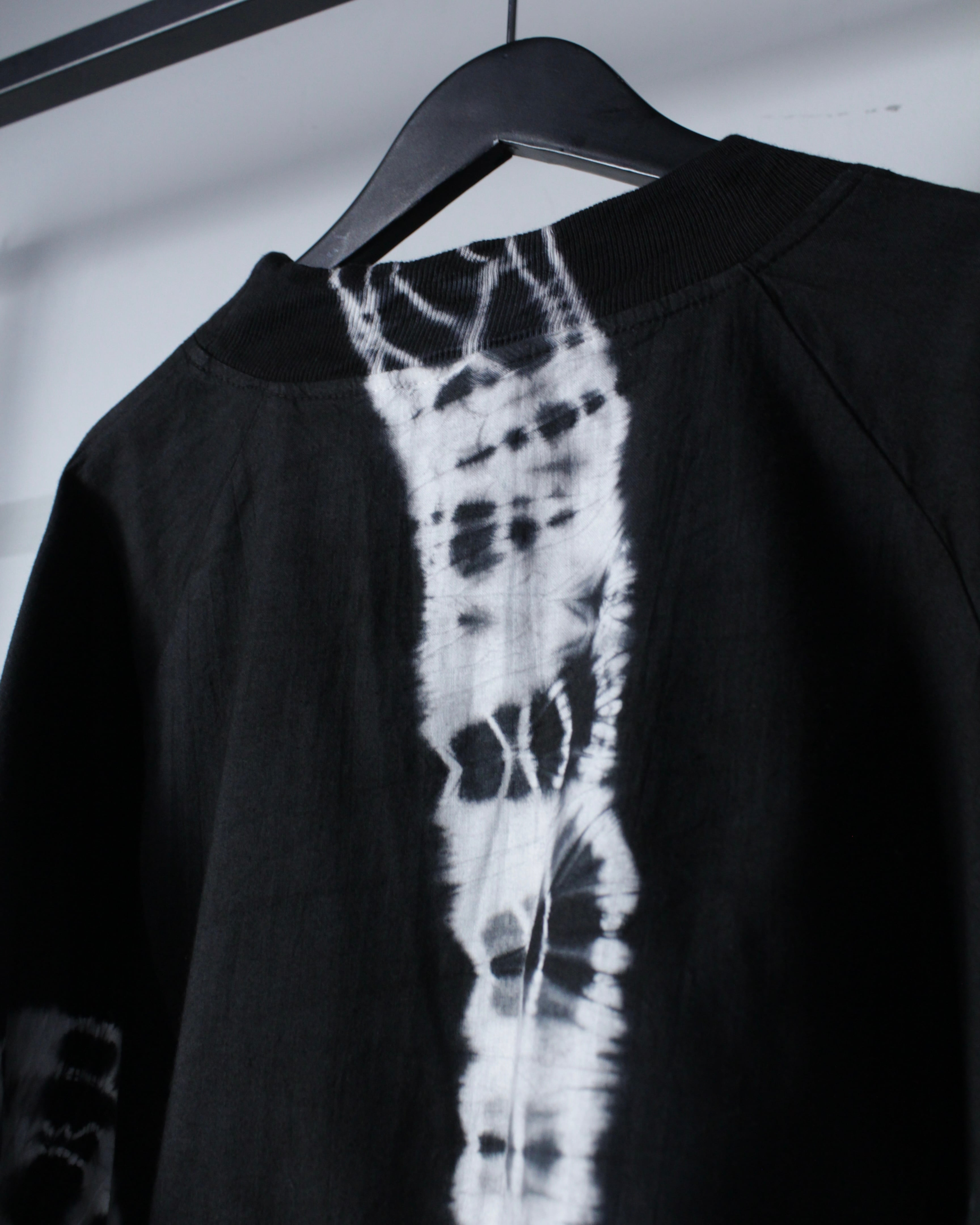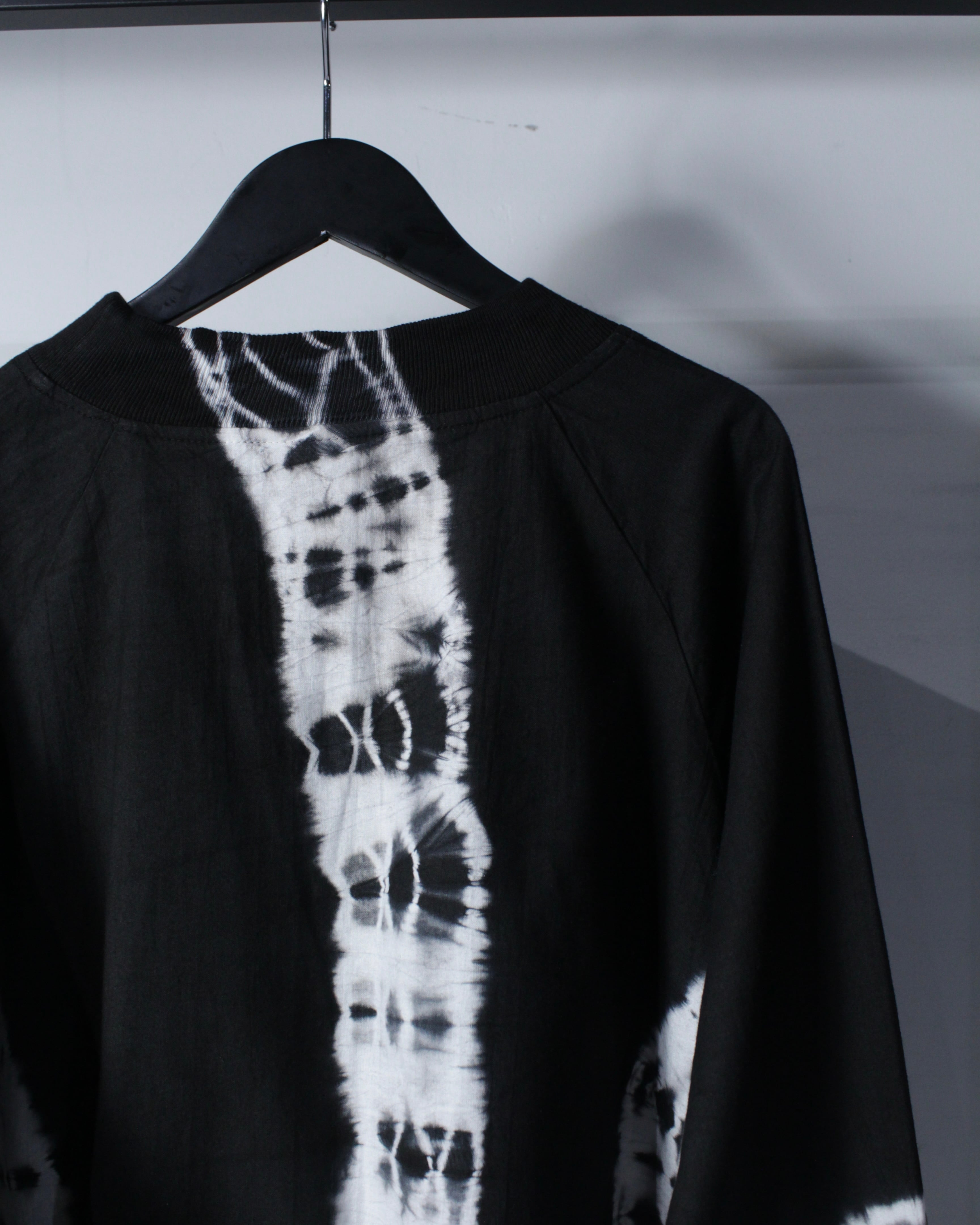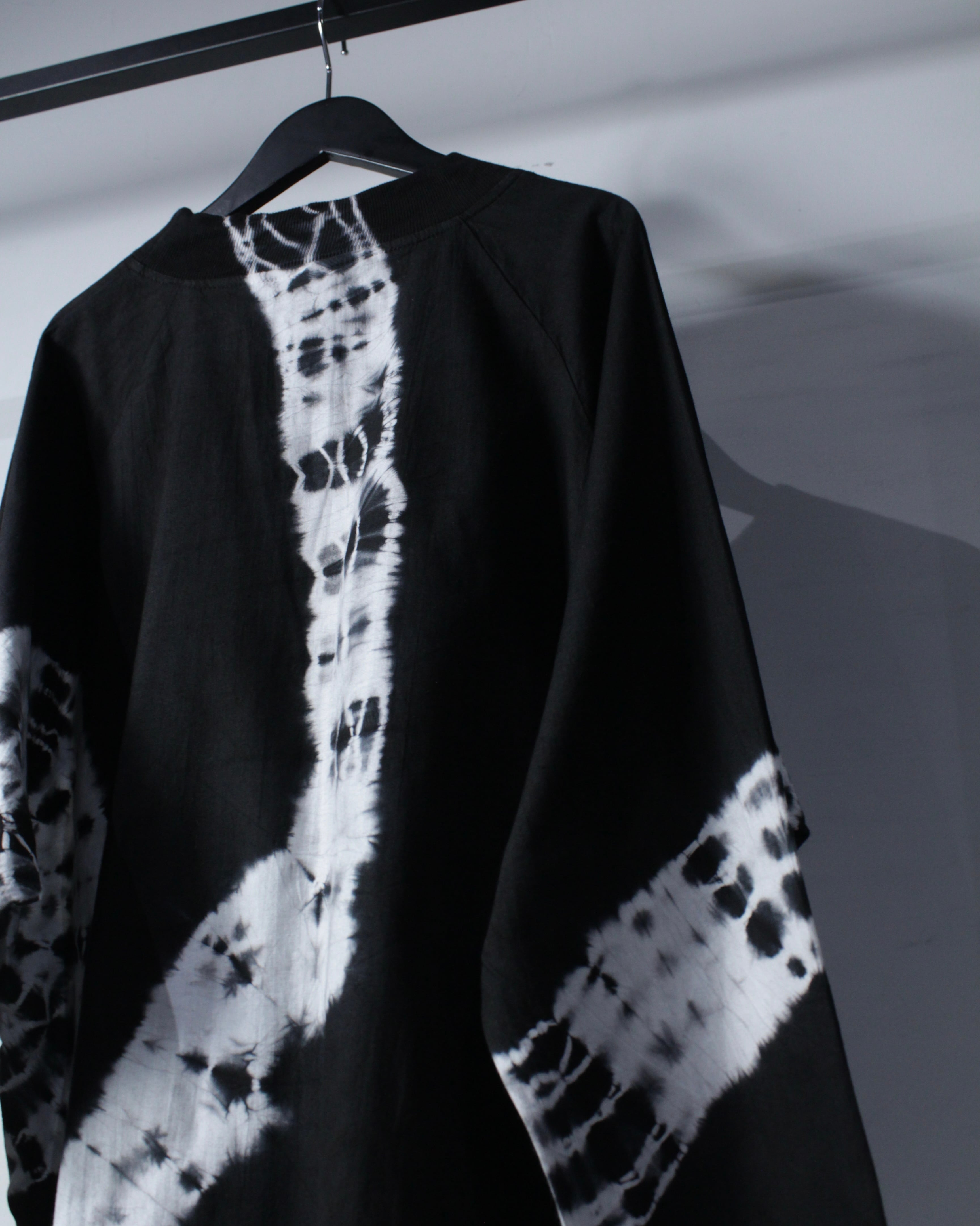 ブラックベースのボディにホワイトのタイダイ染めを大胆に落とし込んだ一着。ランダムかつ有機的に広がる柄は一点一点異なる表情を持ち、既製品では出せないアートピースのような存在感を放ちます。