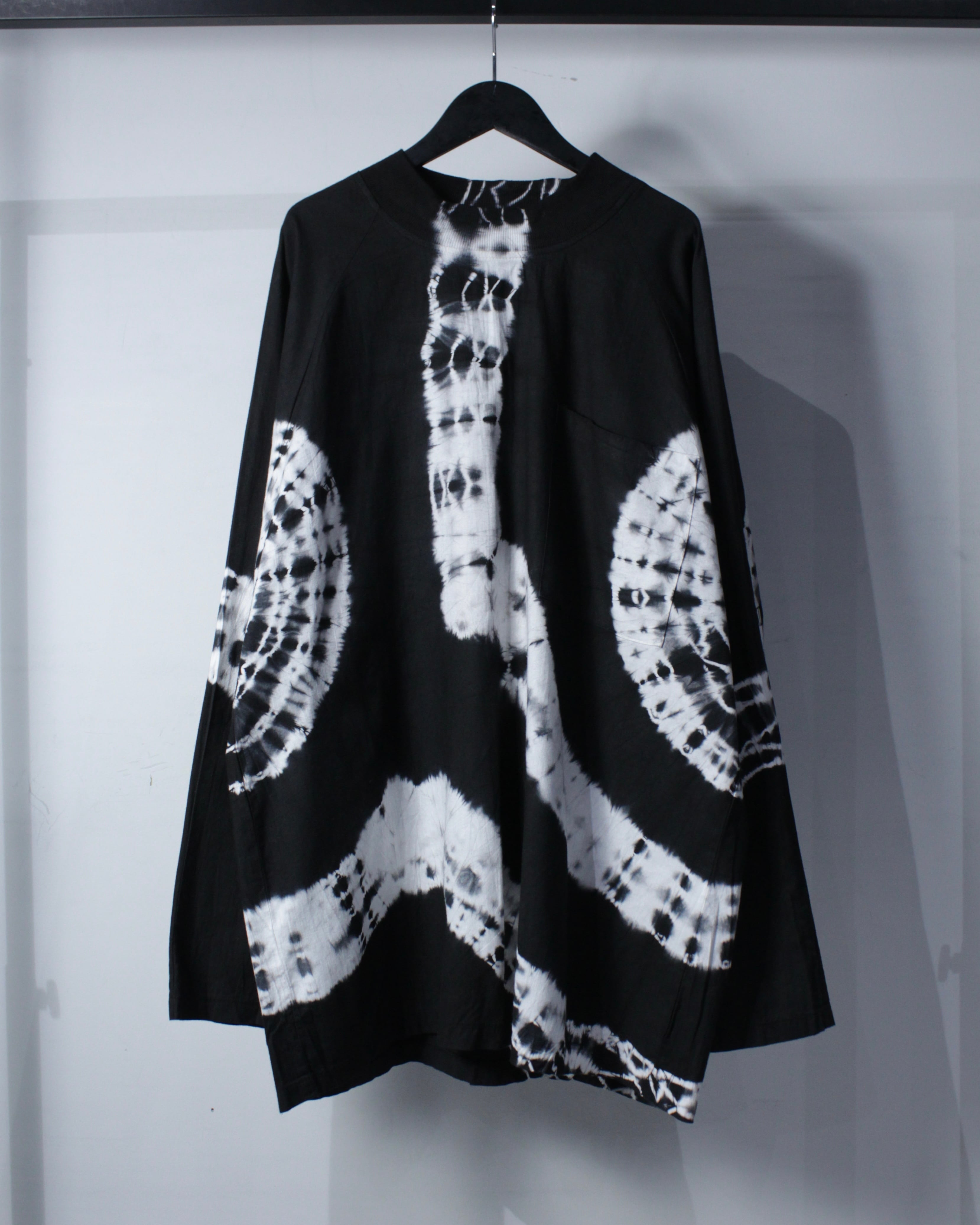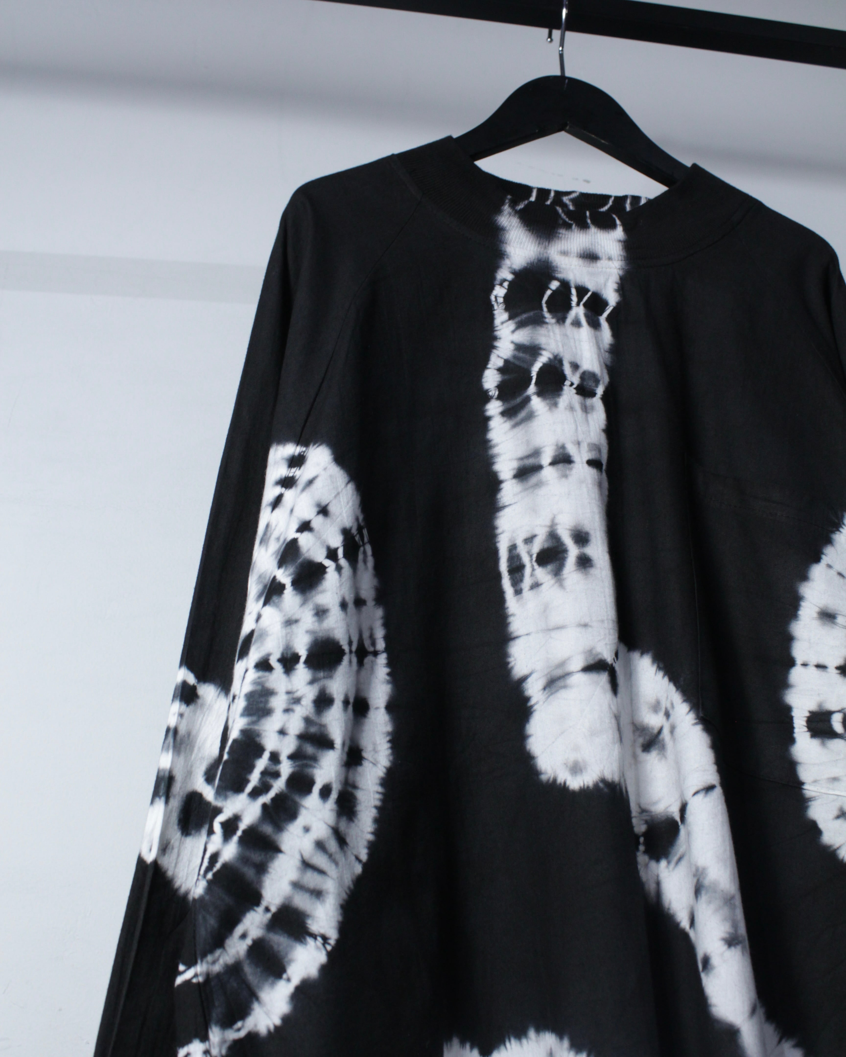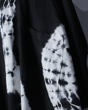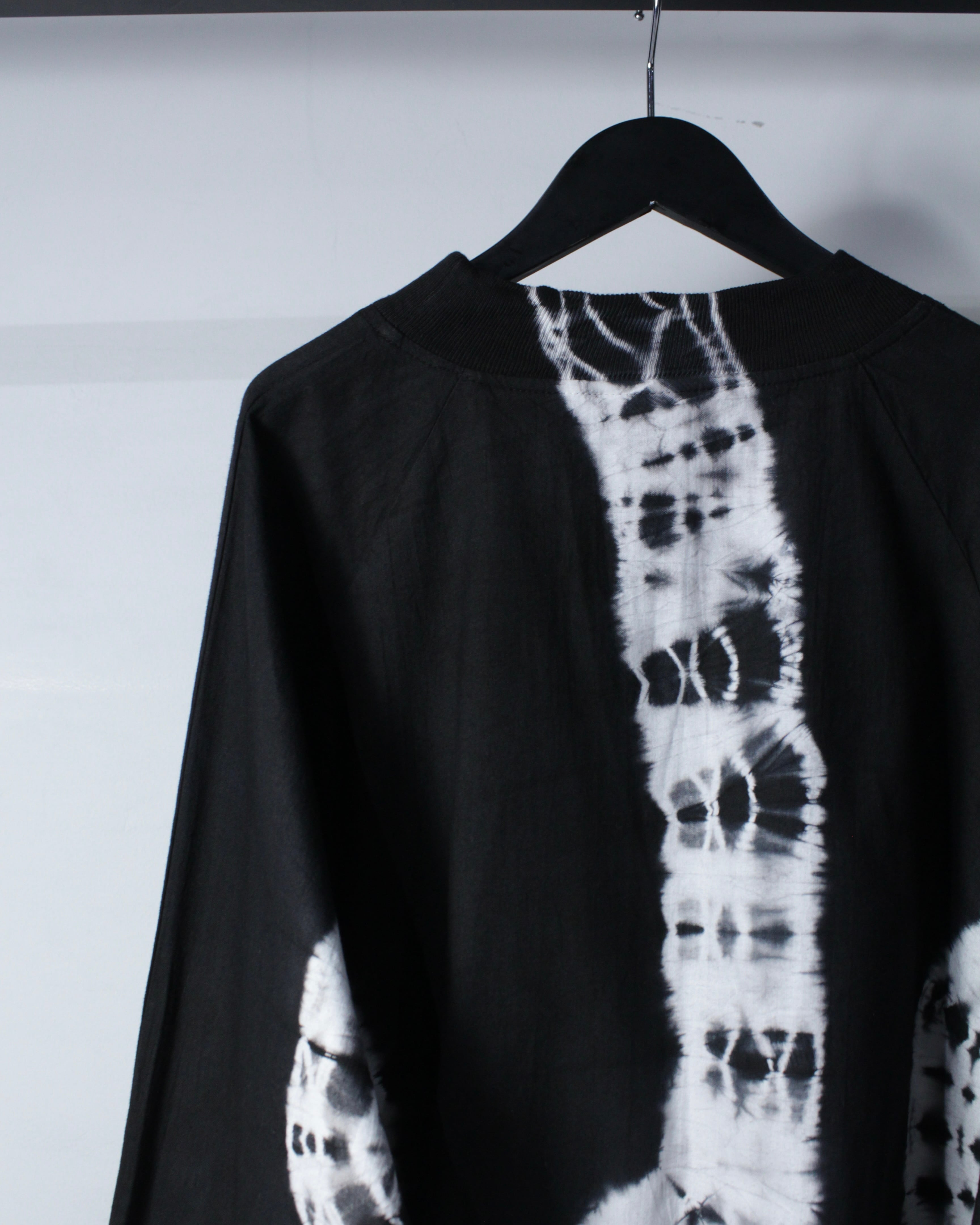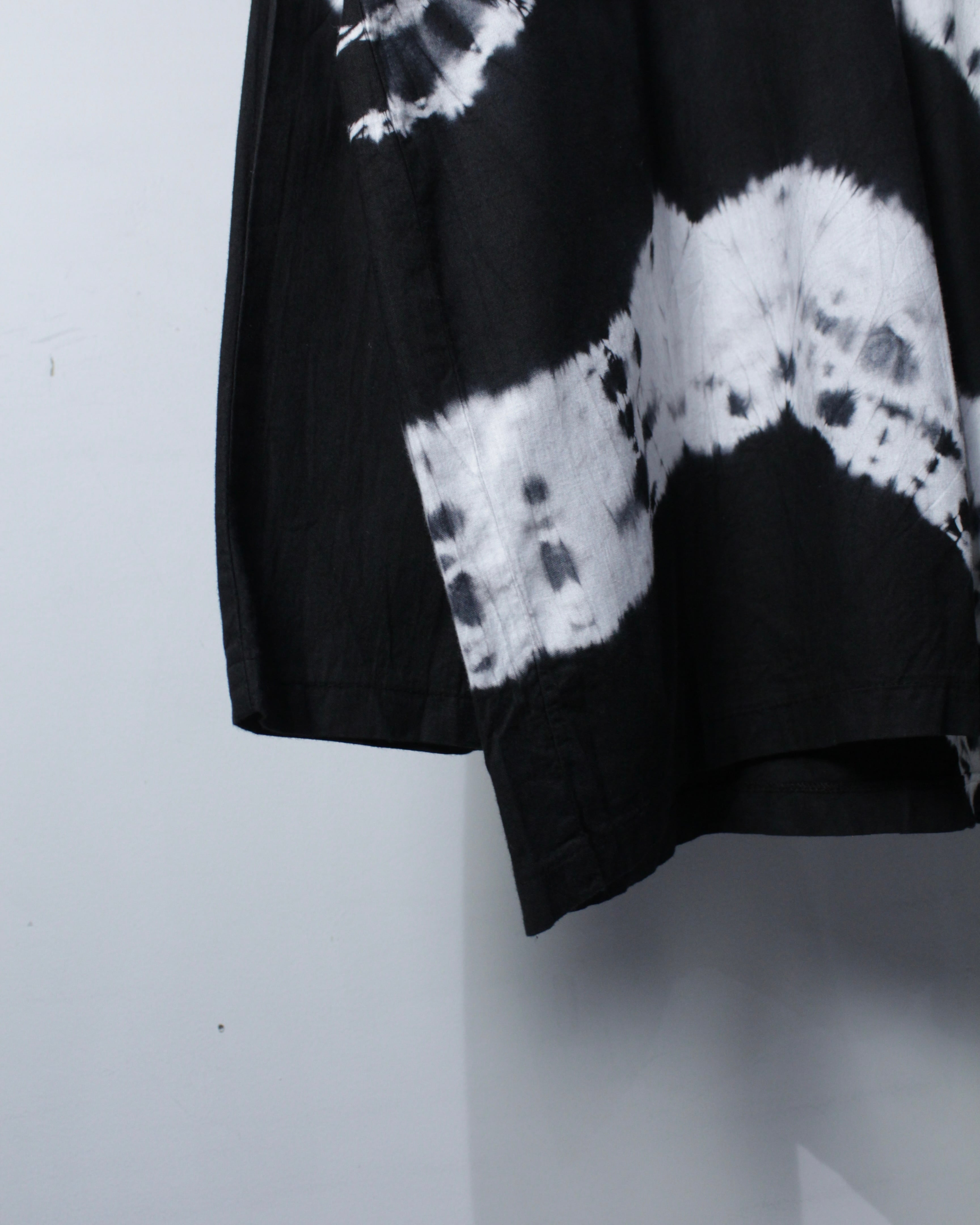 ブラックベースのボディにホワイトのタイダイ染めを大胆に落とし込んだ一着。ランダムかつ有機的に広がる柄は一点一点異なる表情を持ち、既製品では出せないアートピースのような存在感を放ちます。