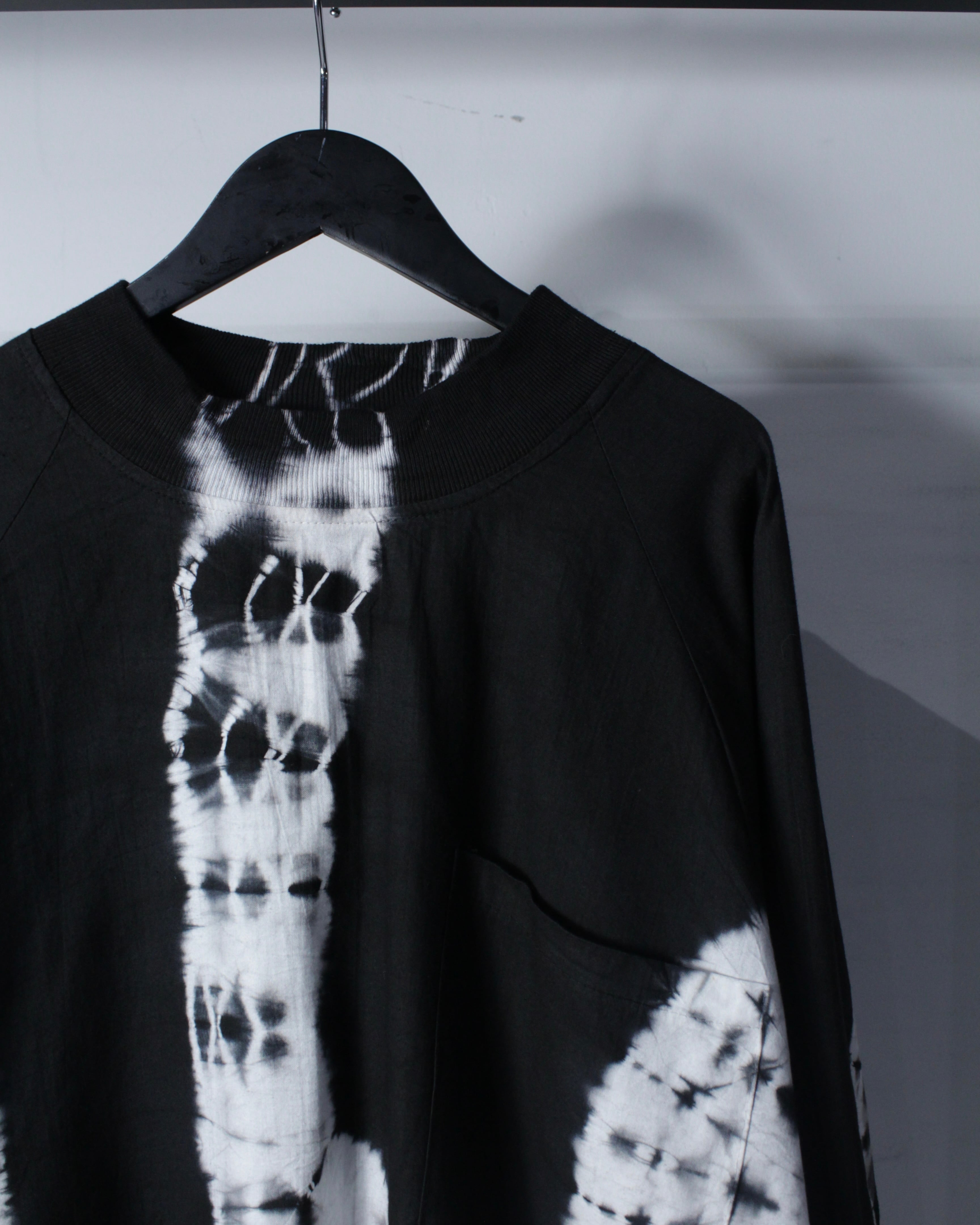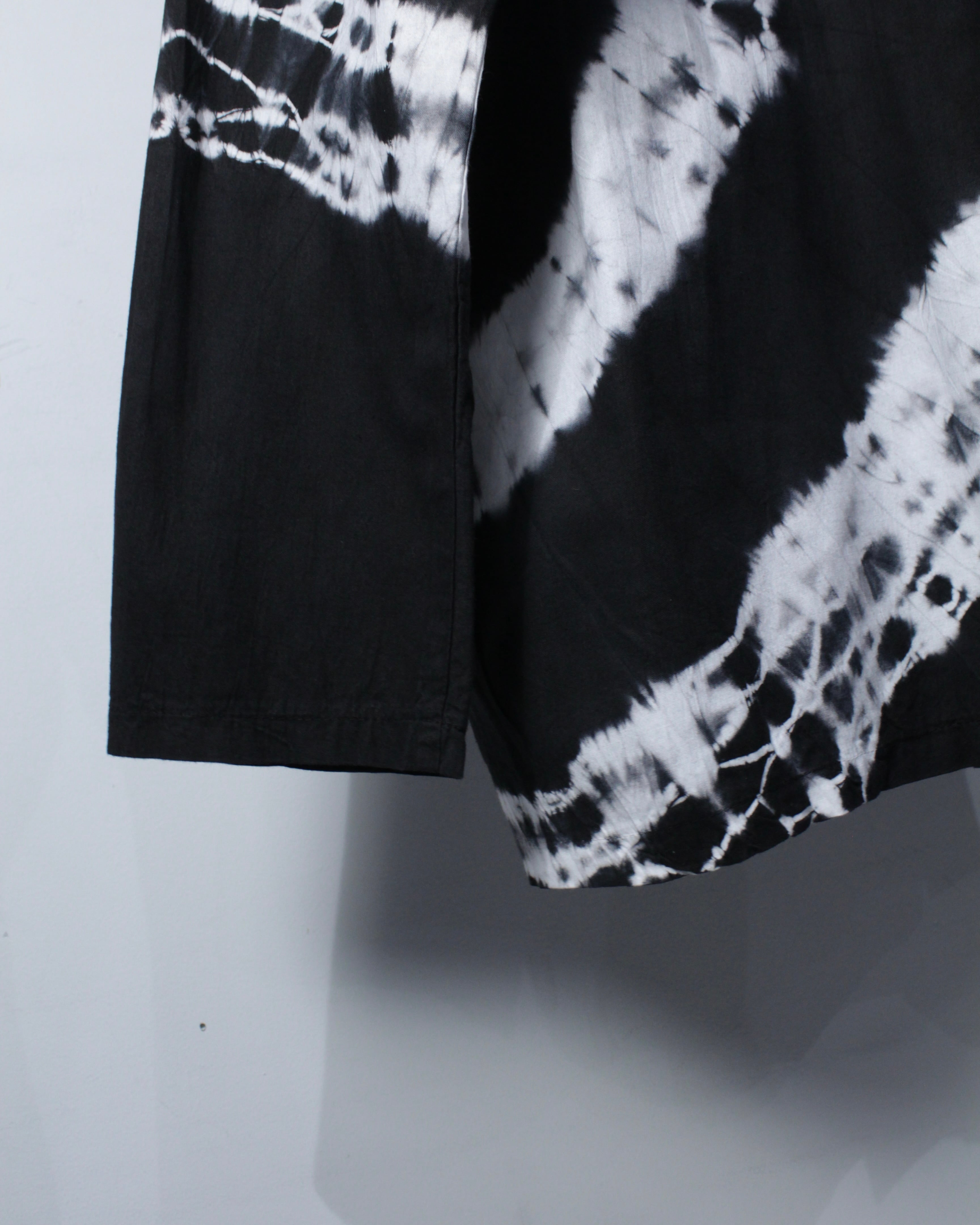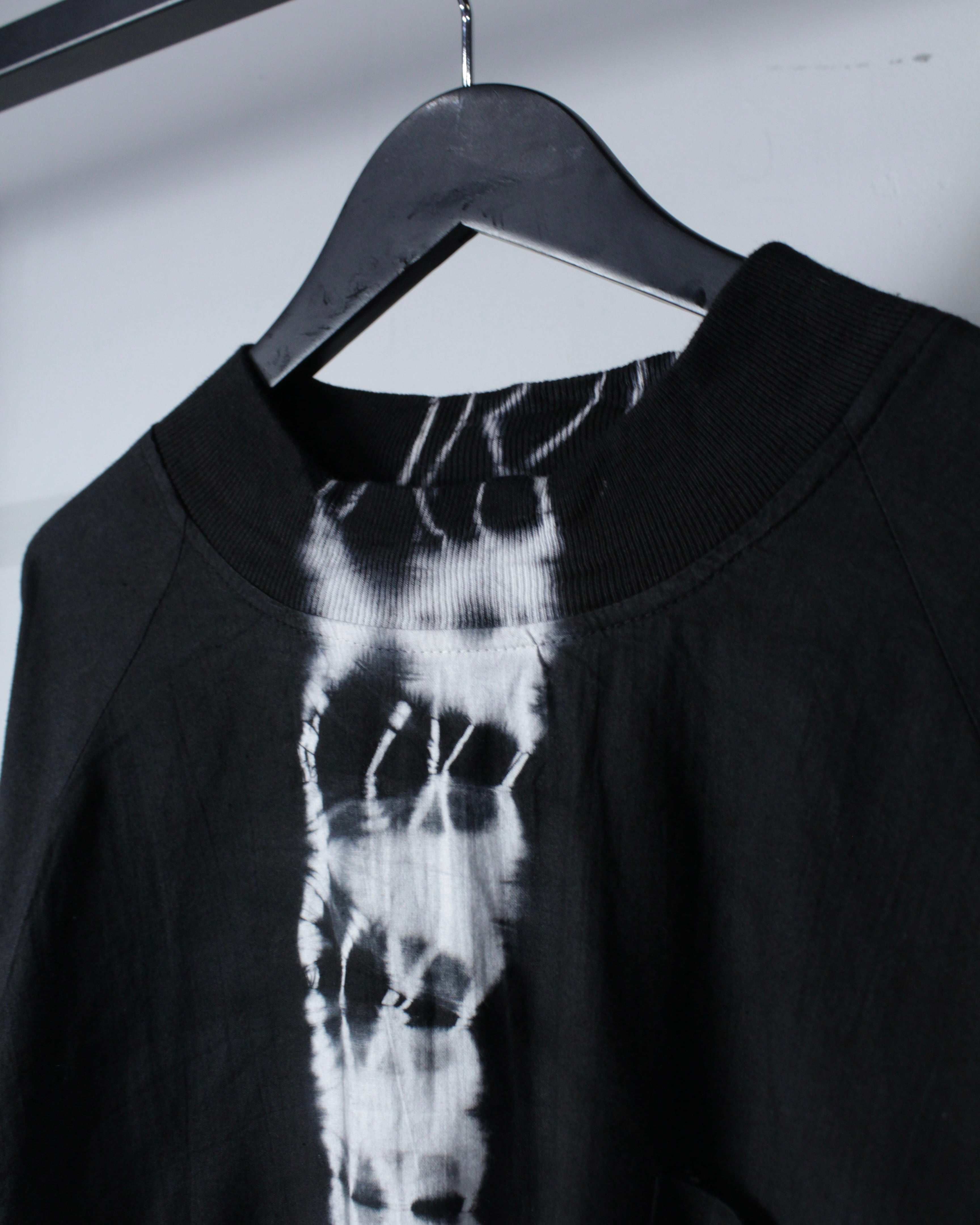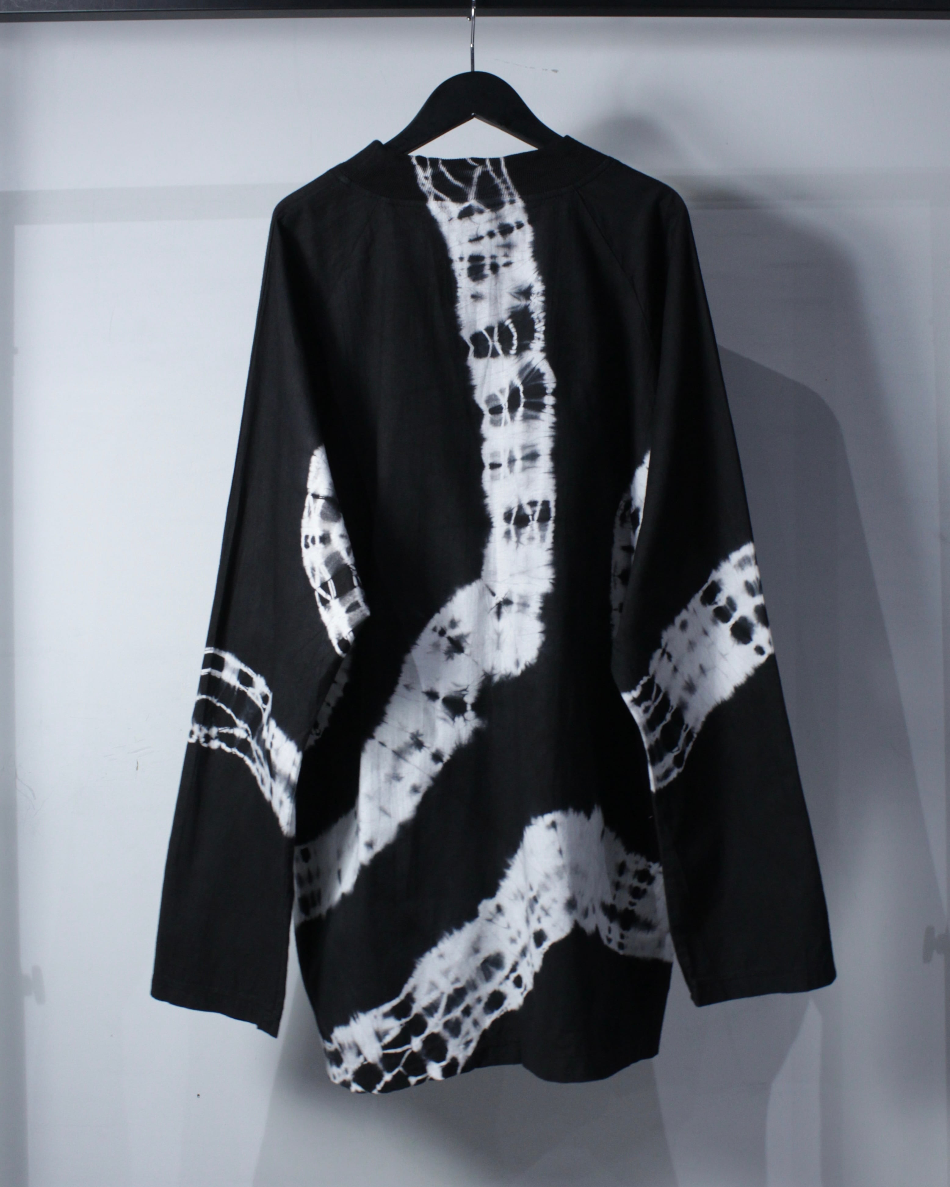 ブラックベースのボディにホワイトのタイダイ染めを大胆に落とし込んだ一着。ランダムかつ有機的に広がる柄は一点一点異なる表情を持ち、既製品では出せないアートピースのような存在感を放ちます。