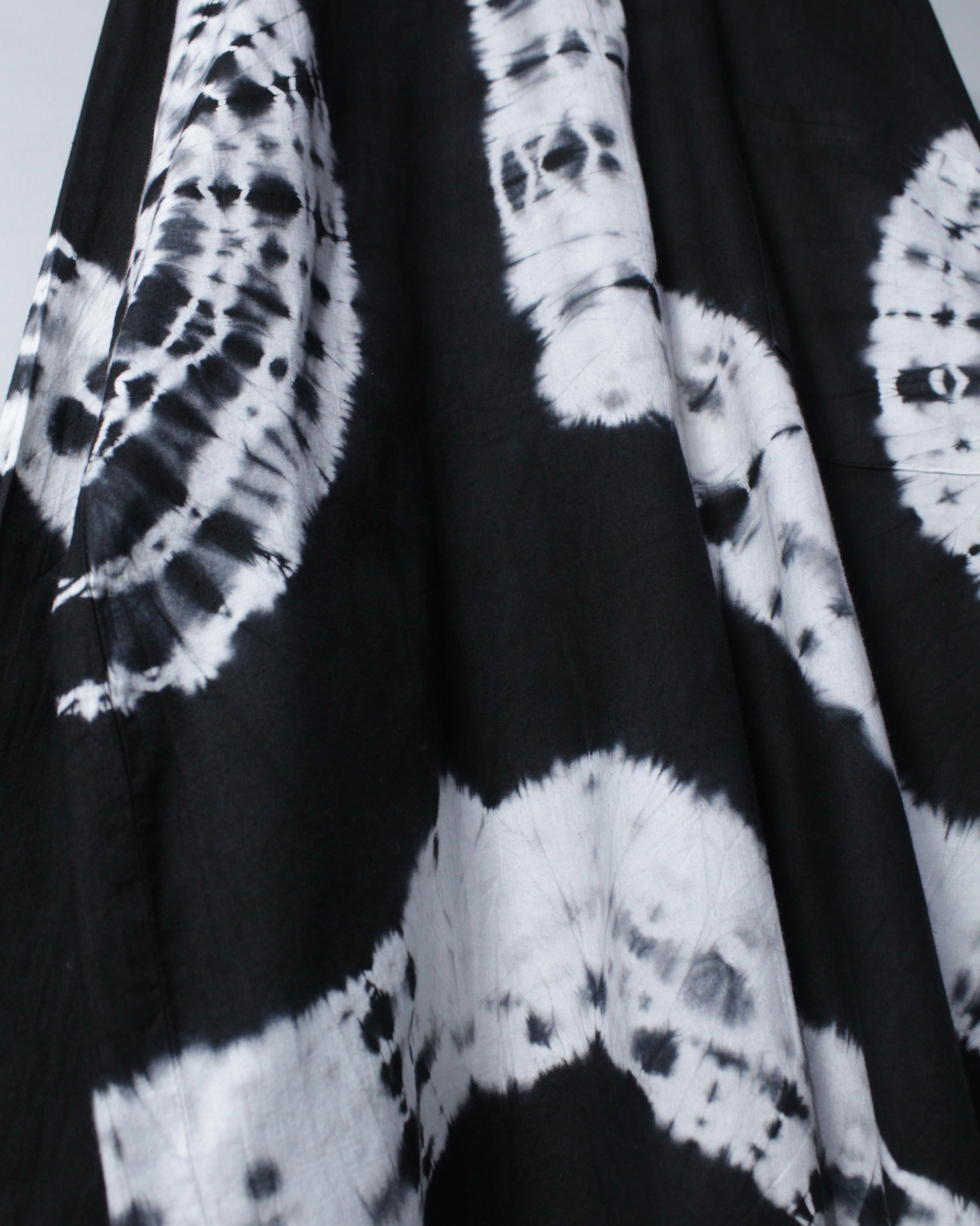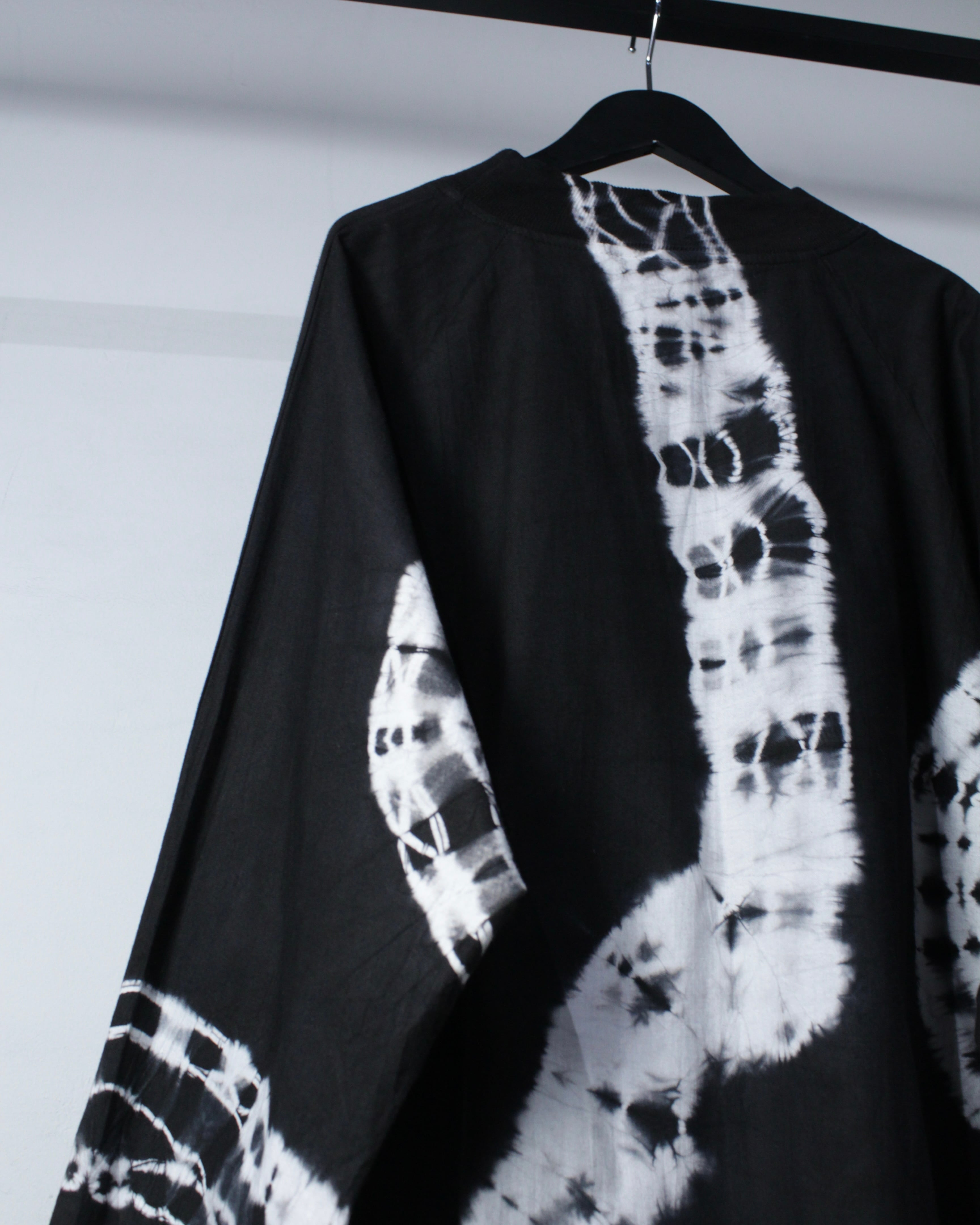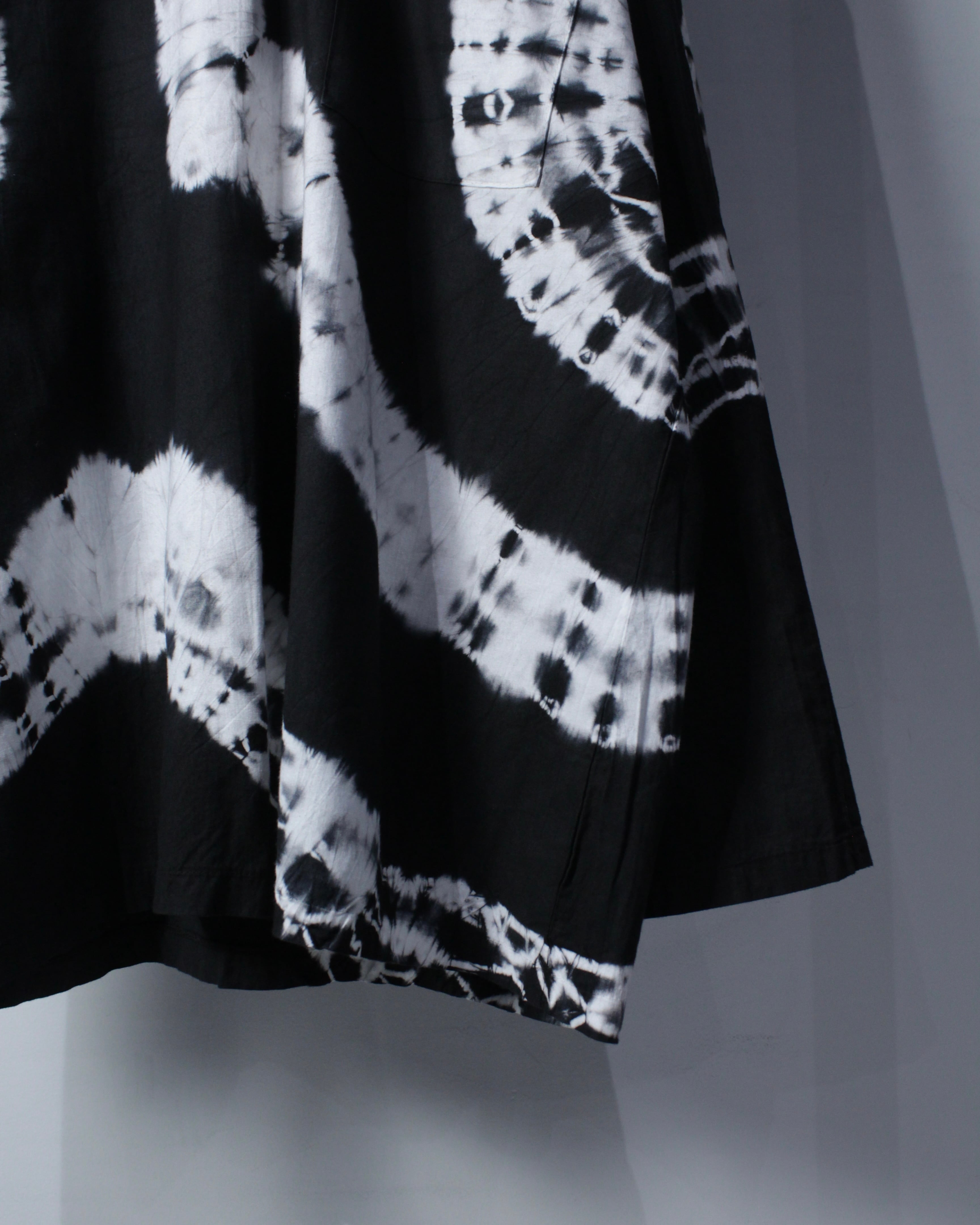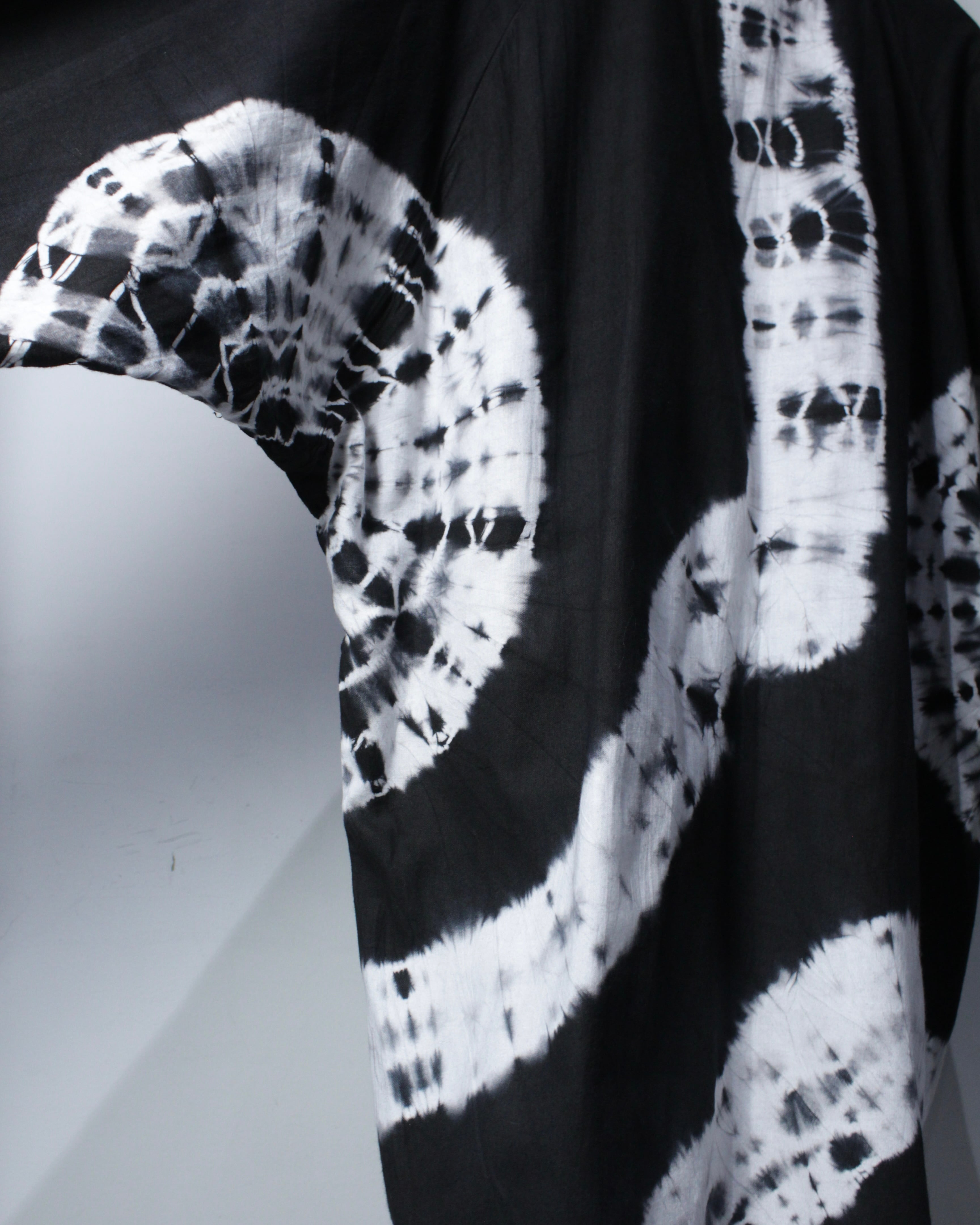 ブラックベースのボディにホワイトのタイダイ染めを大胆に落とし込んだ一着。ランダムかつ有機的に広がる柄は一点一点異なる表情を持ち、既製品では出せないアートピースのような存在感を放ちます。
