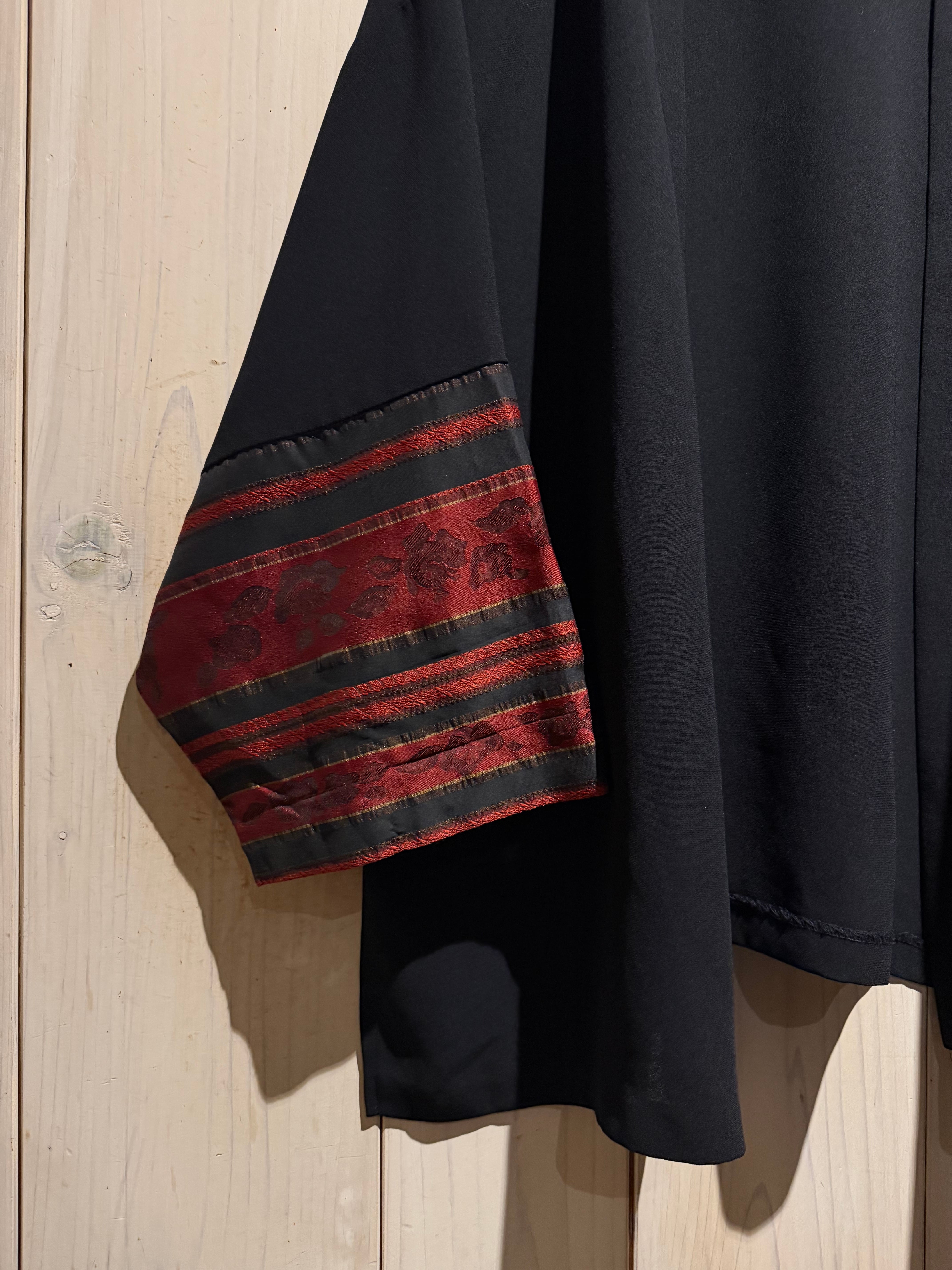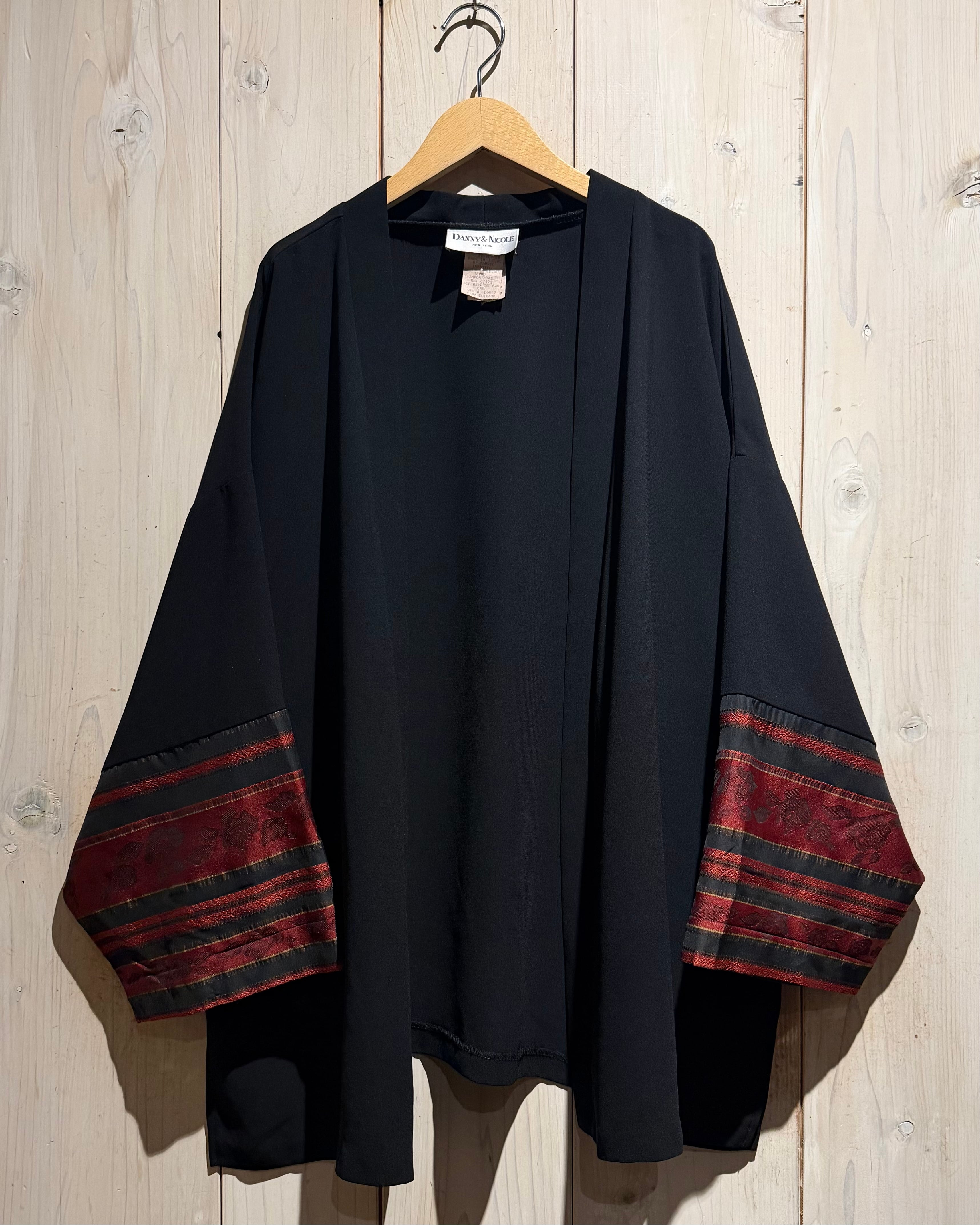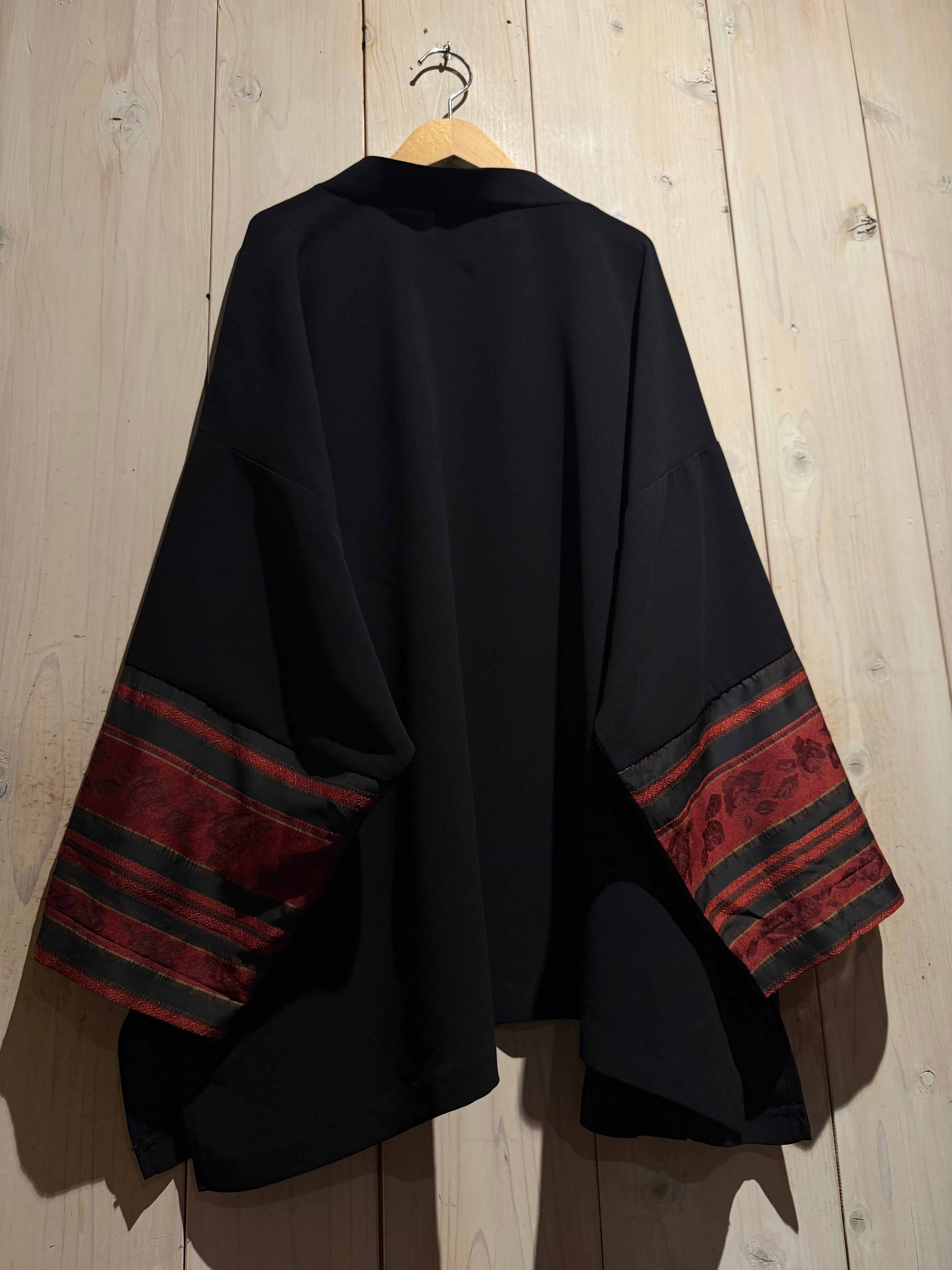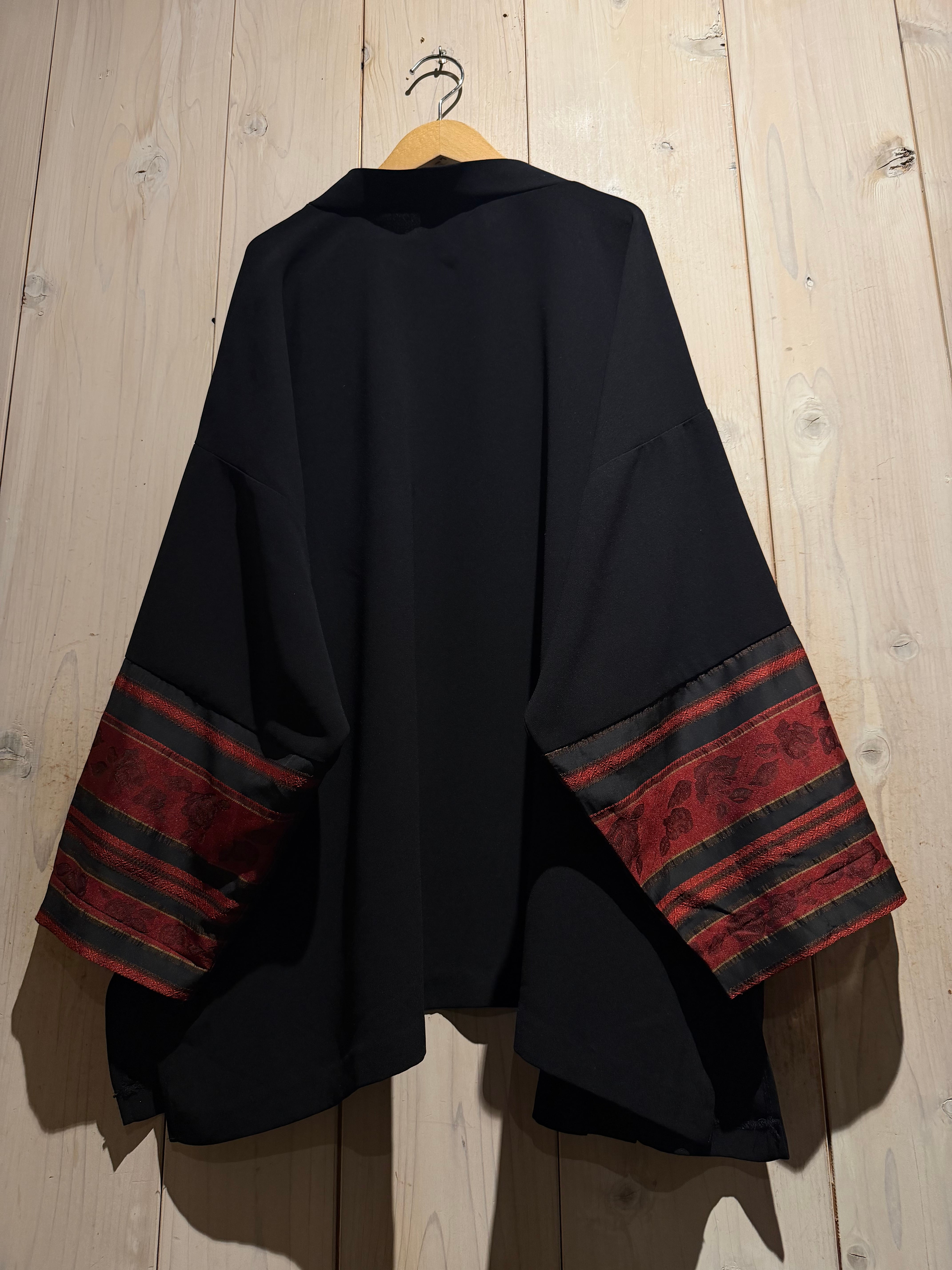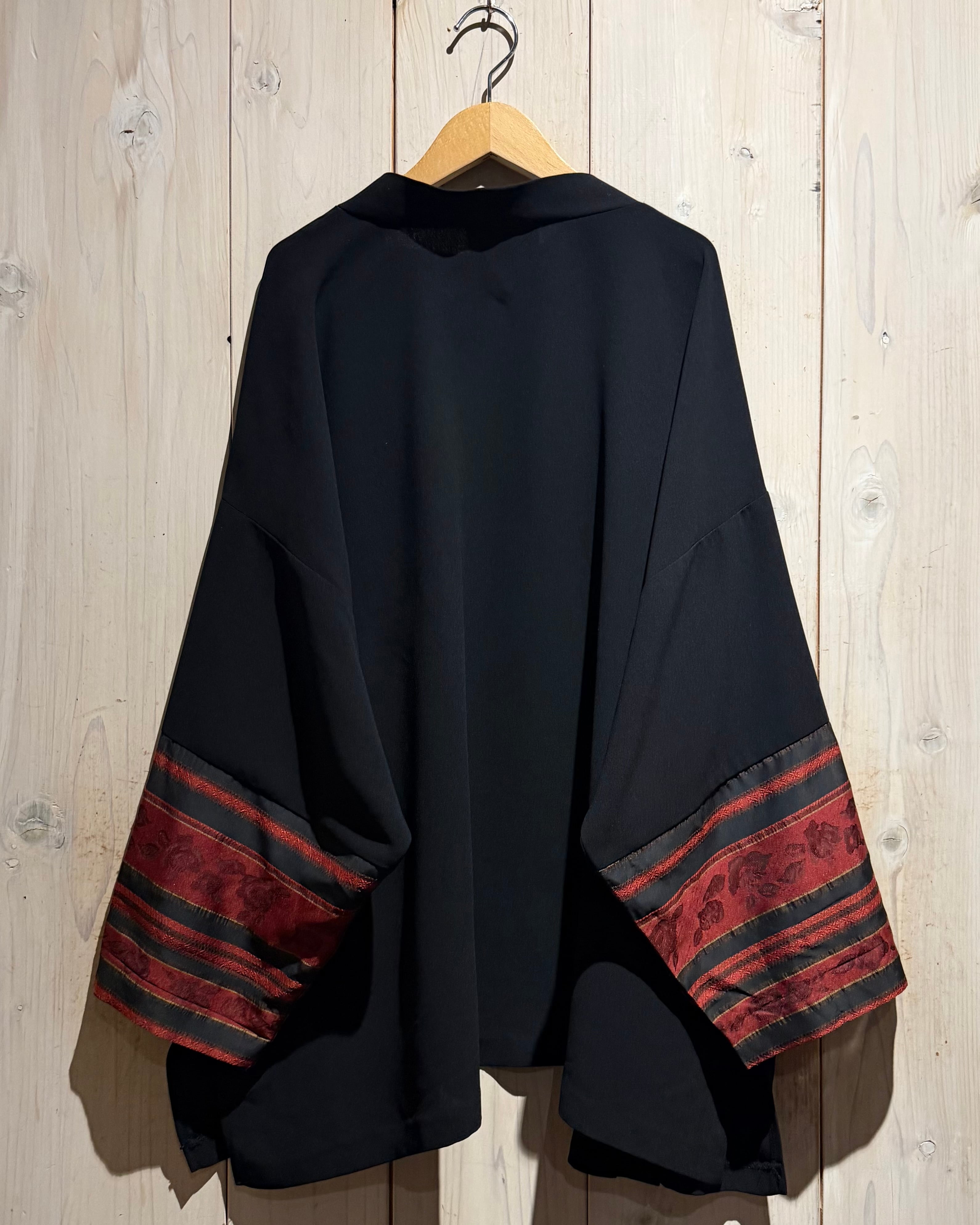 ブラックのボディをベースに、袖口周りに花柄のジャガード生地と、黒のシアーをボーダー状に切り替えた羽織ジャケット。