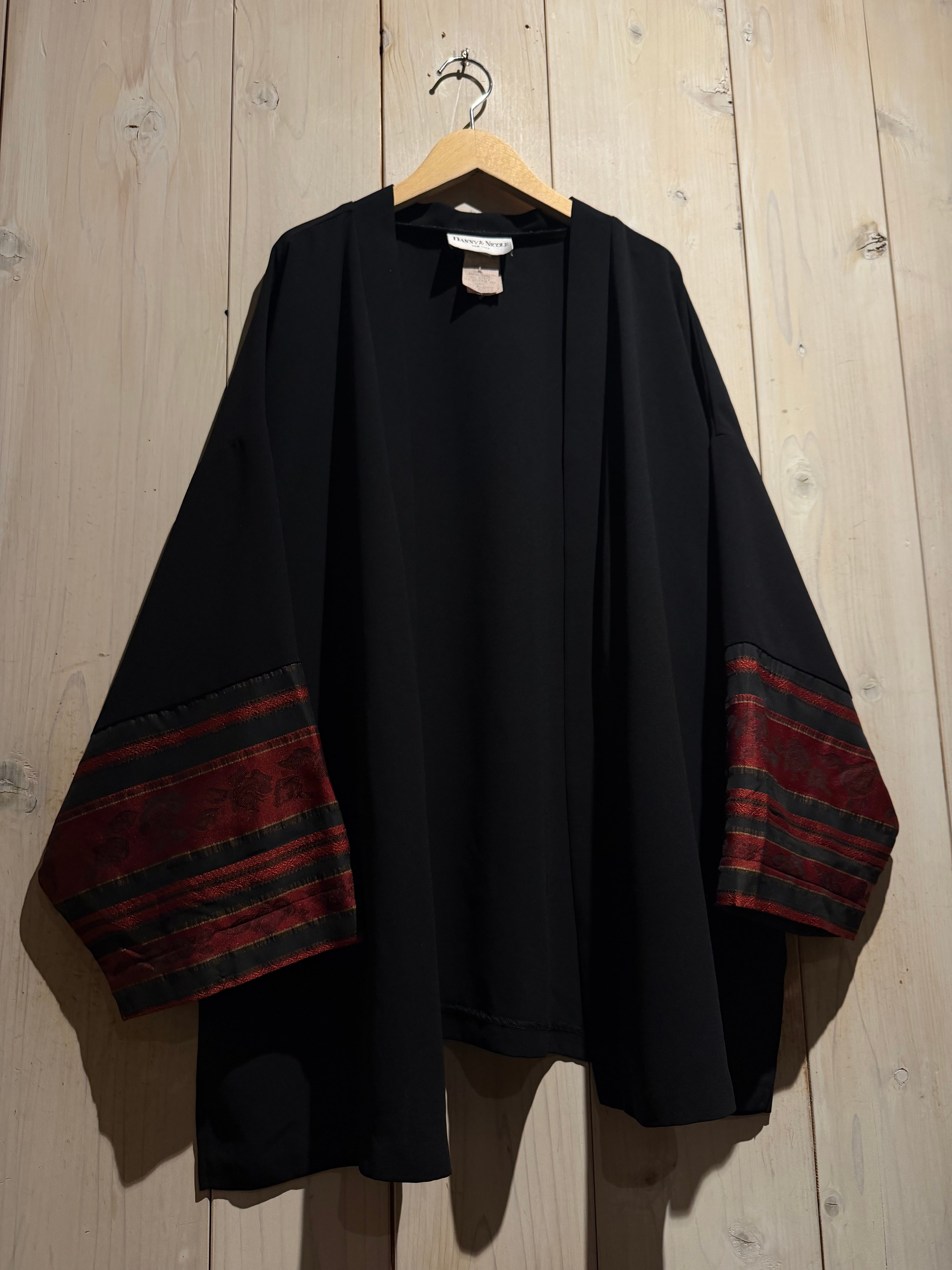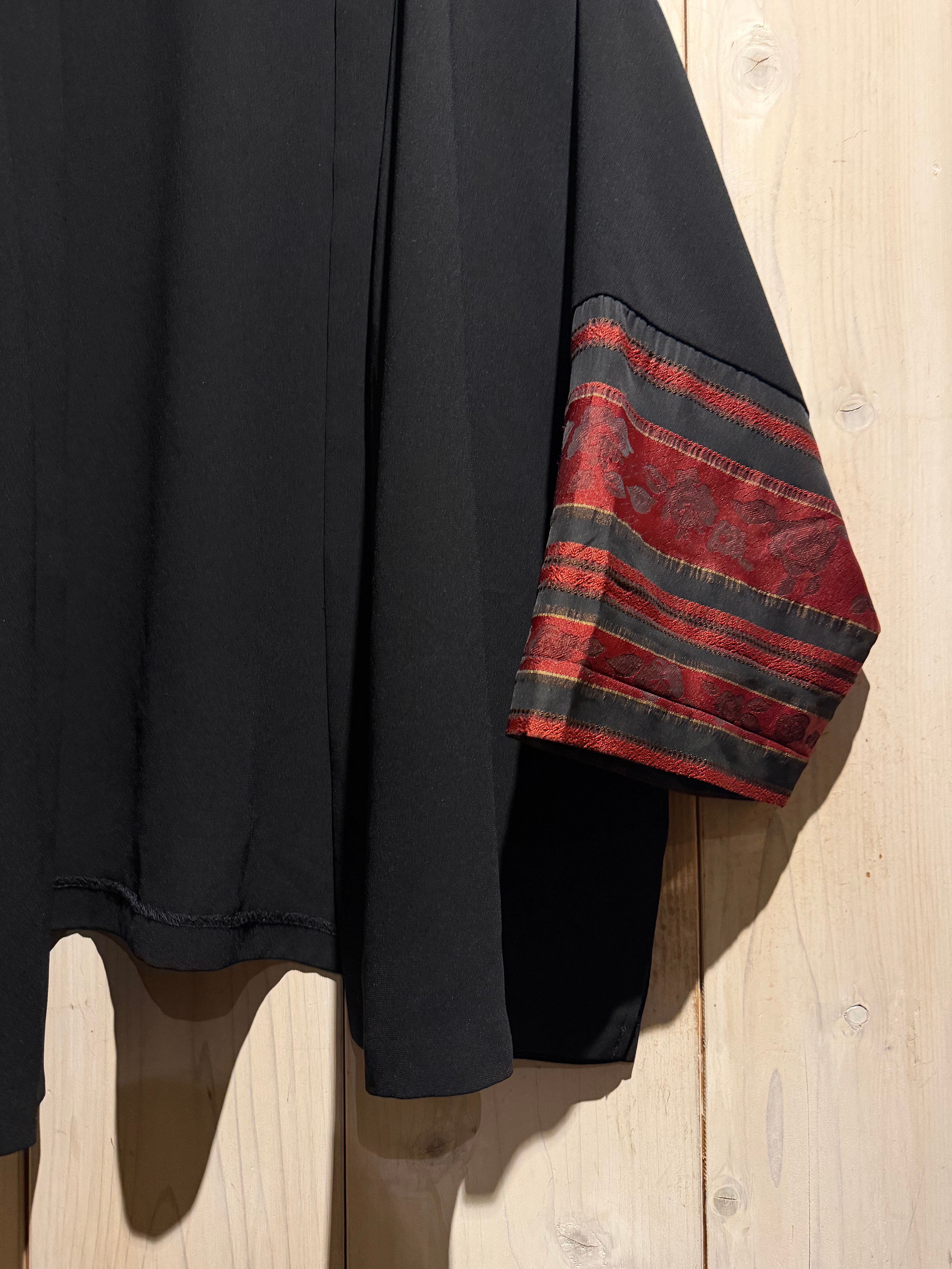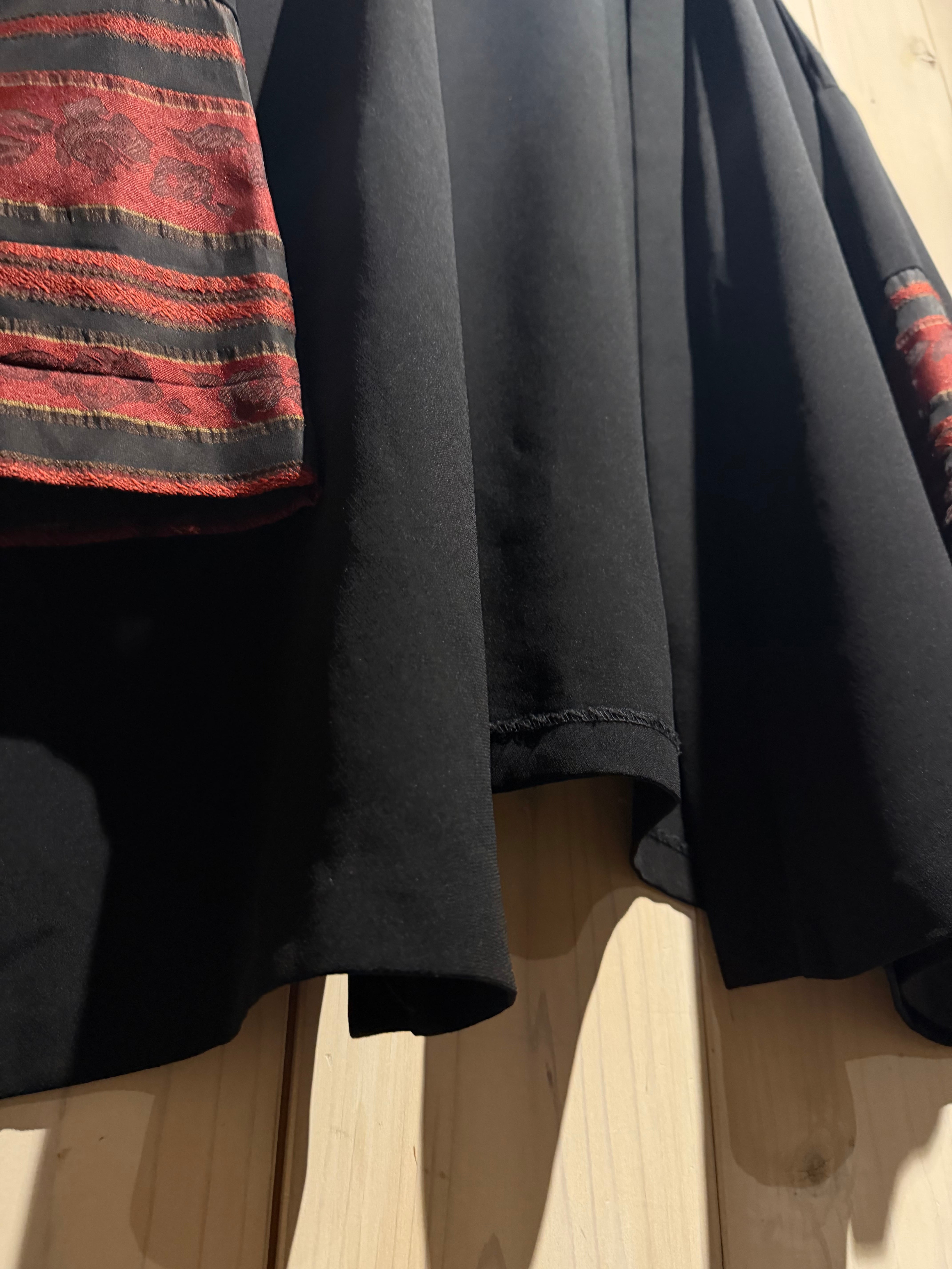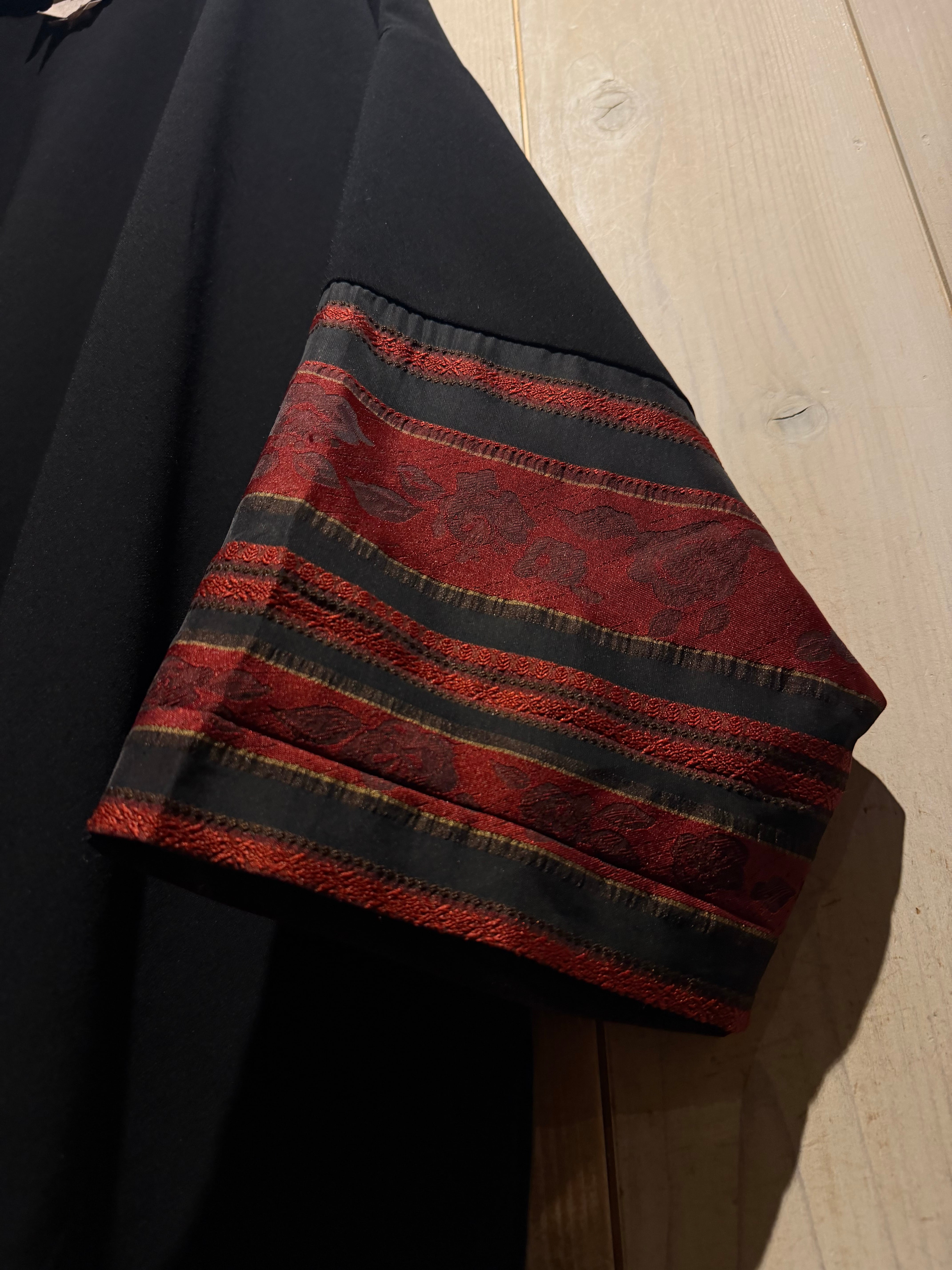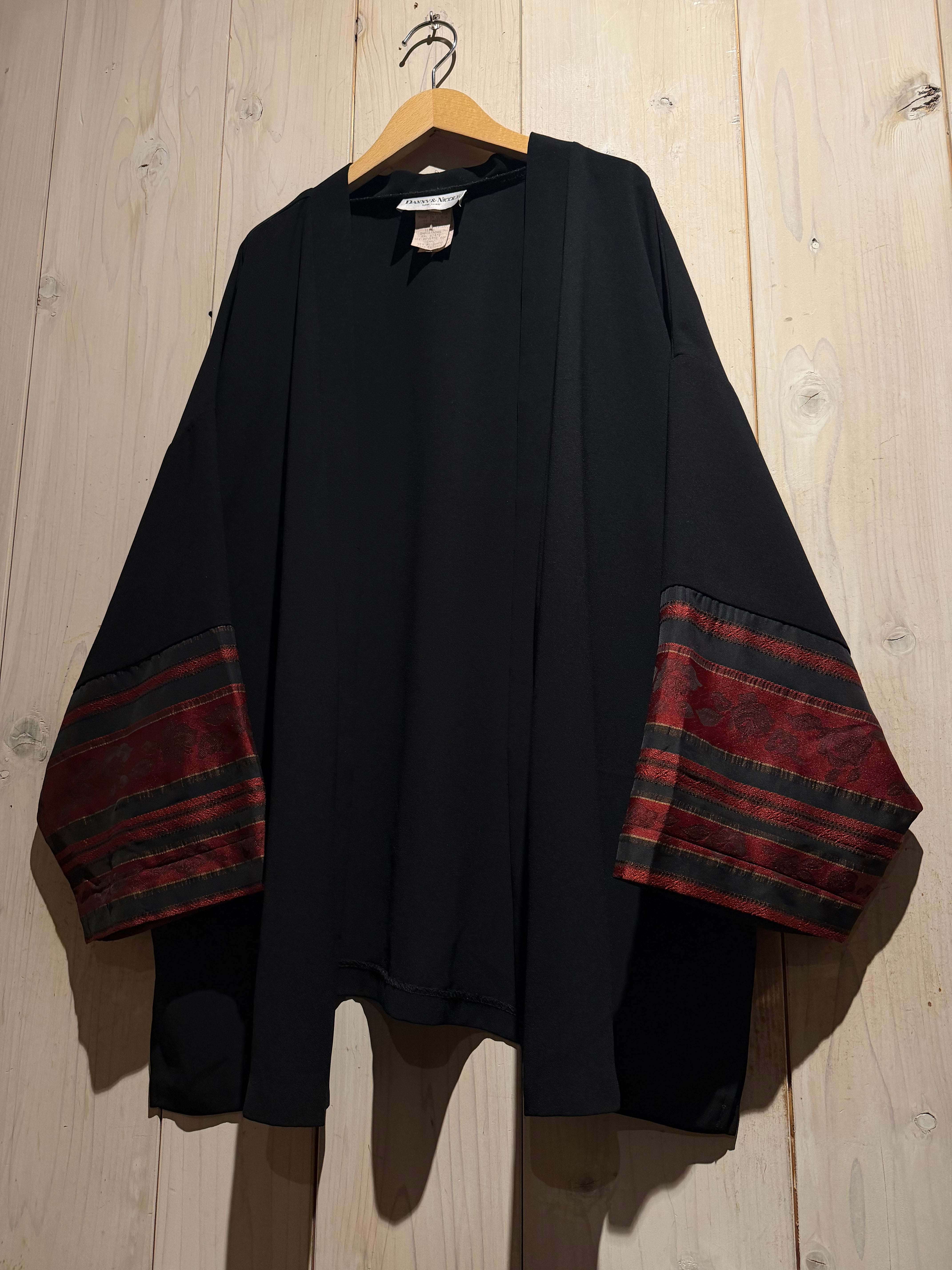 ブラックのボディをベースに、袖口周りに花柄のジャガード生地と、黒のシアーをボーダー状に切り替えた羽織ジャケット。
