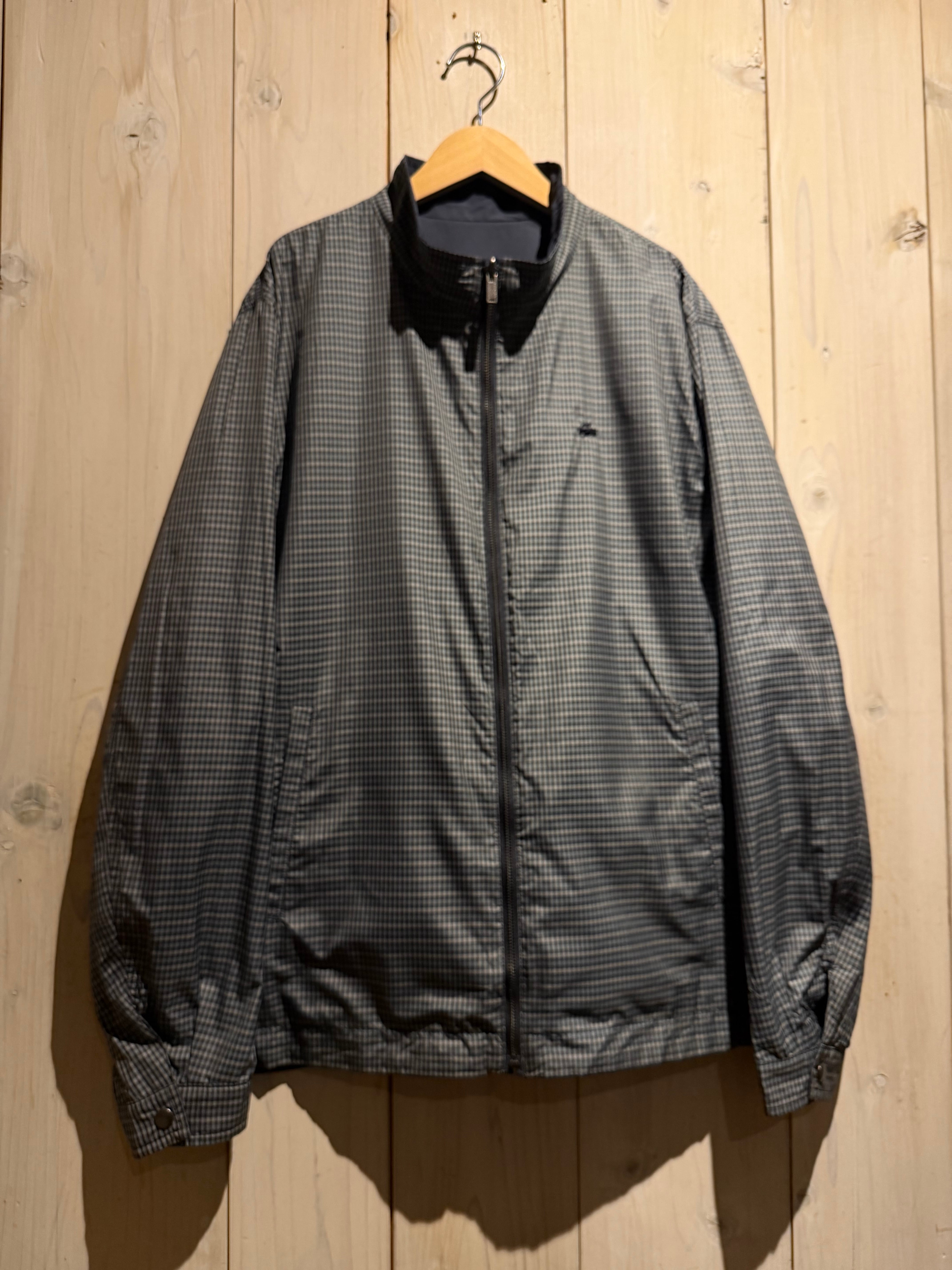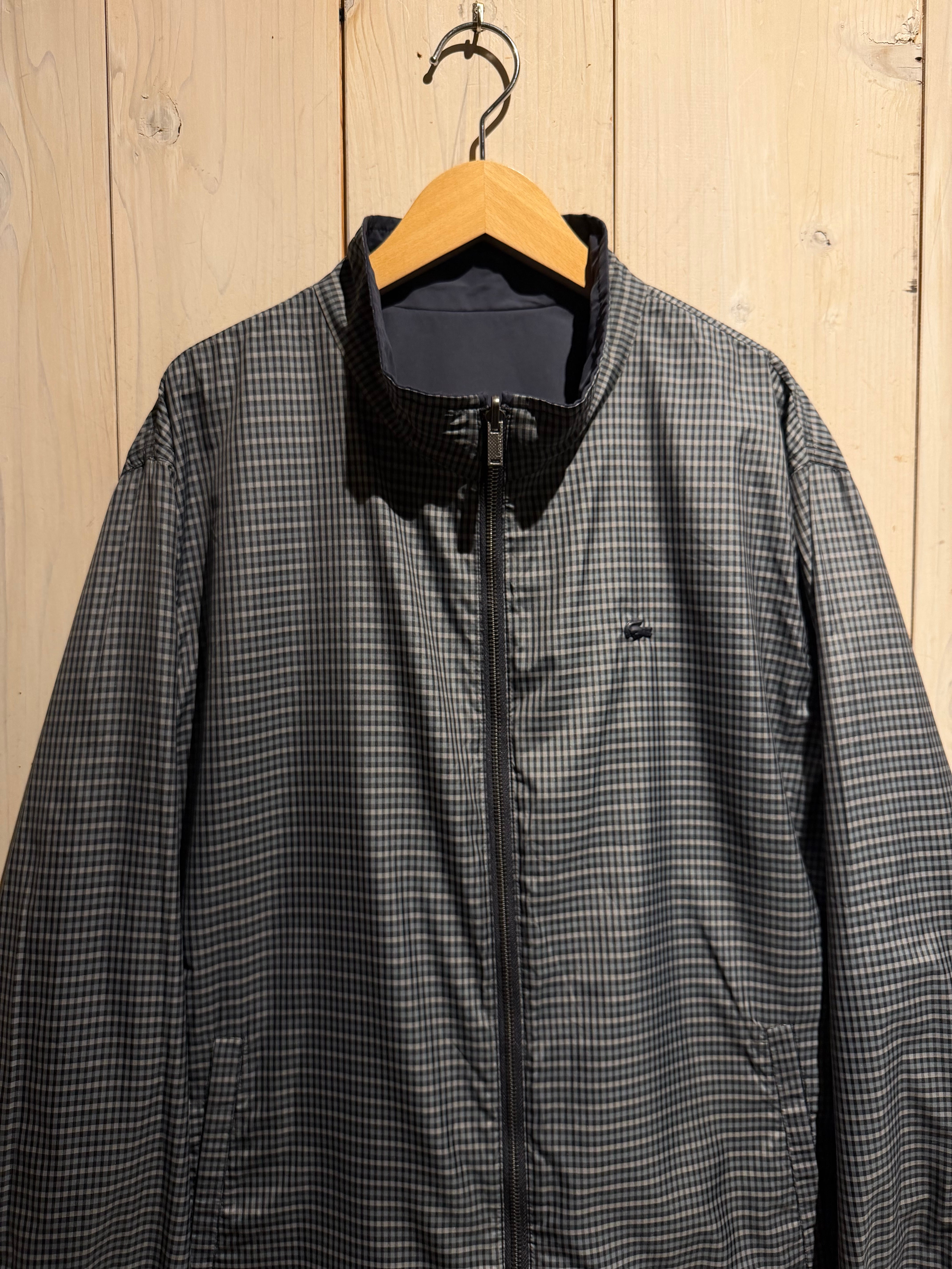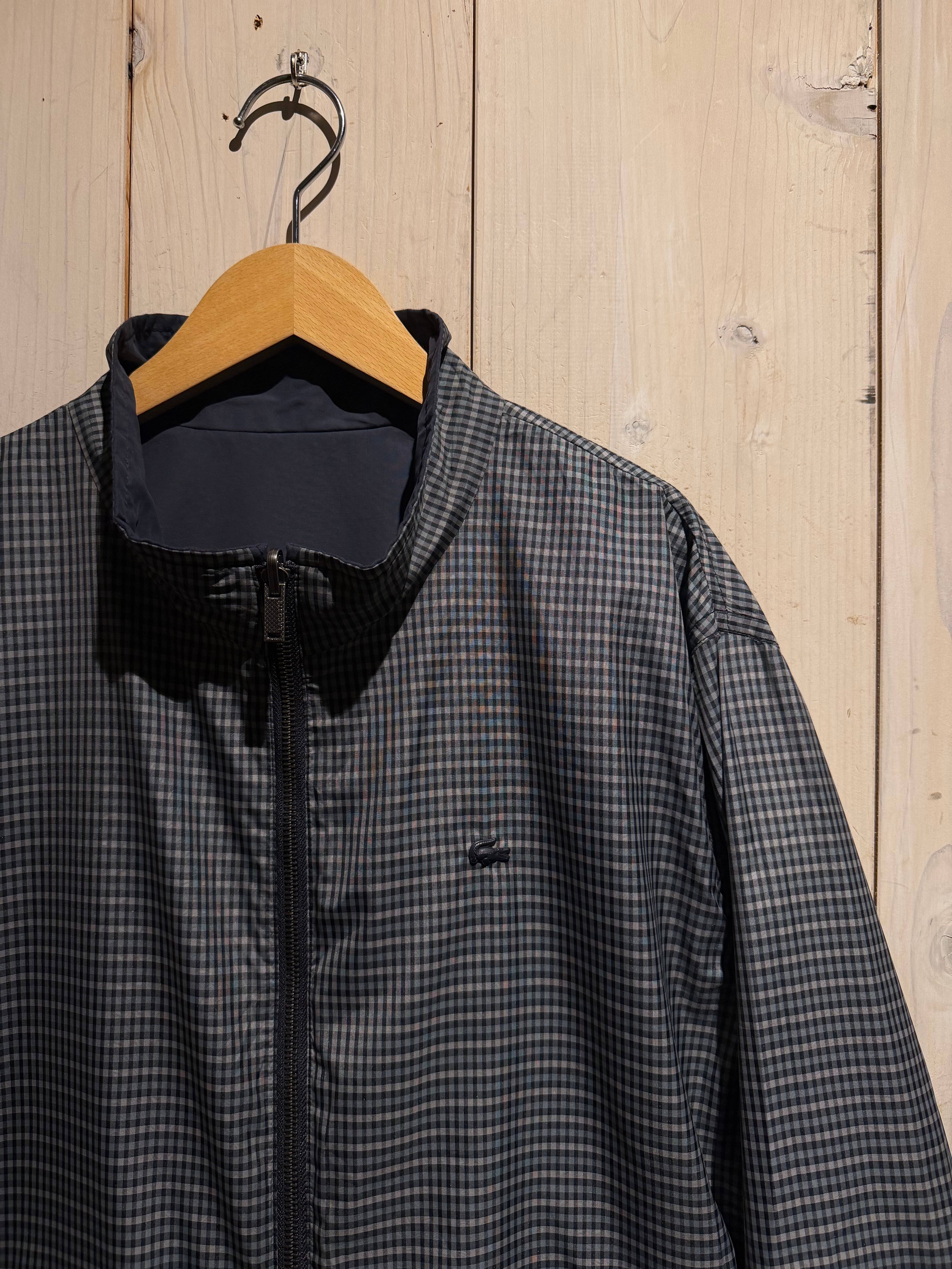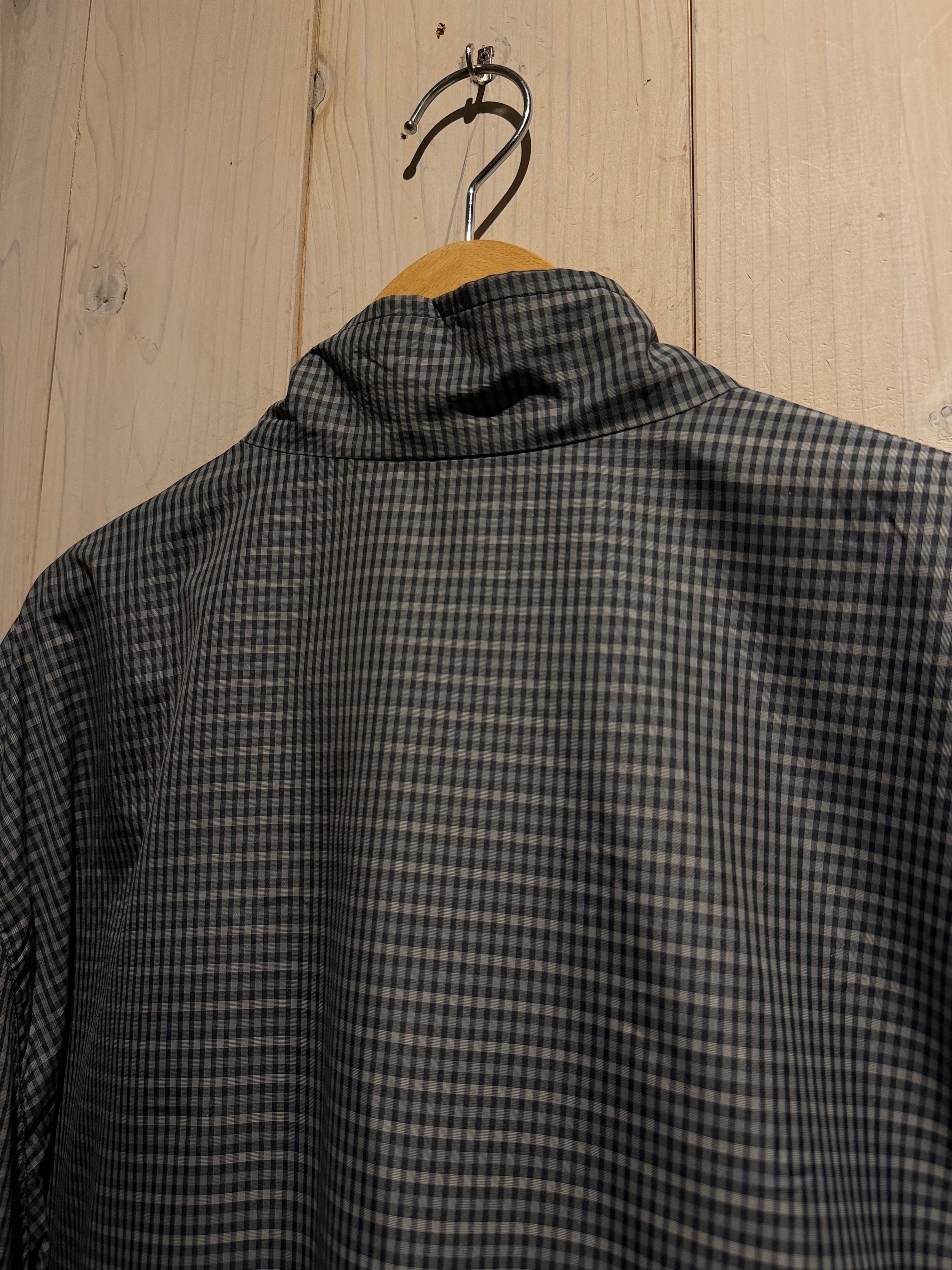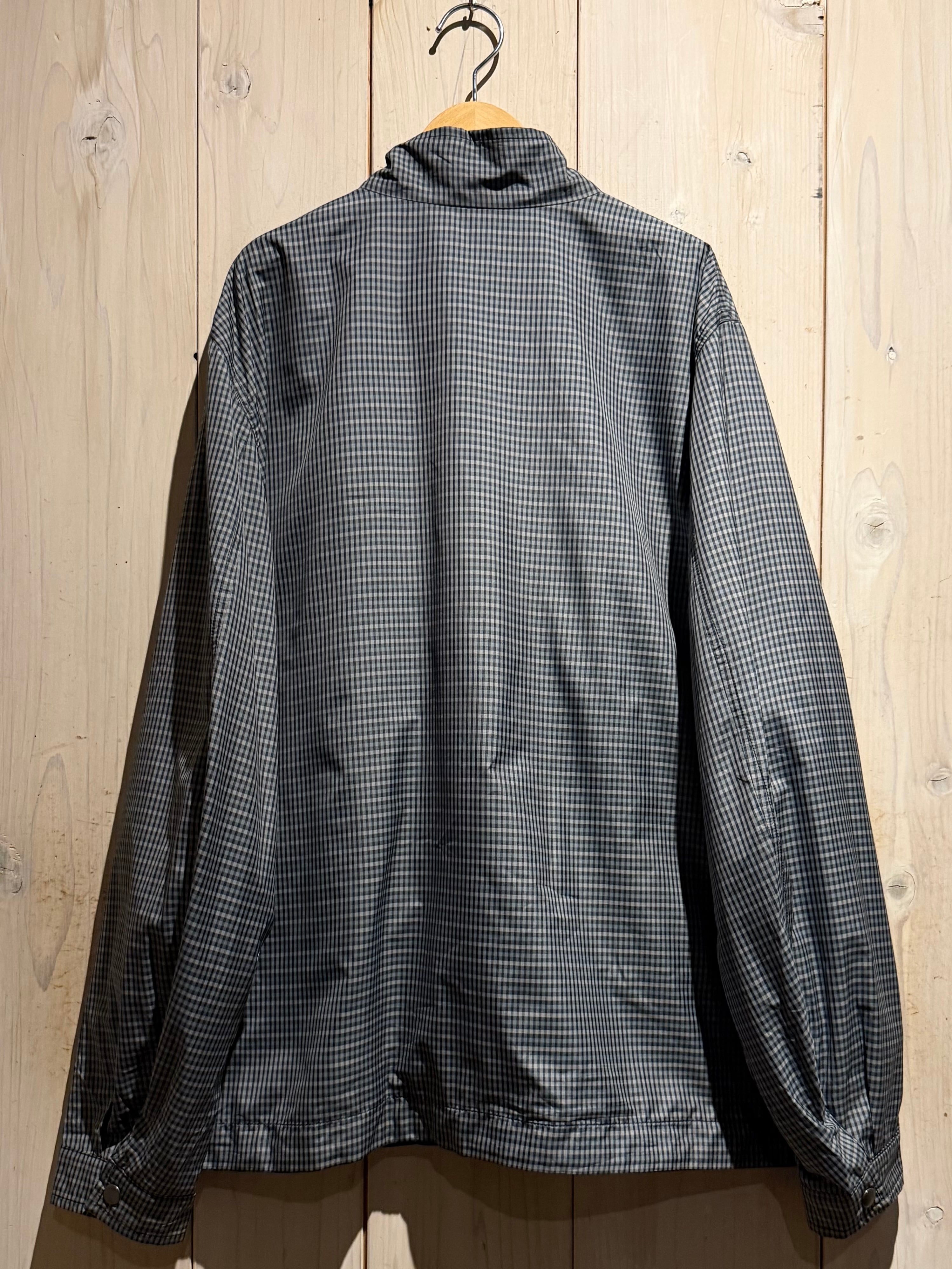 モノトーンのギンガムチェックを全面に載せたデザインと、裏返すことでネイビーのプレーンなルックスへと変化するリバーシブル仕様のナイロンスウィングトップジャケット。