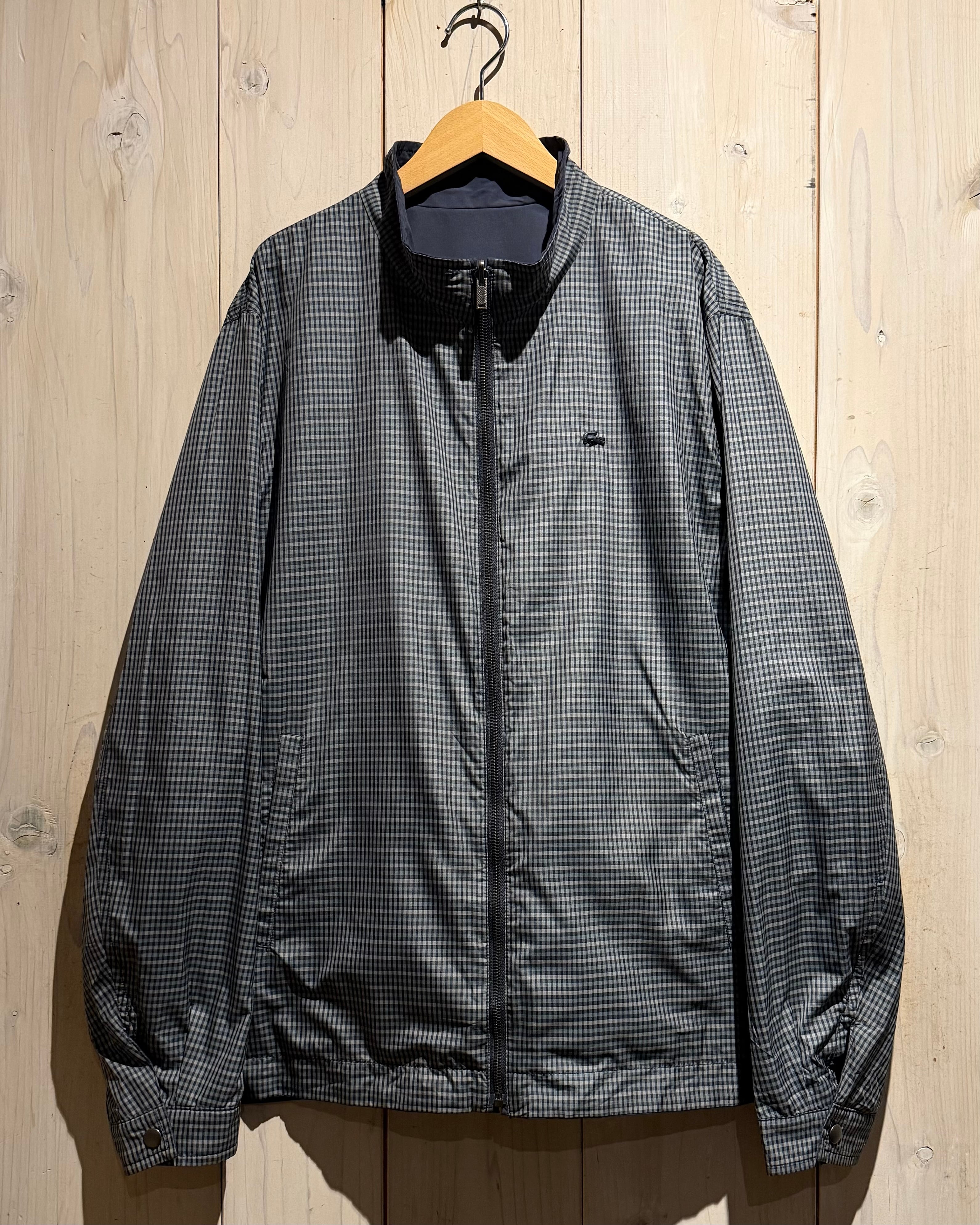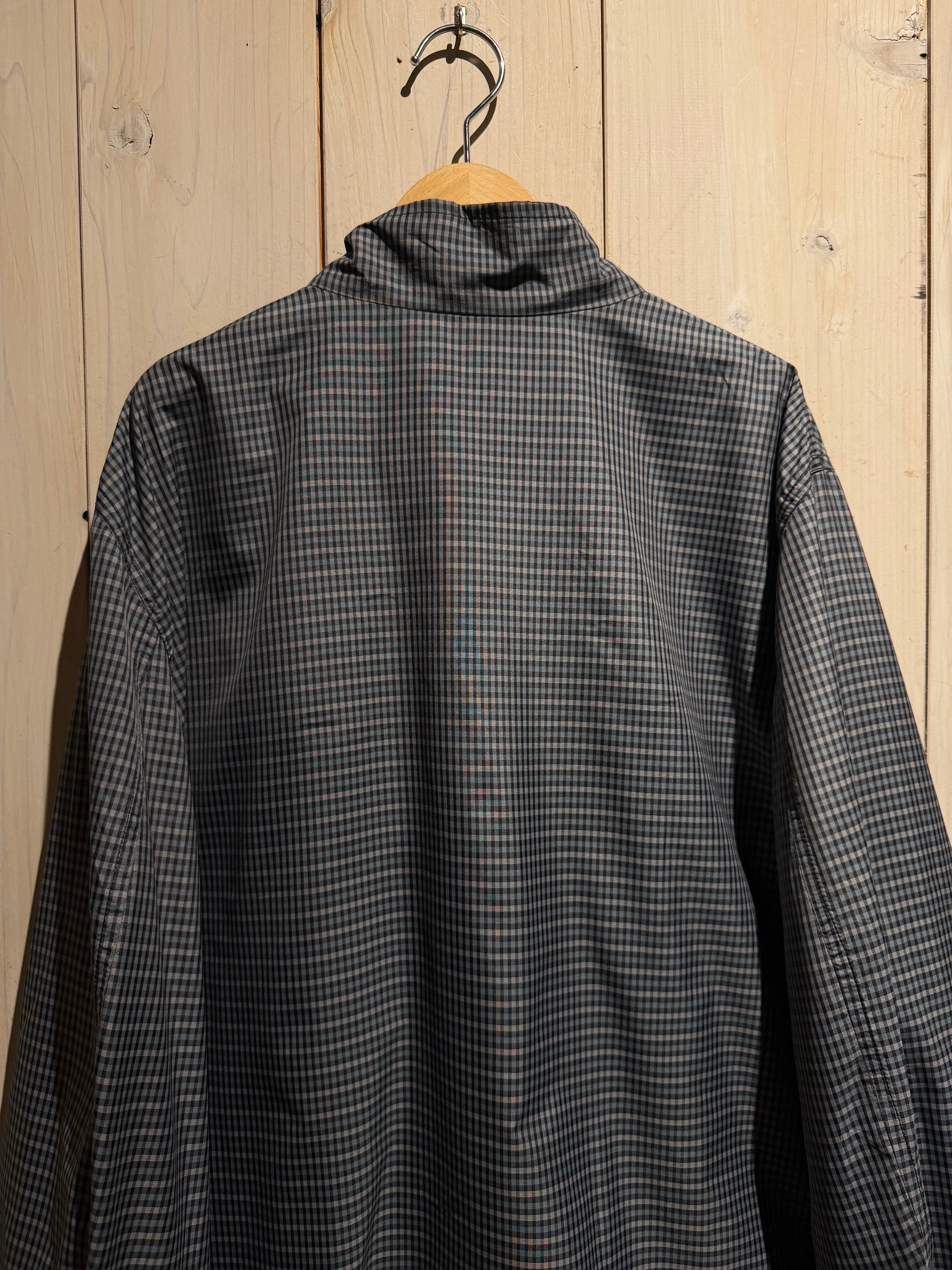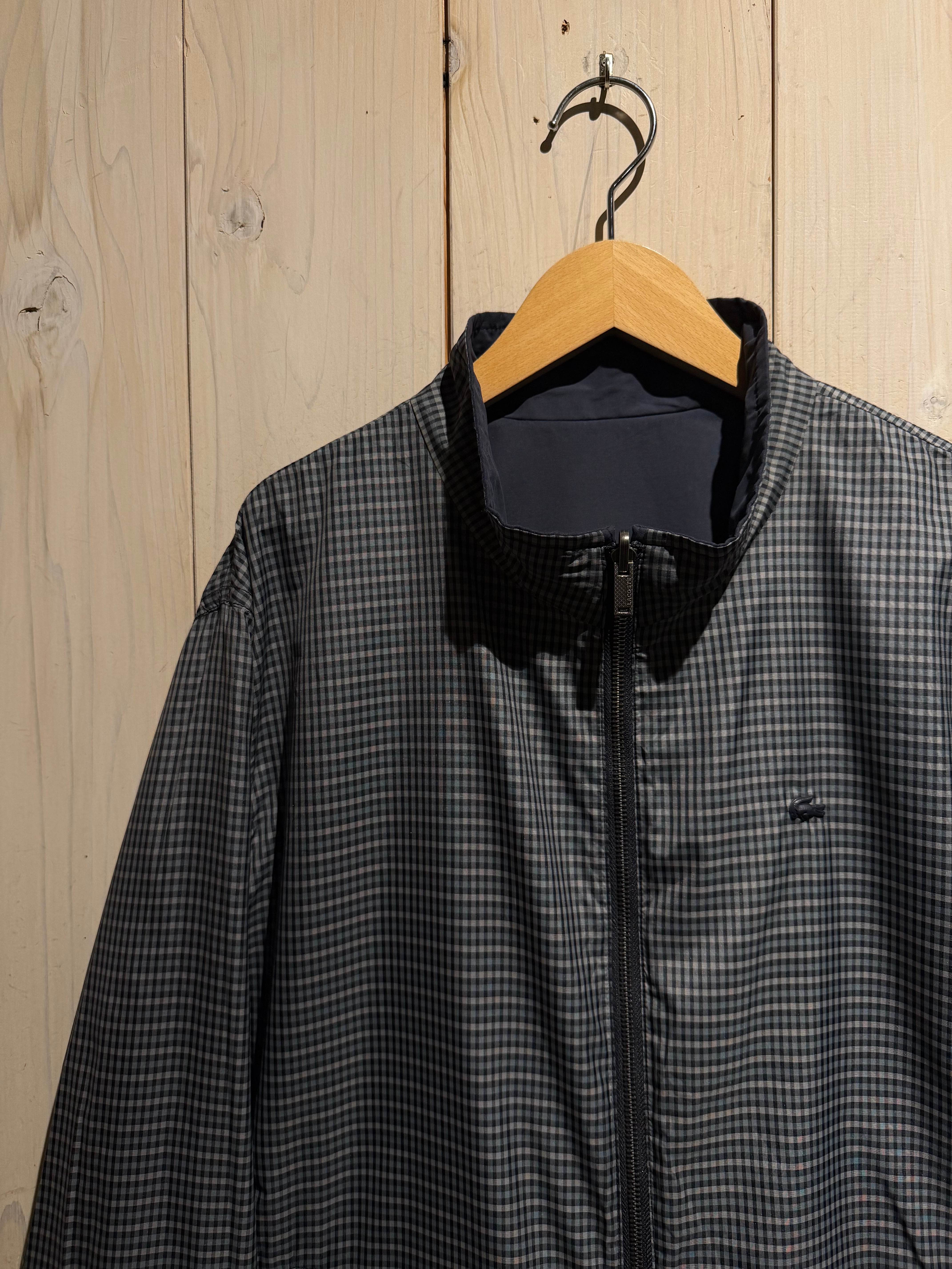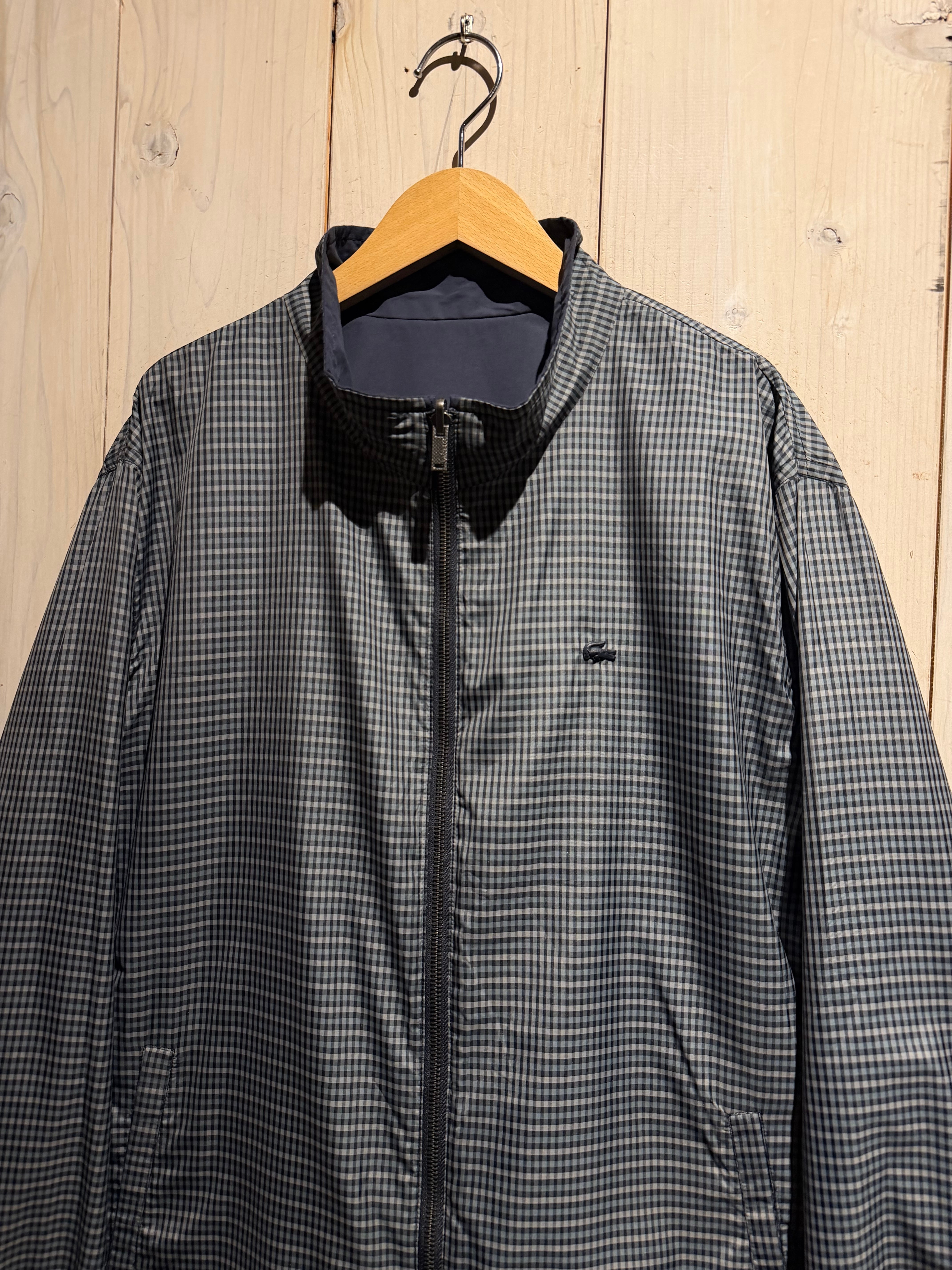 モノトーンのギンガムチェックを全面に載せたデザインと、裏返すことでネイビーのプレーンなルックスへと変化するリバーシブル仕様のナイロンスウィングトップジャケット。
